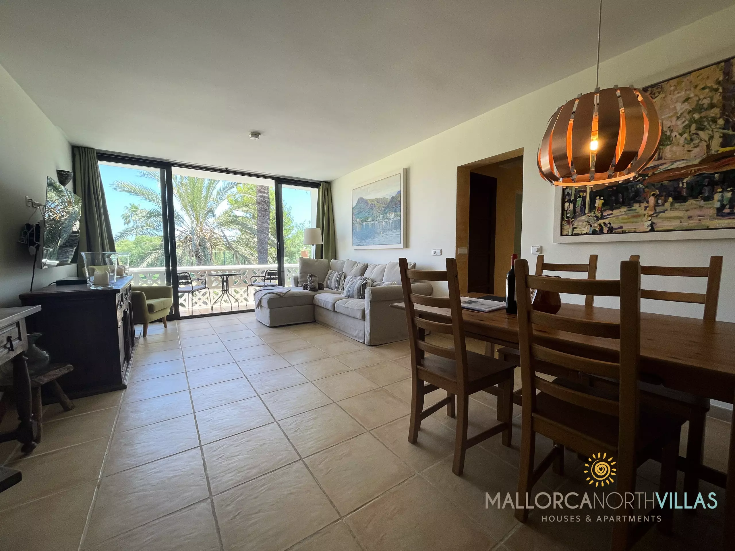 Spacious living-dining room with sofa, TV and direct access to the terrace.