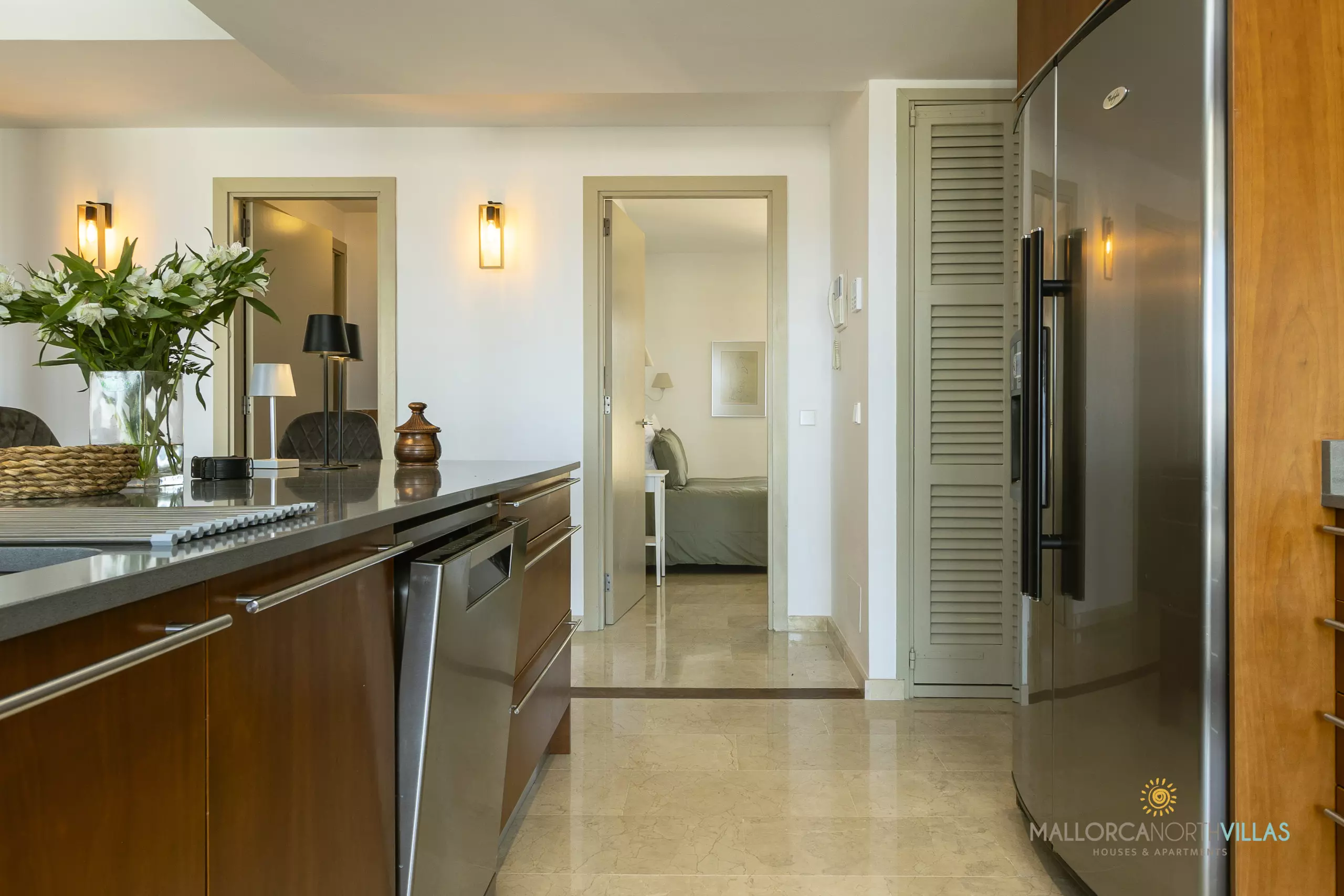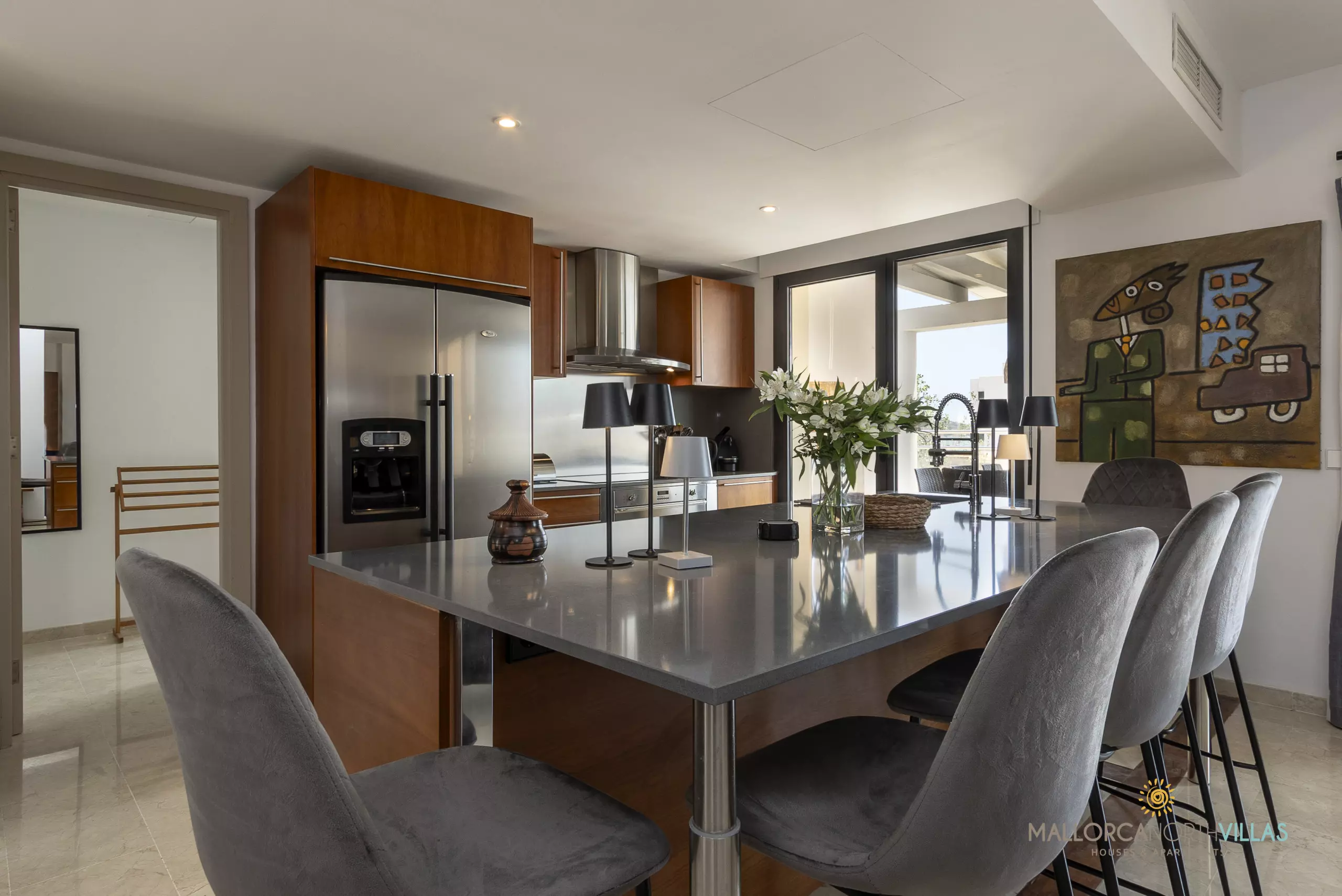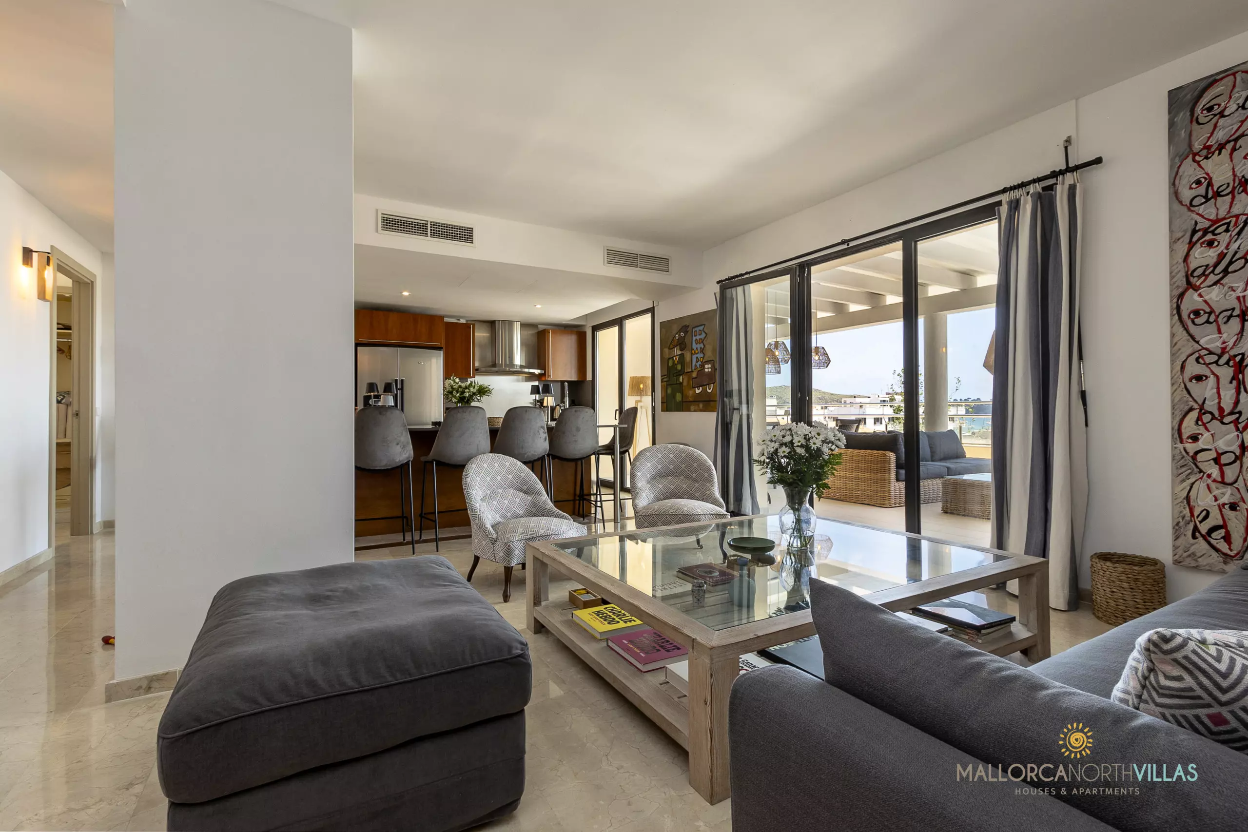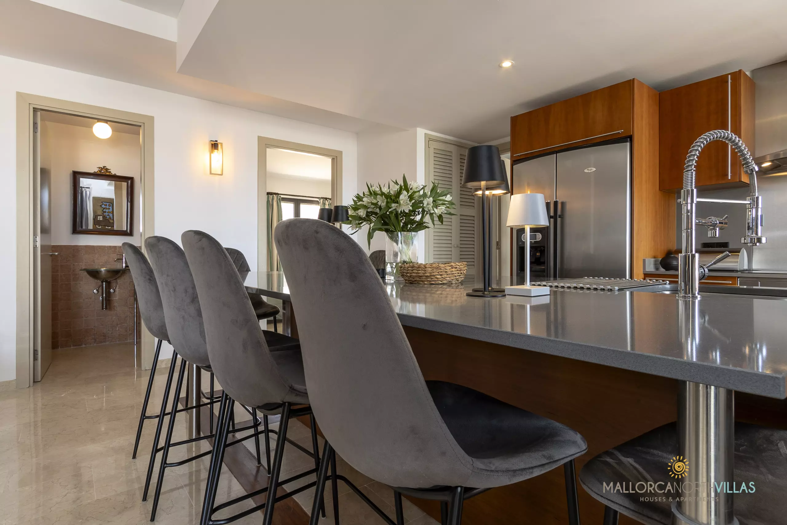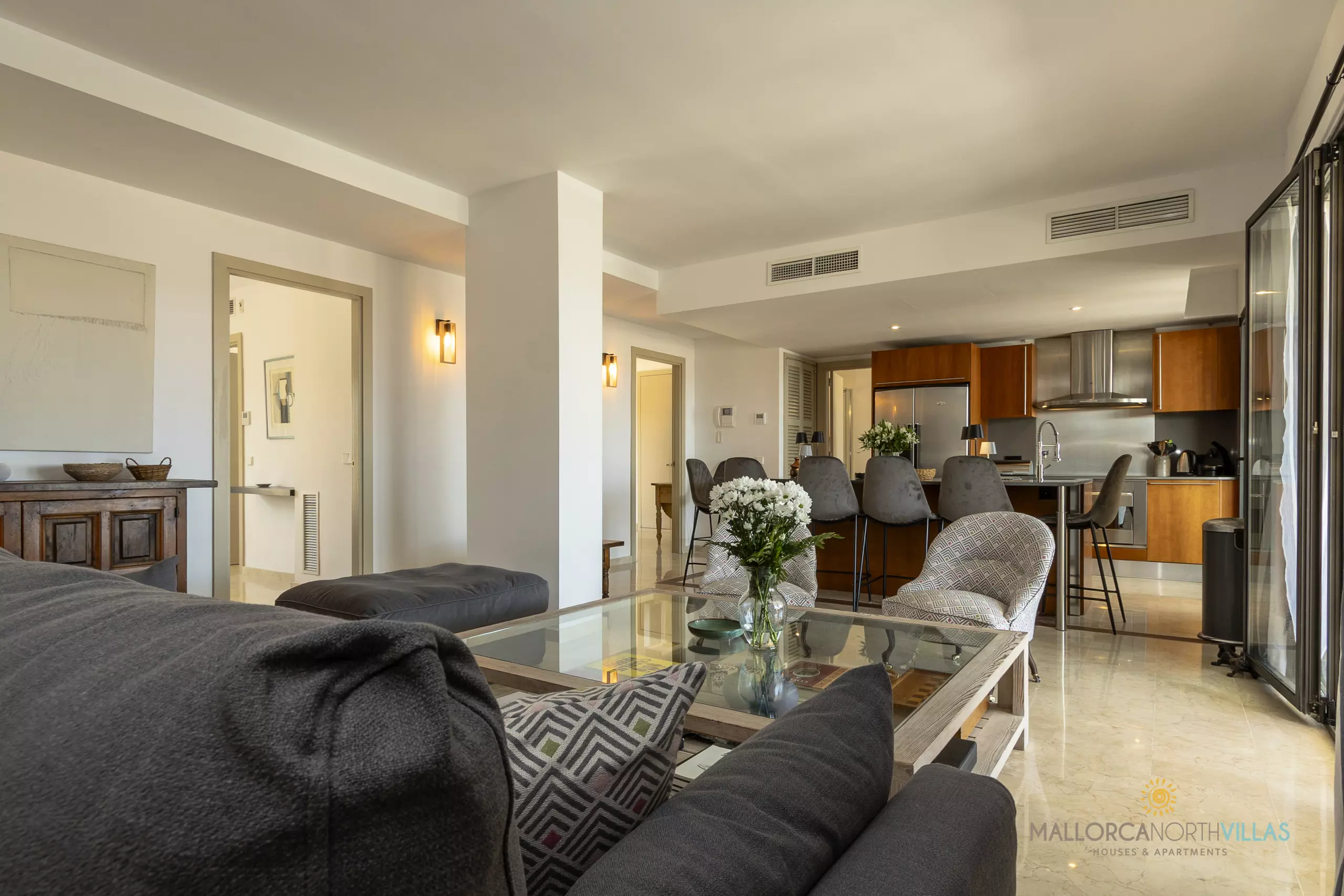 The kitchen features a large central island and is fully equipped with modern appliances, providing everything you need to prepare home-cooked meals. The living room, bathed in natural light thanks to the large windows, is the perfect space to relax after a day exploring the Port of Pollensa.