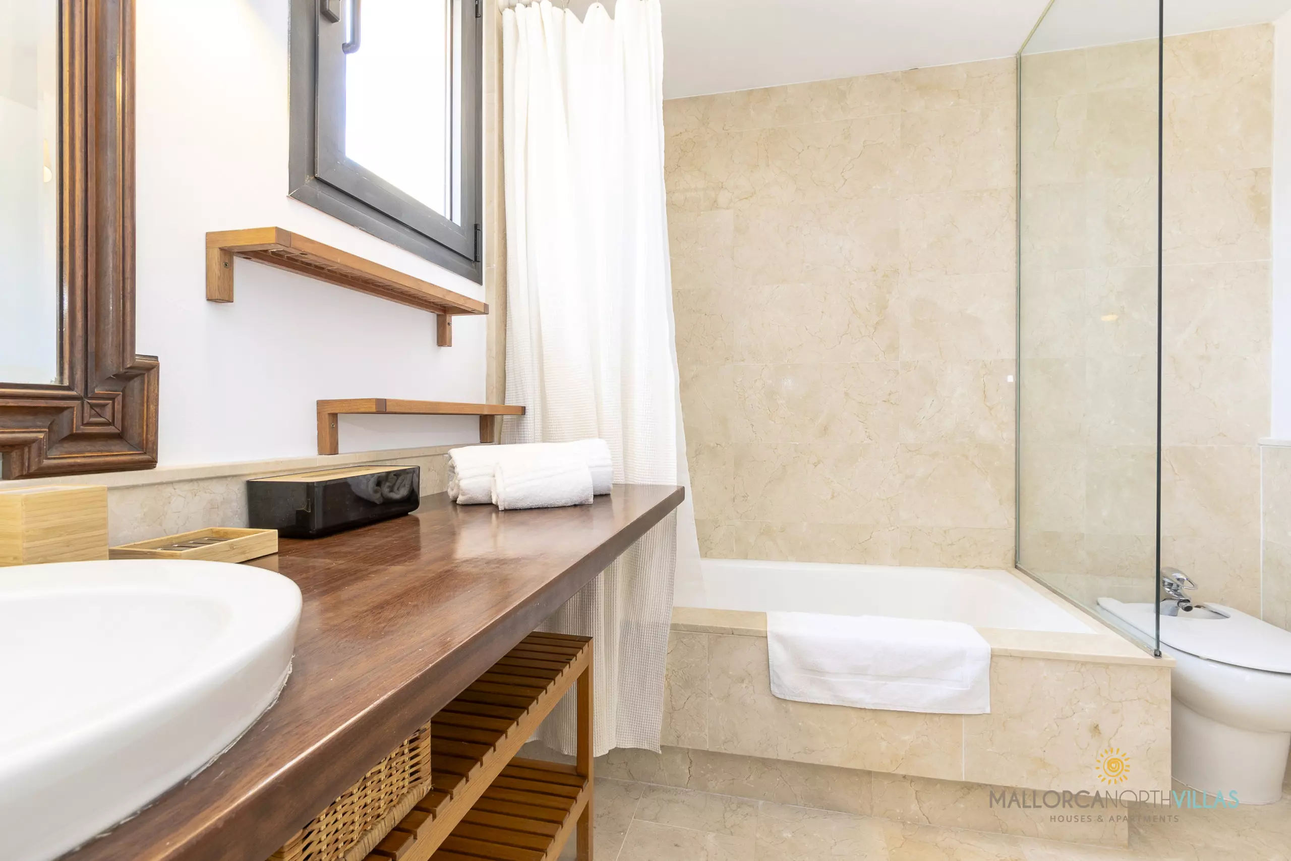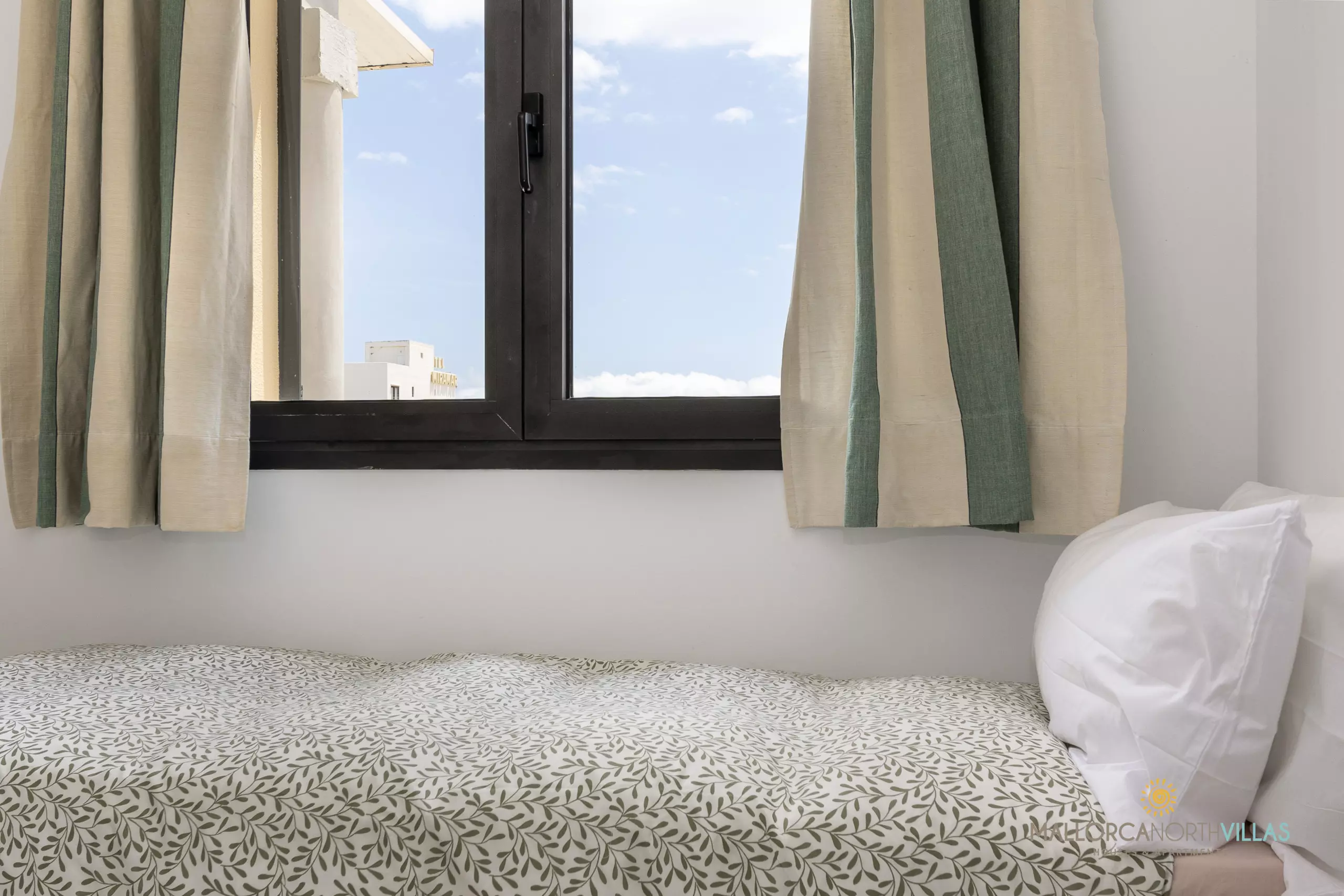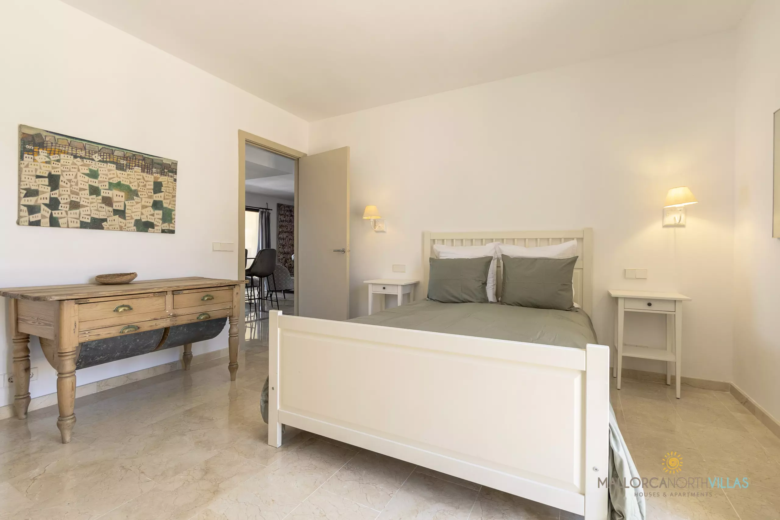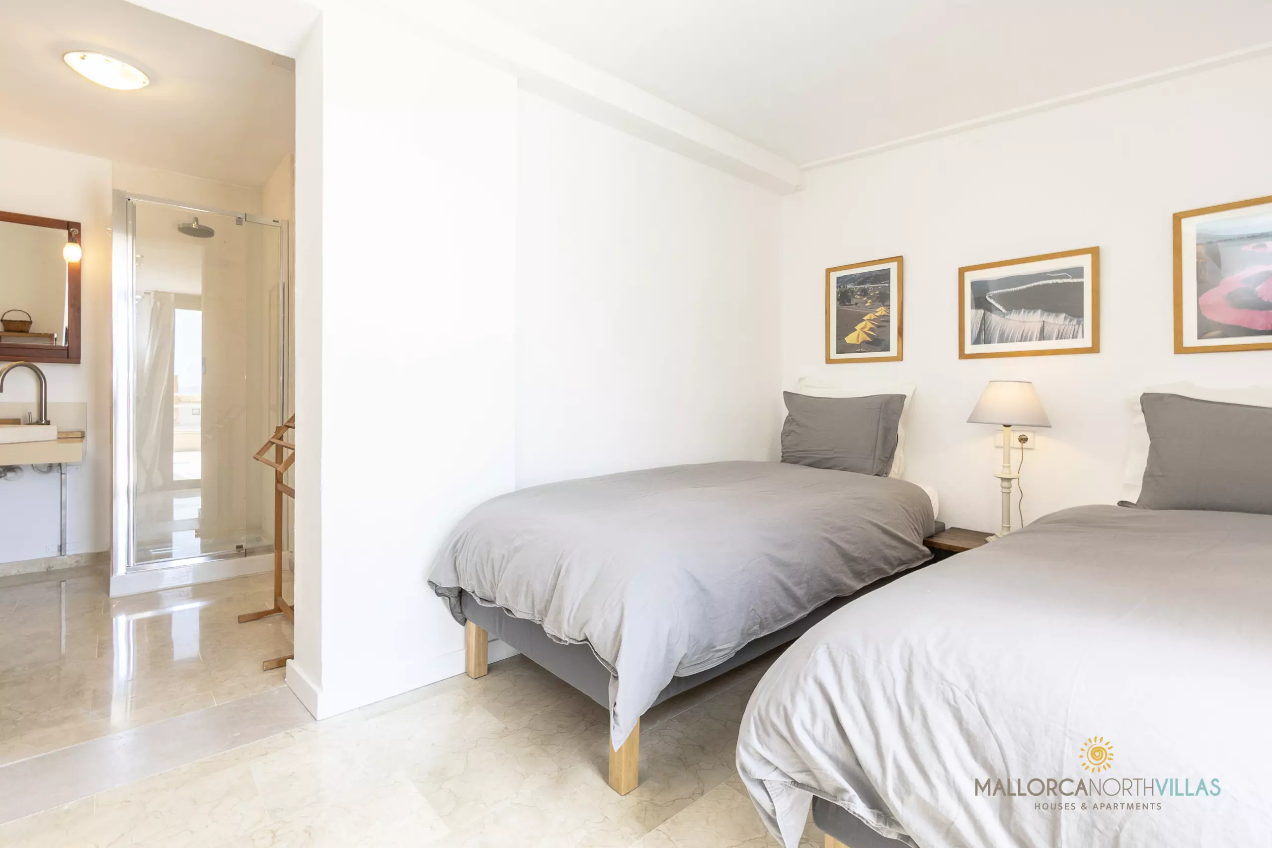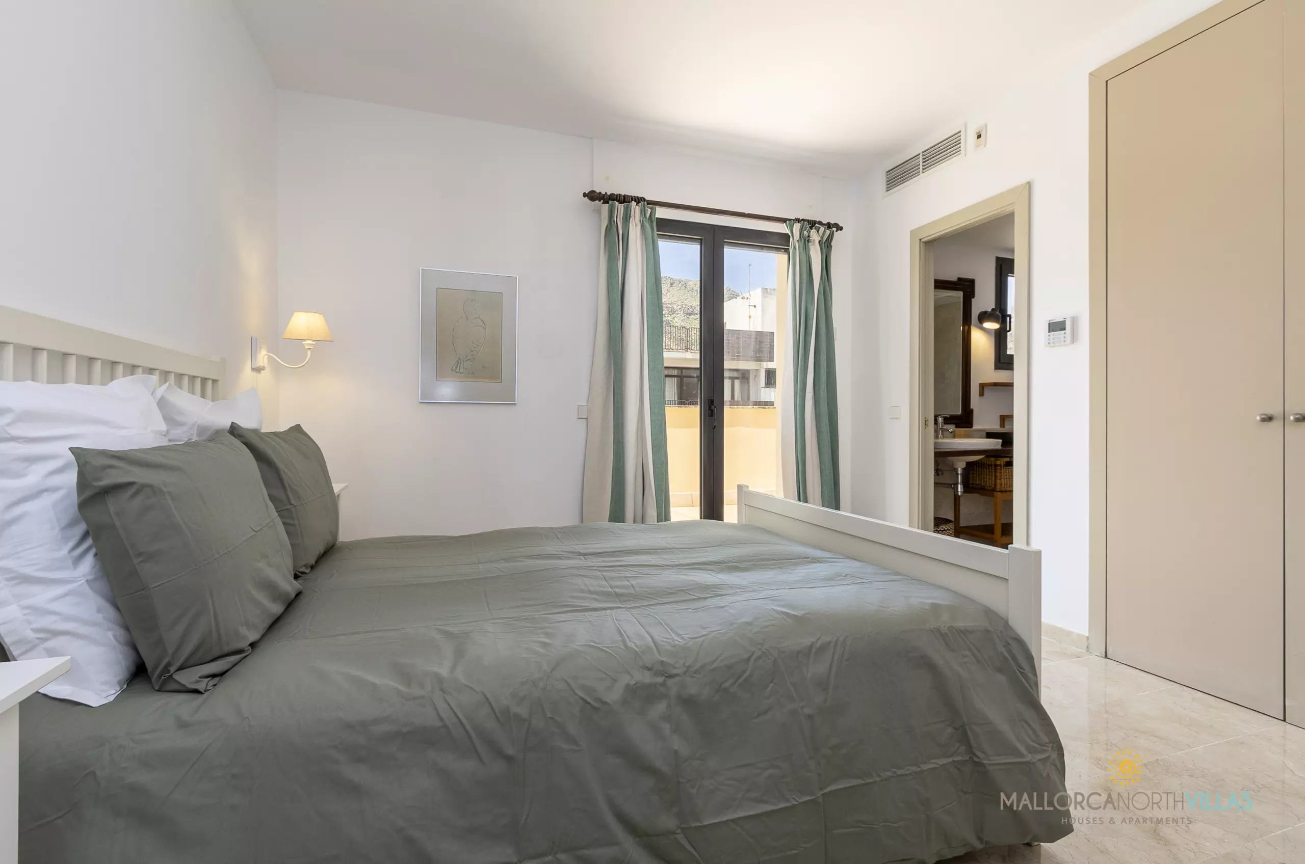 The kitchen features a large central island and is fully equipped with modern appliances, providing everything you need to prepare home-cooked meals. The living room, bathed in natural light thanks to the large windows, is the perfect space to relax after a day exploring the Port of Pollensa.