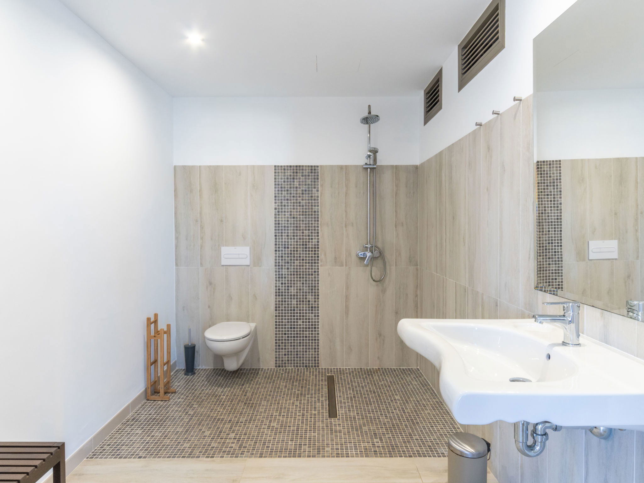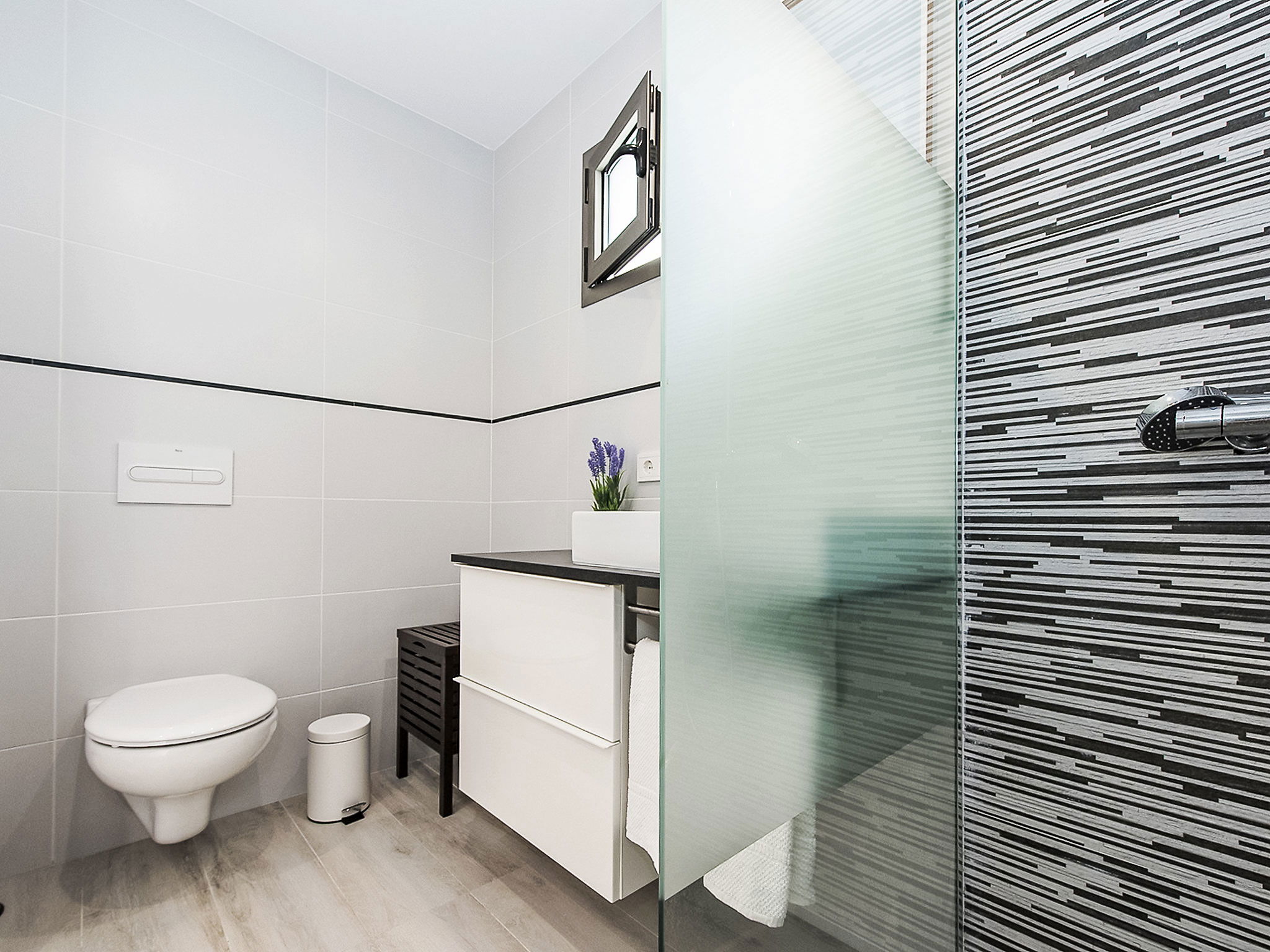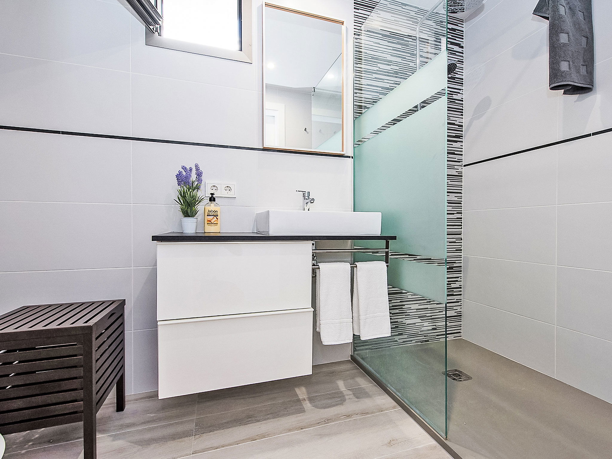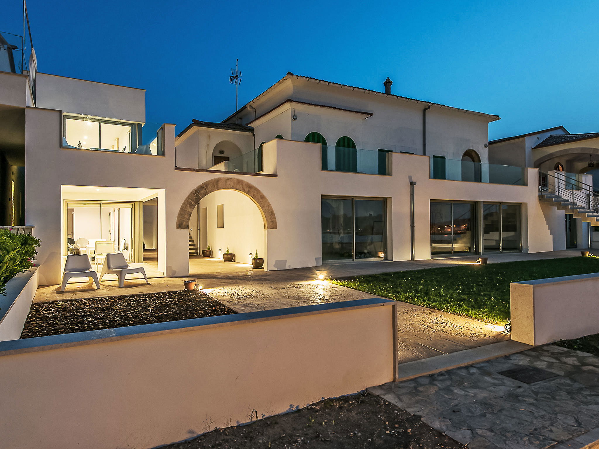 "Can Verd", 9-room villa 300 m2 on 2 levels. Object suitable for 10 adults. Fully renovated in 2016, very comfortable and cosy furnishings: living/dining room with panoramic window with dining table, satellite TV, digital TV, flat screen, air conditioning and forced-air heating. Exit to the terrace. 1 large double bedroom with curtain with 1 french bed (135 cm, length 190 cm). 1 double bedroom with 2 beds (90 cm, length 200 cm), air conditioning and forced-air heating. 1 double bedroom with 2 beds (90 cm, length 200 cm). 1 double bedroom with sliding door curtain panoramic window with 1 sofabed and 1 french bed (150 cm, length 200 cm), bath/shower/WC, TV, satellite TV, air conditioning and forced-air heating. Exit to the terrace. Kitchen 15 m2 (4 hot plates, oven, dishwasher, microwave, freezer, electric coffee machine) with dining table. Exit to the terrace. 2 Baths/showers/WC. On the lower ground floor: lounge with 1 sofabed, dining table and air conditioning. Exit to the patio. Office with panoramic window. Exit to the patio. 1 double bedroom with 1 french bed (150 cm, length 200 cm), bath/shower/WC and air conditioning. Exit to the patio. Bath/shower/WC. Large patio, porch. Terrace furniture, balcony furniture, barbecue, deck chairs, covered balcony, sitting area. Very beautiful panoramic view of the sea, the mountains and the bay. Facilities: washing machine, dryer, safe, iron, children's high chair, baby cot for up to 2 year olds, hair dryer. Internet (WiFi, free). At the house. Please note: suitable for families one double bedroom is outside the apartment. Fire extinguisher. ETV5536 // Reg. Nr.: ESFCTU0000704300008406200000000000000000000ETV/55365