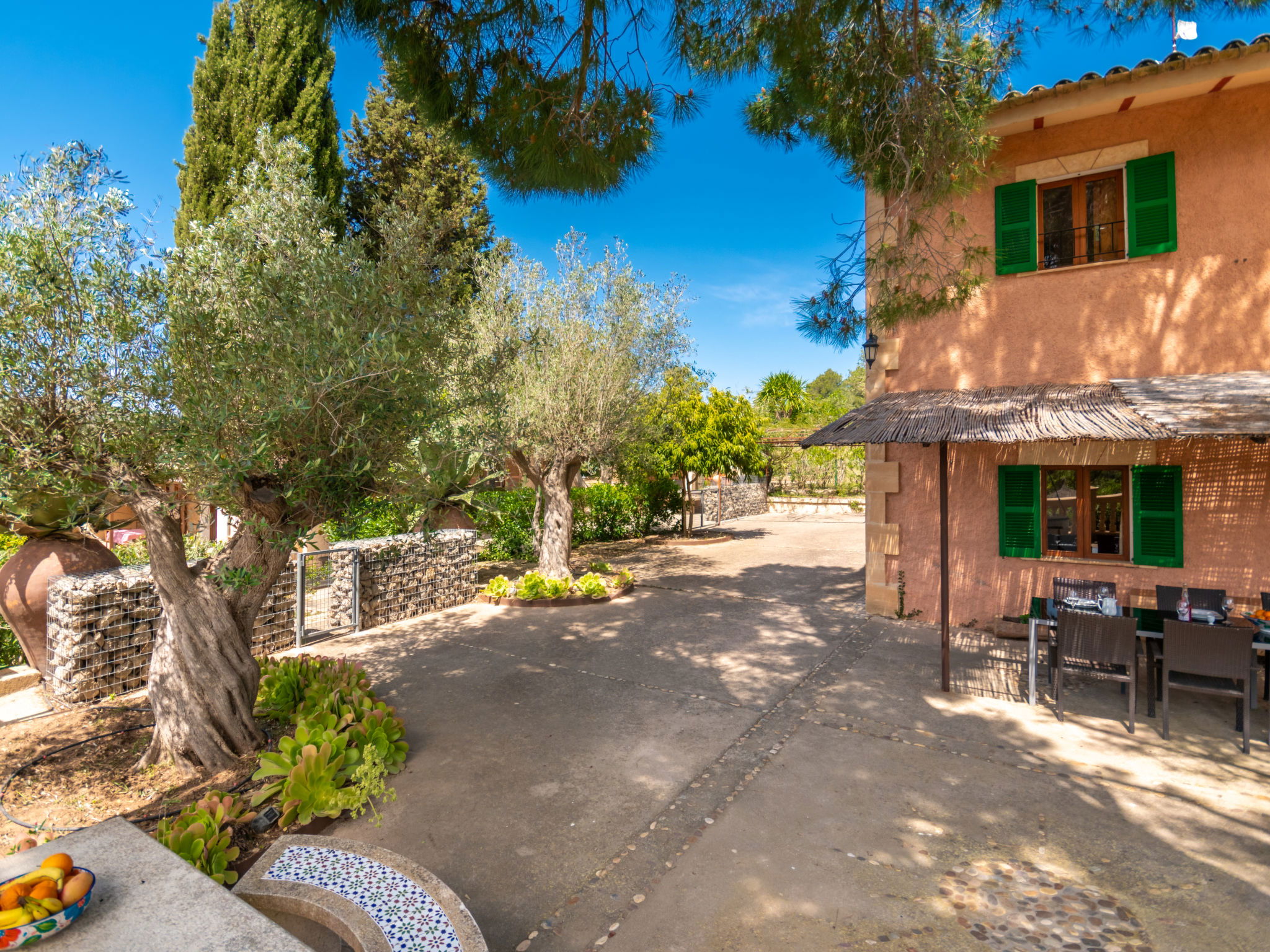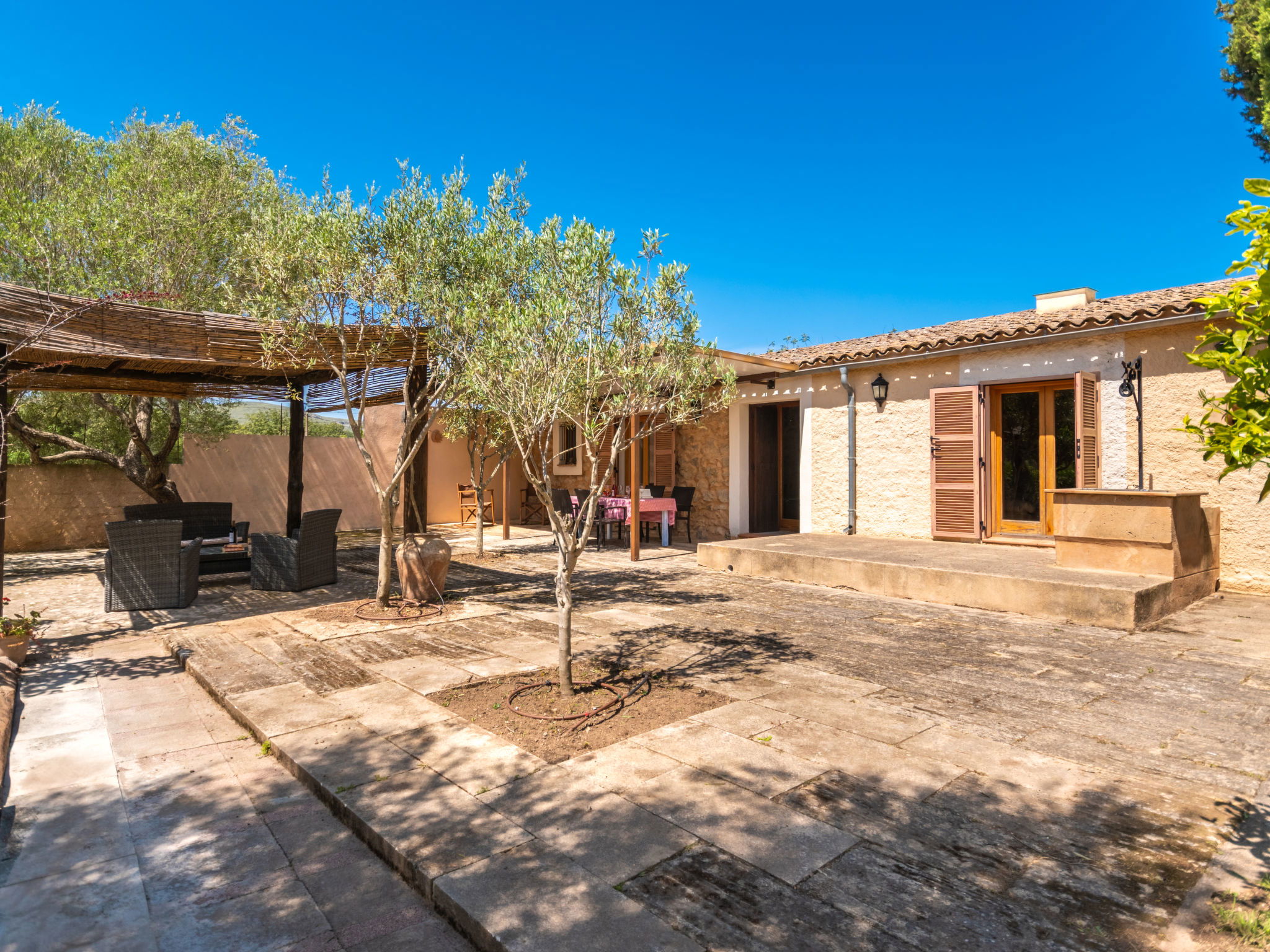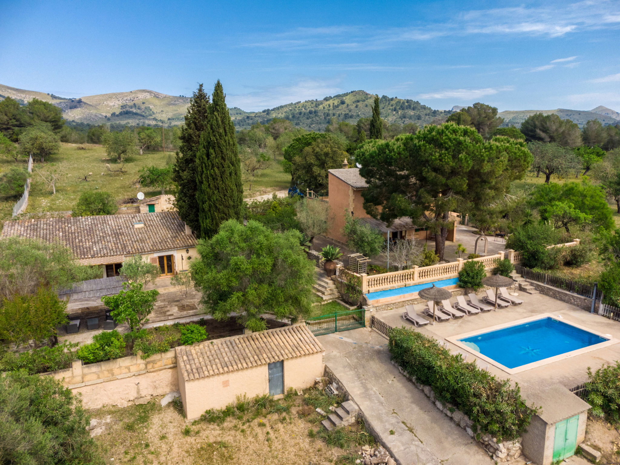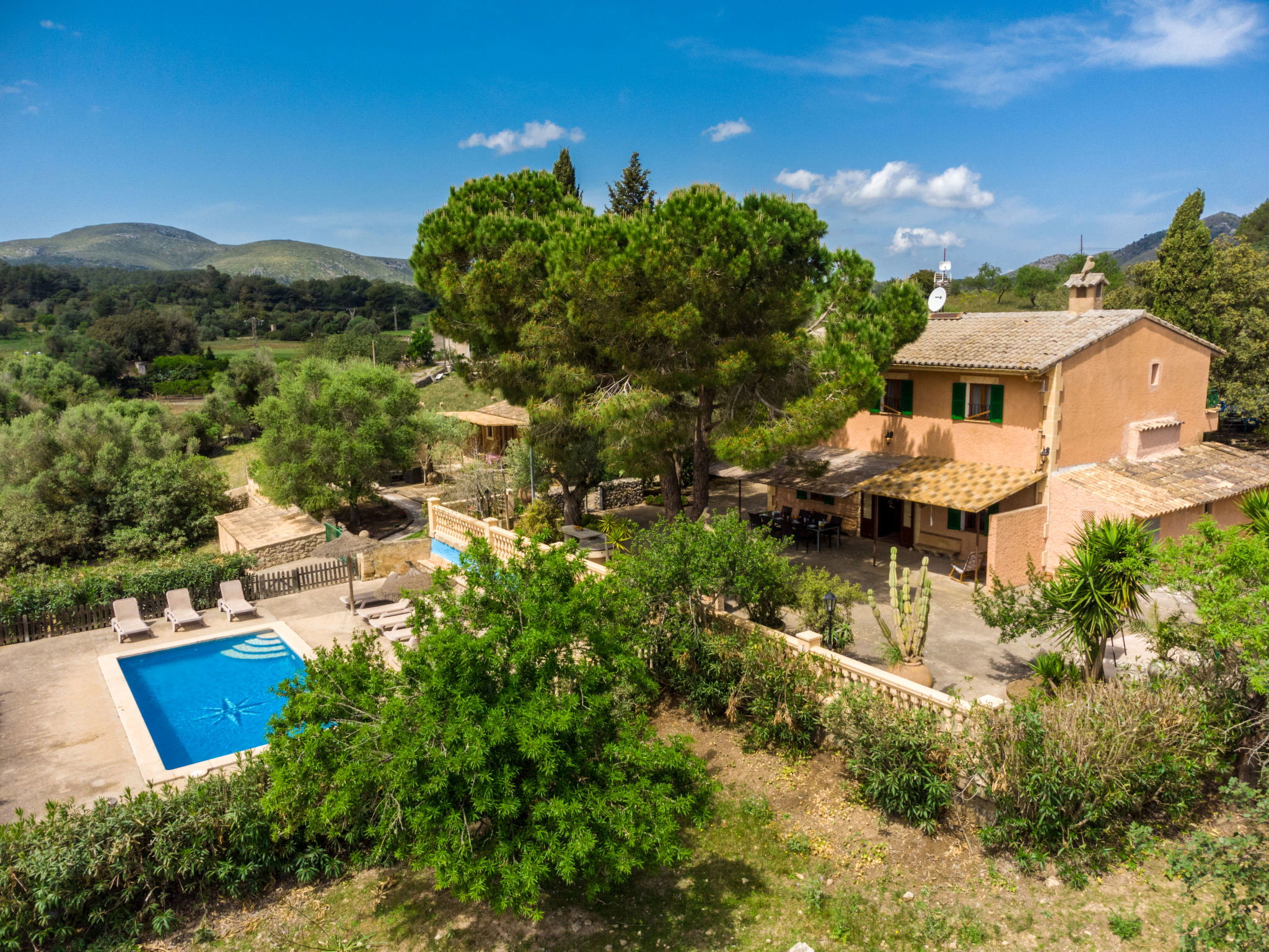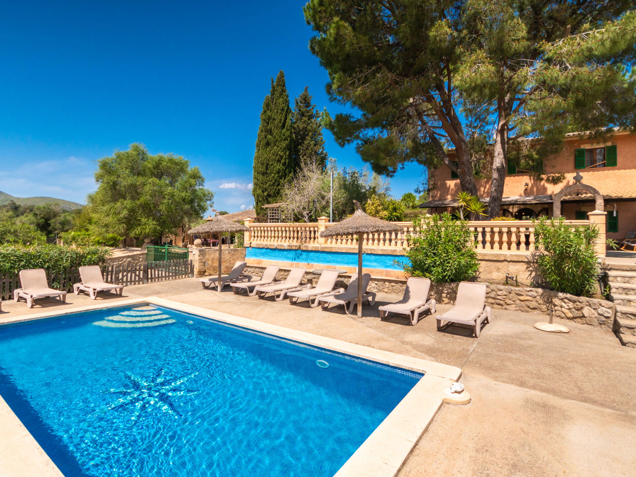 Very large, cosy farm estate "Capella Rubi", 2 storeys, renovated, surrounded by fields. Property composed of main house and outbuilding, outside the resort, 4.2 km from the centre of Artà, in a quiet, sunny position, 11 km from the beach, in the countryside. Private: natural state property (fenced), garden with wildlife garden and trees, swimming pool angular (8 x 4 m, depth 100 - 160 cm, seasonal availability: 01.Jan. - 31.Dec.). WC in the pool area, outdoor shower, patio, arbour, pergola, garden furniture, barbecue, pool maintenance by the owner/gardener. In the house: internet access, WiFi, storage room for bicycles, air conditioning, burglar alarm system, washing machine. Parking at the house on the premises. Shop 4.2 km, supermarket 4.5 km, bakery 4.6 km, bus stop "Artà" 4.1 km, sandy beach "Son Serra de Marina" 11 km, shingle beach "Colònia Sant Pere" 9.3 km. Sports harbour 9 km, golf course 8 km, tennis 4 km, walking paths from the house 3.5 km, cycle lane 500 m. Nearby attractions: Artá Pueblo 4 km, Castillo de Capdepera 11.9 km, Colonia de Sant Pere - Betlem 10 km, Son Serra de Marina 12 km, Playa de Cala Agulla 14.5 km, Playa de Cala Torta - Cala Mesquida 15 km. Hiking paths: Ermita de Betlem 6.5 km, Arenalet d'Aubarca 13 km, Cap de Farrutx 14 km. Please note: car recommended. Object suitable for 9 adults. The owner does not accept any youth groups. Animals in the neighbourhood. Airfield 70 km from the property.
