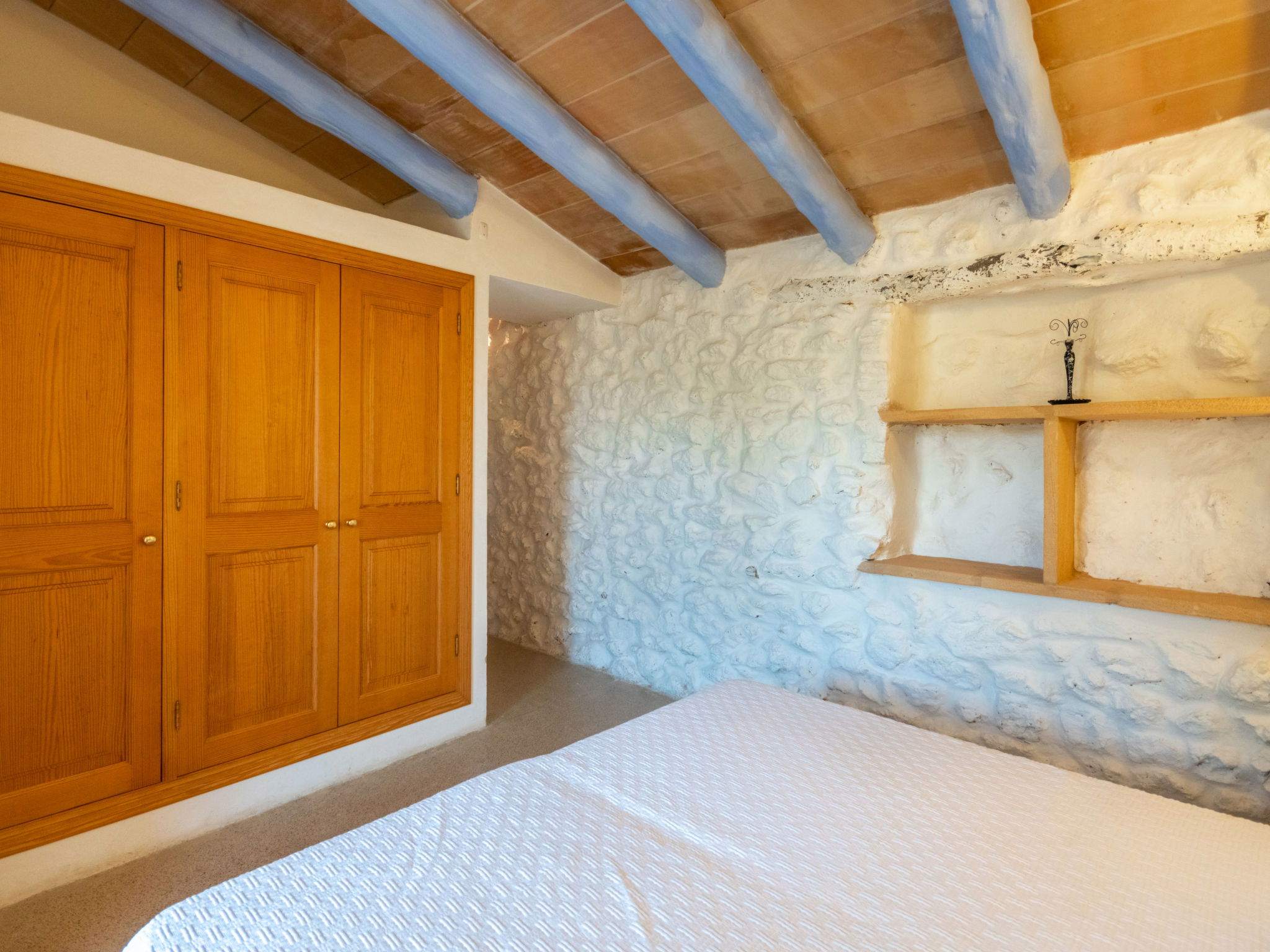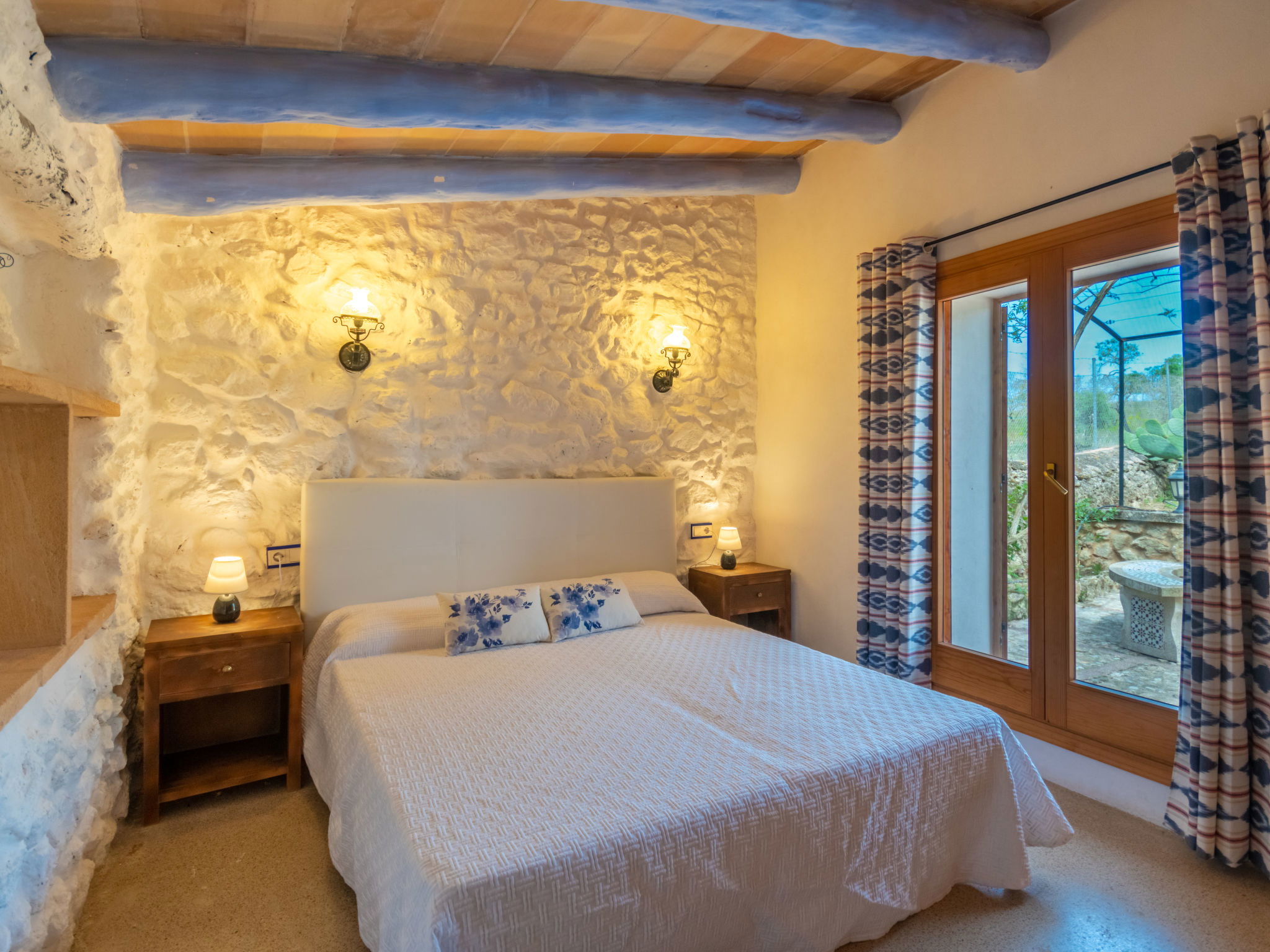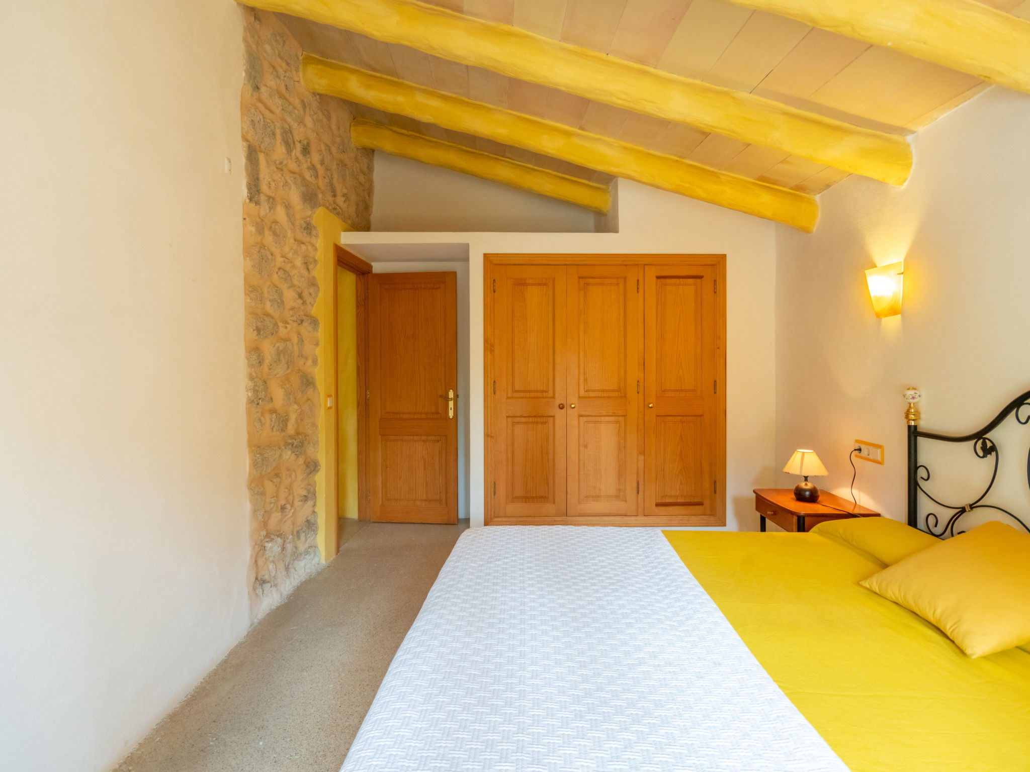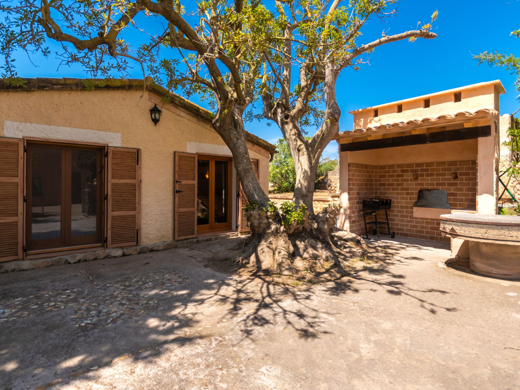 Very large, cosy farm estate "Capella Rubi", 2 storeys, renovated, surrounded by fields. Property composed of main house and outbuilding, outside the resort, 4.2 km from the centre of Artà, in a quiet, sunny position, 11 km from the beach, in the countryside. Private: natural state property (fenced), garden with wildlife garden and trees, swimming pool angular (8 x 4 m, depth 100 - 160 cm, seasonal availability: 01.Jan. - 31.Dec.). WC in the pool area, outdoor shower, patio, arbour, pergola, garden furniture, barbecue, pool maintenance by the owner/gardener. In the house: internet access, WiFi, storage room for bicycles, air conditioning, burglar alarm system, washing machine. Parking at the house on the premises. Shop 4.2 km, supermarket 4.5 km, bakery 4.6 km, bus stop "Artà" 4.1 km, sandy beach "Son Serra de Marina" 11 km, shingle beach "Colònia Sant Pere" 9.3 km. Sports harbour 9 km, golf course 8 km, tennis 4 km, walking paths from the house 3.5 km, cycle lane 500 m. Nearby attractions: Artá Pueblo 4 km, Castillo de Capdepera 11.9 km, Colonia de Sant Pere - Betlem 10 km, Son Serra de Marina 12 km, Playa de Cala Agulla 14.5 km, Playa de Cala Torta - Cala Mesquida 15 km. Hiking paths: Ermita de Betlem 6.5 km, Arenalet d'Aubarca 13 km, Cap de Farrutx 14 km. Please note: car recommended. Object suitable for 9 adults. The owner does not accept any youth groups. Animals in the neighbourhood. Airfield 70 km from the property.