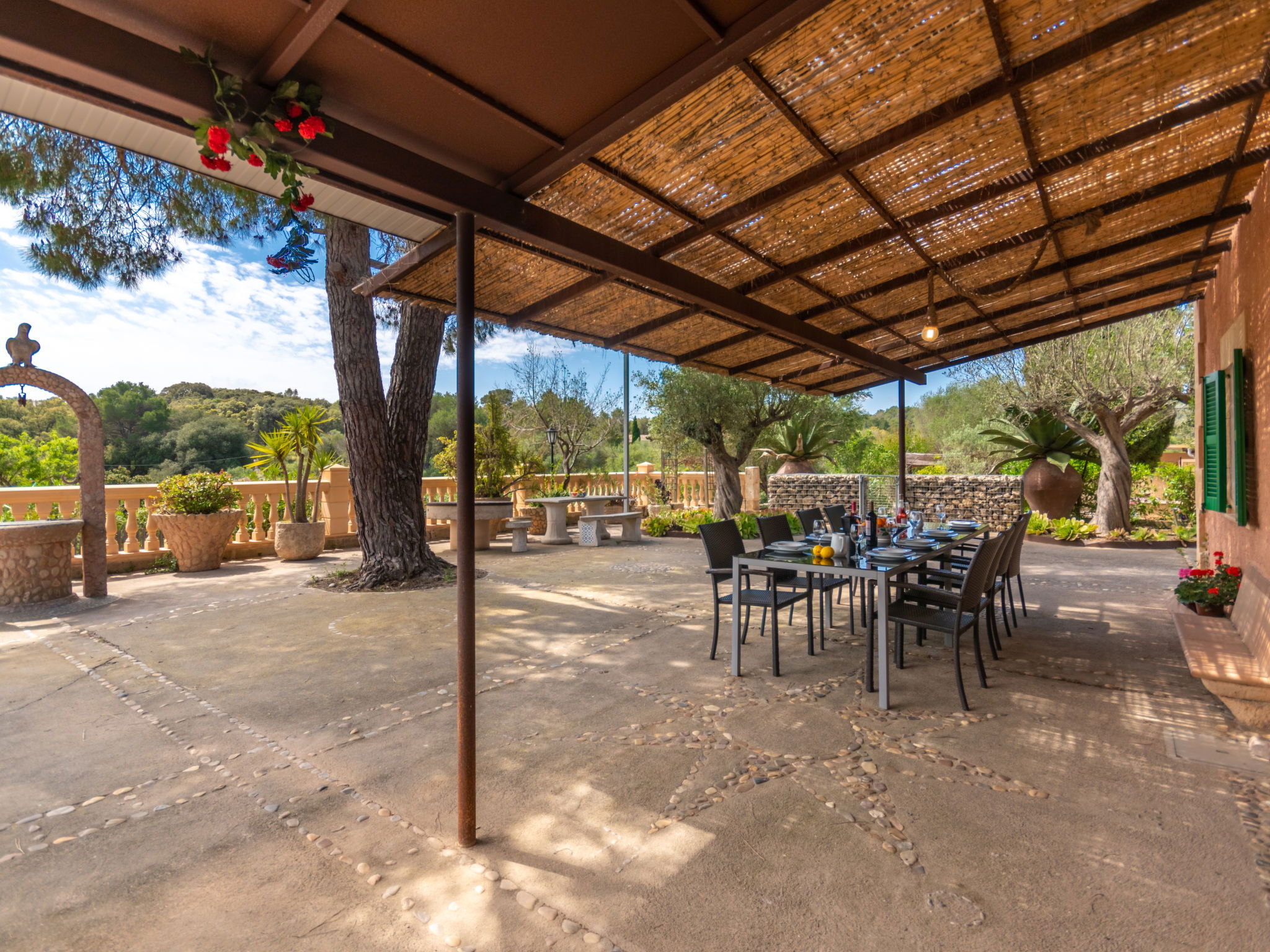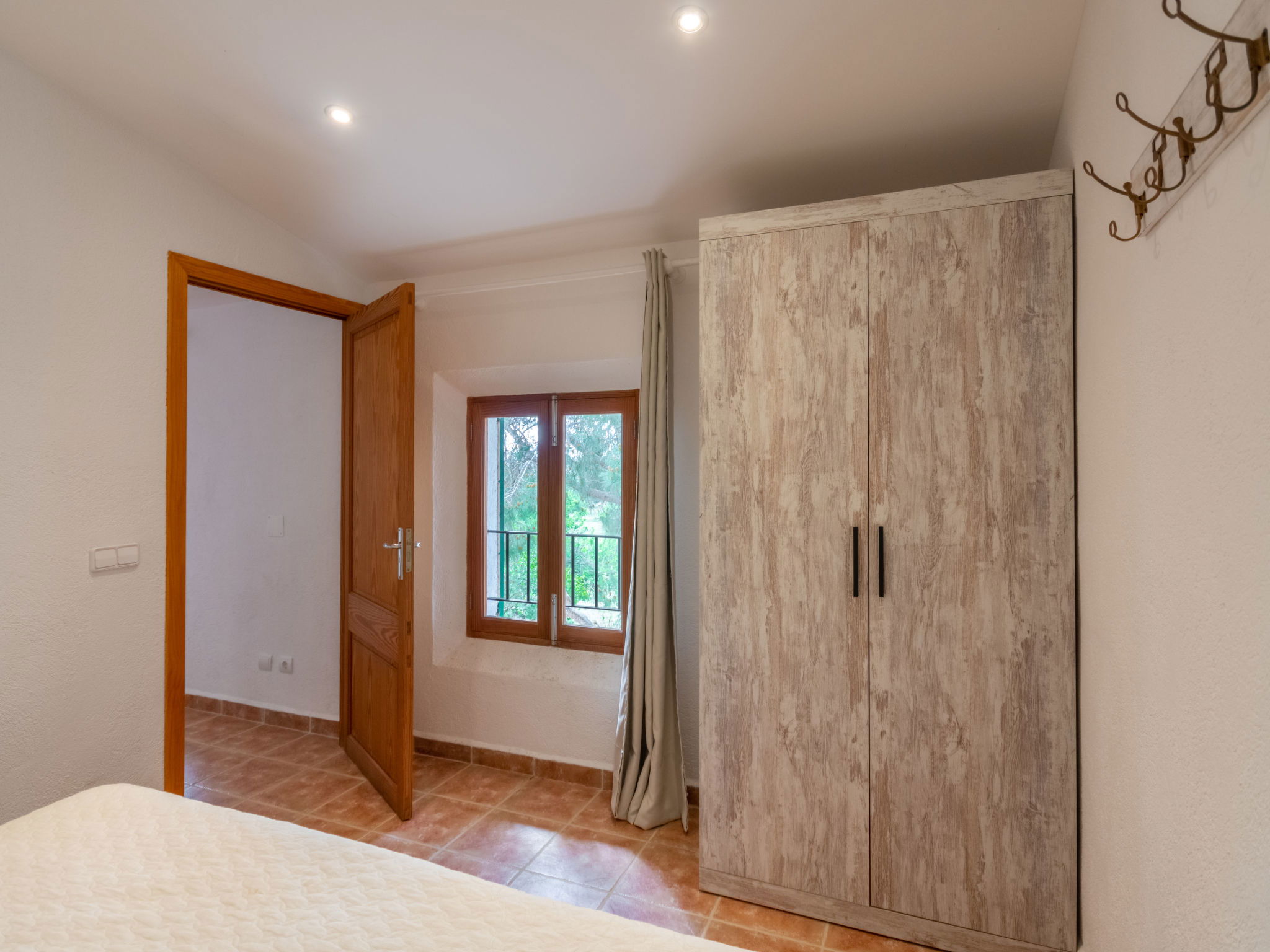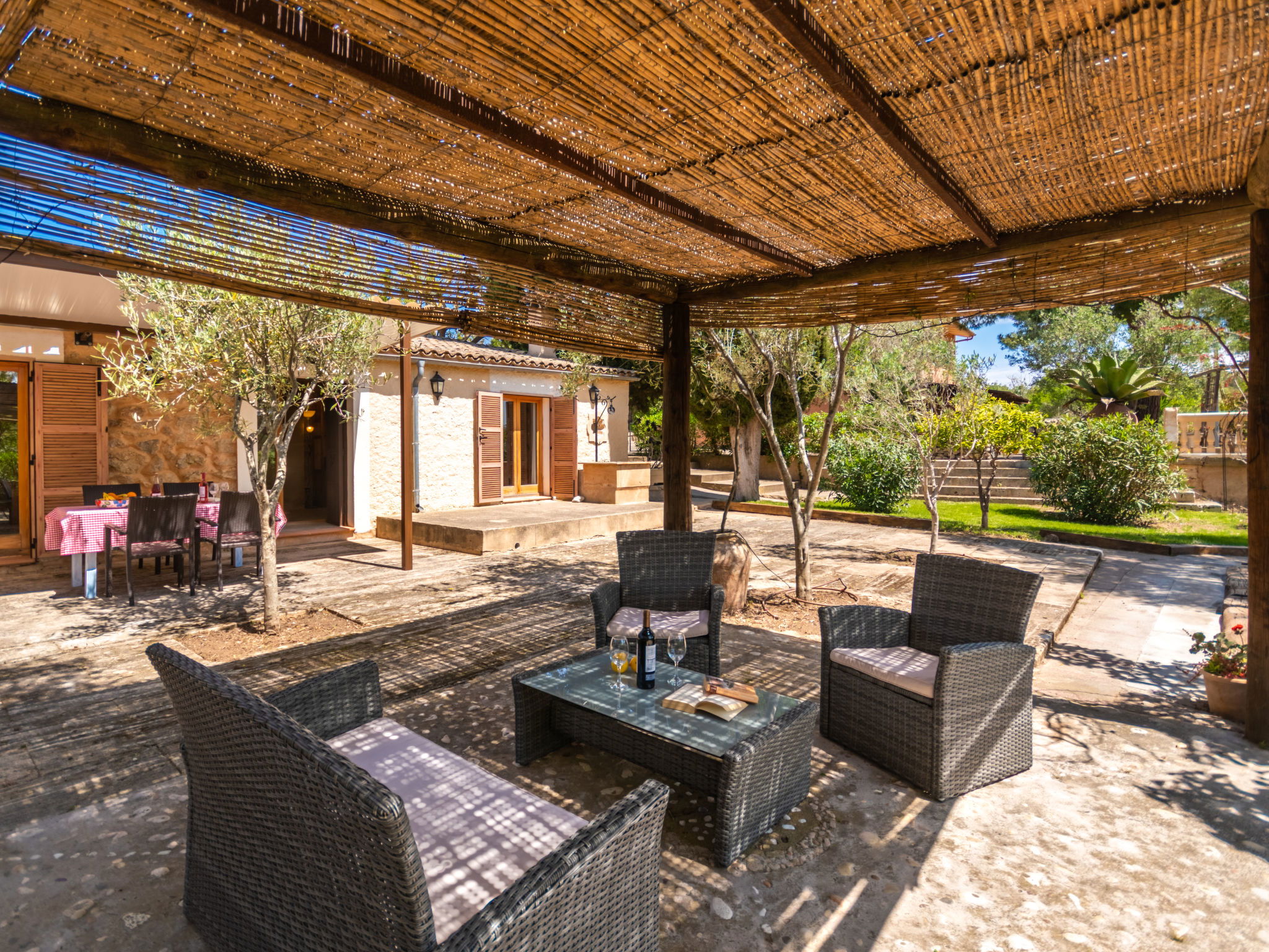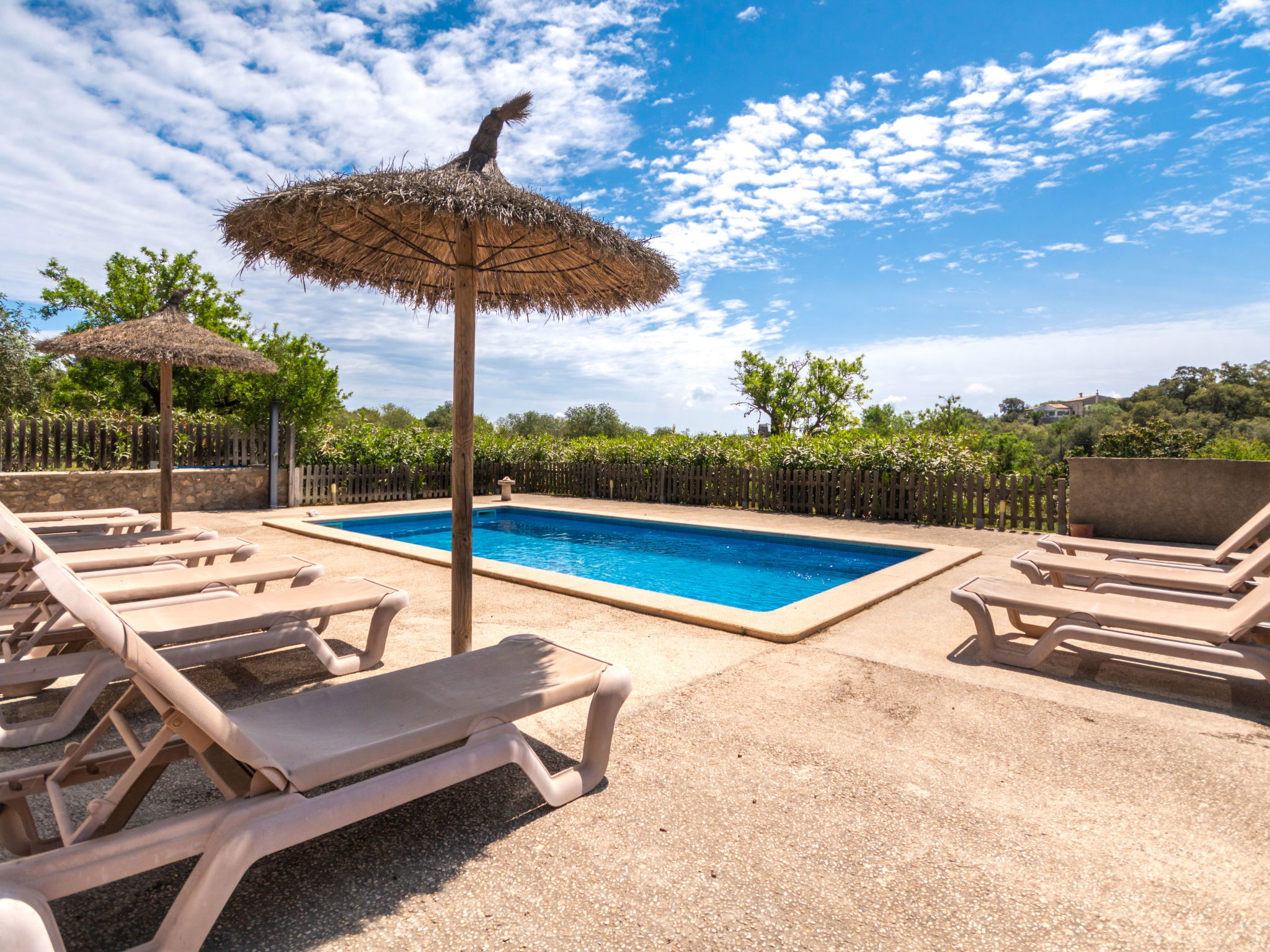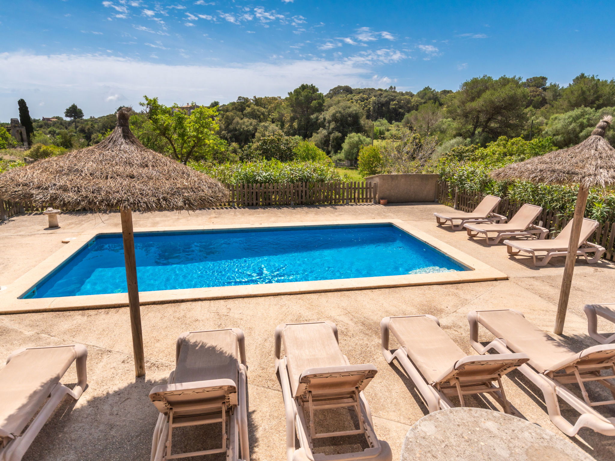 Very large, cosy farm estate "Capella Rubi", 2 storeys, renovated, surrounded by fields. Property composed of main house and outbuilding, outside the resort, 4.2 km from the centre of Artà, in a quiet, sunny position, 11 km from the beach, in the countryside. Private: natural state property (fenced), garden with wildlife garden and trees, swimming pool angular (8 x 4 m, depth 100 - 160 cm, seasonal availability: 01.Jan. - 31.Dec.). WC in the pool area, outdoor shower, patio, arbour, pergola, garden furniture, barbecue, pool maintenance by the owner/gardener. In the house: internet access, WiFi, storage room for bicycles, air conditioning, burglar alarm system, washing machine. Parking at the house on the premises. Shop 4.2 km, supermarket 4.5 km, bakery 4.6 km, bus stop "Artà" 4.1 km, sandy beach "Son Serra de Marina" 11 km, shingle beach "Colònia Sant Pere" 9.3 km. Sports harbour 9 km, golf course 8 km, tennis 4 km, walking paths from the house 3.5 km, cycle lane 500 m. Nearby attractions: Artá Pueblo 4 km, Castillo de Capdepera 11.9 km, Colonia de Sant Pere - Betlem 10 km, Son Serra de Marina 12 km, Playa de Cala Agulla 14.5 km, Playa de Cala Torta - Cala Mesquida 15 km. Hiking paths: Ermita de Betlem 6.5 km, Arenalet d'Aubarca 13 km, Cap de Farrutx 14 km. Please note: car recommended. Object suitable for 9 adults. The owner does not accept any youth groups. Animals in the neighbourhood. Airfield 70 km from the property.