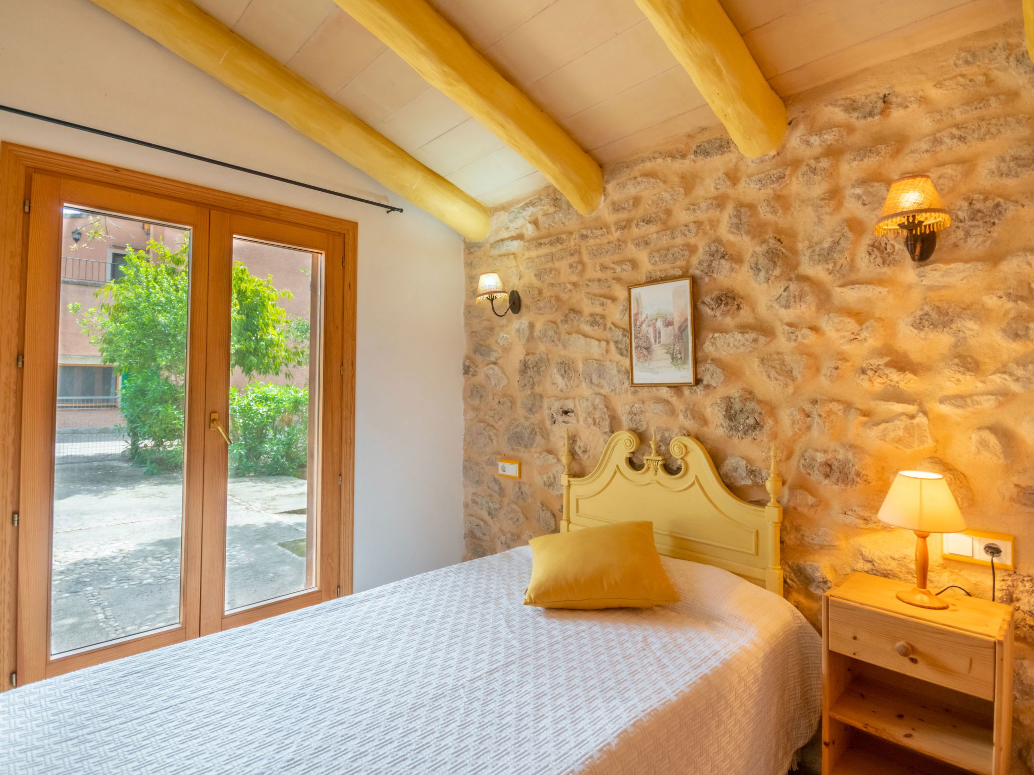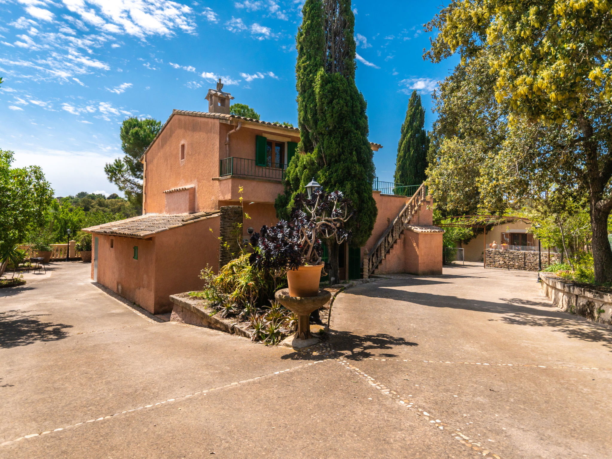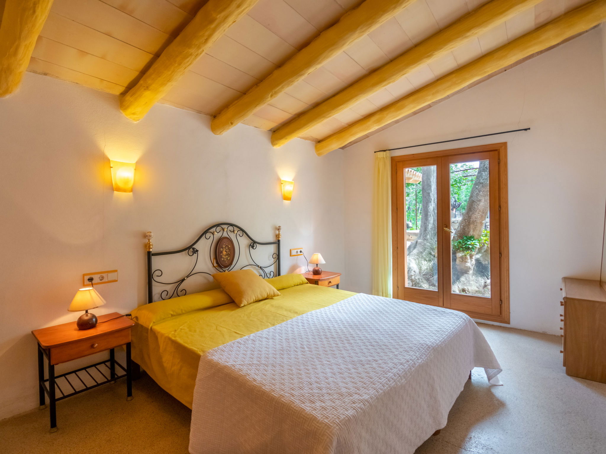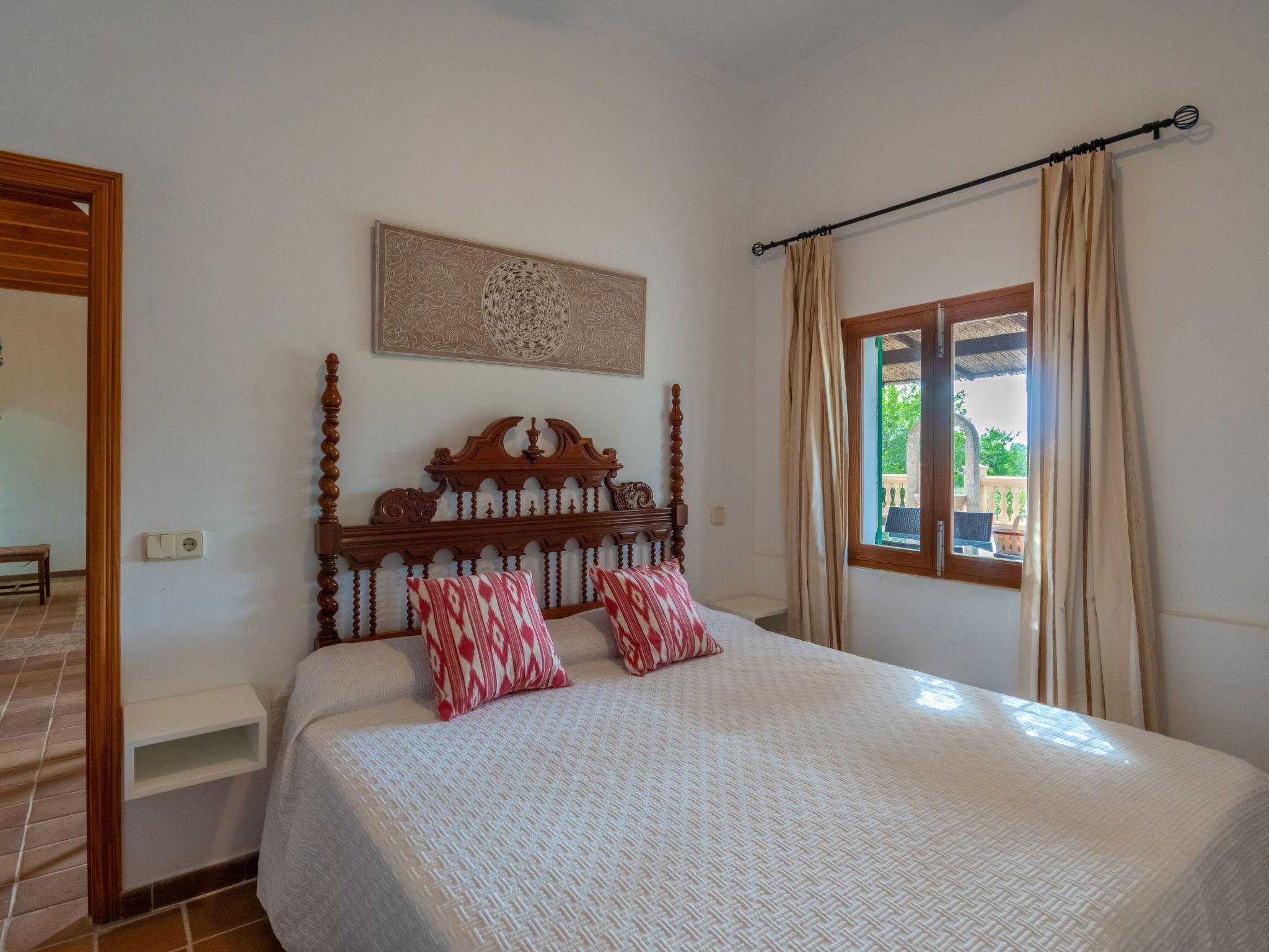 Very large, cosy farm estate "Capella Rubi", 2 storeys, renovated, surrounded by fields. Property composed of main house and outbuilding, outside the resort, 4.2 km from the centre of Artà, in a quiet, sunny position, 11 km from the beach, in the countryside. Private: natural state property (fenced), garden with wildlife garden and trees, swimming pool angular (8 x 4 m, depth 100 - 160 cm, seasonal availability: 01.Jan. - 31.Dec.). WC in the pool area, outdoor shower, patio, arbour, pergola, garden furniture, barbecue, pool maintenance by the owner/gardener. In the house: internet access, WiFi, storage room for bicycles, air conditioning, burglar alarm system, washing machine. Parking at the house on the premises. Shop 4.2 km, supermarket 4.5 km, bakery 4.6 km, bus stop "Artà" 4.1 km, sandy beach "Son Serra de Marina" 11 km, shingle beach "Colònia Sant Pere" 9.3 km. Sports harbour 9 km, golf course 8 km, tennis 4 km, walking paths from the house 3.5 km, cycle lane 500 m. Nearby attractions: Artá Pueblo 4 km, Castillo de Capdepera 11.9 km, Colonia de Sant Pere - Betlem 10 km, Son Serra de Marina 12 km, Playa de Cala Agulla 14.5 km, Playa de Cala Torta - Cala Mesquida 15 km. Hiking paths: Ermita de Betlem 6.5 km, Arenalet d'Aubarca 13 km, Cap de Farrutx 14 km. Please note: car recommended. Object suitable for 9 adults. The owner does not accept any youth groups. Animals in the neighbourhood. Airfield 70 km from the property.
