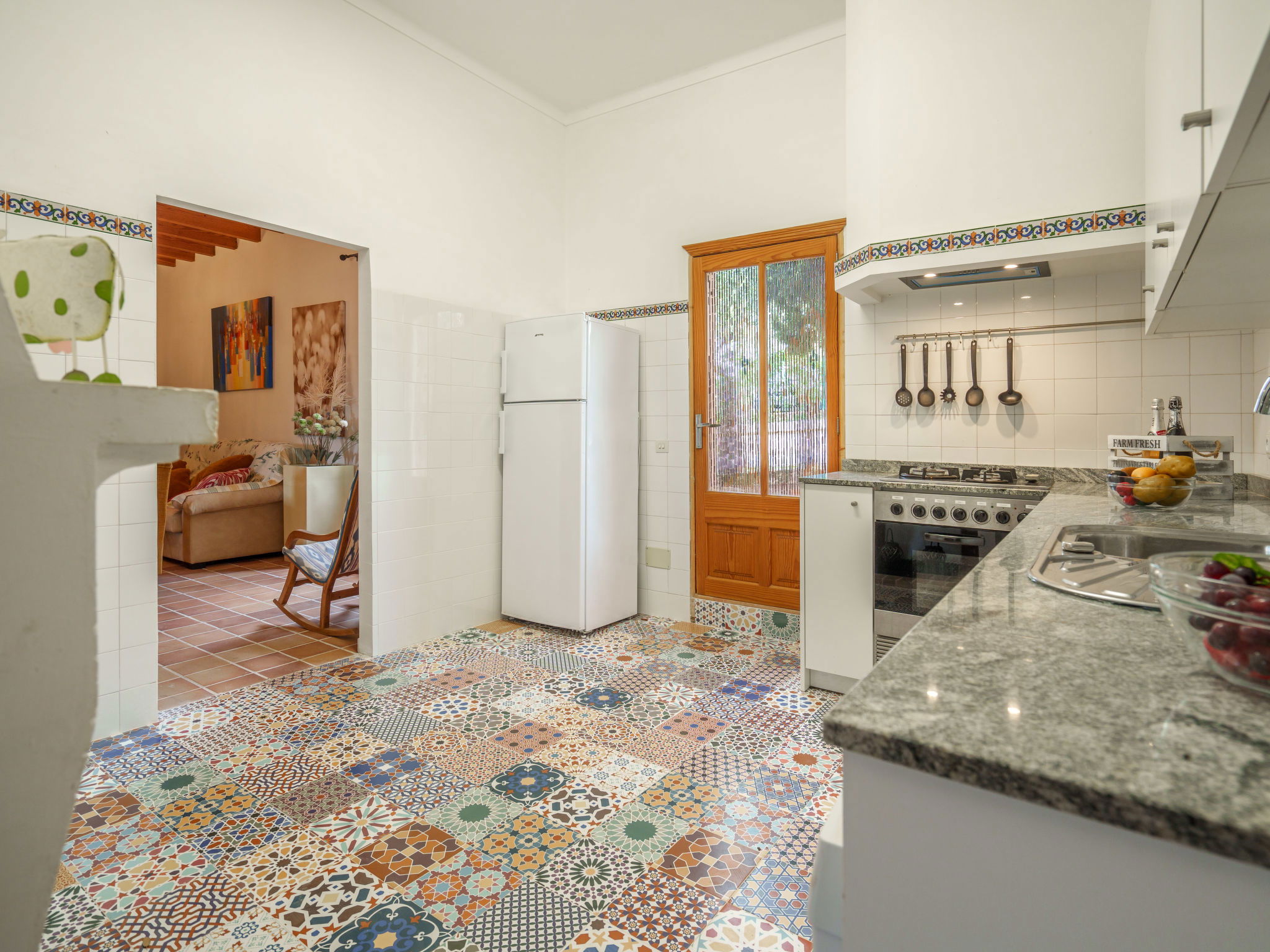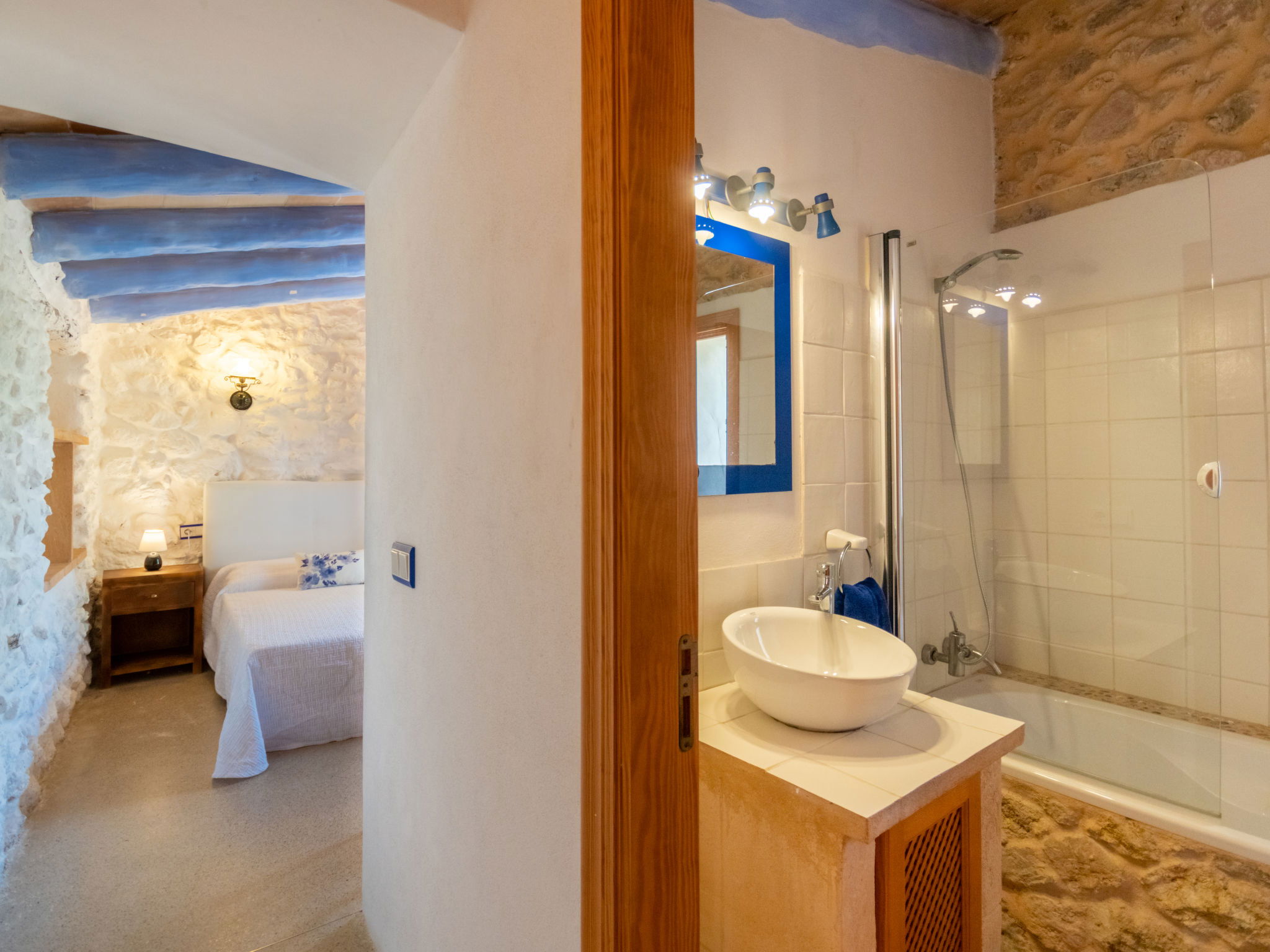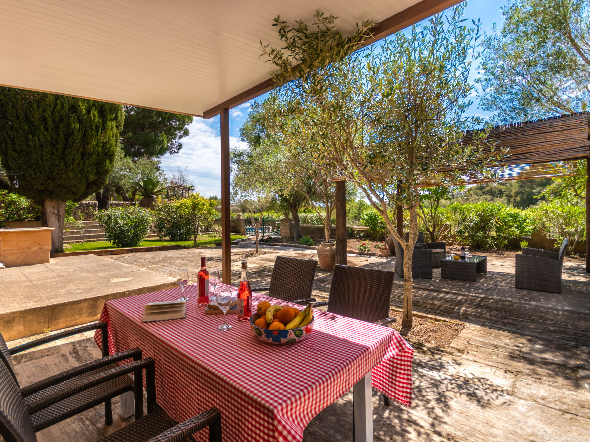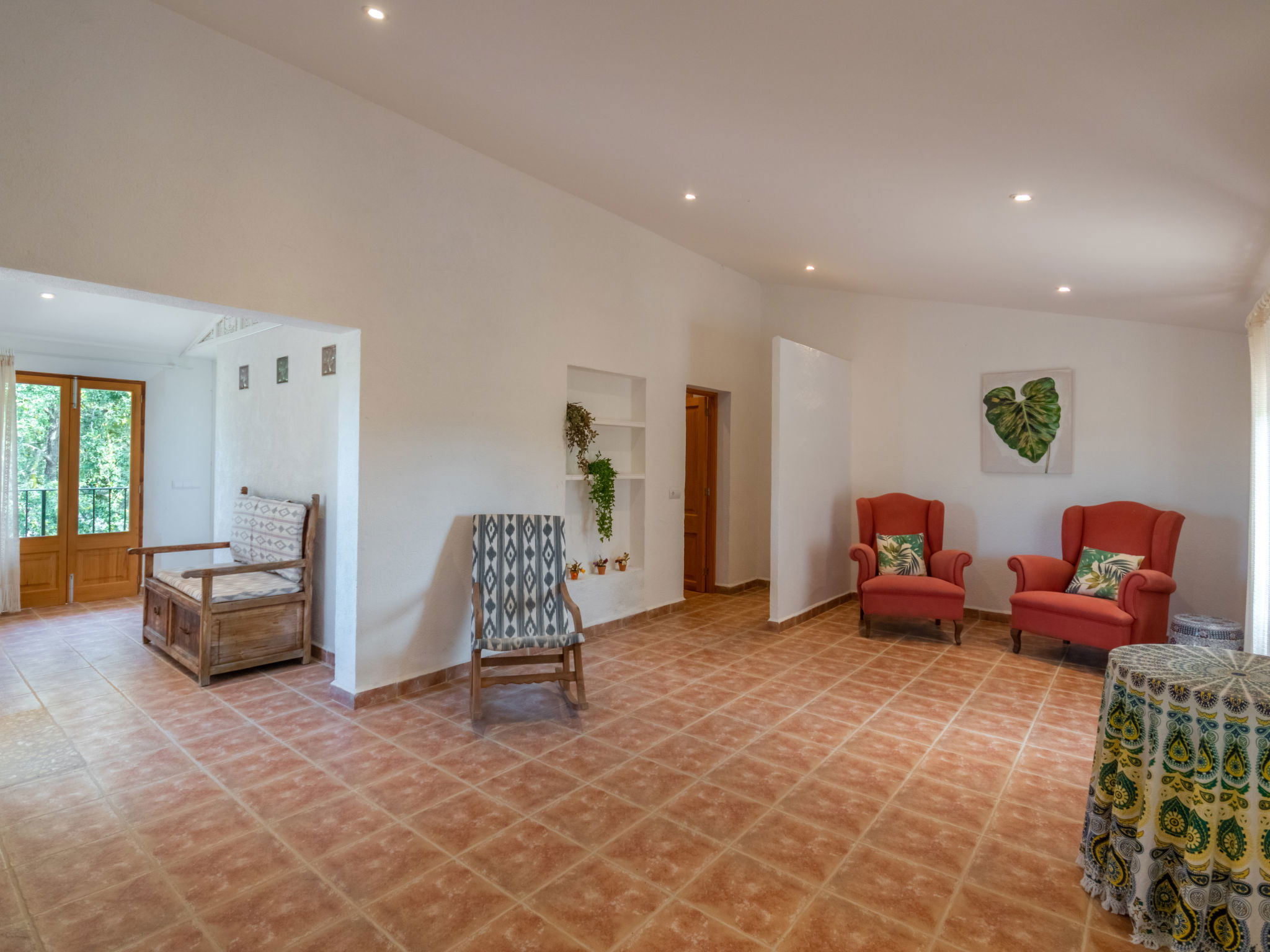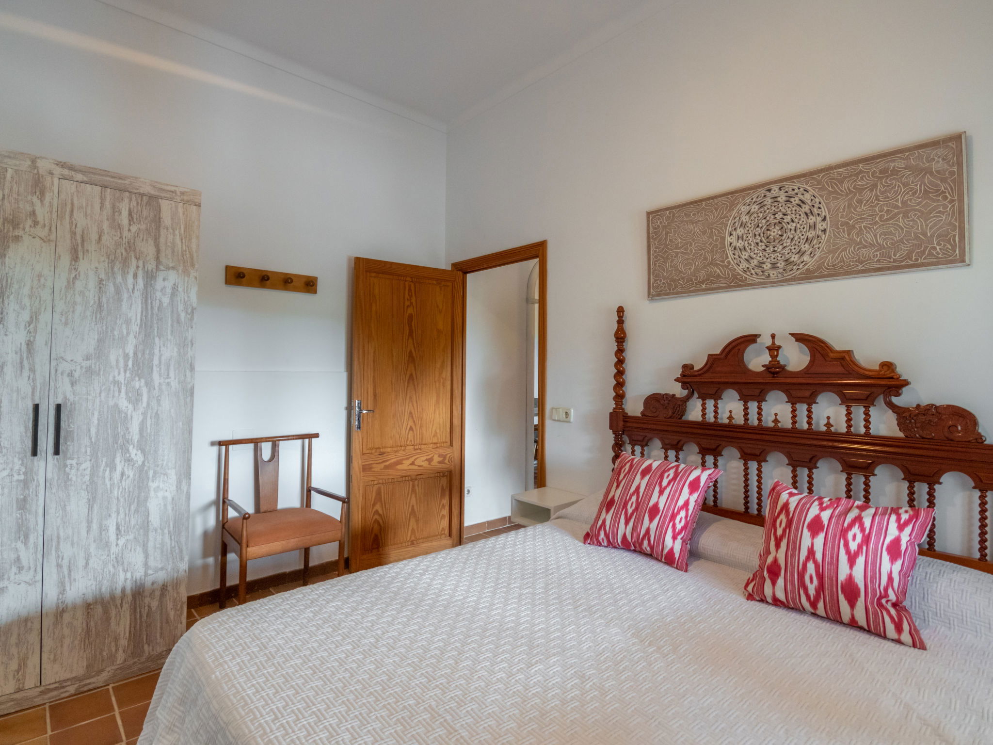 Very large, cosy farm estate "Capella Rubi", 2 storeys, renovated, surrounded by fields. Property composed of main house and outbuilding, outside the resort, 4.2 km from the centre of Artà, in a quiet, sunny position, 11 km from the beach, in the countryside. Private: natural state property (fenced), garden with wildlife garden and trees, swimming pool angular (8 x 4 m, depth 100 - 160 cm, seasonal availability: 01.Jan. - 31.Dec.). WC in the pool area, outdoor shower, patio, arbour, pergola, garden furniture, barbecue, pool maintenance by the owner/gardener. In the house: internet access, WiFi, storage room for bicycles, air conditioning, burglar alarm system, washing machine. Parking at the house on the premises. Shop 4.2 km, supermarket 4.5 km, bakery 4.6 km, bus stop "Artà" 4.1 km, sandy beach "Son Serra de Marina" 11 km, shingle beach "Colònia Sant Pere" 9.3 km. Sports harbour 9 km, golf course 8 km, tennis 4 km, walking paths from the house 3.5 km, cycle lane 500 m. Nearby attractions: Artá Pueblo 4 km, Castillo de Capdepera 11.9 km, Colonia de Sant Pere - Betlem 10 km, Son Serra de Marina 12 km, Playa de Cala Agulla 14.5 km, Playa de Cala Torta - Cala Mesquida 15 km. Hiking paths: Ermita de Betlem 6.5 km, Arenalet d'Aubarca 13 km, Cap de Farrutx 14 km. Please note: car recommended. Object suitable for 9 adults. The owner does not accept any youth groups. Animals in the neighbourhood. Airfield 70 km from the property.