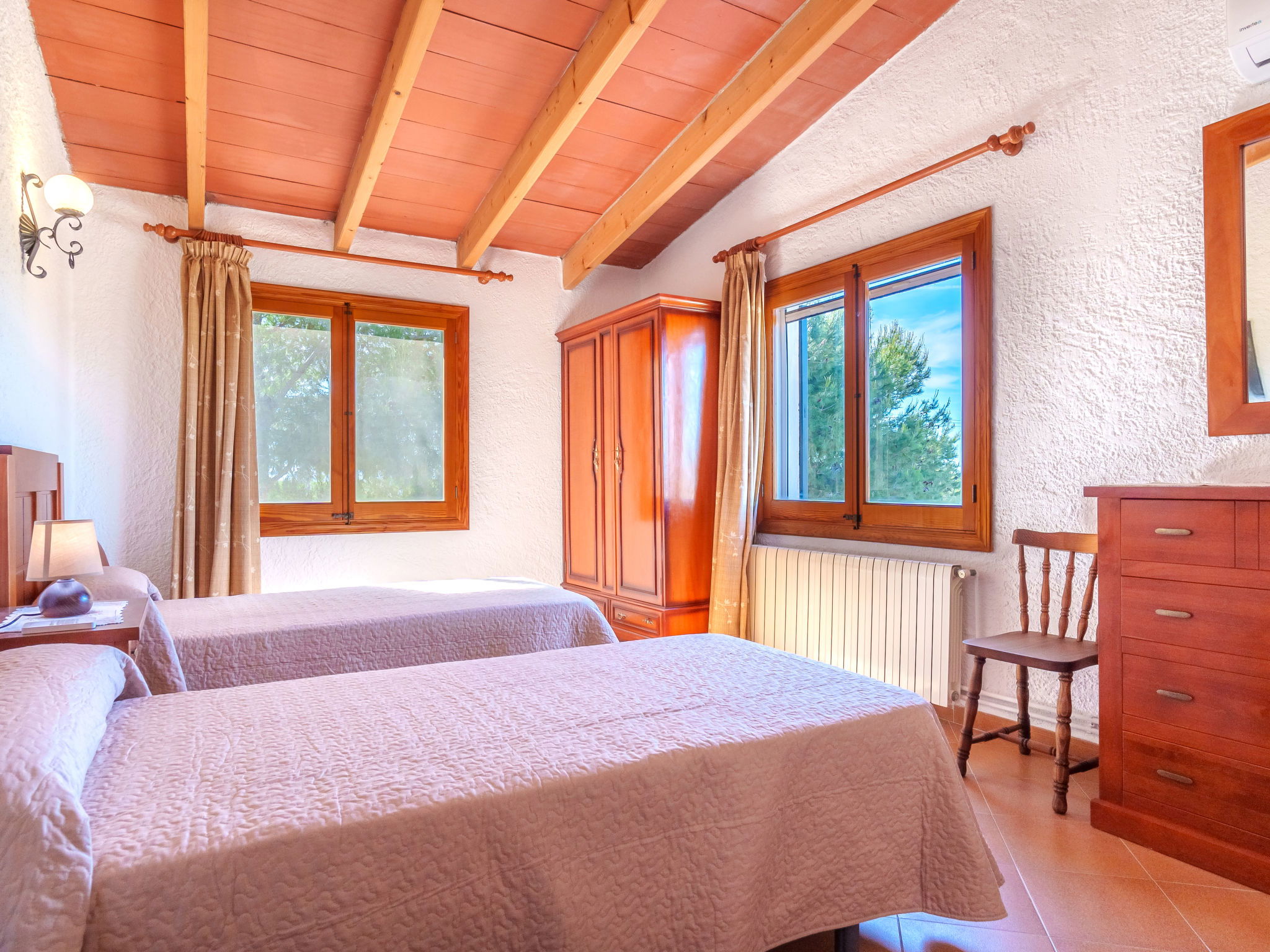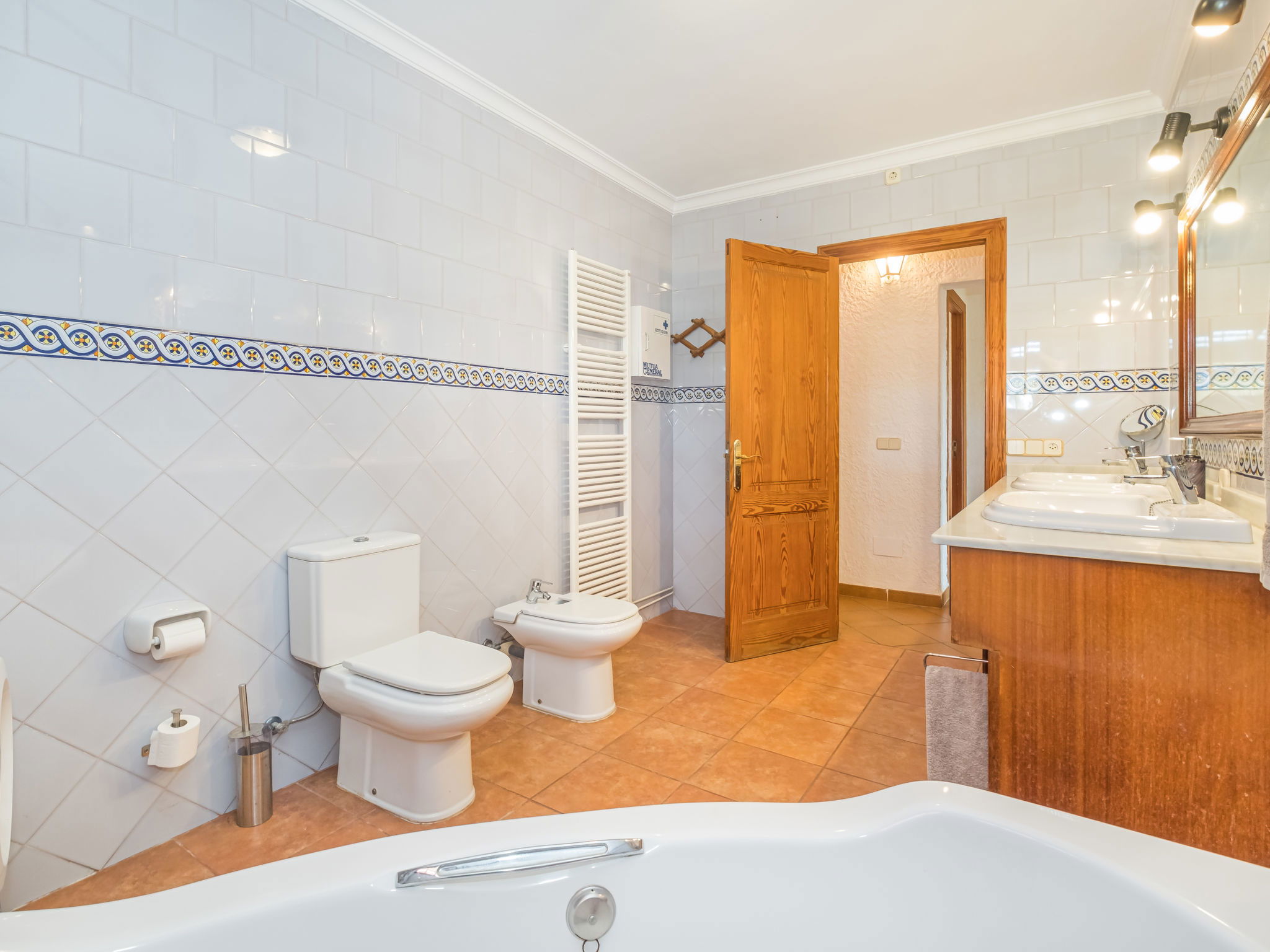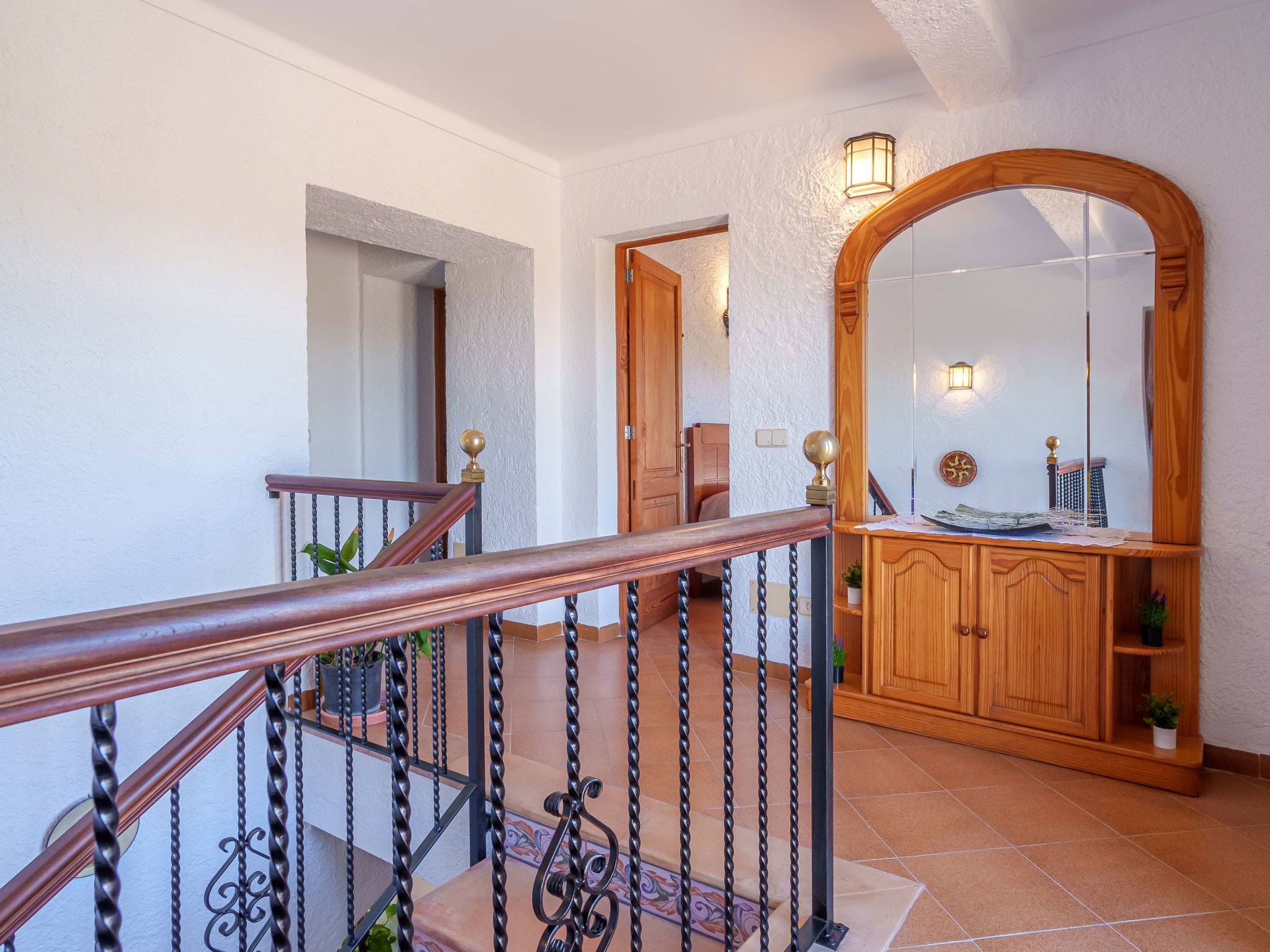 "Ca na Fideu", 5-room villa 234 m2. Object suitable for 8 adults. Spacious, comfortable and beautiful furnishings: living/dining room with dining table, digital TV and international TV channels. Exit to the patio. Kitchen (4 hot plates, oven, dishwasher, toaster, kettle, microwave, electric coffee machine) with dining table, fan. 2 baths/bidet/WC. No heating option. Upper floor: 2 double bedrooms with panoramic window, each room with 1 french bed (160 cm, length 190 cm), fan. 2 double bedrooms with panoramic window, each room with 2 beds (90 cm, length 190 cm), air conditioning and forced-air heating. Patio, lawn, porch. Terrace furniture, barbecue, deck chairs, covered balcony. View of the sea, the mountains and the garden. Facilities: washing machine, safe, iron, children's high chair, baby cot for up to 2 year olds, hair dryer. Internet (WiFi, free). Reserved parking at the house. Suitable for families. ET-725