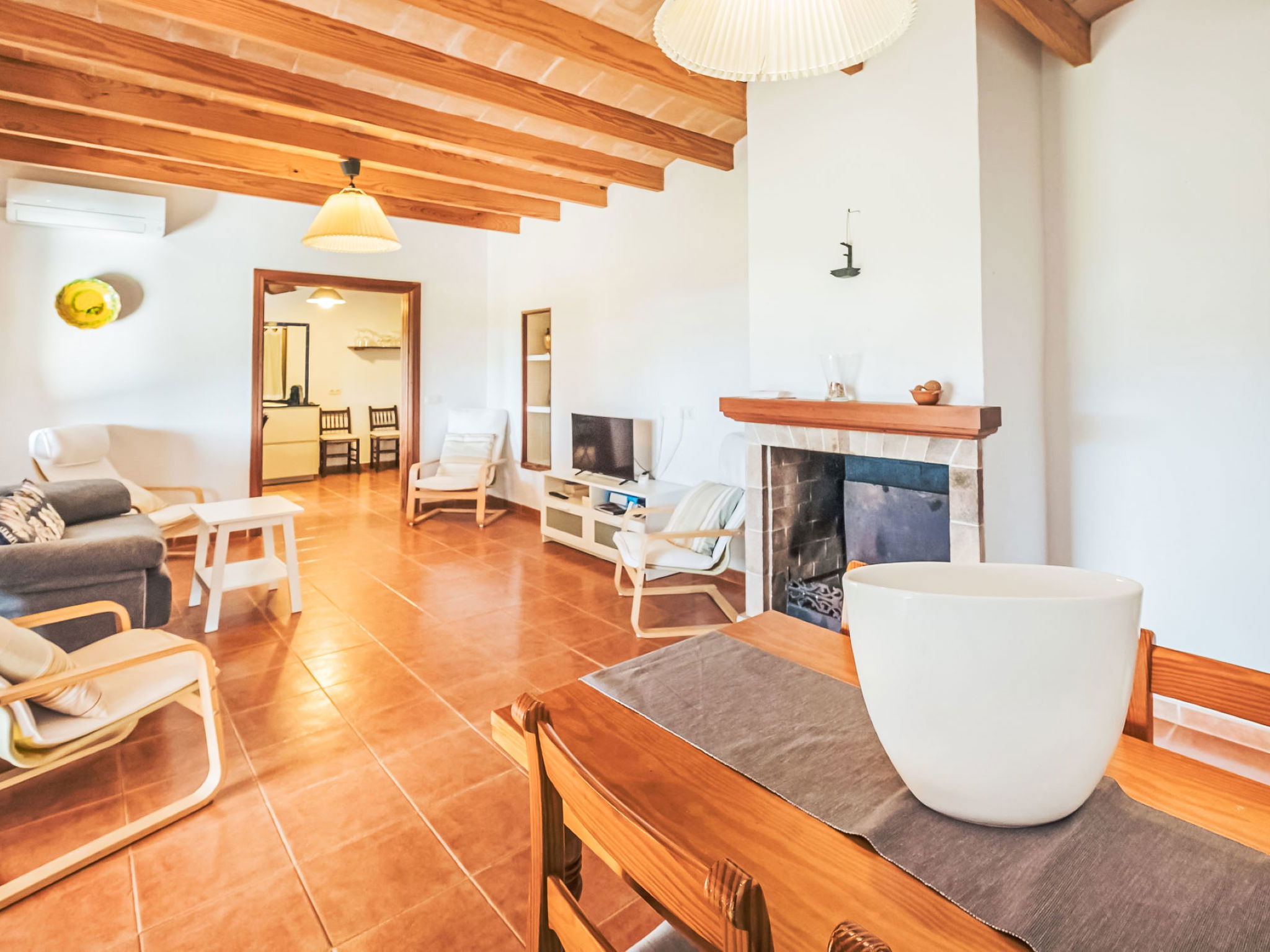 "Finca Ca na Brila", 4-room apartment 85 m2. Object suitable for 4 adults. Spacious, practical and cosy furnishings: living/dining room with open-hearth fireplace, dining nook, satellite TV and air conditioning. Exit to the patio. 2 double bedrooms, each room with 2 beds (90 cm, length 200 cm), air conditioning and forced-air heating. 1 double bedroom with 1 french bed (1 x 150 cm, length 200 cm), air conditioning and forced-air heating. Kitchen (4 hot plates, oven, dishwasher, toaster, kettle, microwave, electric coffee machine) with dining table. Shower/WC. Air-conditioning. Heating not available in all rooms. Panoramic view of the mountains. Facilities: washing machine, iron, children's high chair, baby cot for up to 2 year olds, hair dryer. Internet (WiFi, free). Garage. Suitable for families. Maximum 1 pet/ dog allowed. ETV/6609