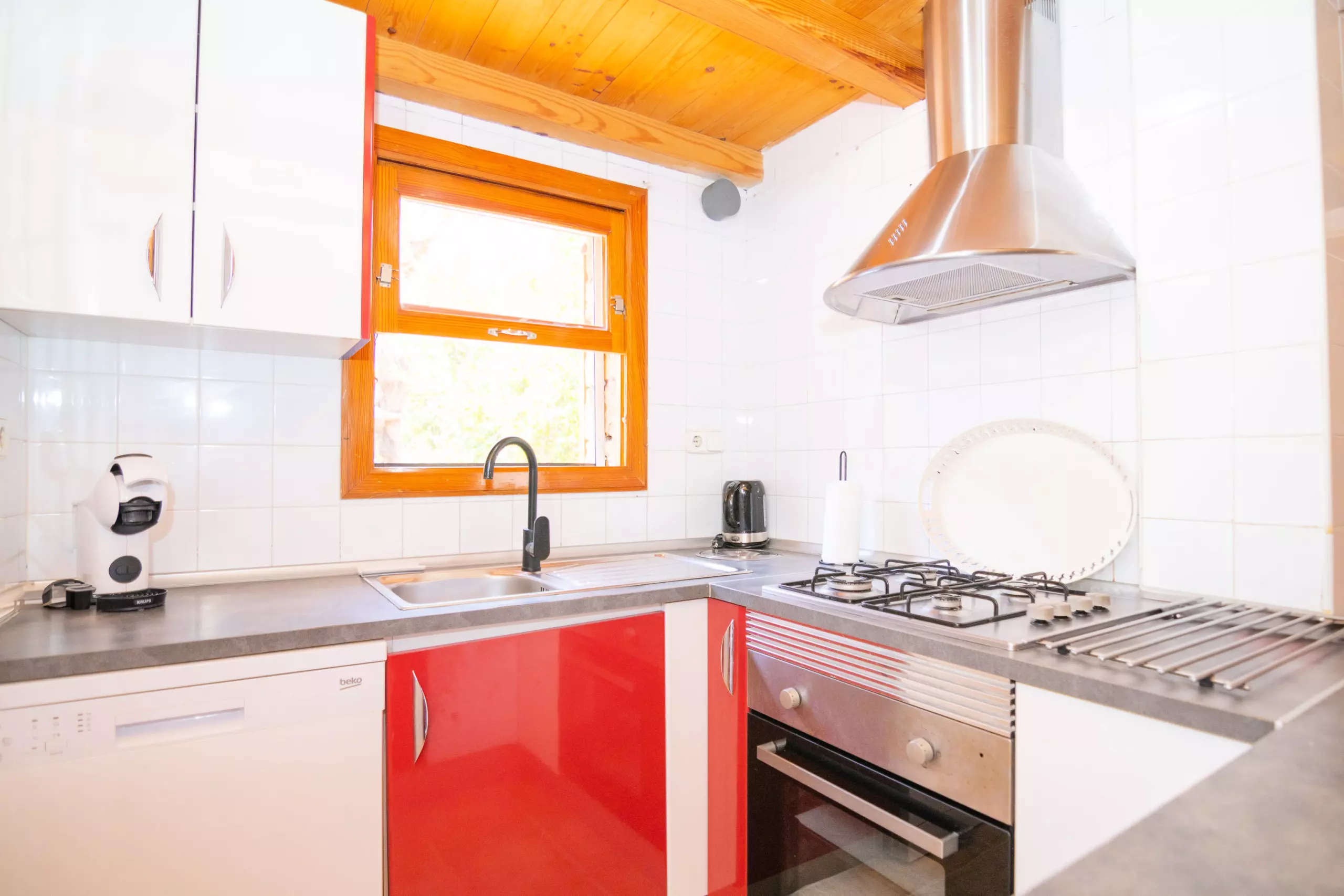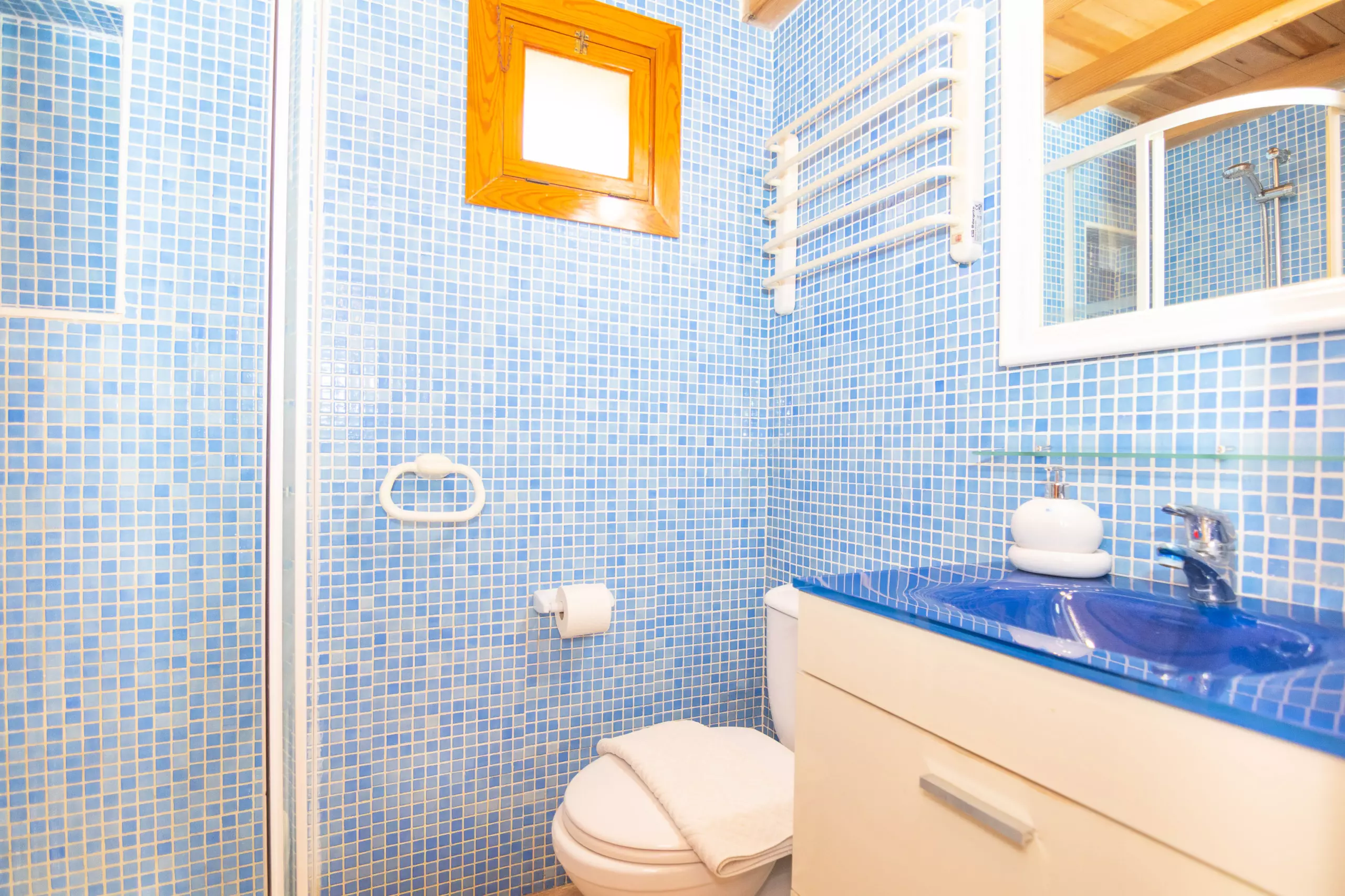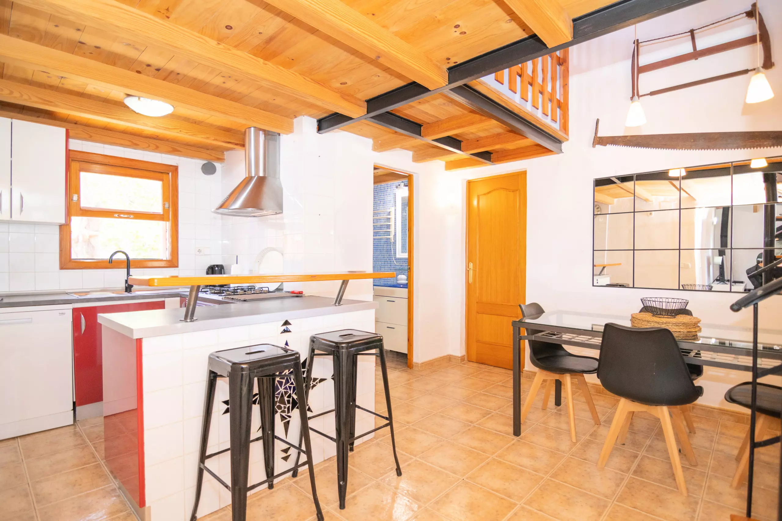 You enter the tastefully furnished living room. It features comfortable sofas, a television, and internet access. Next to the living room is a beautiful bedroom with a double bed. There is also a dining room with an integrated kitchen. From here, a beautiful spiral staircase leads to another bedroom with two single beds. Of the two bathrooms in the house, one has a shower and the other a bathtub.
