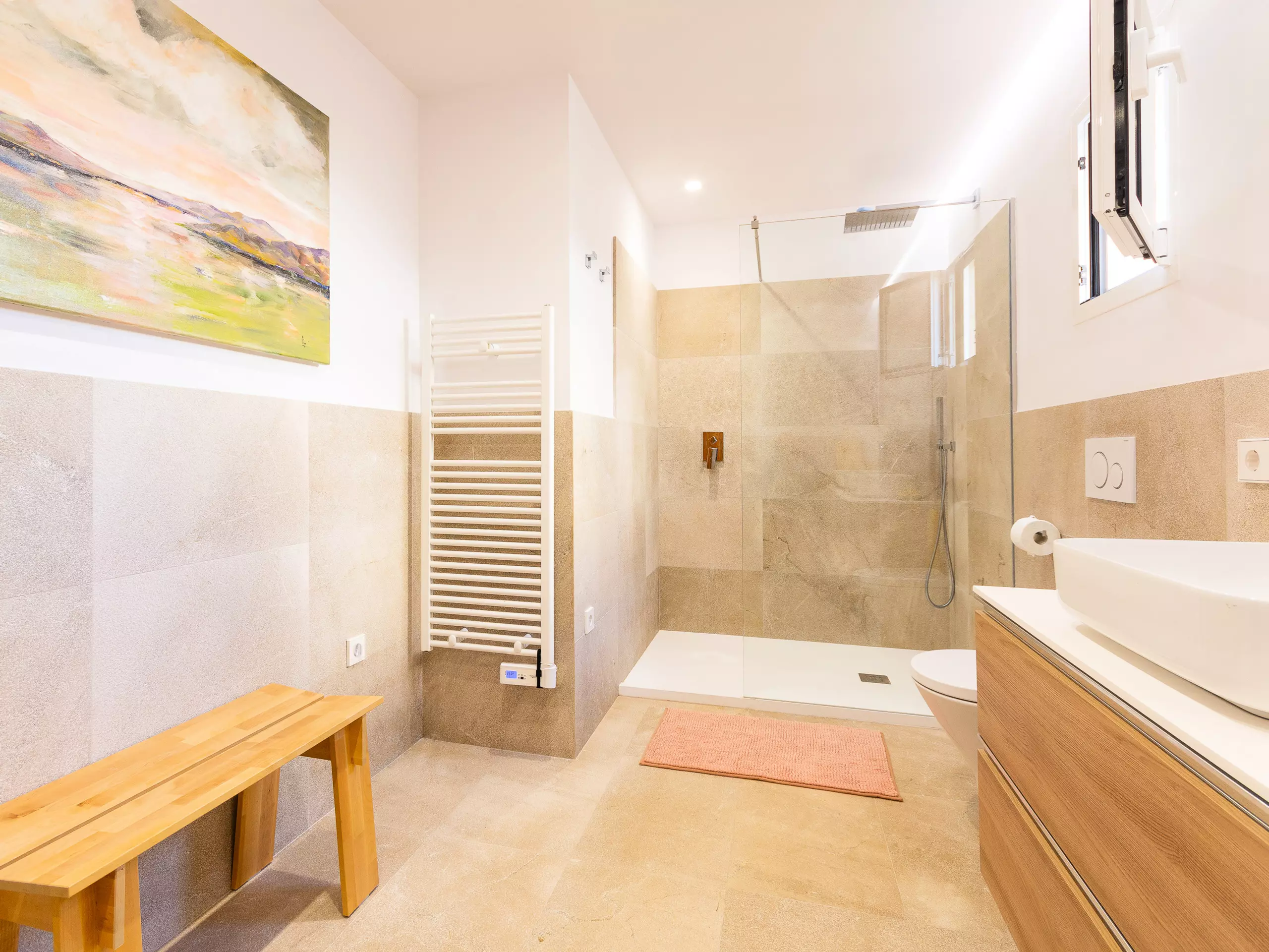 The villa has four bedrooms: two with twin beds and two with double beds, one of which has an en-suite bathroom. A second bathroom, also with a shower, serves the rest of the house. For families with children, a crib and high chair are available upon request.