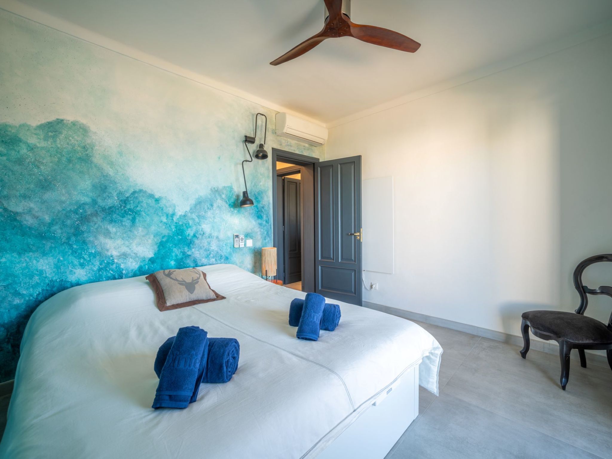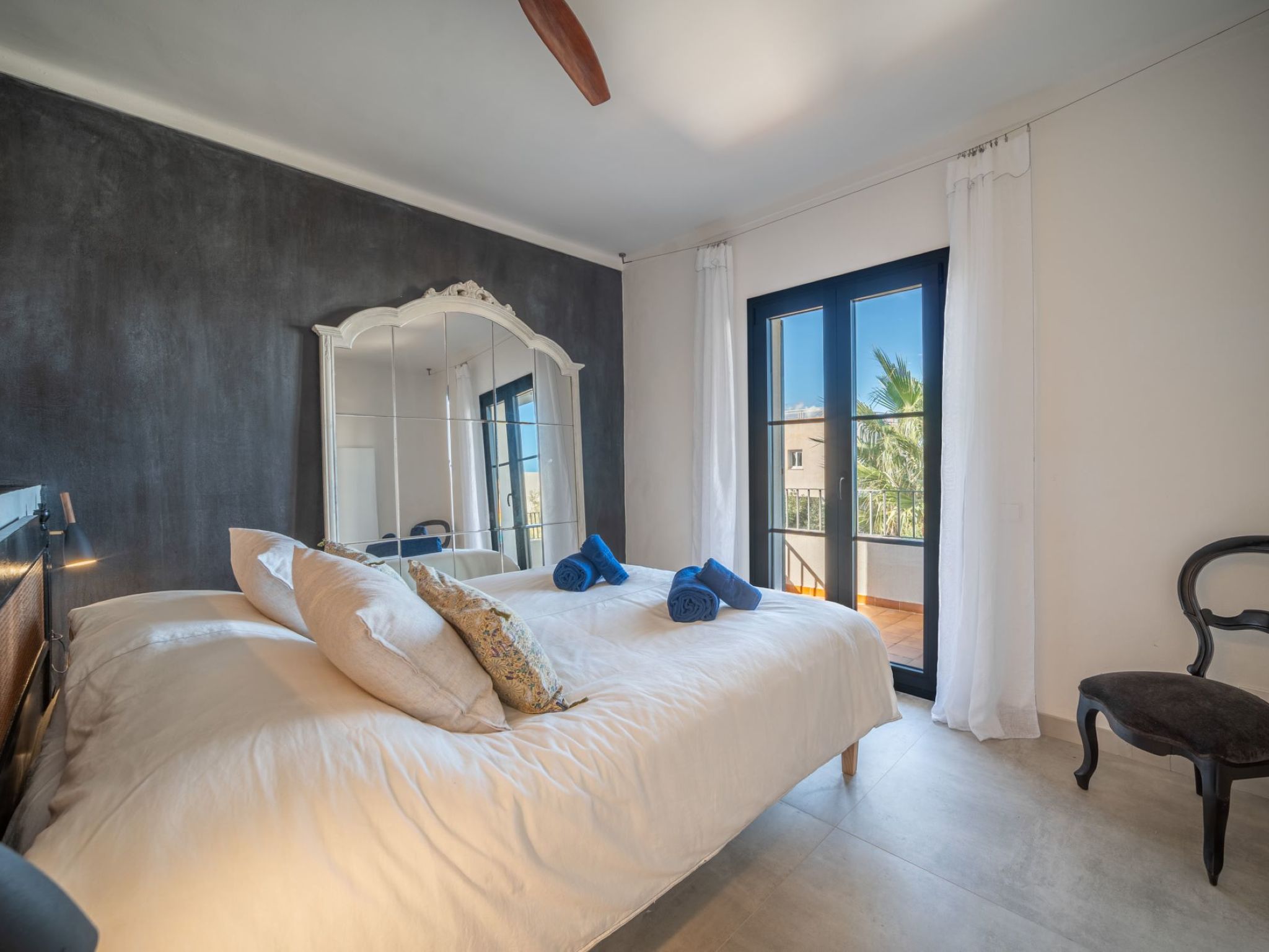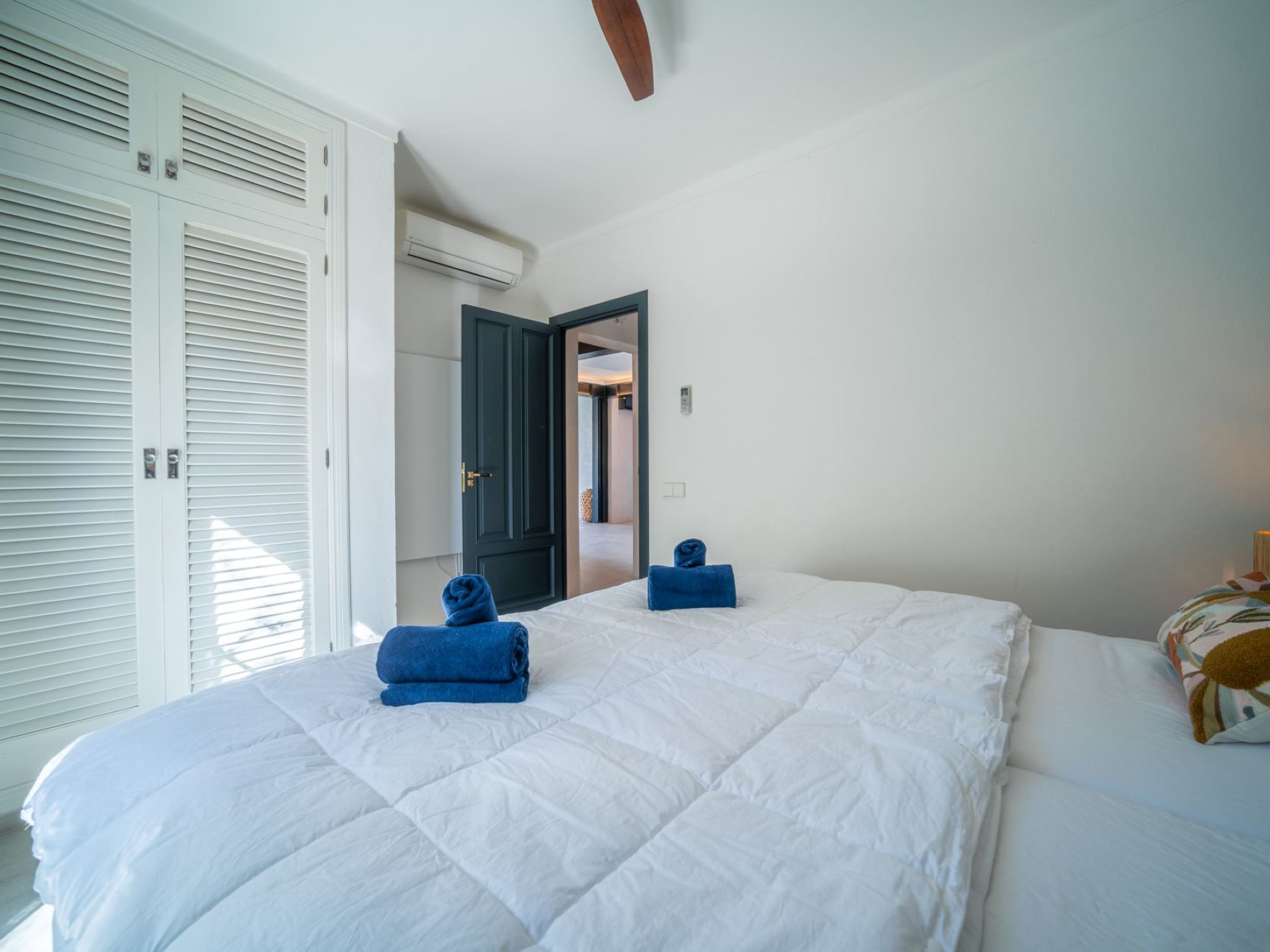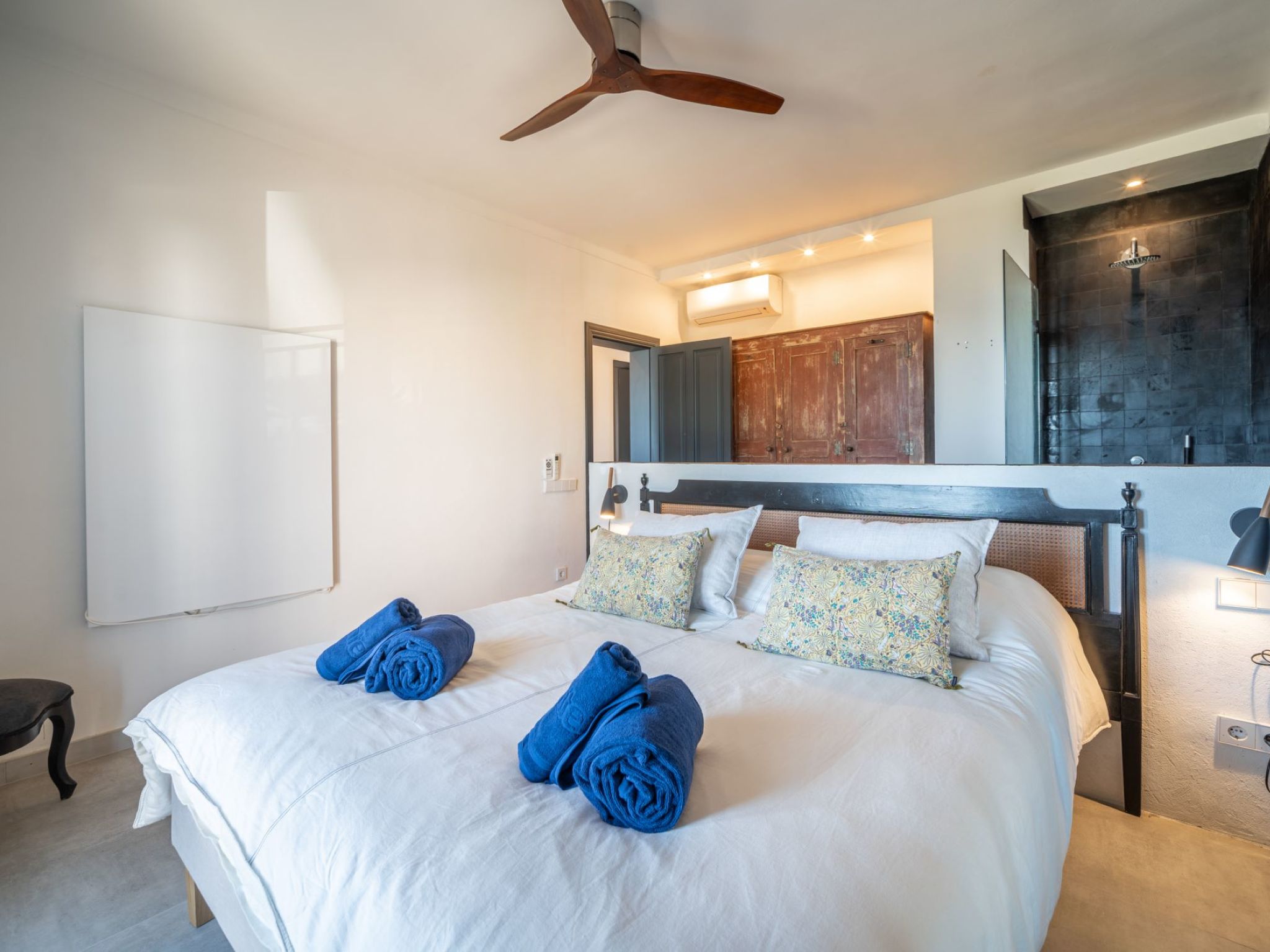 "Can Popi", 6-room house 200 m2 on 2 levels. Spacious and bright, simple and modern furnishings: lounge with open-hearth fireplace (only for decoration), satellite TV, electric heating and air conditioning. Exit to the patio. 1 double bedroom with 1 french bed (1 x 180 cm, length 190 cm), air conditioning, fan and forced-air heating. Exit to the garden. Large kitchen-/living room (dishwasher, 4 ceramic glass hob hotplates, toaster, electric coffee machine). Exit to the patio. Shower/WC. Electric heating, air-conditioning. Upper floor: 1 double bedroom with 1 french bed (1 x 150 cm, length 190 cm), air conditioning and fan. 1 double bedroom with 1 french bed (1 x 150 cm, length 190 cm), hand-basin, shower, air conditioning and forced-air heating. Exit to the balcony. 1 double bedroom with 1 french bed (1 x 150 cm, length 190 cm), fan. Bathroom, shower/WC. Electric heating, air-conditioning. Heating not available in all rooms. Natural stone floors. Patio. Terrace furniture, electric barbecue, covered balcony. Marvellous, of the sea. Facilities: washing machine, dryer, iron, children's high chair, baby cot for up to 2 year olds, hair dryer. Internet (WiFi, free). Parking (fenced 2 cars). Please note: suitable for families. Non-smoking house. ETV/7260