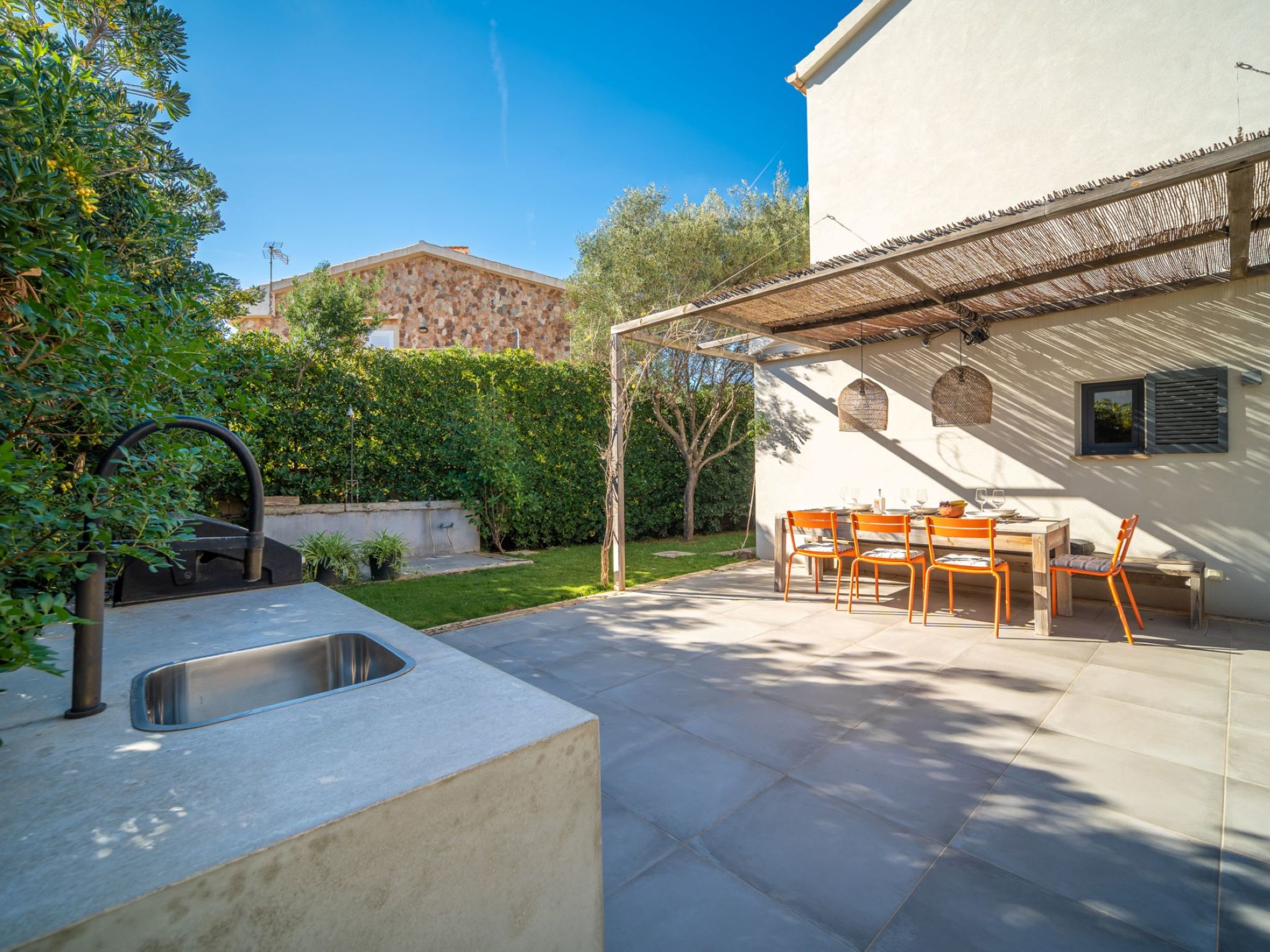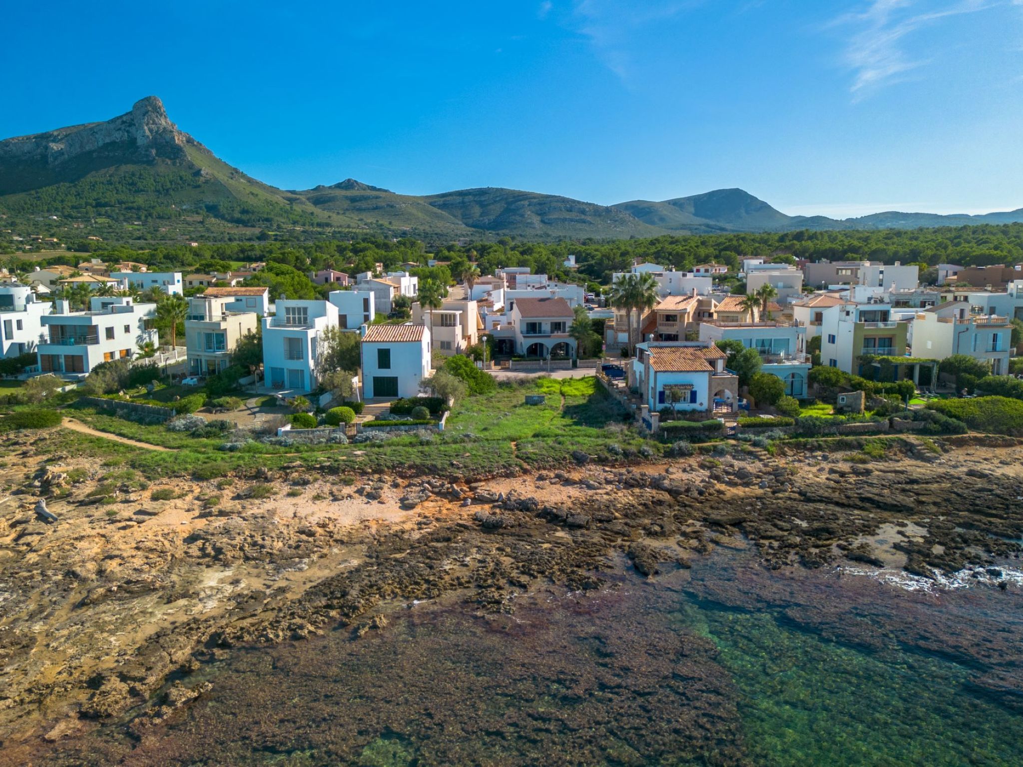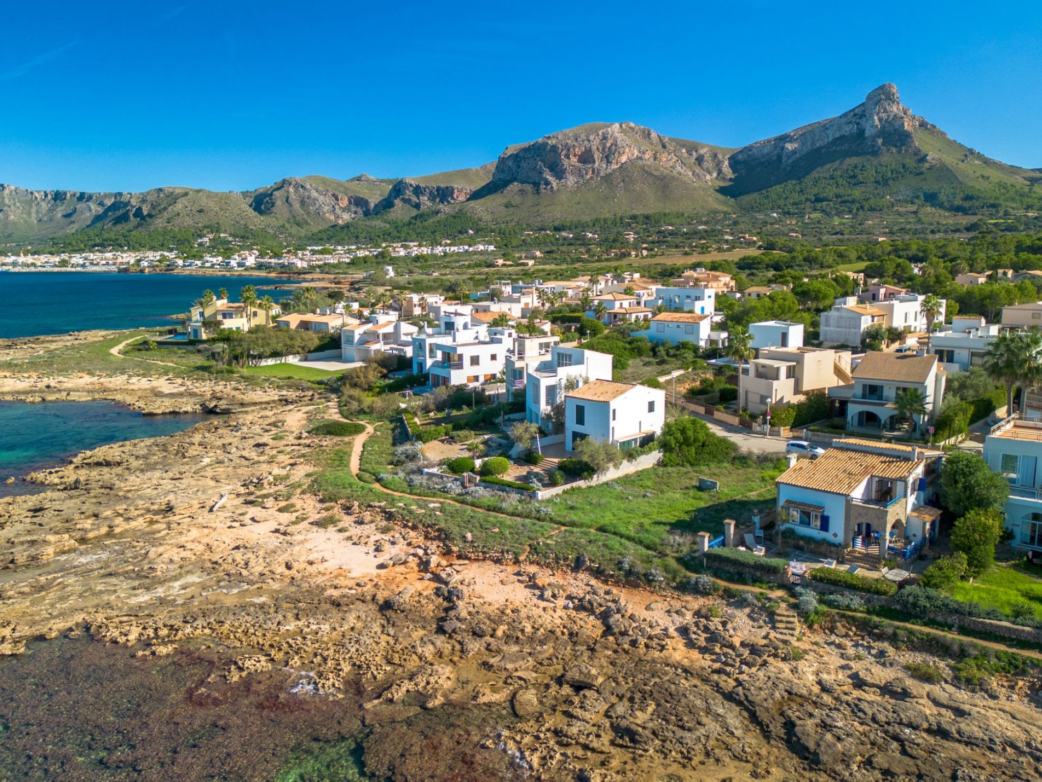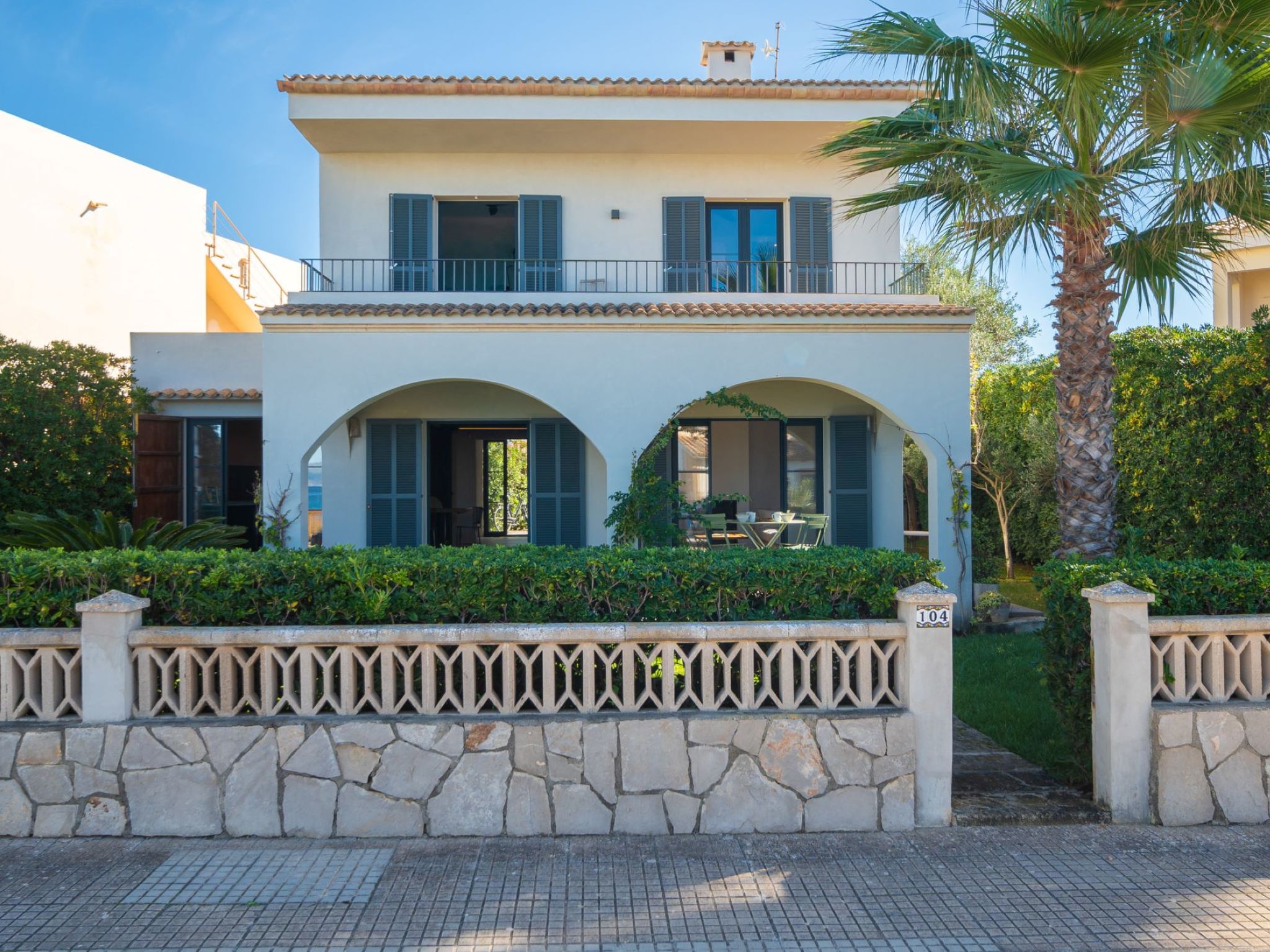 S'Estanyol 3 km from Colonia de Sant Pere: Large, modern, beautiful house "Can Popi", 2 storeys. In the district of Urbanización s'Estanyol, in the resort 1.8 km from the centre of Colònia de Sant Pere, in a quiet, sunny position residential area (villas), 15 m from the sea, 750 m from the beach, road to cross, direct access to the beach. Private: beautiful garden with lawn and wildlife garden. Outdoor shower, patio, arbour, garden furniture, barbecue. In the house: internet access, WiFi, air conditioning, washing machine. Parking at the house. Shop 1.8 km, supermarket 2 km, restaurant 1.9 km, bar 1.9 km, bakery 2.3 km, 20 minute walk to the centre, bus stop "Plaça Bassa d'en Fasol. Colonia." 2 km, sandy beach "Playa de Sa Canova" 350 m, swimming bay 15 m. Sports harbour 1.8 km, golf course (18 hole) 18 km, sailing school 2.1 km, riding stable 12 km, walking paths from the house, cycle lane 300 m. Nearby attractions: Son Serra de Marina 15 km, Betlem 5.7 km, Can Picafort 21 km, Artá 13 km, Cala Ratjada 24 km, Capdepera 20.9 km. Hiking paths: Ermita de Betlem 3.5 km, Parc Natural de Llevant 5 km, Finca Son Real 10 km. Please note: car recommended. Suitable for families, baby equipment on request (included). The owner does not accept any groups. The owner does not accept any youth groups. Loading and unloading of baggage is possible at the holiday house. Airfield 73 km from the property. Neighbourhood highly sensitive to noise. Quietness and good behaviour expected.