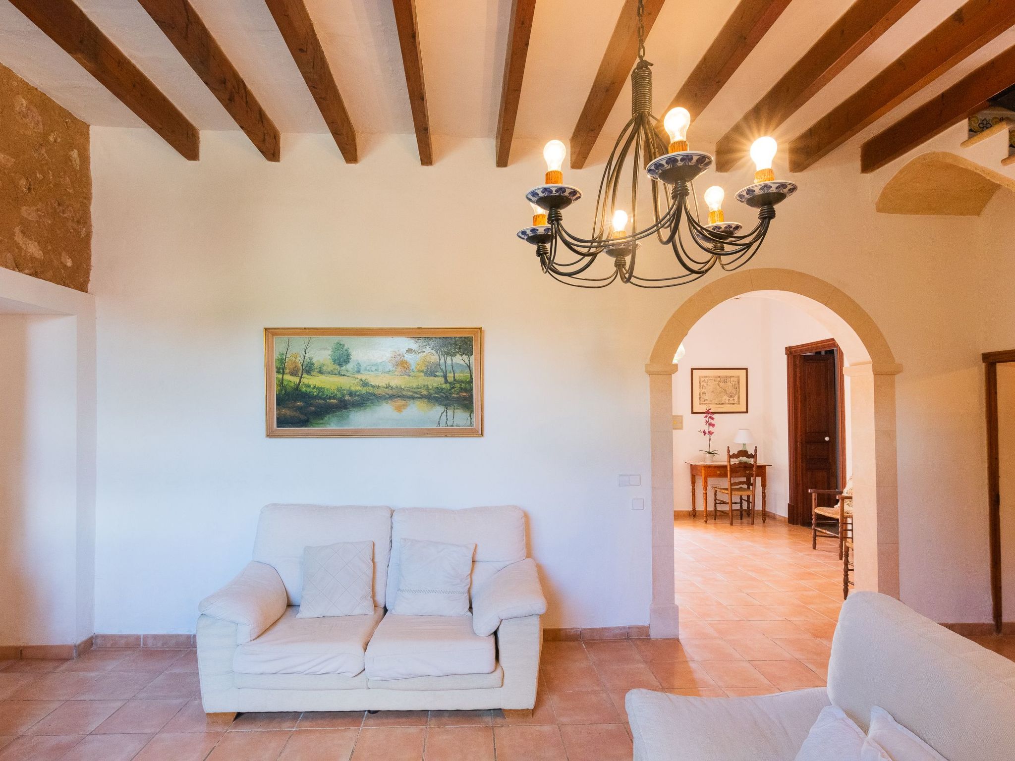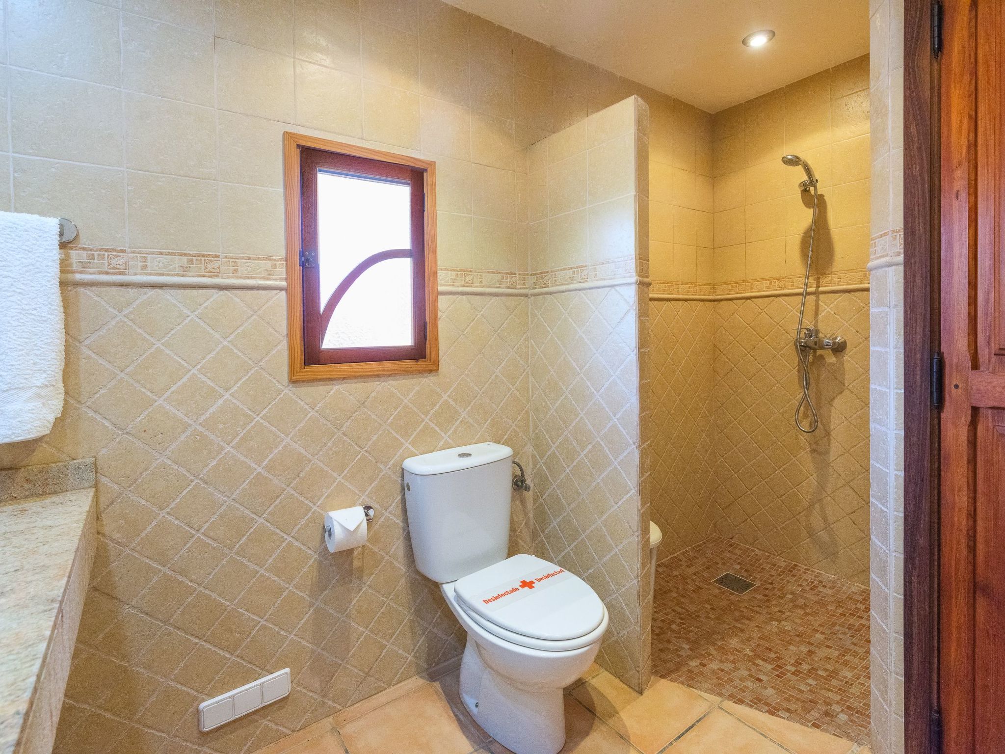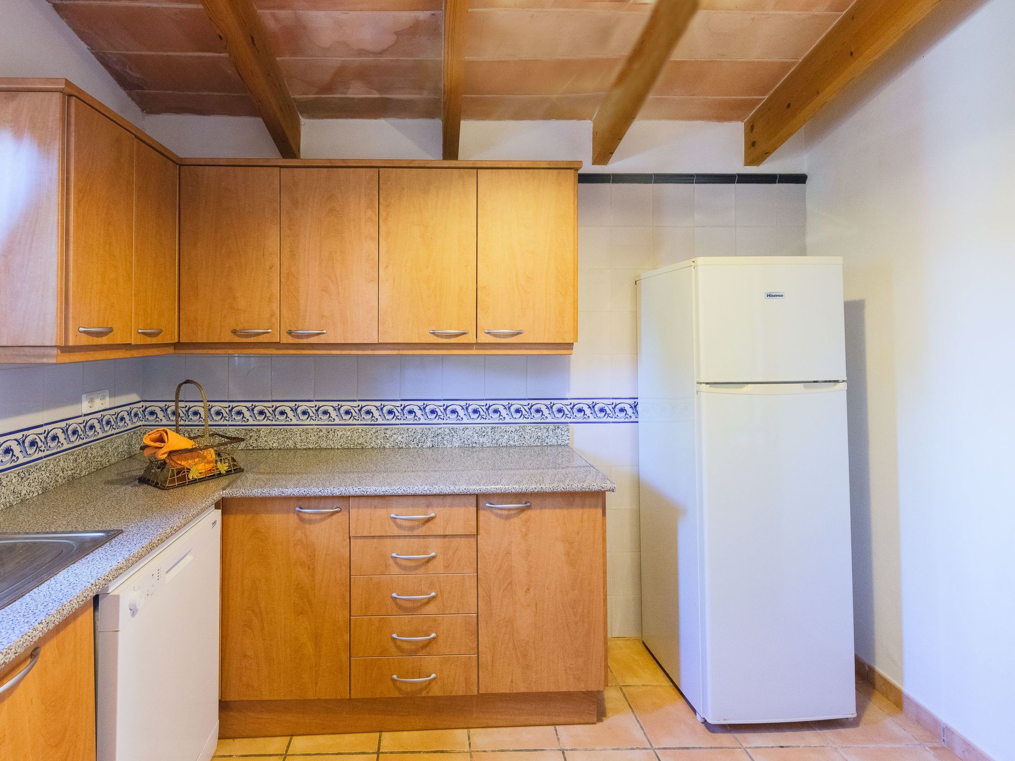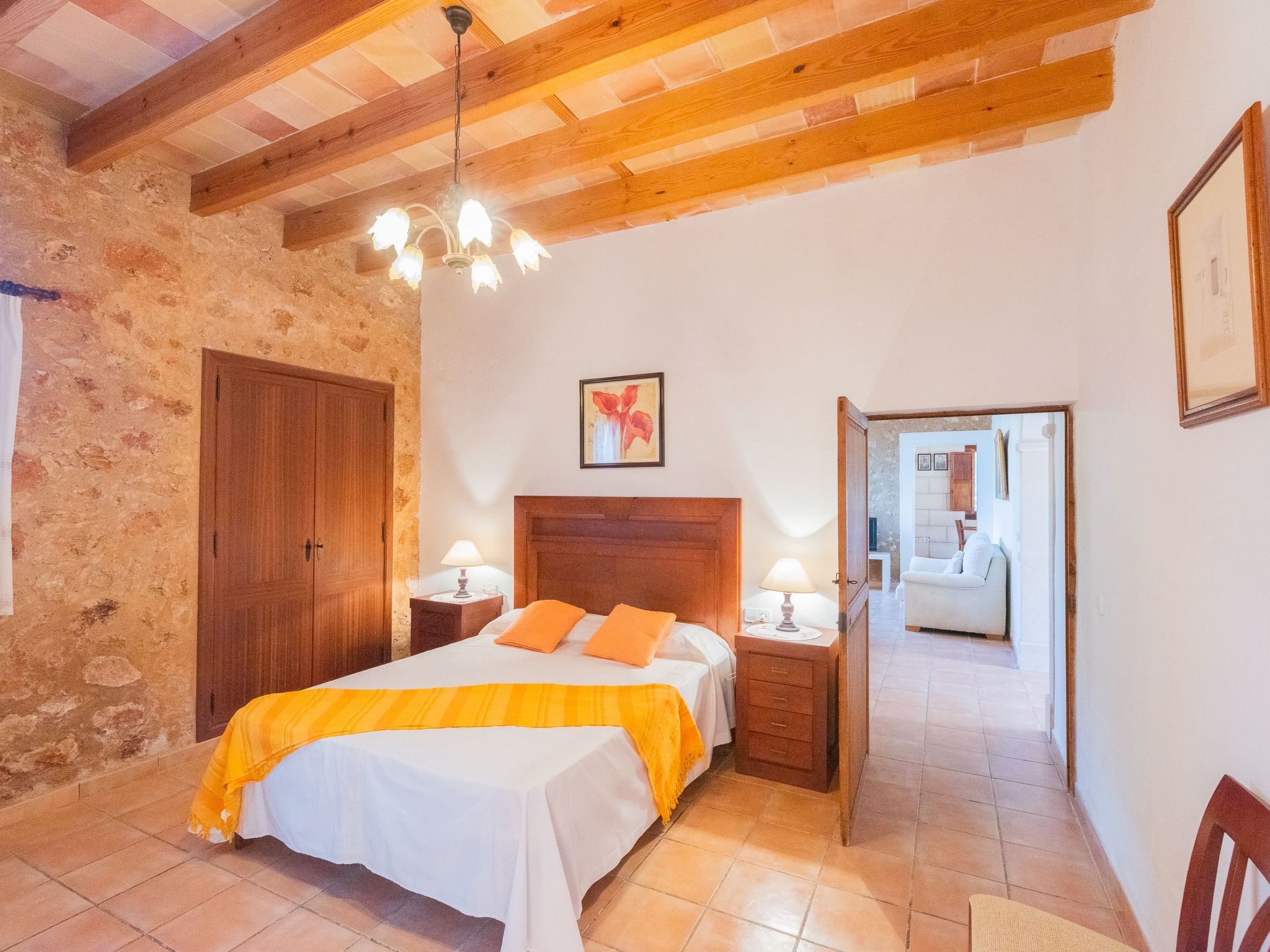 The house is partly furnished in a romantic Mallorcan style, while more recent styles, such as natural walls, create a cosy atmosphere and the bathrooms are of course modern. On the ground floor there is a living room with a seating area and open fireplace, which can be used on cooler evenings. A step leads to the fully equipped kitchen. There is also a dining room and three bedrooms, two of which have double beds and the third has two single beds. There is also a full bathroom and a shower room. One of the bedrooms has access to the beautiful garden. The upper floor of the house is not in use.