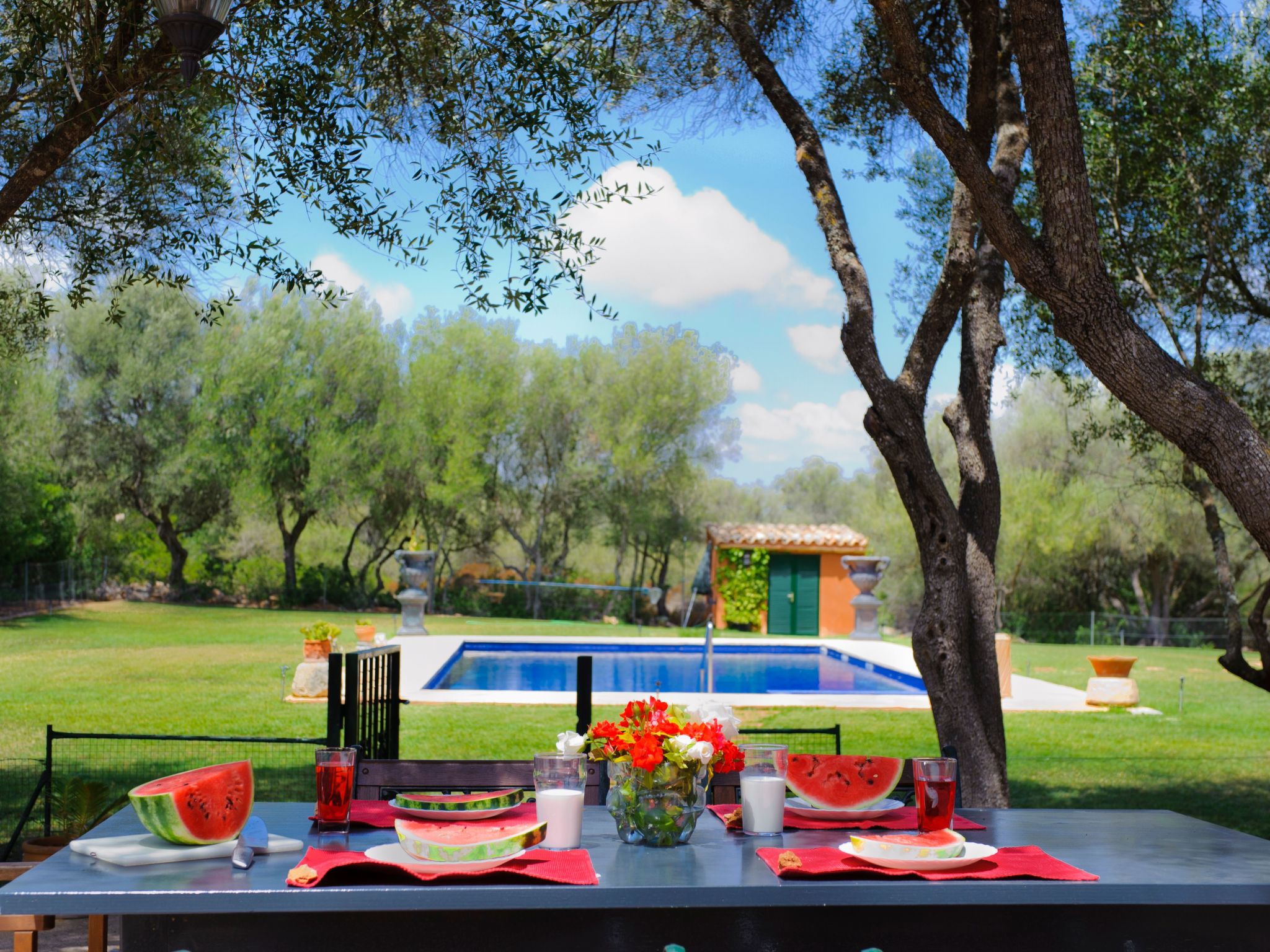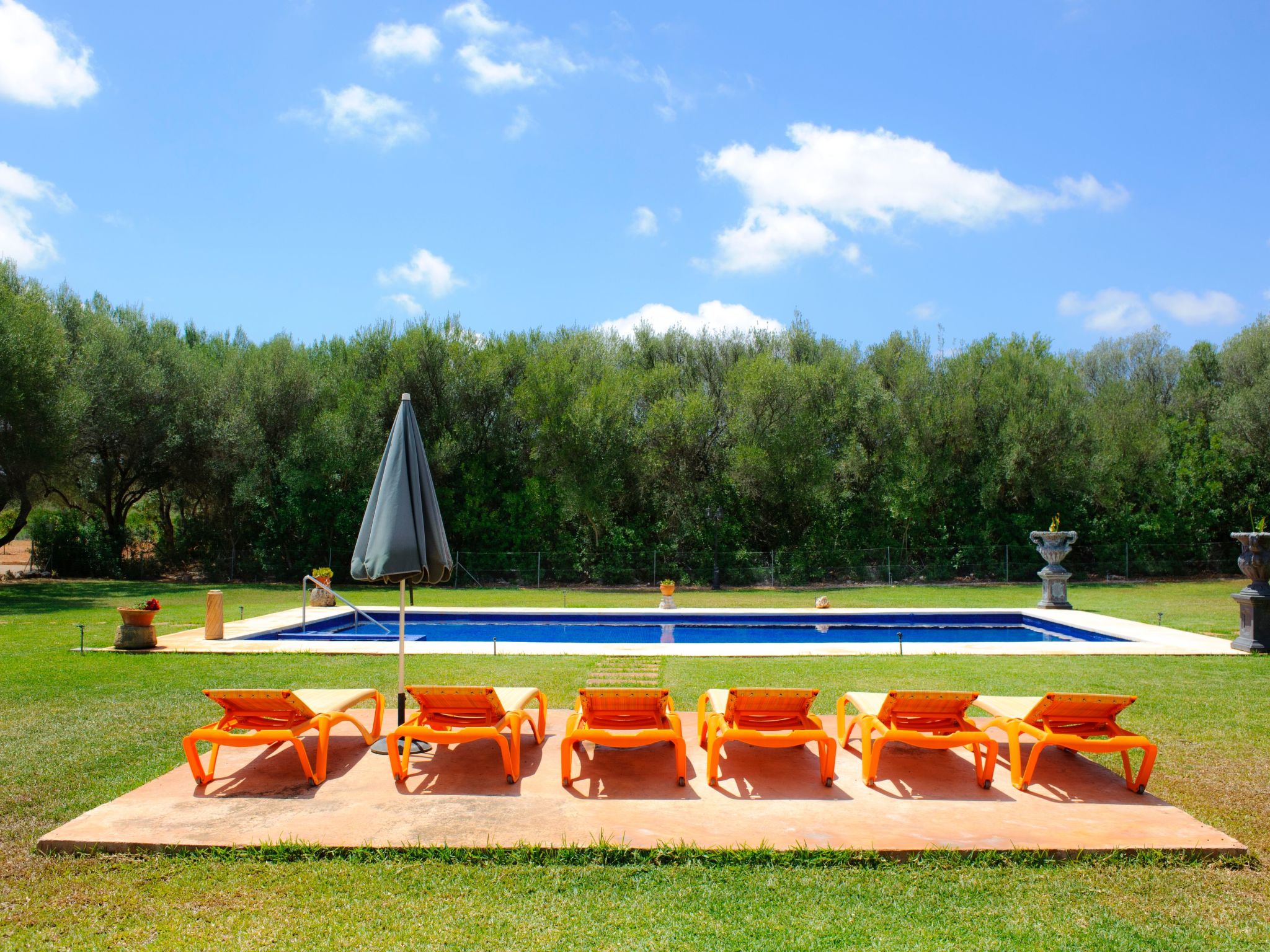 Olive trees, pine trees and Mediterranean garriga bushes fill the plot. A large terrace with barbecue, as well as the pool, surrounded by large green areas, are ideal for relaxing. Of course, there are also sun loungers.