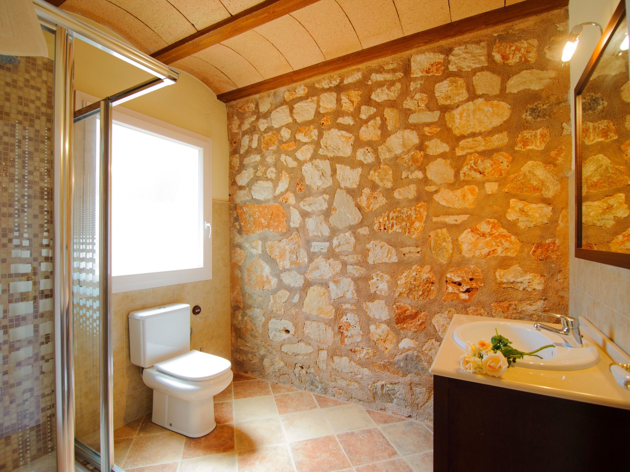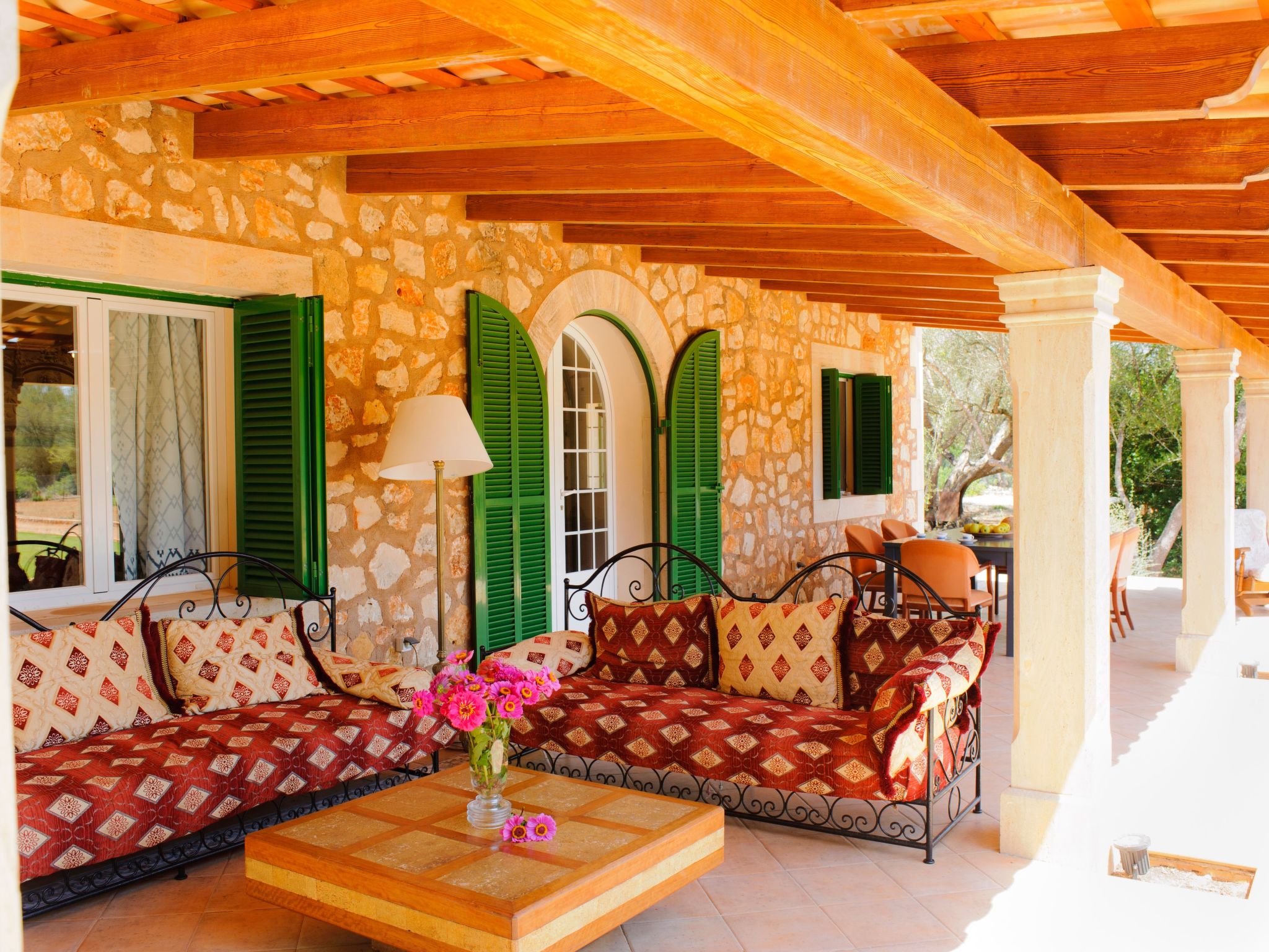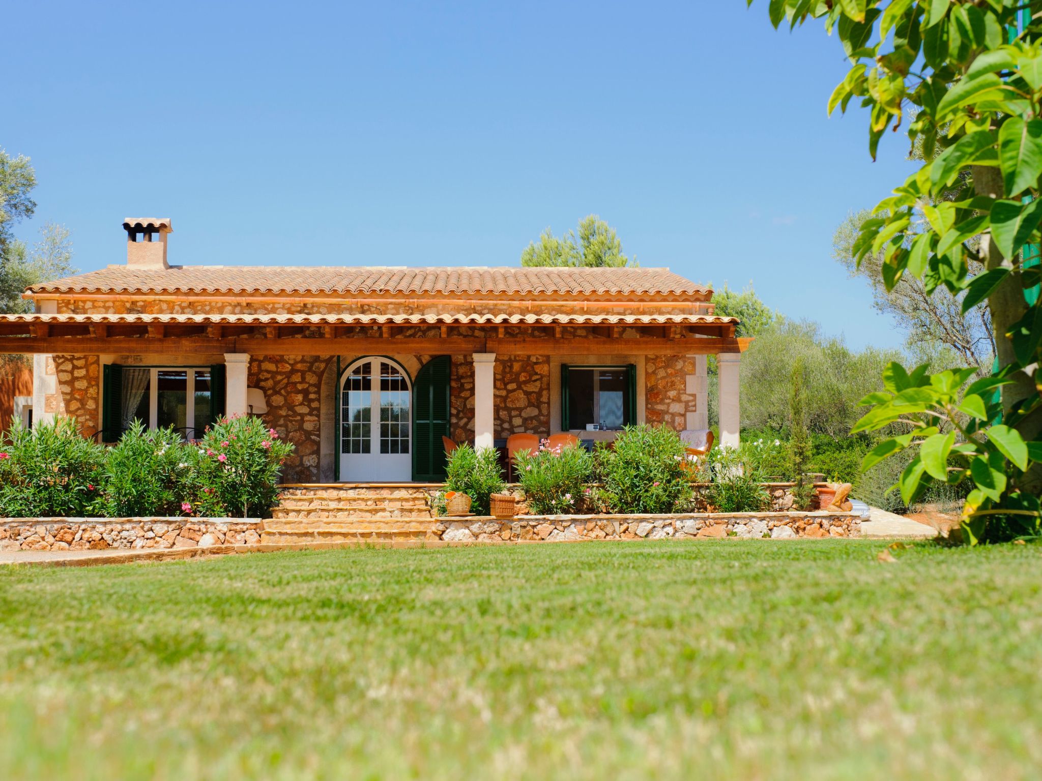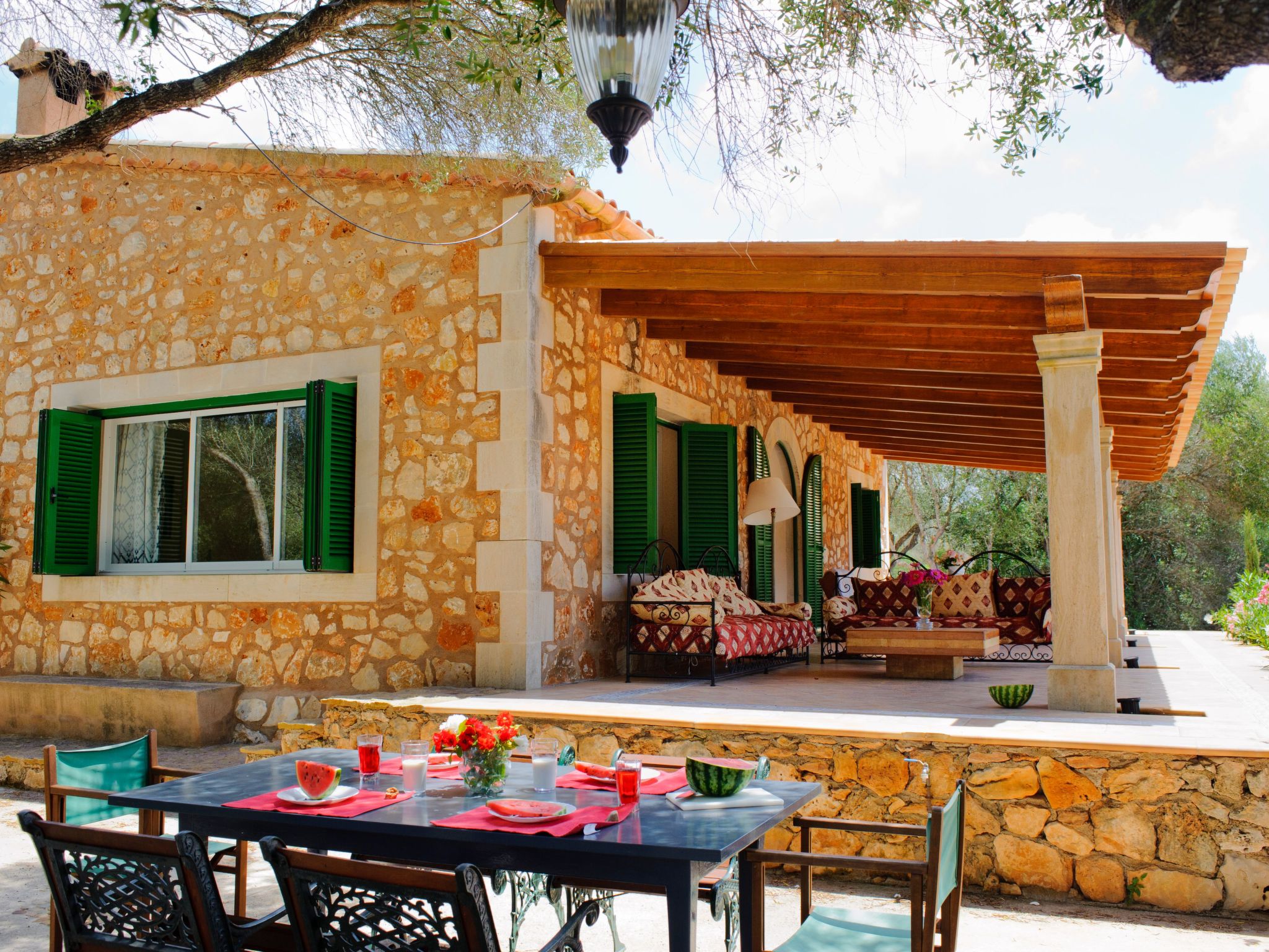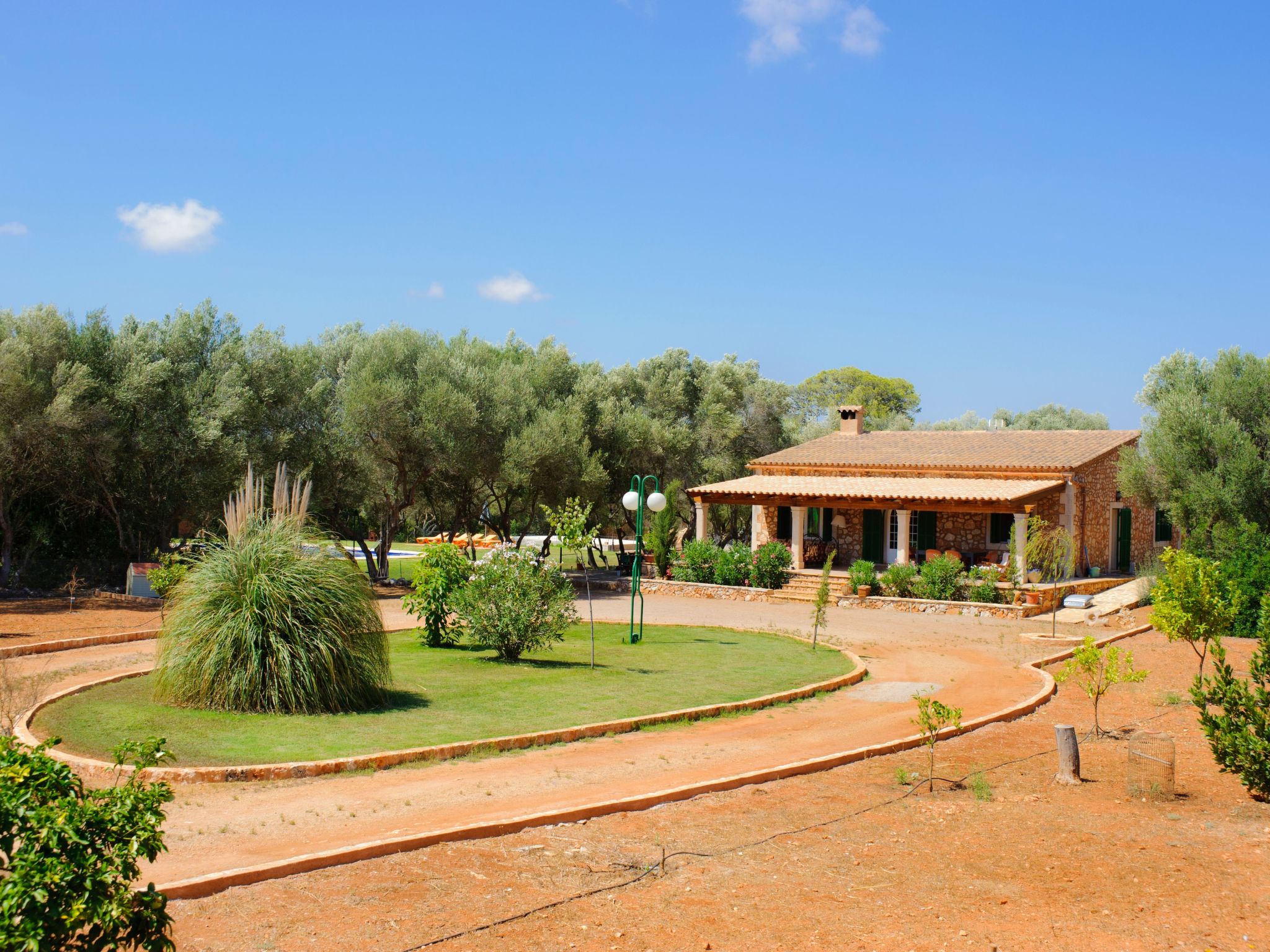 The natural stone holiday home "Gallicant" is located in the south of Mallorca, between the villages of Campos and Santanyí. It is surrounded by a very large plot of land (20 ha) and 1 km from the road, which promises peace and quiet. The beautiful sandy beach of Es Trenc and the beautiful beaches of the Cala Mondragó nature park can be reached by car in just 15 minutes. The capital Palma is only 30 minutes away. Santanyi, with its charming weekly market (Saturdays), is just 10 minutes away and Cala D'Or, the well-known tourist resort, can be reached in 15 minutes.
