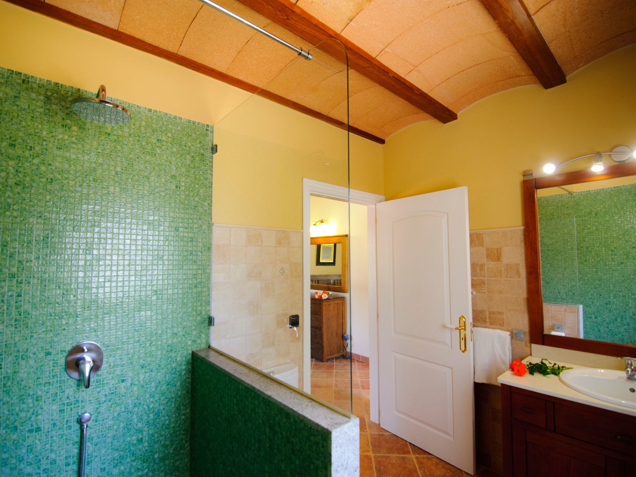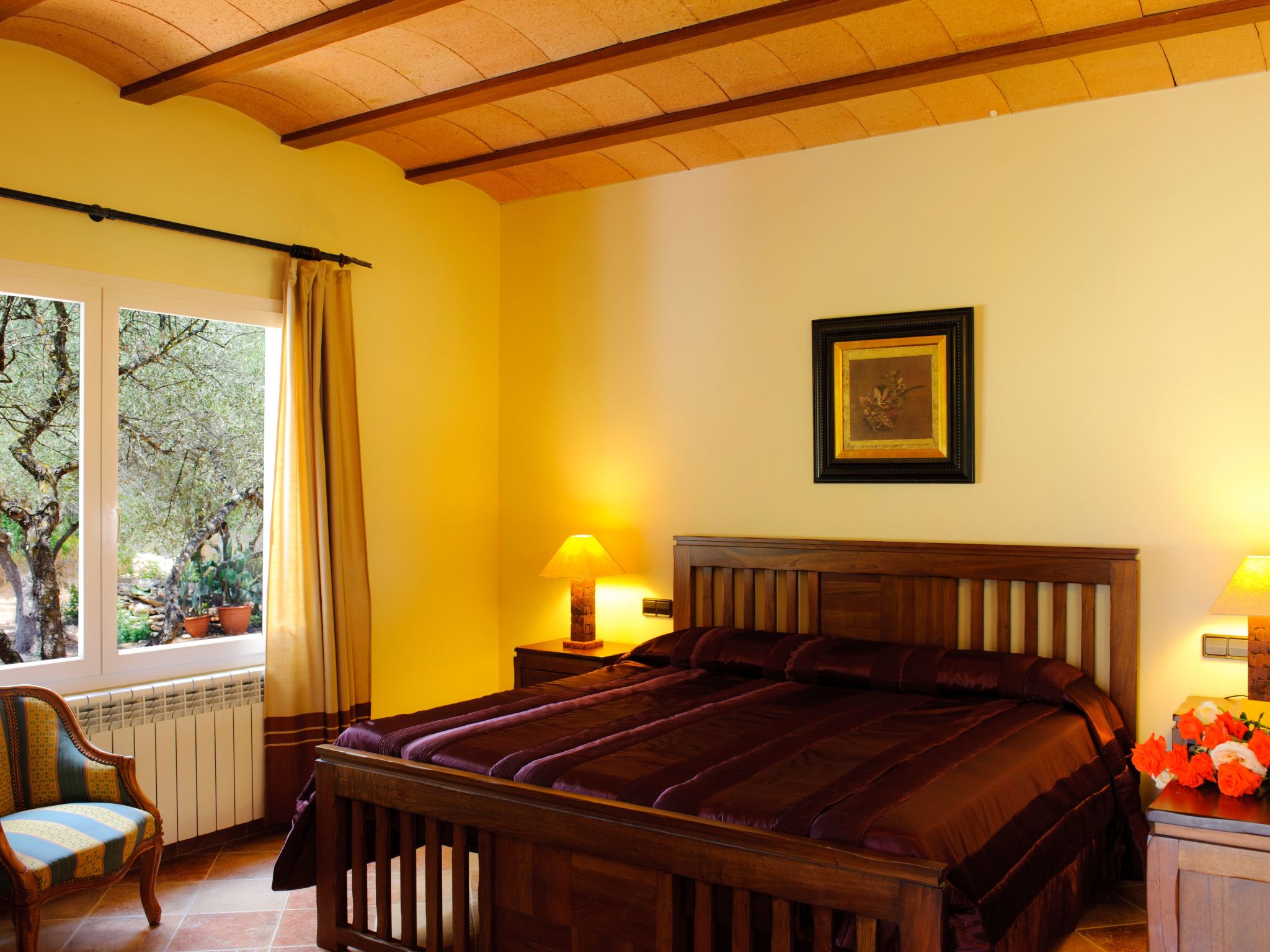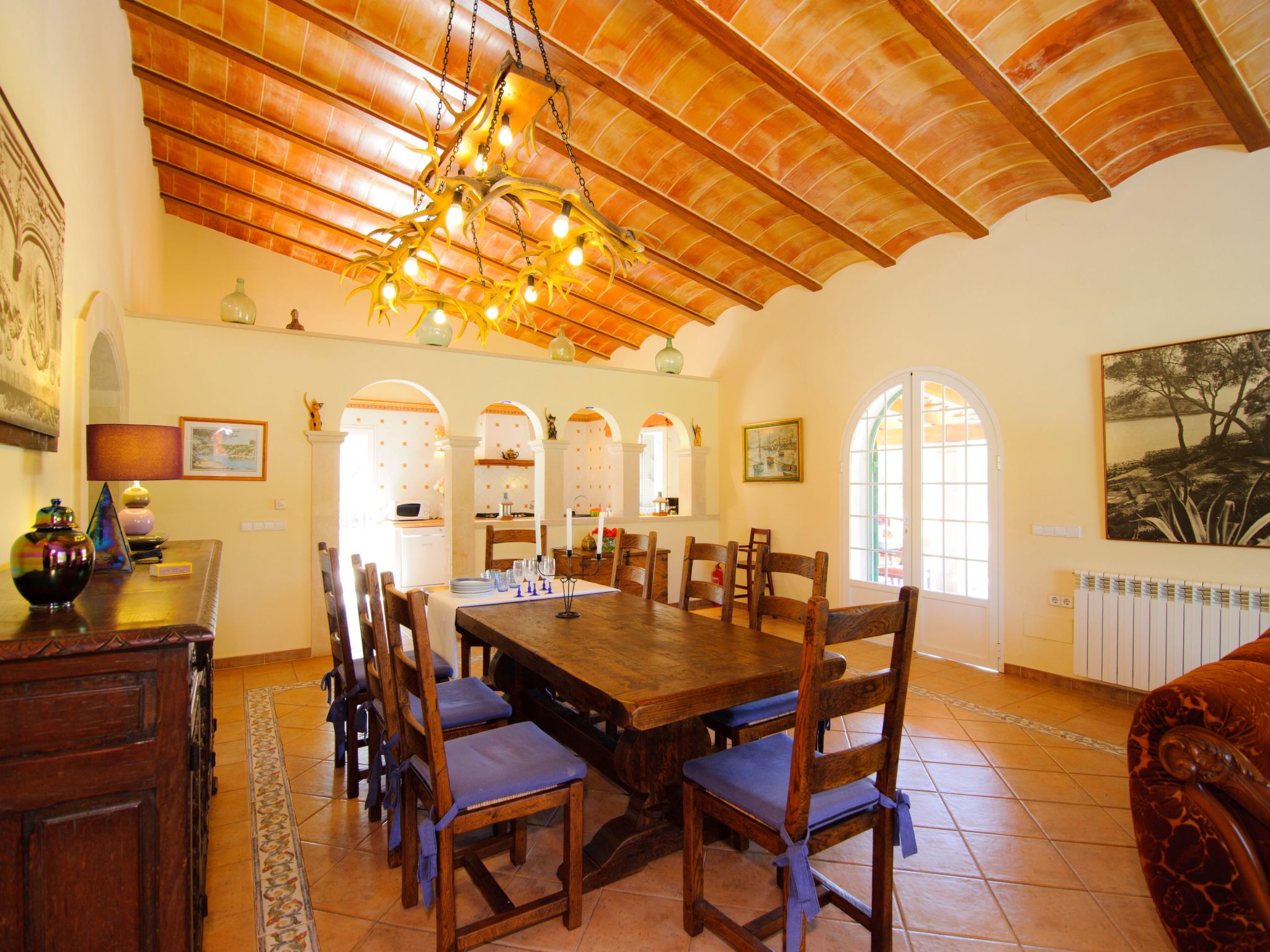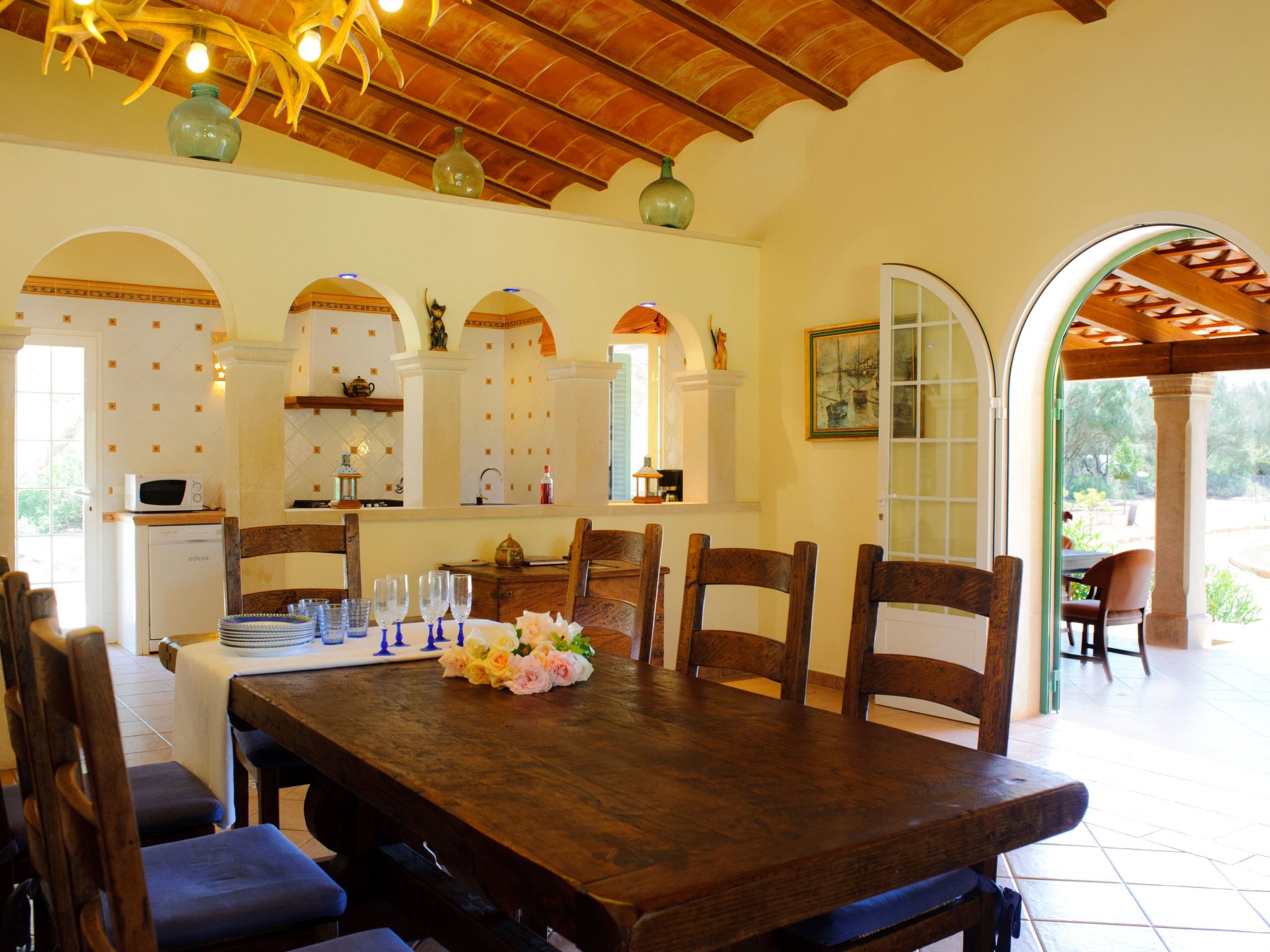 The farmhouse "Gallicant" is an enchanting country house in the centre of the Mallorcan "Fora Vila". The terrace with pergola leads into the large living/dining room. Here there is a double sofa bed, satellite TV and DVD player are also available. The American-style kitchen, fully equipped, leads to the barbecue area. The house has three bedrooms, two of which have en-suite bathrooms. A separate, complete bathroom is also available.