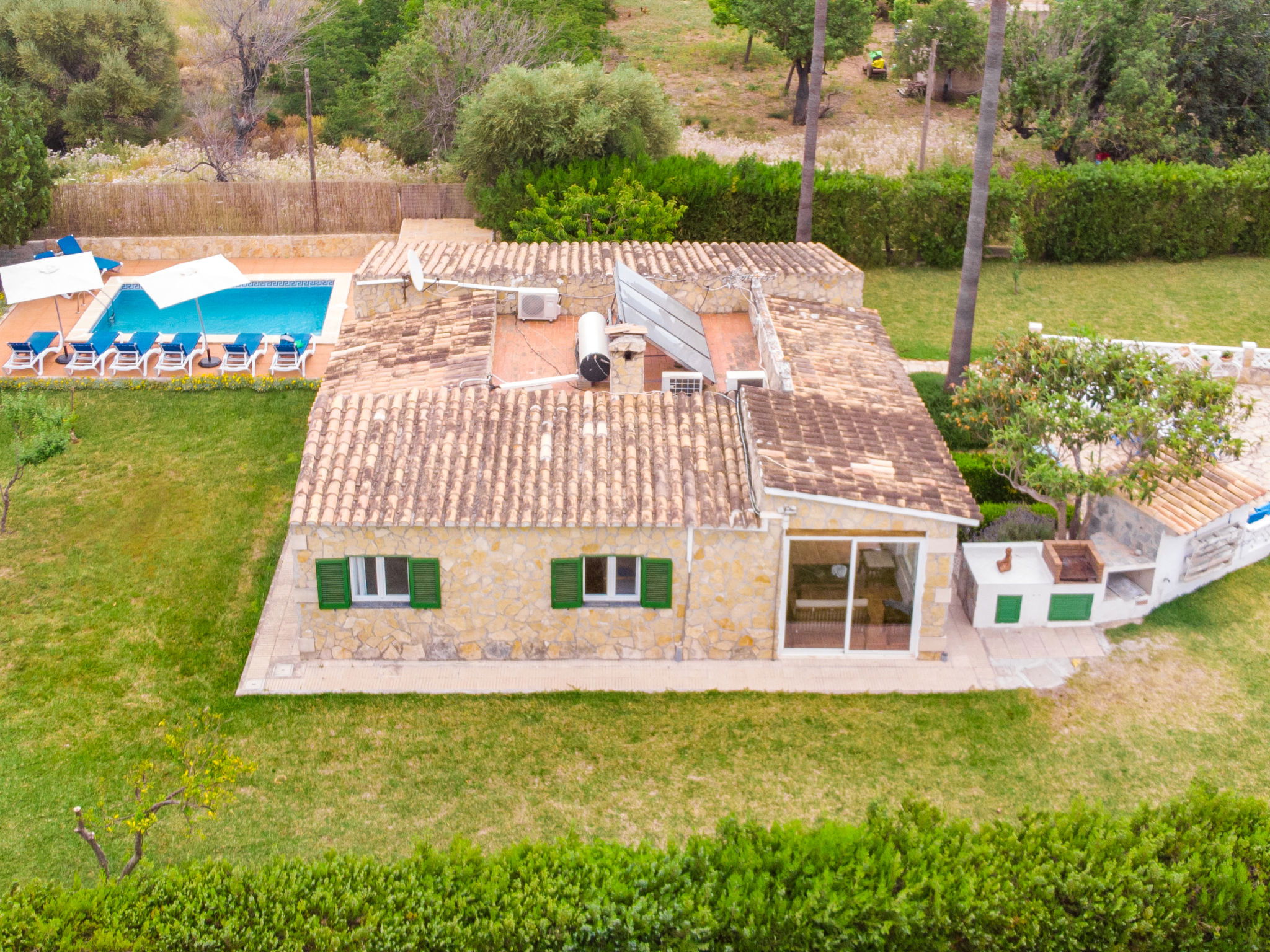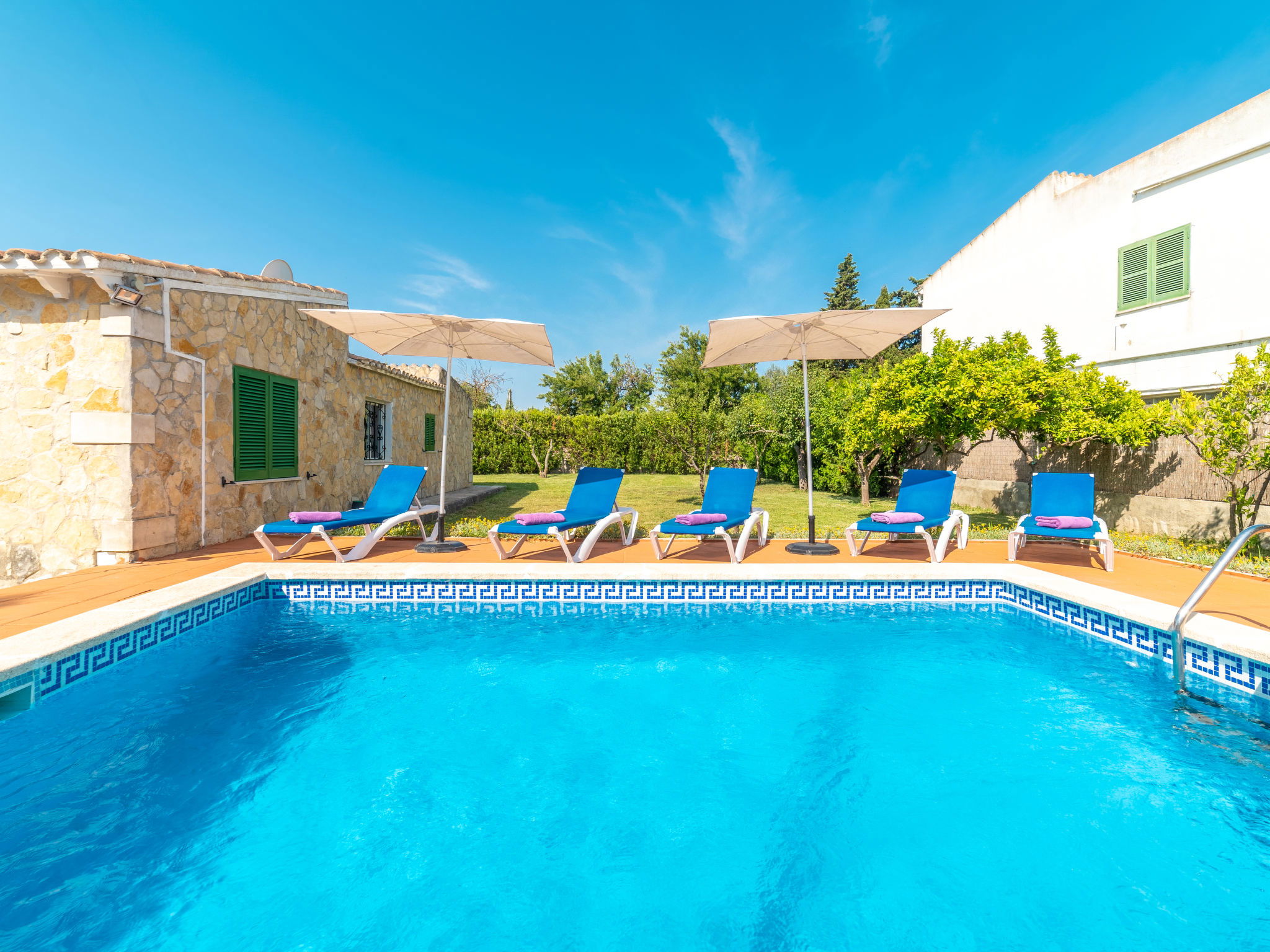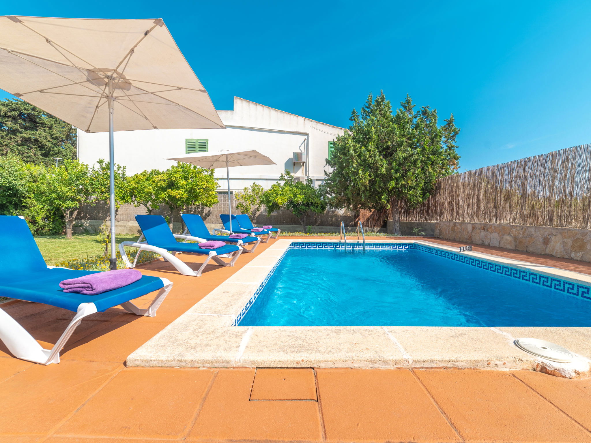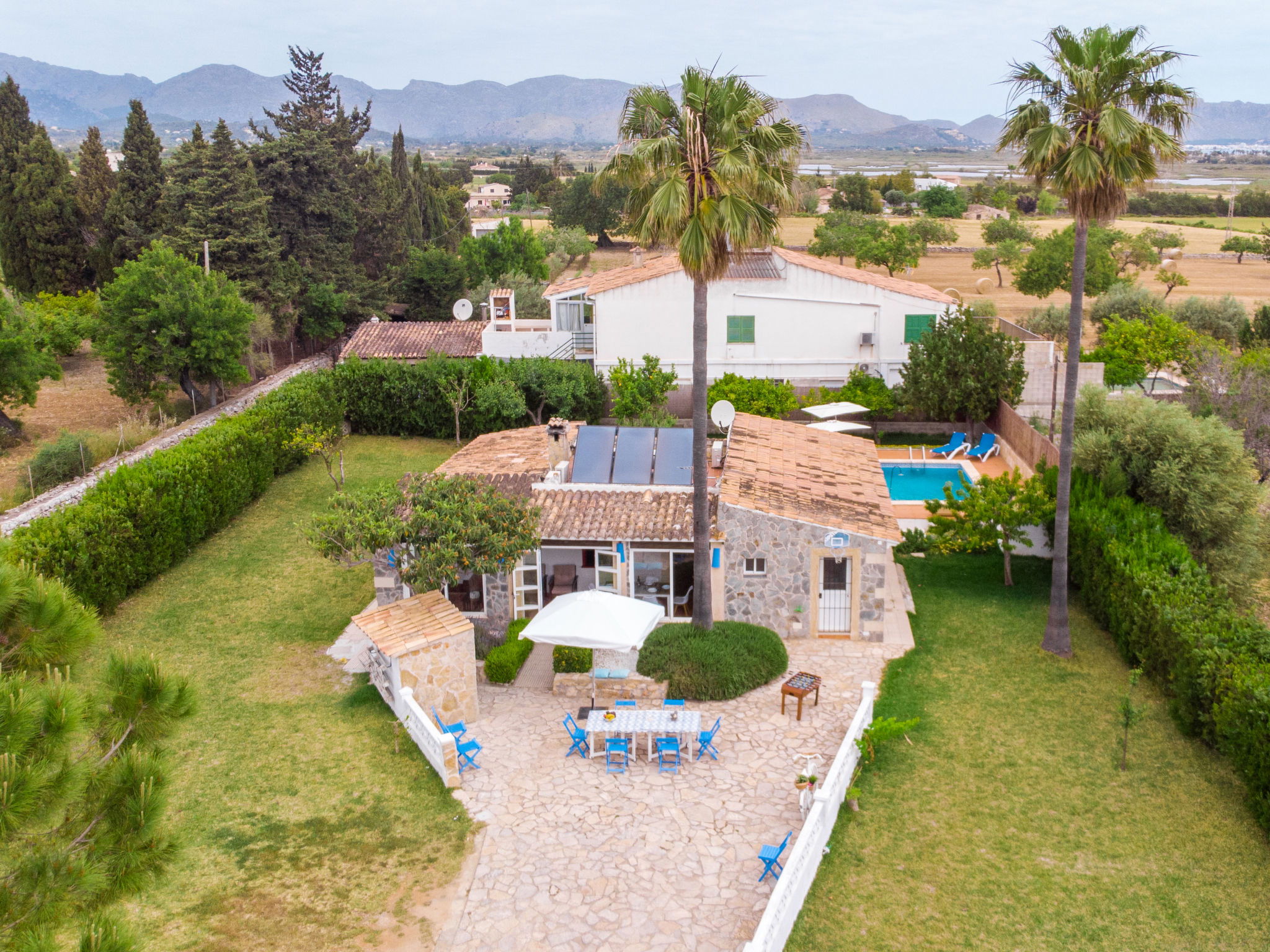 Large, cosy, comfortable villa "Can Delfin Alcudia", renovated. Outside the resort, 1.2 km from the centre of Alcúdia, in a sunny position on top of a hill, 900 m from the edge of the forest, 2.9 km from the sea, 3.8 km from the beach, in the countryside, south-west facing position. Private: property 2'800 m2 (fenced), large, well-kept garden with lawn and wildlife garden, swimming pool angular (6 x 4 m, depth 120 - 150 cm, seasonal availability: 01.Jan. - 31.Dec.) with salt water. Outdoor shower, patio, arbour, pergola, garden furniture, barbecue. In the house: internet access, WiFi, storage room for bicycles, air conditioning, washing machine, tumble dryer. Parking at the house on the premises. Shop 1.9 km, grocery 1.5 km, supermarket 1.9 km, restaurant 1.8 km, bar 1.8 km, bakery 1.8 km, 20 minute walk to the centre, bus stop 2.1 km, railway station "Sa Pobla" 12 km, ferry "Puerto de Alcúdia" 4 km, sandy beach "Playa de Alcúdia" 3.7 km, shingle beach "Alcanada" 4 km, rocky beach "Bonaire" 3 km, diving center 3 km, indoor swimming pool 1 km. Sports harbour 4 km, marina 4 km, golf course (18 hole) 4 km, surf school 3 km, sailing school 3 km, tennis 3 km, riding stable 2 km, sports centre 2 km, walking paths from the house 1 km, cycle lane 2 km. Nearby attractions: Alcúdia Old Town 1.2 km, Port Pollença - Pollença. 5 km, Hidropark Aquatic Park. Alcúdia 3 km, Wake Park Alcúdia 3.5 km. Hiking paths: Serra Tramuntana 10 km, Talaia Alcúdia - Puig Sant Marti 6 km, Albufera de Mallorca 10 km. Please note: car recommended. Suitable for families, suitable for seniors. Object suitable for 8 adults groups of teenagers on request only. Main road close by. Airfield 55 km from the property. The tap water has no drinking water quality.
