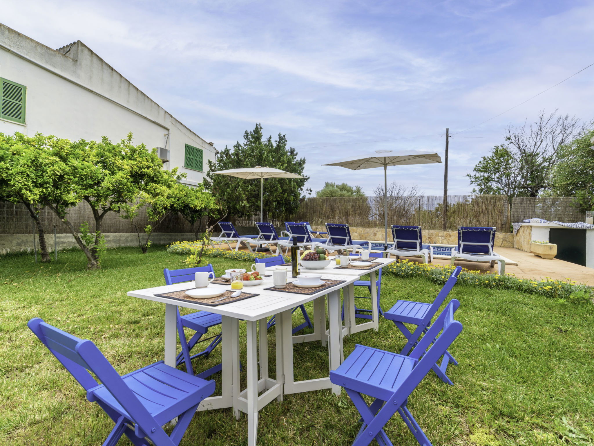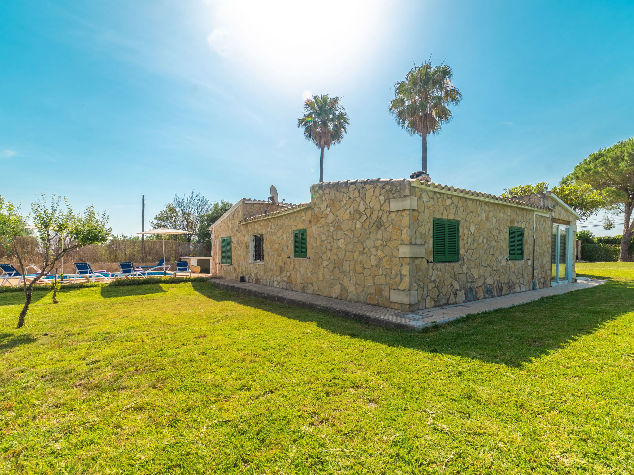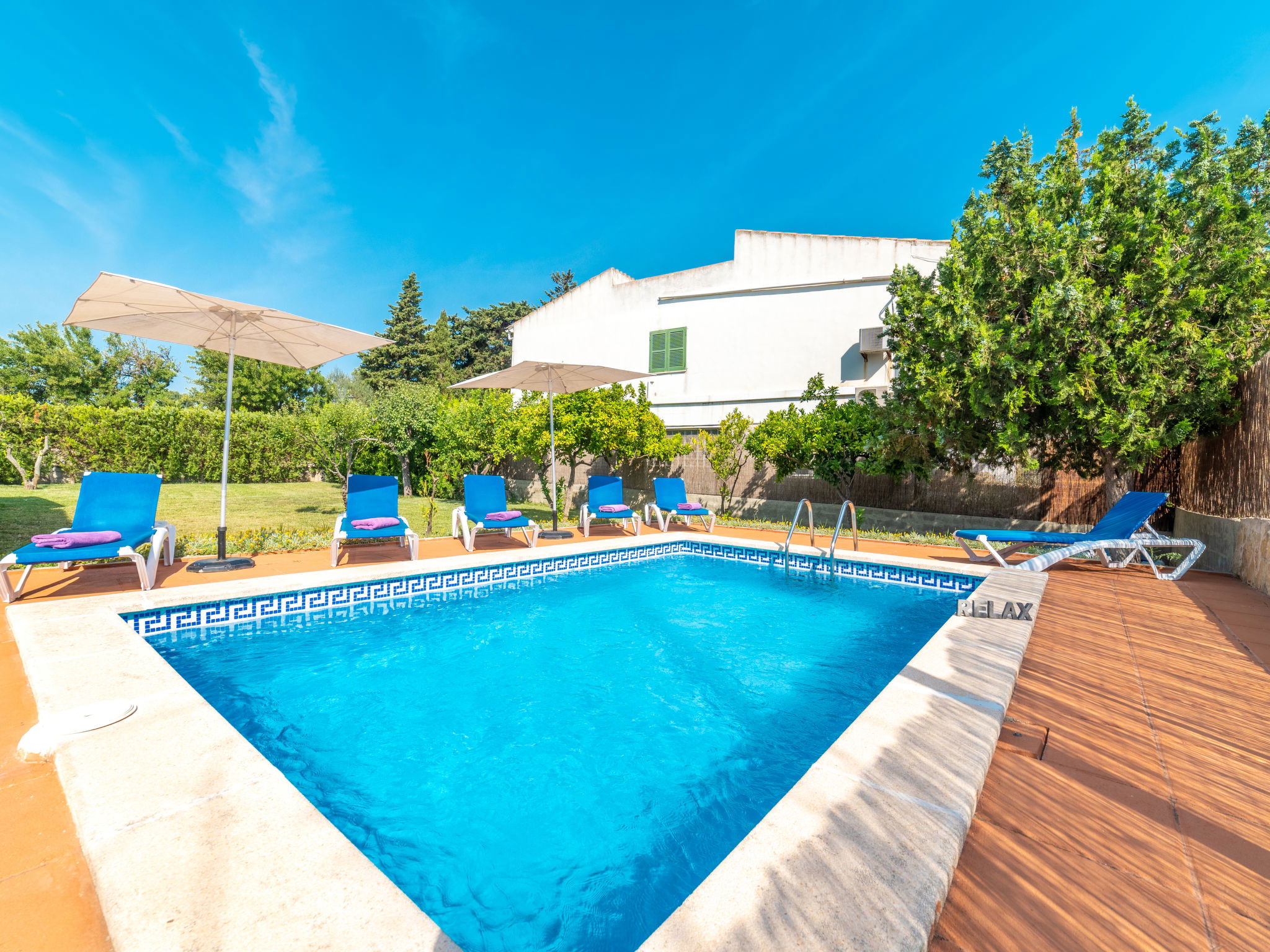 Large, cosy, comfortable villa "Can Delfin Alcudia", renovated. Outside the resort, 1.2 km from the centre of Alcúdia, in a sunny position on top of a hill, 900 m from the edge of the forest, 2.9 km from the sea, 3.8 km from the beach, in the countryside, south-west facing position. Private: property 2'800 m2 (fenced), large, well-kept garden with lawn and wildlife garden, swimming pool angular (6 x 4 m, depth 120 - 150 cm, seasonal availability: 01.Jan. - 31.Dec.) with salt water. Outdoor shower, patio, arbour, pergola, garden furniture, barbecue. In the house: internet access, WiFi, storage room for bicycles, air conditioning, washing machine, tumble dryer. Parking at the house on the premises. Shop 1.9 km, grocery 1.5 km, supermarket 1.9 km, restaurant 1.8 km, bar 1.8 km, bakery 1.8 km, 20 minute walk to the centre, bus stop 2.1 km, railway station "Sa Pobla" 12 km, ferry "Puerto de Alcúdia" 4 km, sandy beach "Playa de Alcúdia" 3.7 km, shingle beach "Alcanada" 4 km, rocky beach "Bonaire" 3 km, diving center 3 km, indoor swimming pool 1 km. Sports harbour 4 km, marina 4 km, golf course (18 hole) 4 km, surf school 3 km, sailing school 3 km, tennis 3 km, riding stable 2 km, sports centre 2 km, walking paths from the house 1 km, cycle lane 2 km. Nearby attractions: Alcúdia Old Town 1.2 km, Port Pollença - Pollença. 5 km, Hidropark Aquatic Park. Alcúdia 3 km, Wake Park Alcúdia 3.5 km. Hiking paths: Serra Tramuntana 10 km, Talaia Alcúdia - Puig Sant Marti 6 km, Albufera de Mallorca 10 km. Please note: car recommended. Suitable for families, suitable for seniors. Object suitable for 8 adults groups of teenagers on request only. Main road close by. Airfield 55 km from the property. The tap water has no drinking water quality.