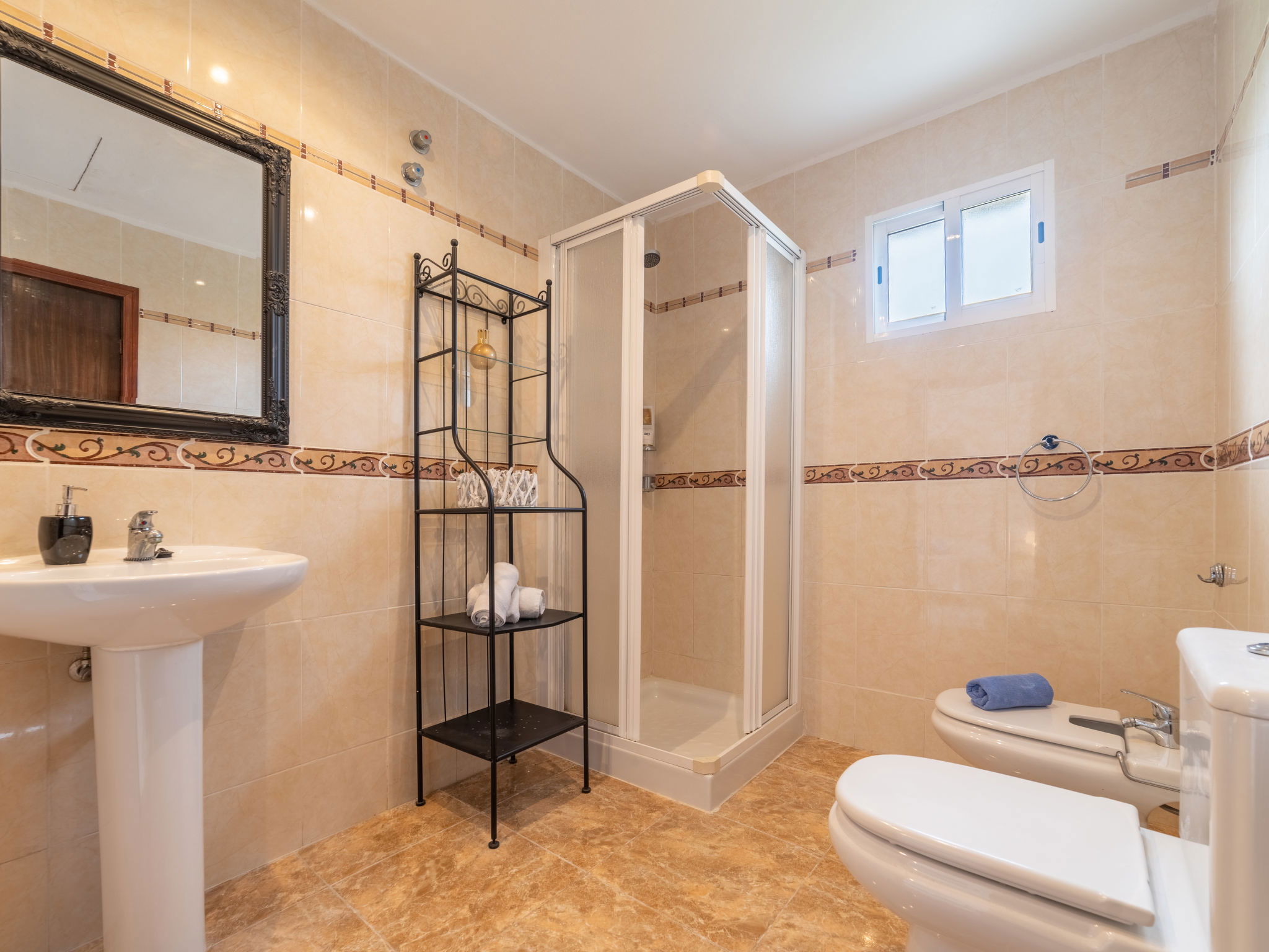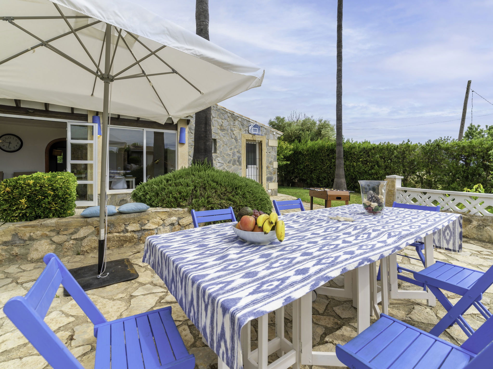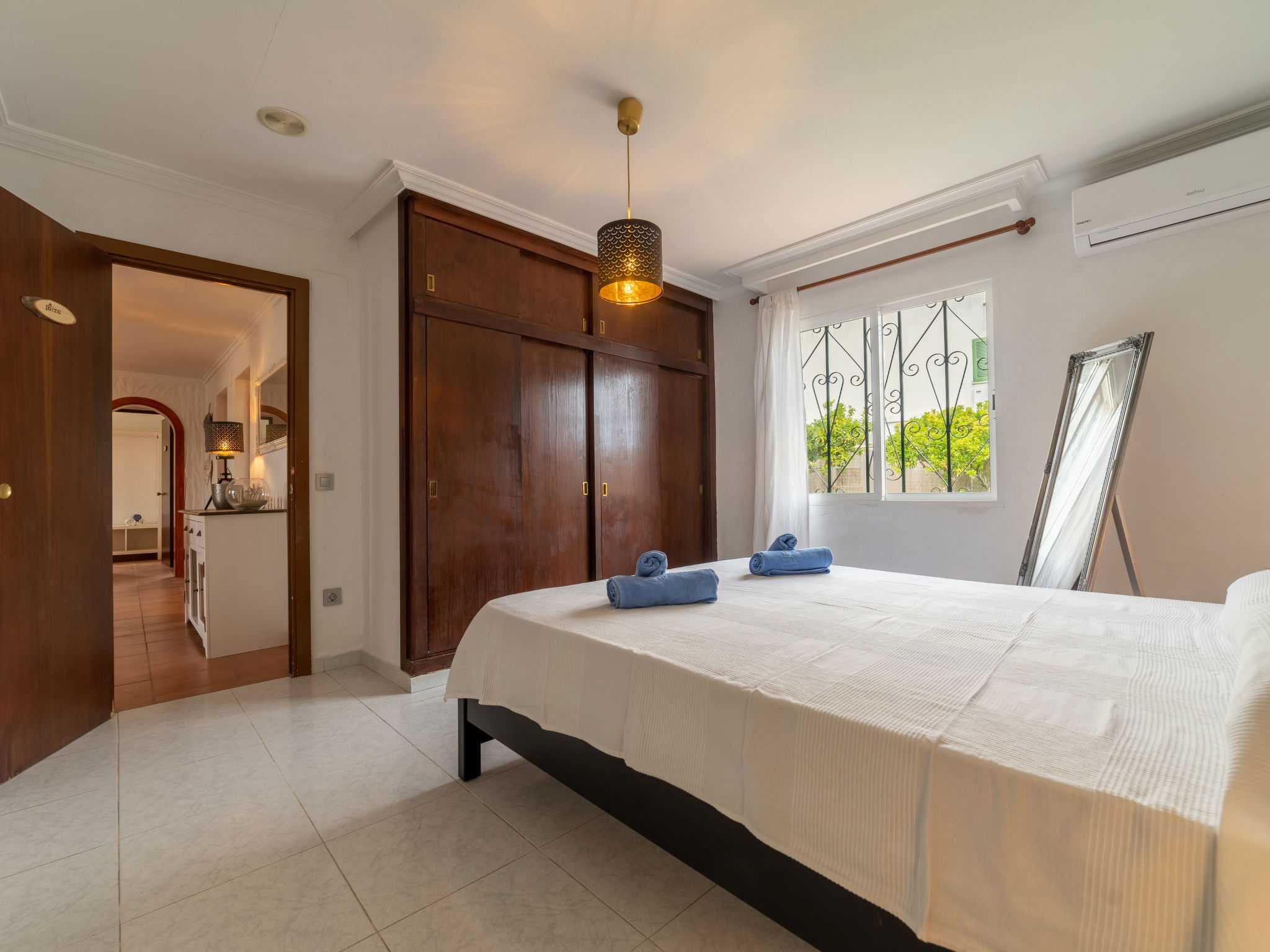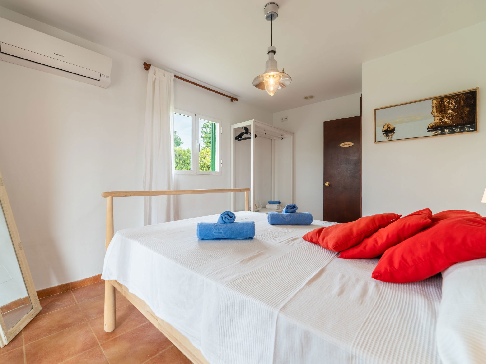 Large, cosy, comfortable villa "Can Delfin Alcudia", renovated. Outside the resort, 1.2 km from the centre of Alcúdia, in a sunny position on top of a hill, 900 m from the edge of the forest, 2.9 km from the sea, 3.8 km from the beach, in the countryside, south-west facing position. Private: property 2'800 m2 (fenced), large, well-kept garden with lawn and wildlife garden, swimming pool angular (6 x 4 m, depth 120 - 150 cm, seasonal availability: 01.Jan. - 31.Dec.) with salt water. Outdoor shower, patio, arbour, pergola, garden furniture, barbecue. In the house: internet access, WiFi, storage room for bicycles, air conditioning, washing machine, tumble dryer. Parking at the house on the premises. Shop 1.9 km, grocery 1.5 km, supermarket 1.9 km, restaurant 1.8 km, bar 1.8 km, bakery 1.8 km, 20 minute walk to the centre, bus stop 2.1 km, railway station "Sa Pobla" 12 km, ferry "Puerto de Alcúdia" 4 km, sandy beach "Playa de Alcúdia" 3.7 km, shingle beach "Alcanada" 4 km, rocky beach "Bonaire" 3 km, diving center 3 km, indoor swimming pool 1 km. Sports harbour 4 km, marina 4 km, golf course (18 hole) 4 km, surf school 3 km, sailing school 3 km, tennis 3 km, riding stable 2 km, sports centre 2 km, walking paths from the house 1 km, cycle lane 2 km. Nearby attractions: Alcúdia Old Town 1.2 km, Port Pollença - Pollença. 5 km, Hidropark Aquatic Park. Alcúdia 3 km, Wake Park Alcúdia 3.5 km. Hiking paths: Serra Tramuntana 10 km, Talaia Alcúdia - Puig Sant Marti 6 km, Albufera de Mallorca 10 km. Please note: car recommended. Suitable for families, suitable for seniors. Object suitable for 8 adults groups of teenagers on request only. Main road close by. Airfield 55 km from the property. The tap water has no drinking water quality.