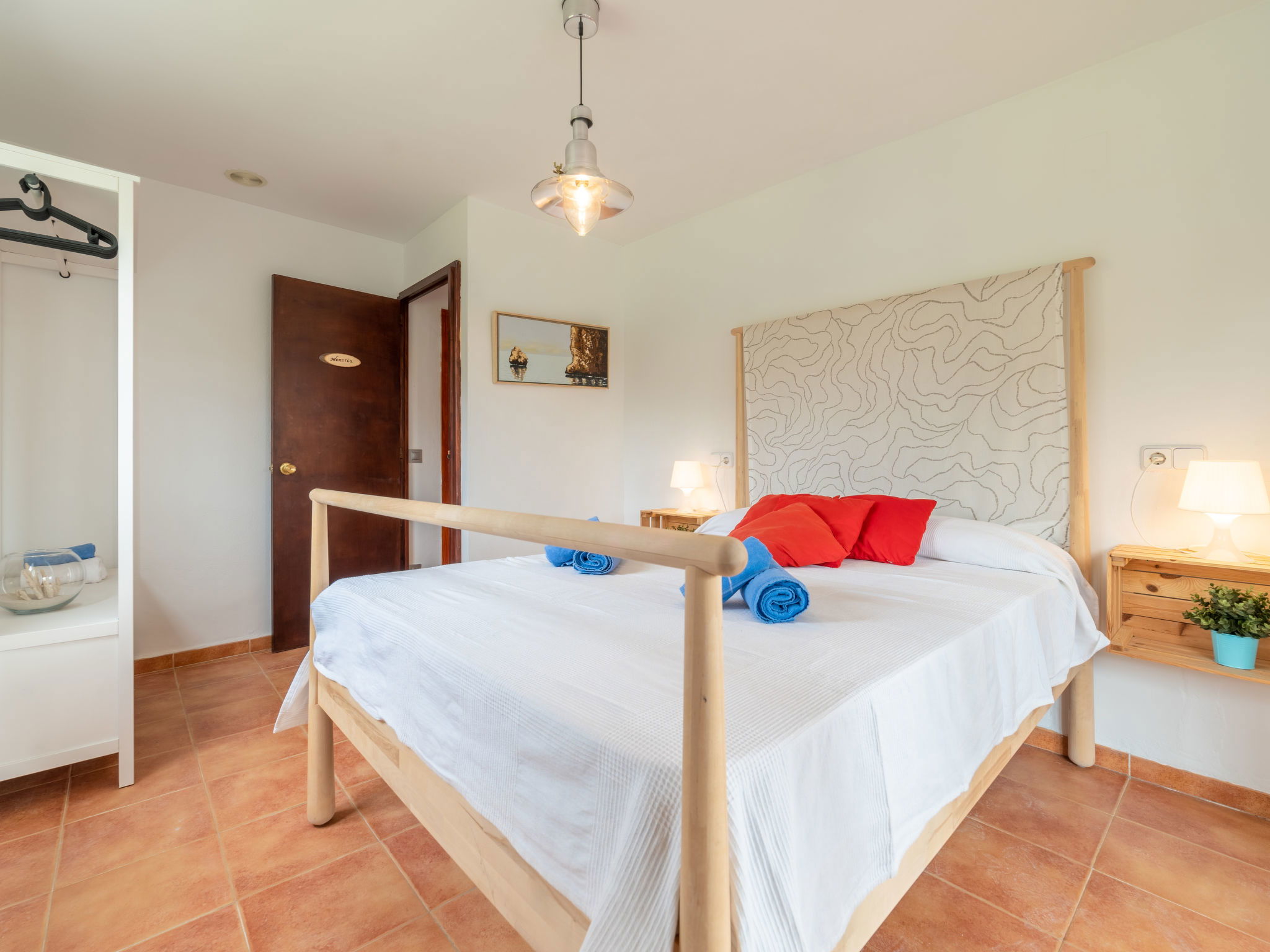 "Can Delfin Alcudia", 5-room villa 140 m2, lower ground floor. Object suitable for 8 adults. Spacious and bright, practical and comfortable furnishings: living/dining room with panoramic window with open-hearth fireplace (only for decoration), dining table, TV and international TV channels (flat screen). 1 large double bedroom with panoramic window with 1 french bed (160 cm, length 190 cm), air conditioning and forced-air heating. 2 large double bedrooms with panoramic window, each room with 1 french bed (135 cm, length 190 cm), air conditioning and forced-air heating. 1 double bedroom with panoramic window with 2 pull-out beds (2 pers. 2 x 90 cm, length 190 cm). Large lounge with sliding door with air conditioning and forced-air heating. Exit to the patio. Kitchen (4 hot plates, oven, dishwasher, toaster, kettle, microwave, freezer, electric coffee machine). Bath/WC, shower/WC. Large patio, porch. Terrace furniture, barbecue, deck chairs (8), covered balcony. Beautiful view of the mountains. Facilities: washing machine, dryer, safe, iron, children's high chair, baby cot for up to 2 year olds, hair dryer. Internet (WiFi, free). Parking (fenced). Please note: suitable for families. Fire extinguisher. ETV5036 // Reg. Nr.: ESFCTU00000704300002469300000000000000000000ETV/50364