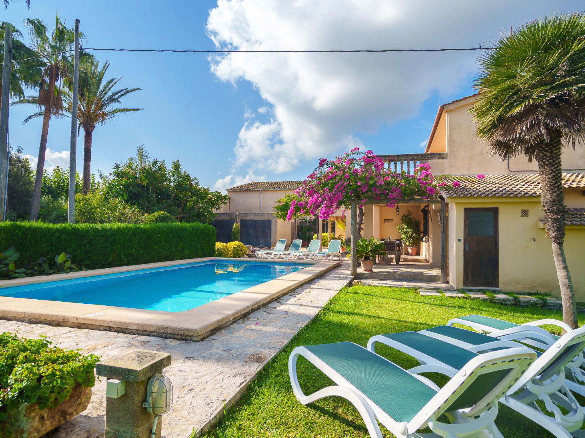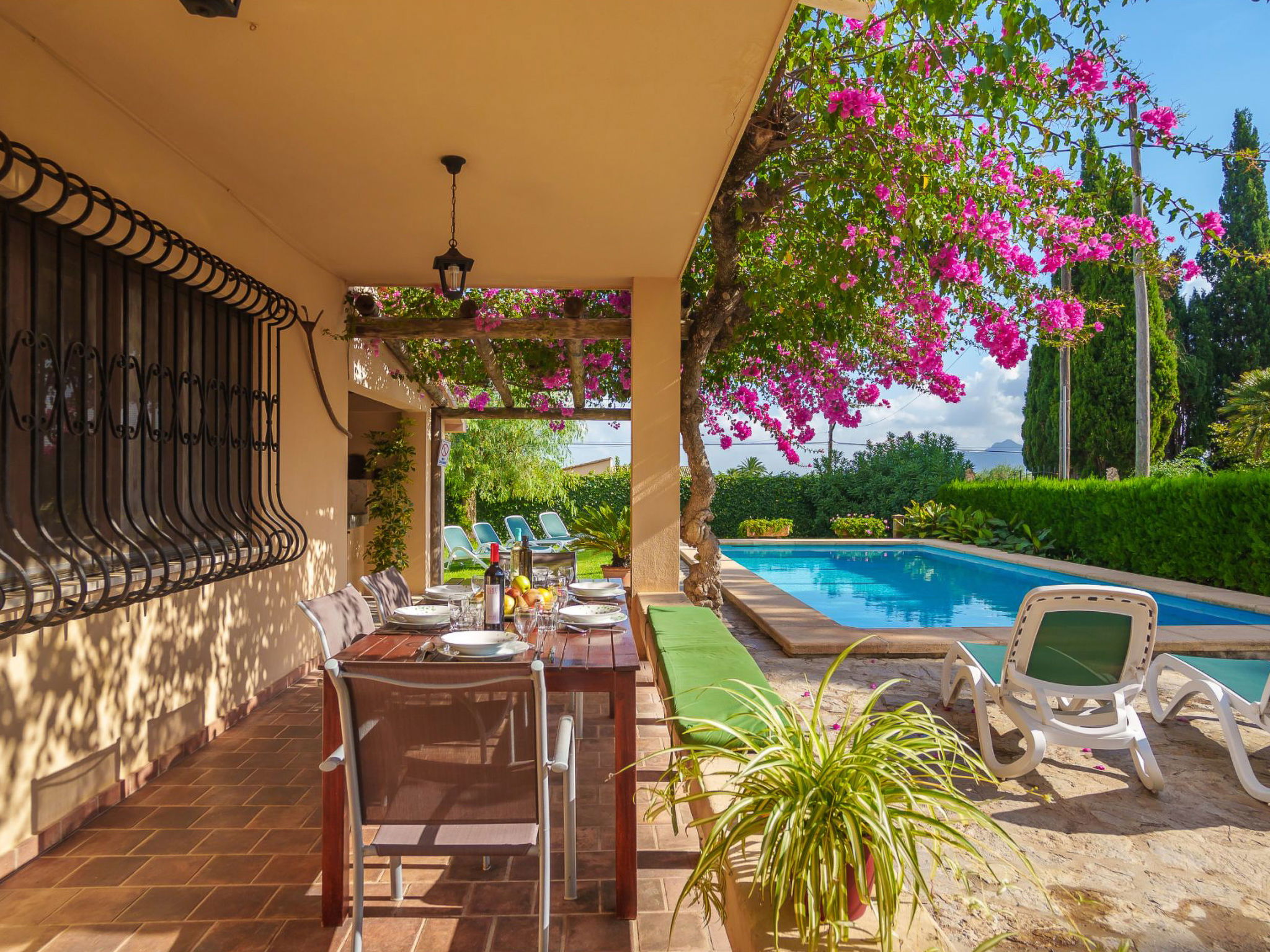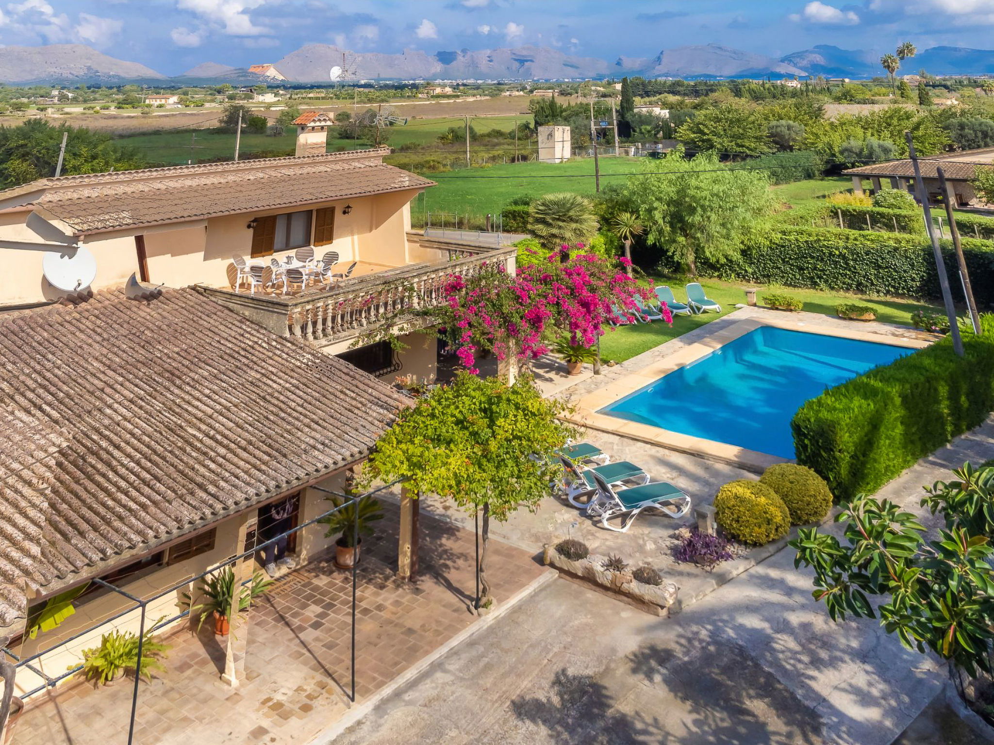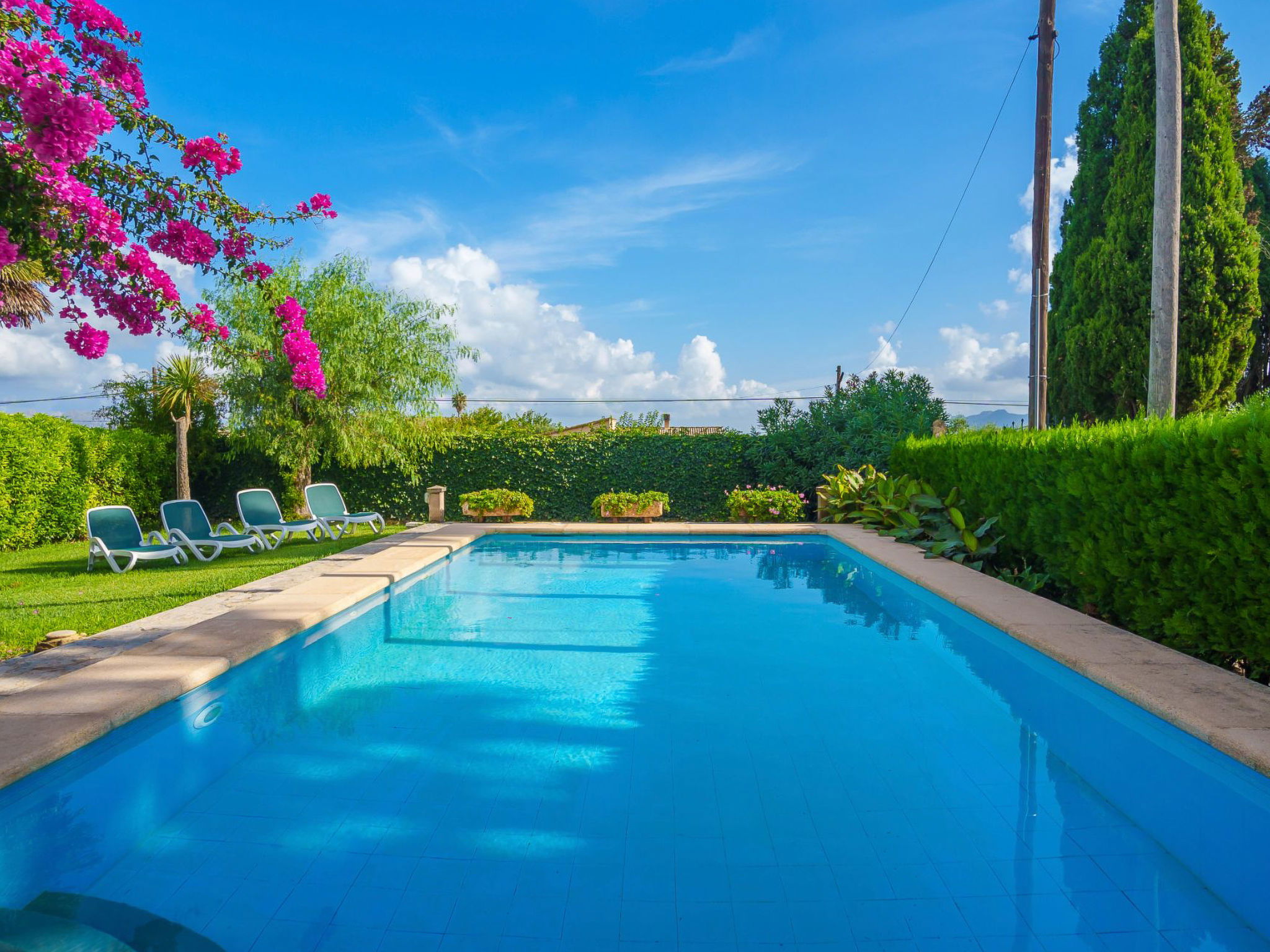 Alcudia 6 km from Pollensa: Large, comfortable single-family house "La Truyola Pool Finca", 2 storeys, surrounded by trees and fields. Outside the resort, 6 km from the centre of Alcúdia, in a quiet position, 1 km from the edge of the forest, 6 km from the sea, 6 km from the beach, in the countryside. Private: property 1'600 m2, garden with lawn and flowers, swimming pool angular (4 x 9 m, depth 1 - depth 2 cm, seasonal availability: 01.Apr. - 31.Oct.). Outdoor shower, patio, barbecue, pool maintenance by the owner/gardener. Parking at the house on the premises. Shop 5 km, grocery 5 km, supermarket 5 km, restaurant 6 km, bar 5 km, bakery 5 km, bicycle rental 6 km, bus stop "Alcudia" 6 km, railway station "Sa Pobla" 8 km, ferry "Puerto de Alcúdia" 8 km, sandy beach "Playa de Alcúdia" 5 km, shingle beach "Alcanada" 8 km, diving center 10 km. Sports harbour 8 km, marina 8 km, golf course (18 hole) 5 km, surf school 6 km, sailing school 6 km, tennis 8 km, riding stable 7 km, sports centre 6 km, walking paths from the house 5 km, cycle lane 1 km. Nearby attractions: Playa de Formentor 18 km, Faro de Formentor 27 km, Monasterio de Lluc 32 km, Cuevas de Campanet 10 km. Hiking paths: La Victoria 14 km, Coll Baix 12 km. Please note: car recommended. Suitable for families, suitable for seniors. The owner does not accept any groups. The owner does not accept any youth groups. Airfield 60 km from the property.