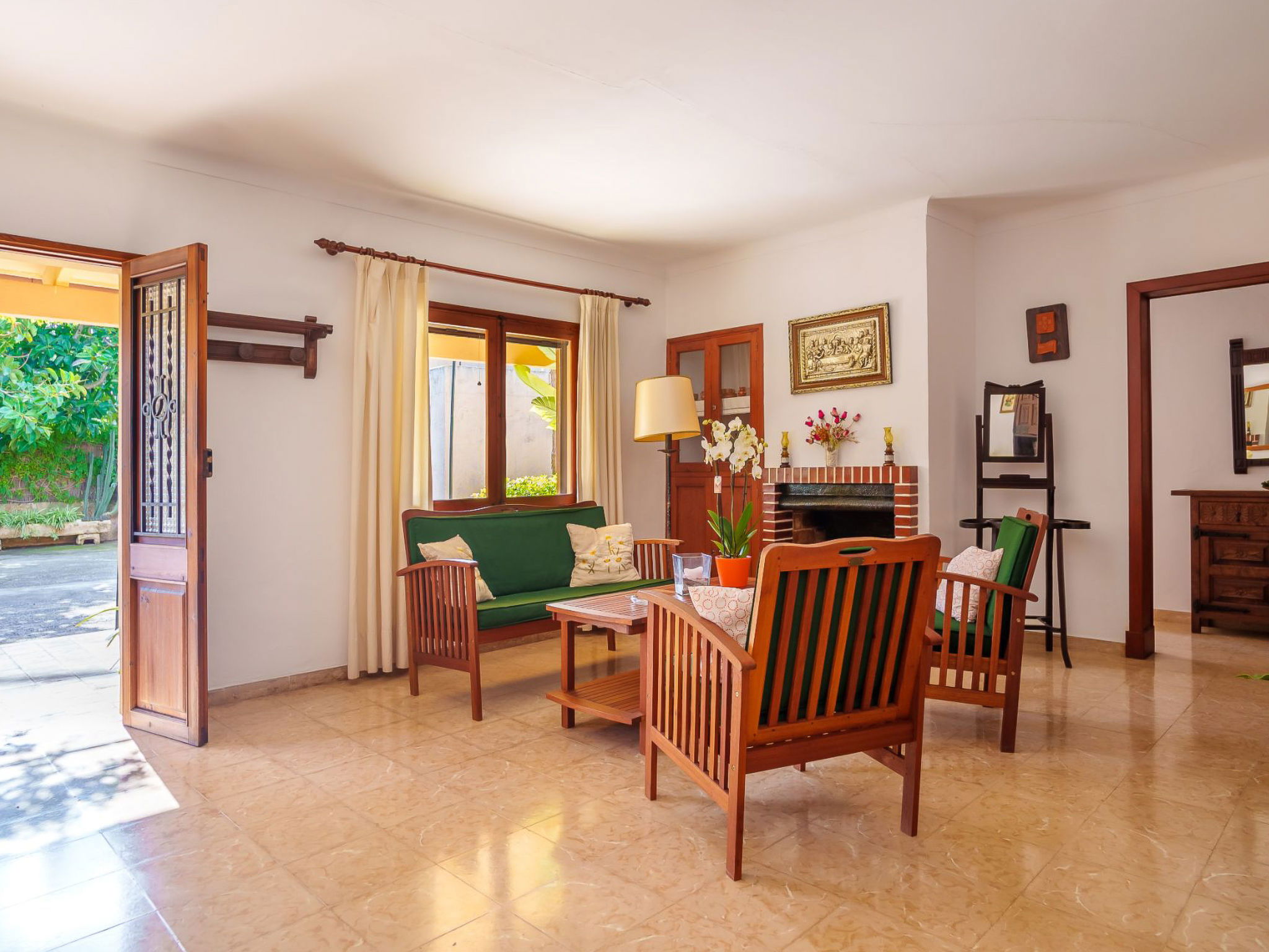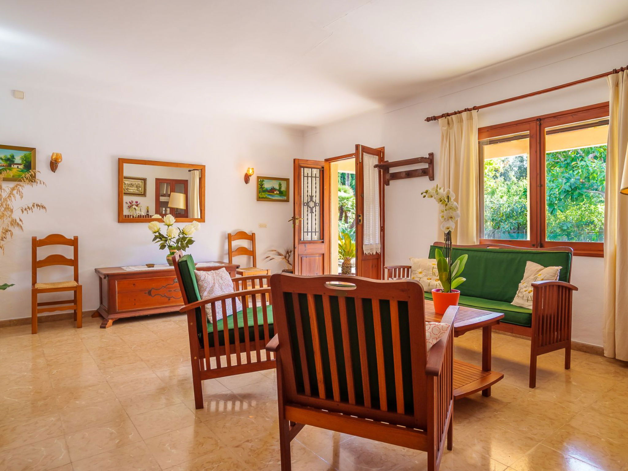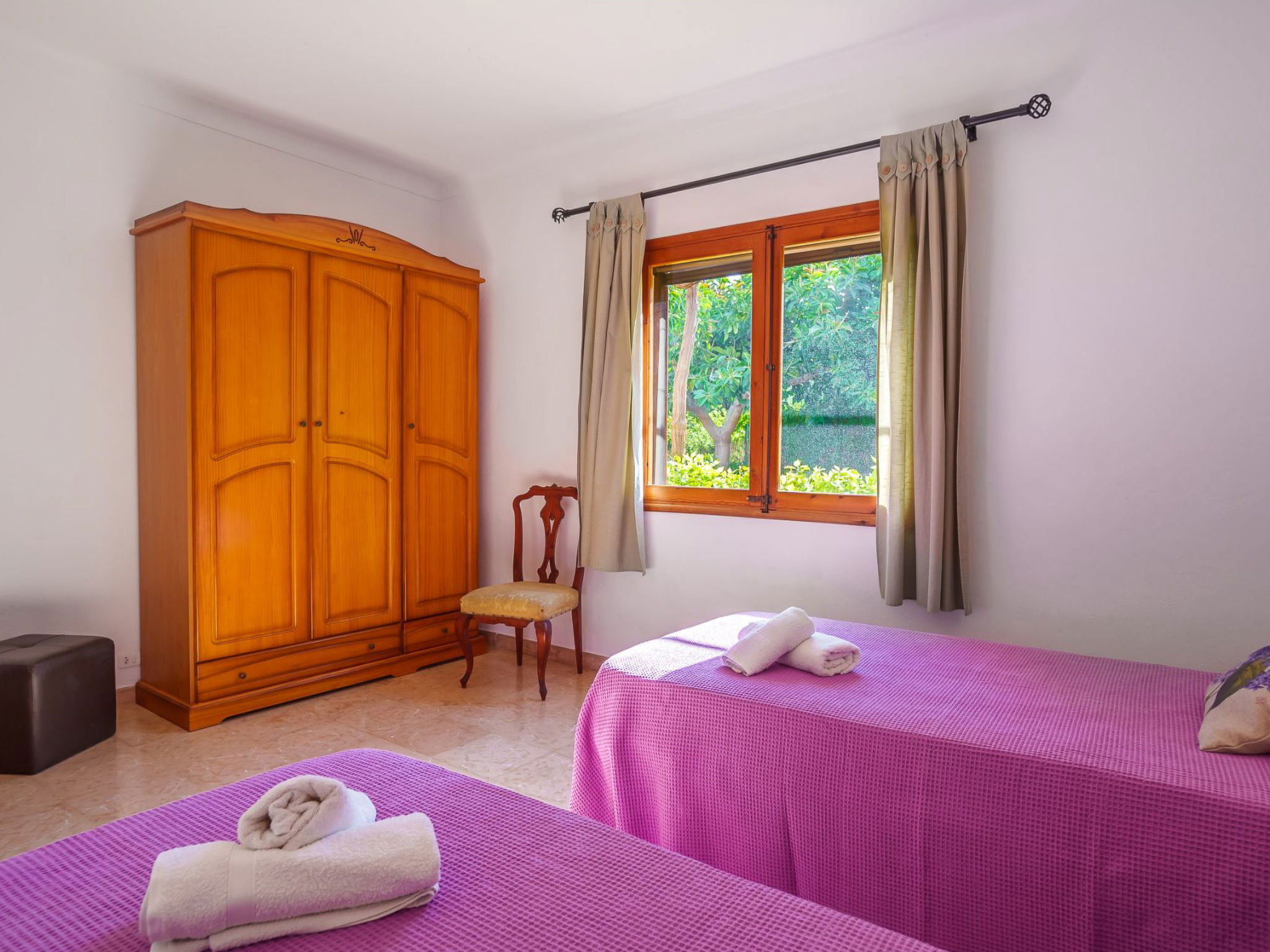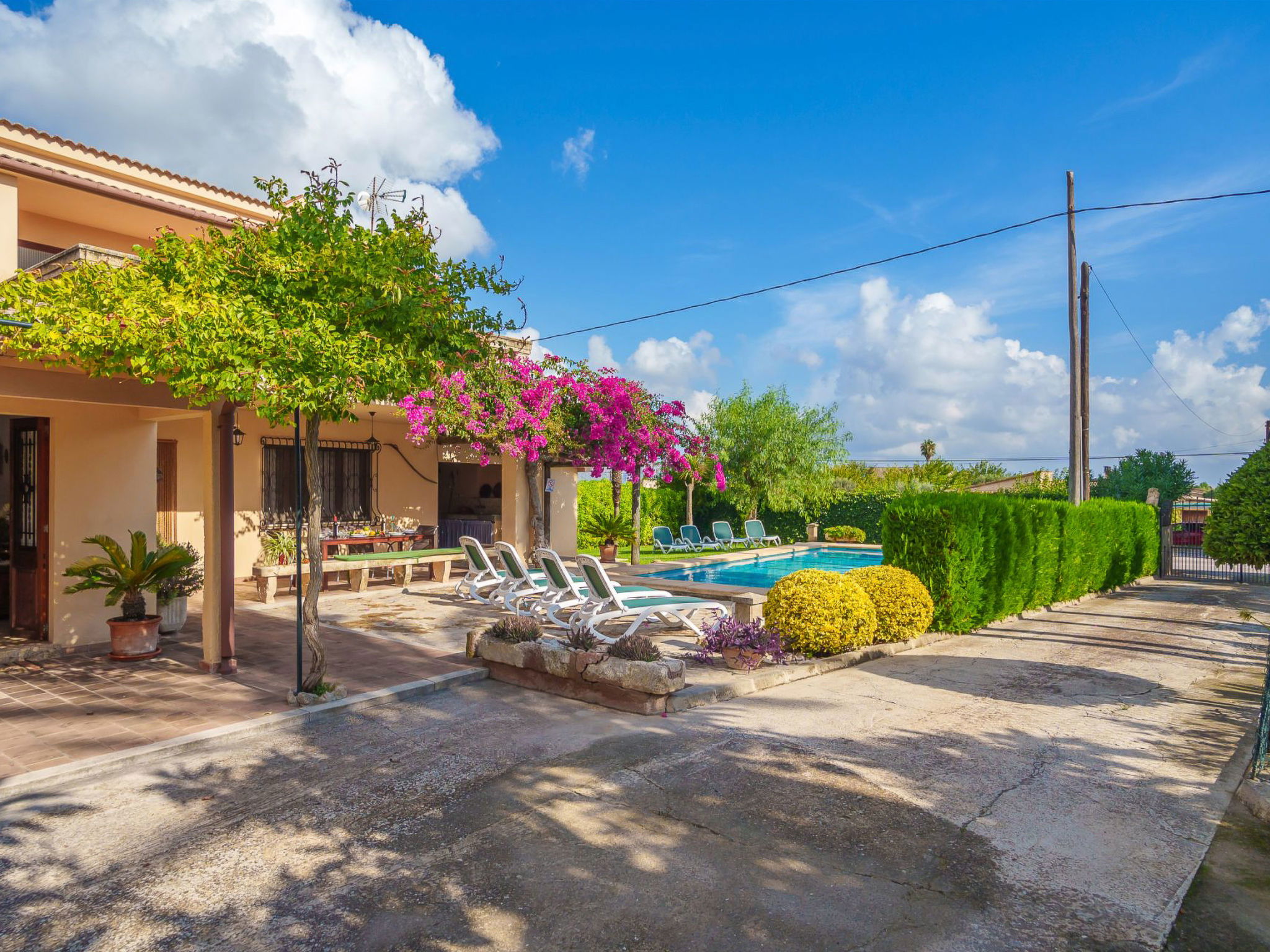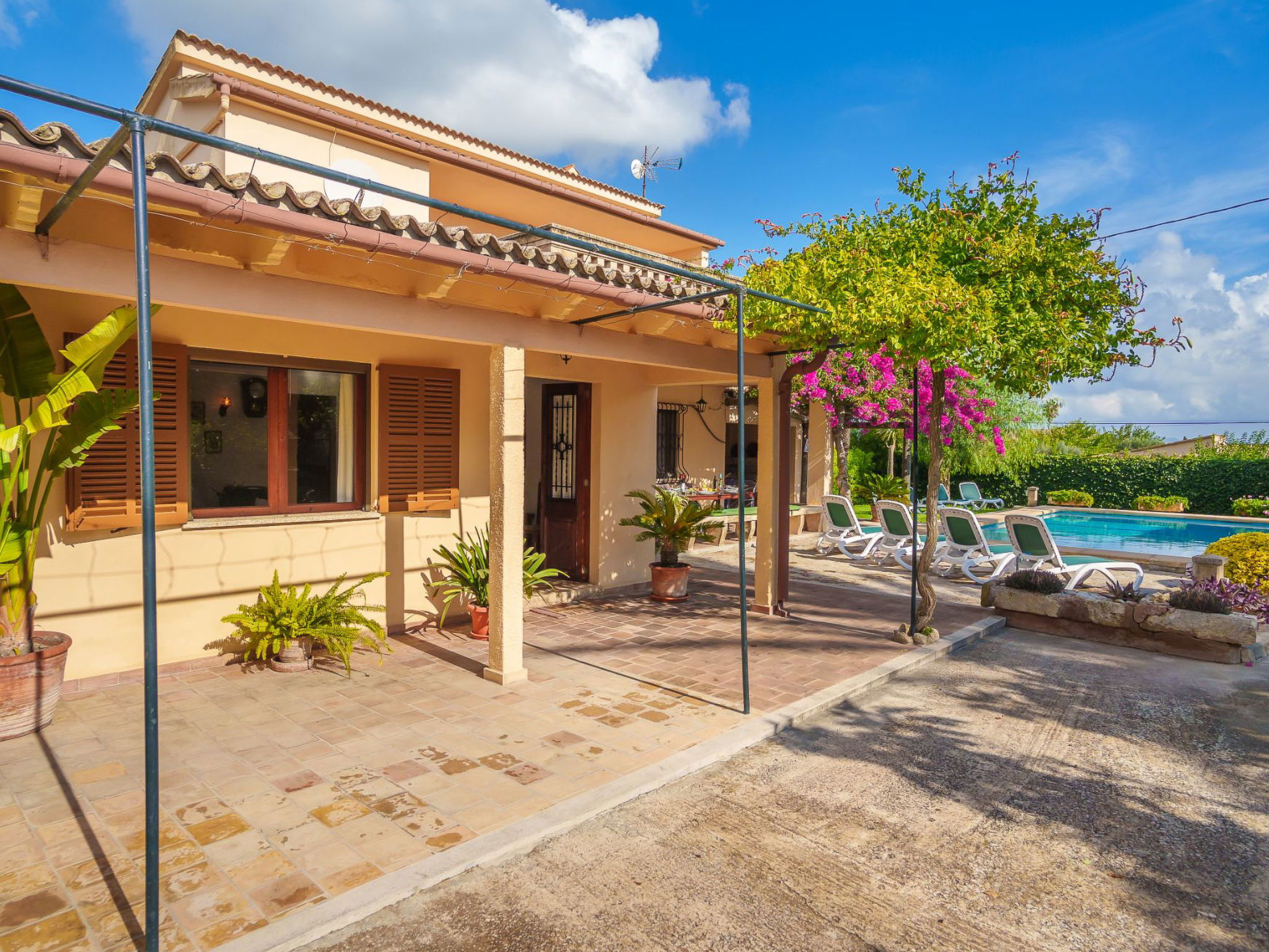 Alcudia 6 km from Pollensa: Large, comfortable single-family house "La Truyola Pool Finca", 2 storeys, surrounded by trees and fields. Outside the resort, 6 km from the centre of Alcúdia, in a quiet position, 1 km from the edge of the forest, 6 km from the sea, 6 km from the beach, in the countryside. Private: property 1'600 m2, garden with lawn and flowers, swimming pool angular (4 x 9 m, depth 1 - depth 2 cm, seasonal availability: 01.Apr. - 31.Oct.). Outdoor shower, patio, barbecue, pool maintenance by the owner/gardener. Parking at the house on the premises. Shop 5 km, grocery 5 km, supermarket 5 km, restaurant 6 km, bar 5 km, bakery 5 km, bicycle rental 6 km, bus stop "Alcudia" 6 km, railway station "Sa Pobla" 8 km, ferry "Puerto de Alcúdia" 8 km, sandy beach "Playa de Alcúdia" 5 km, shingle beach "Alcanada" 8 km, diving center 10 km. Sports harbour 8 km, marina 8 km, golf course (18 hole) 5 km, surf school 6 km, sailing school 6 km, tennis 8 km, riding stable 7 km, sports centre 6 km, walking paths from the house 5 km, cycle lane 1 km. Nearby attractions: Playa de Formentor 18 km, Faro de Formentor 27 km, Monasterio de Lluc 32 km, Cuevas de Campanet 10 km. Hiking paths: La Victoria 14 km, Coll Baix 12 km. Please note: car recommended. Suitable for families, suitable for seniors. The owner does not accept any groups. The owner does not accept any youth groups. Airfield 60 km from the property.