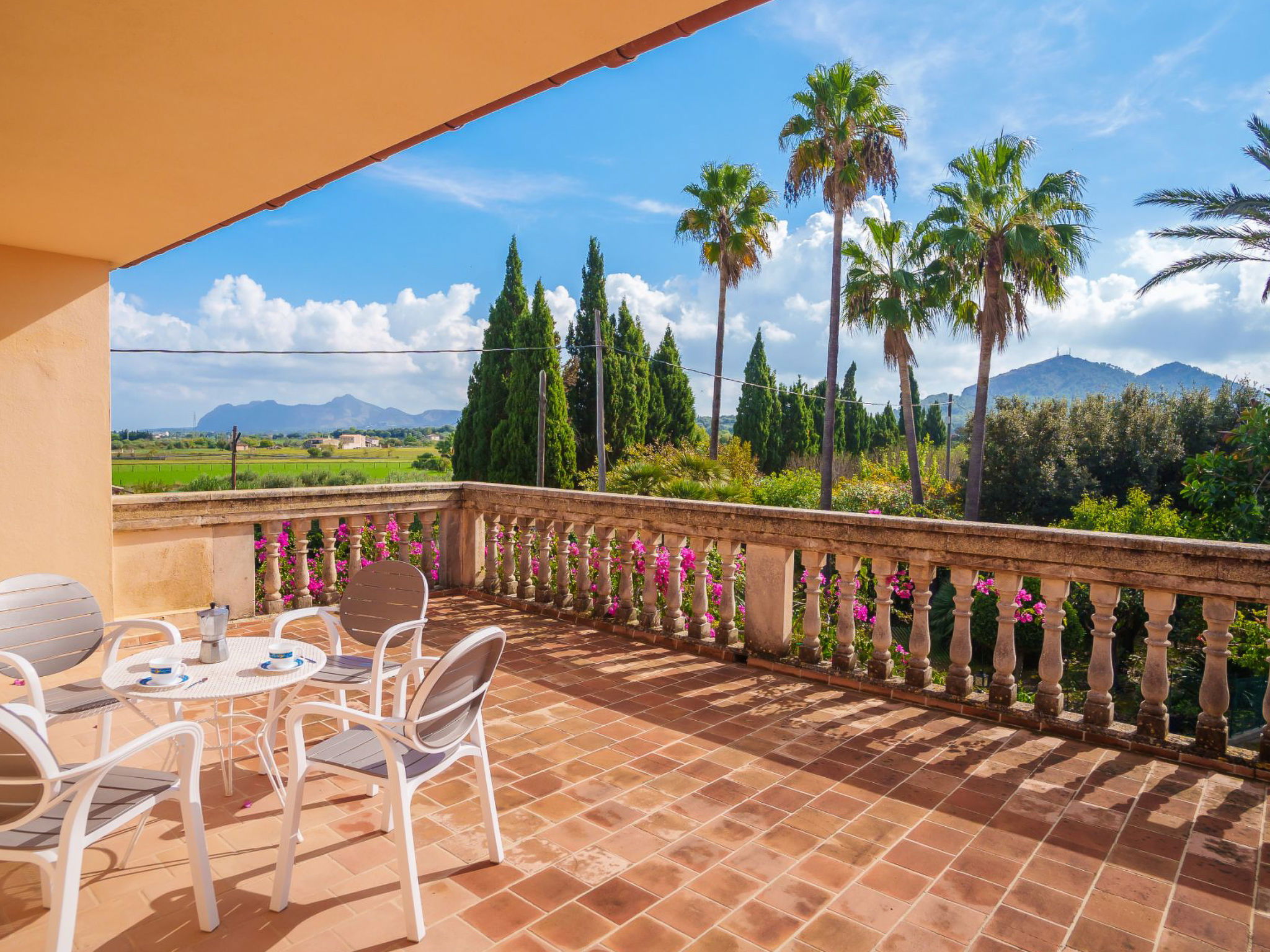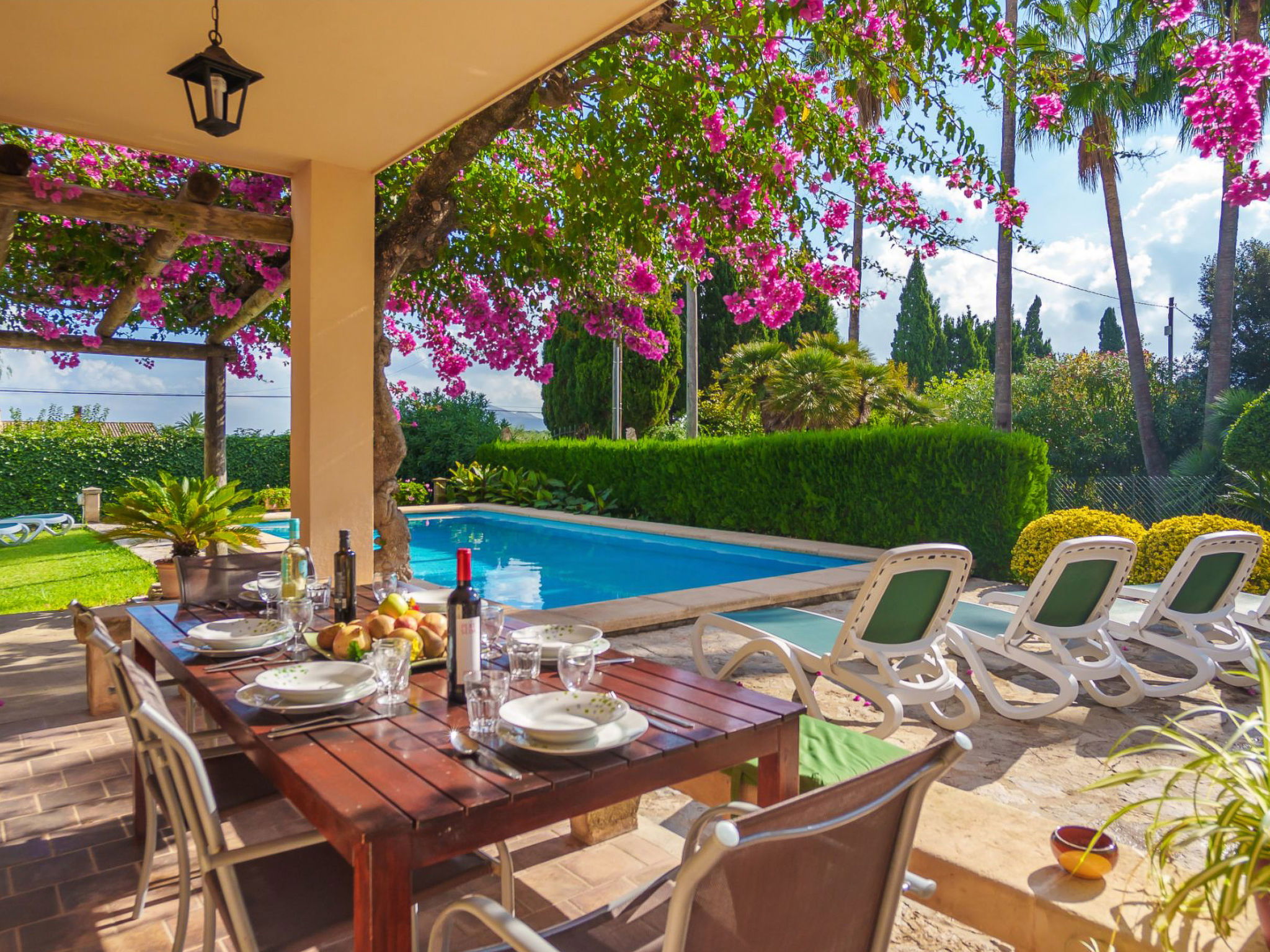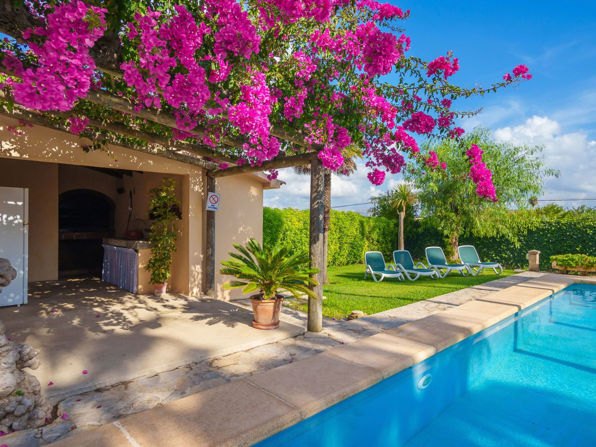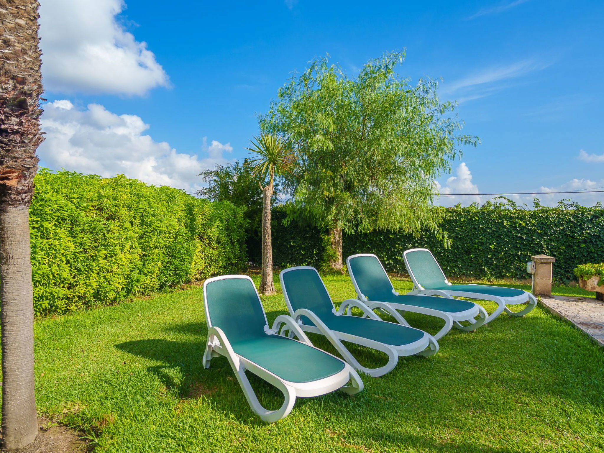 Alcudia 6 km from Pollensa: Large, comfortable single-family house "La Truyola Pool Finca", 2 storeys, surrounded by trees and fields. Outside the resort, 6 km from the centre of Alcúdia, in a quiet position, 1 km from the edge of the forest, 6 km from the sea, 6 km from the beach, in the countryside. Private: property 1'600 m2, garden with lawn and flowers, swimming pool angular (4 x 9 m, depth 1 - depth 2 cm, seasonal availability: 01.Apr. - 31.Oct.). Outdoor shower, patio, barbecue, pool maintenance by the owner/gardener. Parking at the house on the premises. Shop 5 km, grocery 5 km, supermarket 5 km, restaurant 6 km, bar 5 km, bakery 5 km, bicycle rental 6 km, bus stop "Alcudia" 6 km, railway station "Sa Pobla" 8 km, ferry "Puerto de Alcúdia" 8 km, sandy beach "Playa de Alcúdia" 5 km, shingle beach "Alcanada" 8 km, diving center 10 km. Sports harbour 8 km, marina 8 km, golf course (18 hole) 5 km, surf school 6 km, sailing school 6 km, tennis 8 km, riding stable 7 km, sports centre 6 km, walking paths from the house 5 km, cycle lane 1 km. Nearby attractions: Playa de Formentor 18 km, Faro de Formentor 27 km, Monasterio de Lluc 32 km, Cuevas de Campanet 10 km. Hiking paths: La Victoria 14 km, Coll Baix 12 km. Please note: car recommended. Suitable for families, suitable for seniors. The owner does not accept any groups. The owner does not accept any youth groups. Airfield 60 km from the property.