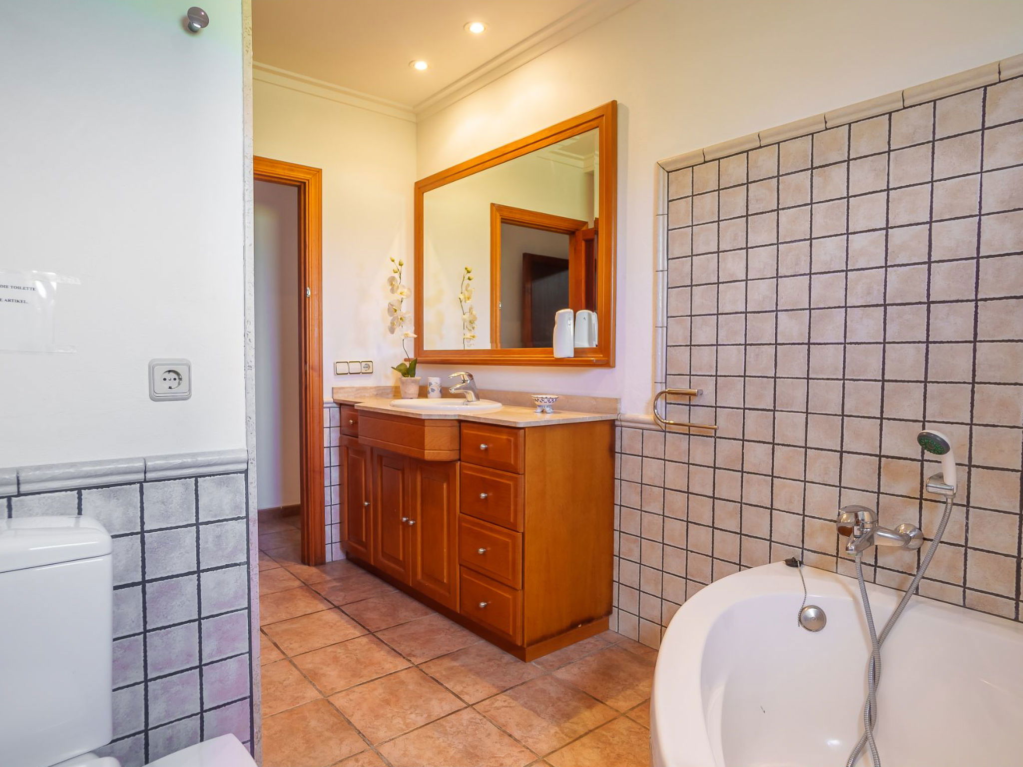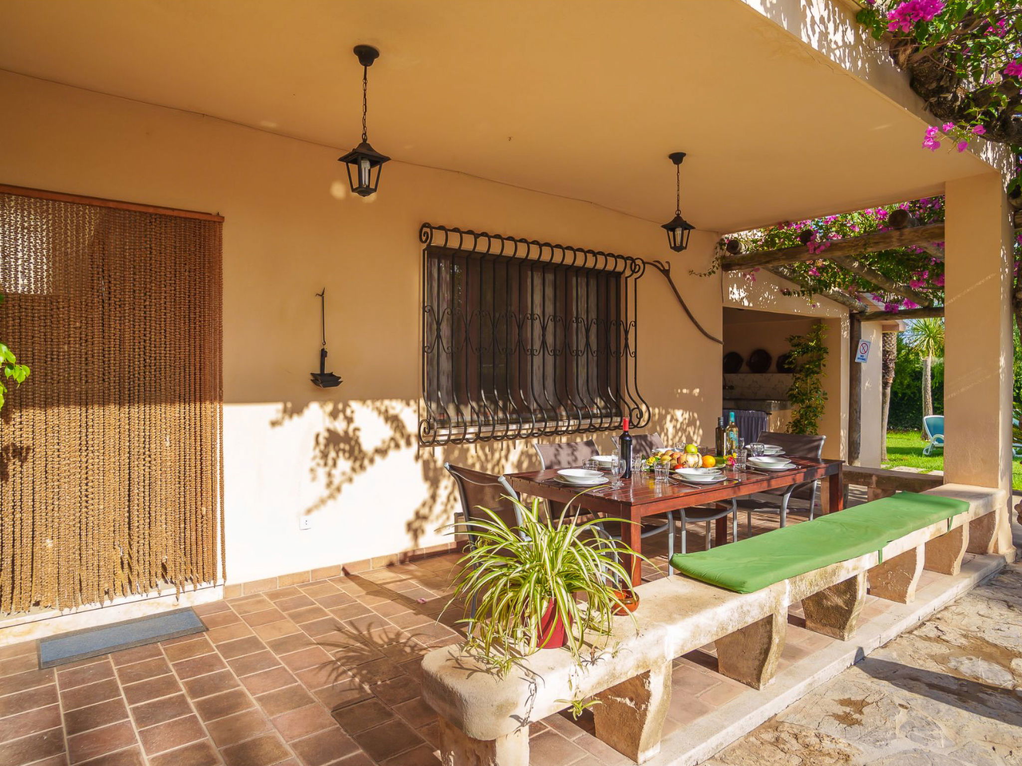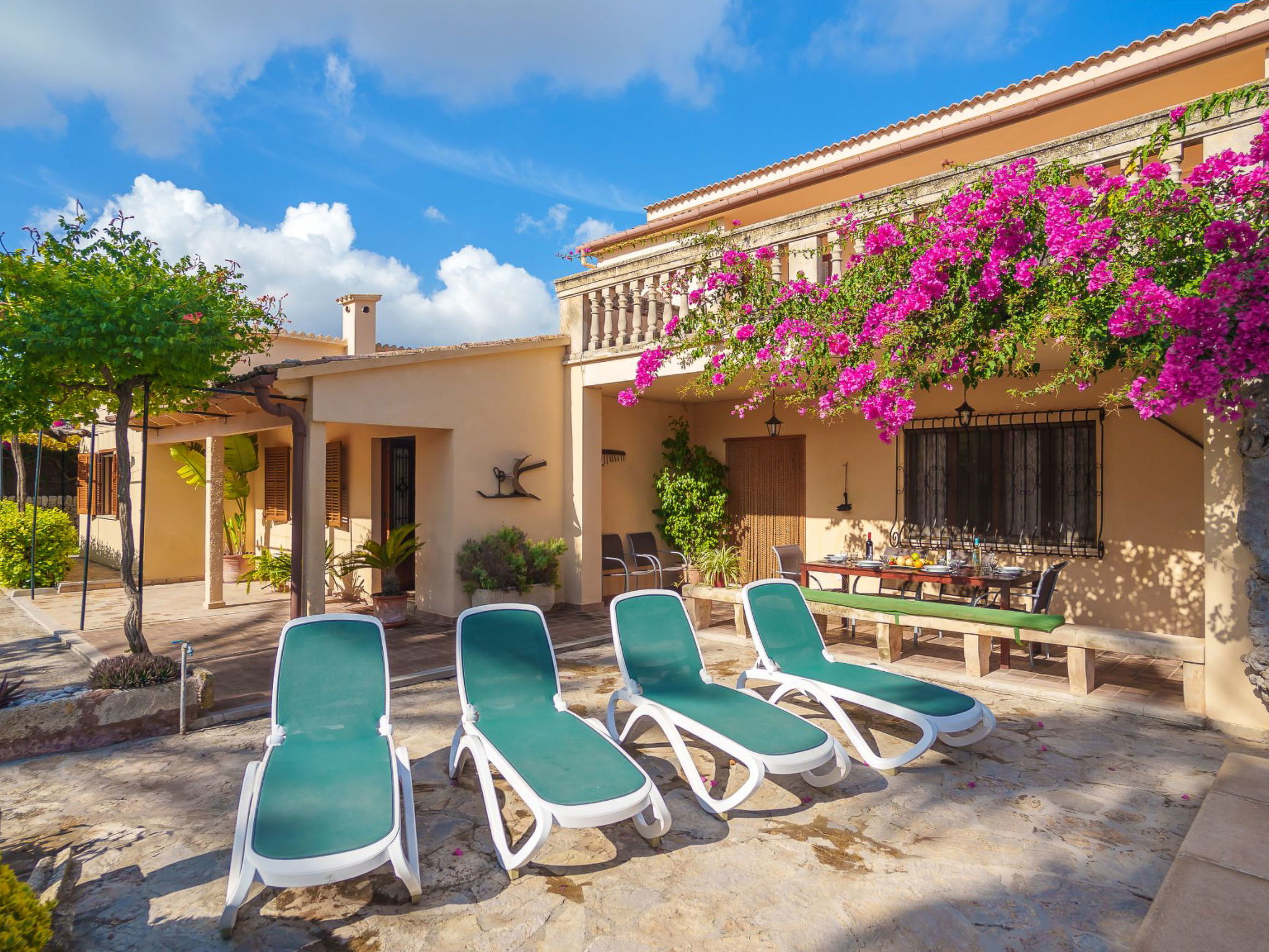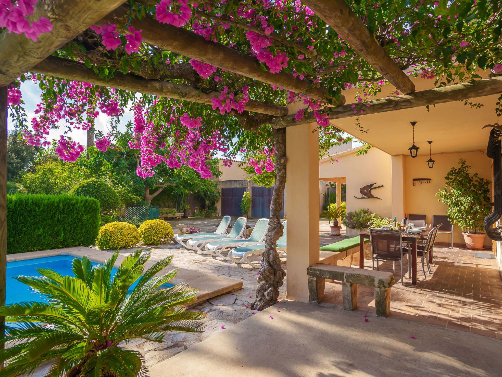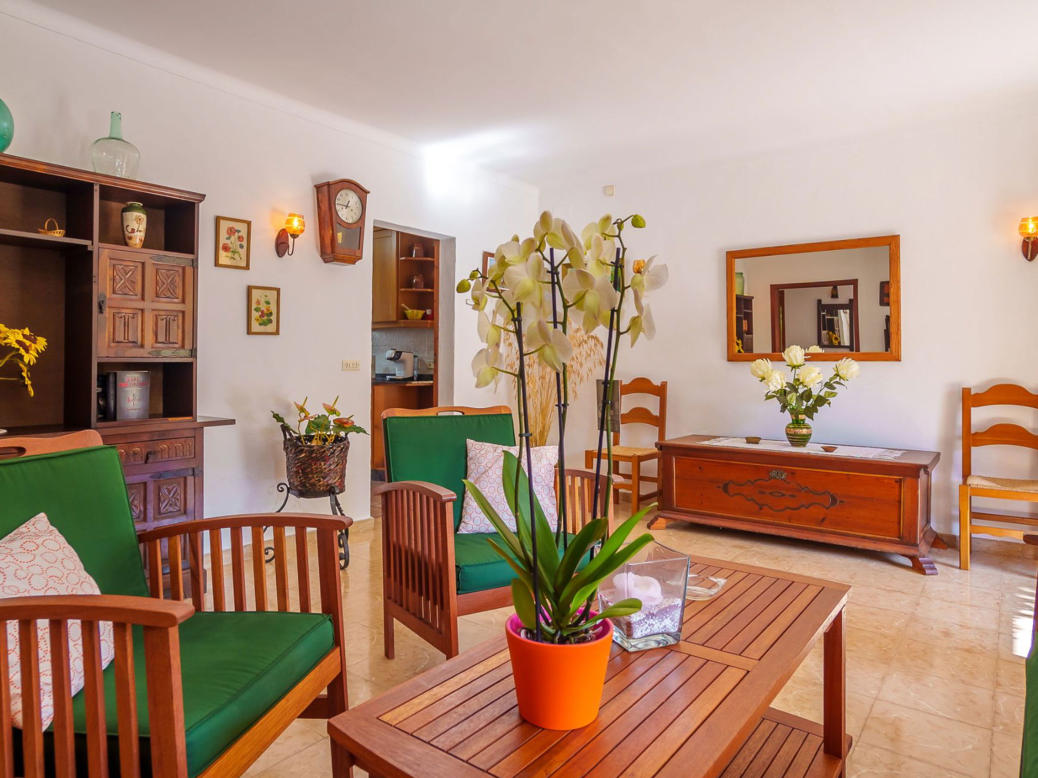 Alcudia 6 km from Pollensa: Large, comfortable single-family house "La Truyola Pool Finca", 2 storeys, surrounded by trees and fields. Outside the resort, 6 km from the centre of Alcúdia, in a quiet position, 1 km from the edge of the forest, 6 km from the sea, 6 km from the beach, in the countryside. Private: property 1'600 m2, garden with lawn and flowers, swimming pool angular (4 x 9 m, depth 1 - depth 2 cm, seasonal availability: 01.Apr. - 31.Oct.). Outdoor shower, patio, barbecue, pool maintenance by the owner/gardener. Parking at the house on the premises. Shop 5 km, grocery 5 km, supermarket 5 km, restaurant 6 km, bar 5 km, bakery 5 km, bicycle rental 6 km, bus stop "Alcudia" 6 km, railway station "Sa Pobla" 8 km, ferry "Puerto de Alcúdia" 8 km, sandy beach "Playa de Alcúdia" 5 km, shingle beach "Alcanada" 8 km, diving center 10 km. Sports harbour 8 km, marina 8 km, golf course (18 hole) 5 km, surf school 6 km, sailing school 6 km, tennis 8 km, riding stable 7 km, sports centre 6 km, walking paths from the house 5 km, cycle lane 1 km. Nearby attractions: Playa de Formentor 18 km, Faro de Formentor 27 km, Monasterio de Lluc 32 km, Cuevas de Campanet 10 km. Hiking paths: La Victoria 14 km, Coll Baix 12 km. Please note: car recommended. Suitable for families, suitable for seniors. The owner does not accept any groups. The owner does not accept any youth groups. Airfield 60 km from the property.