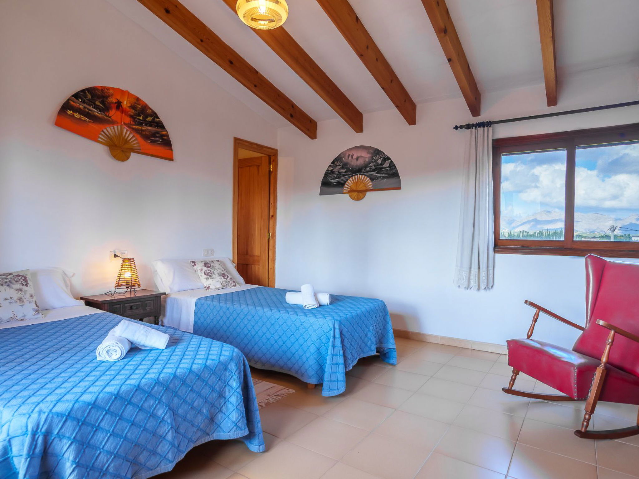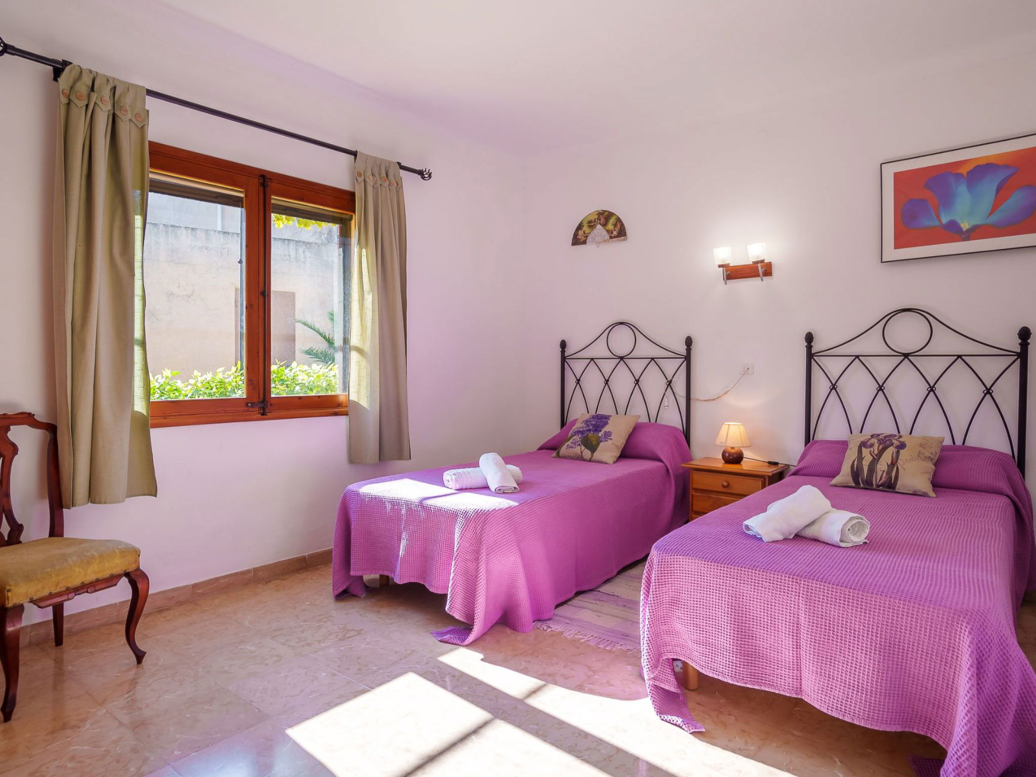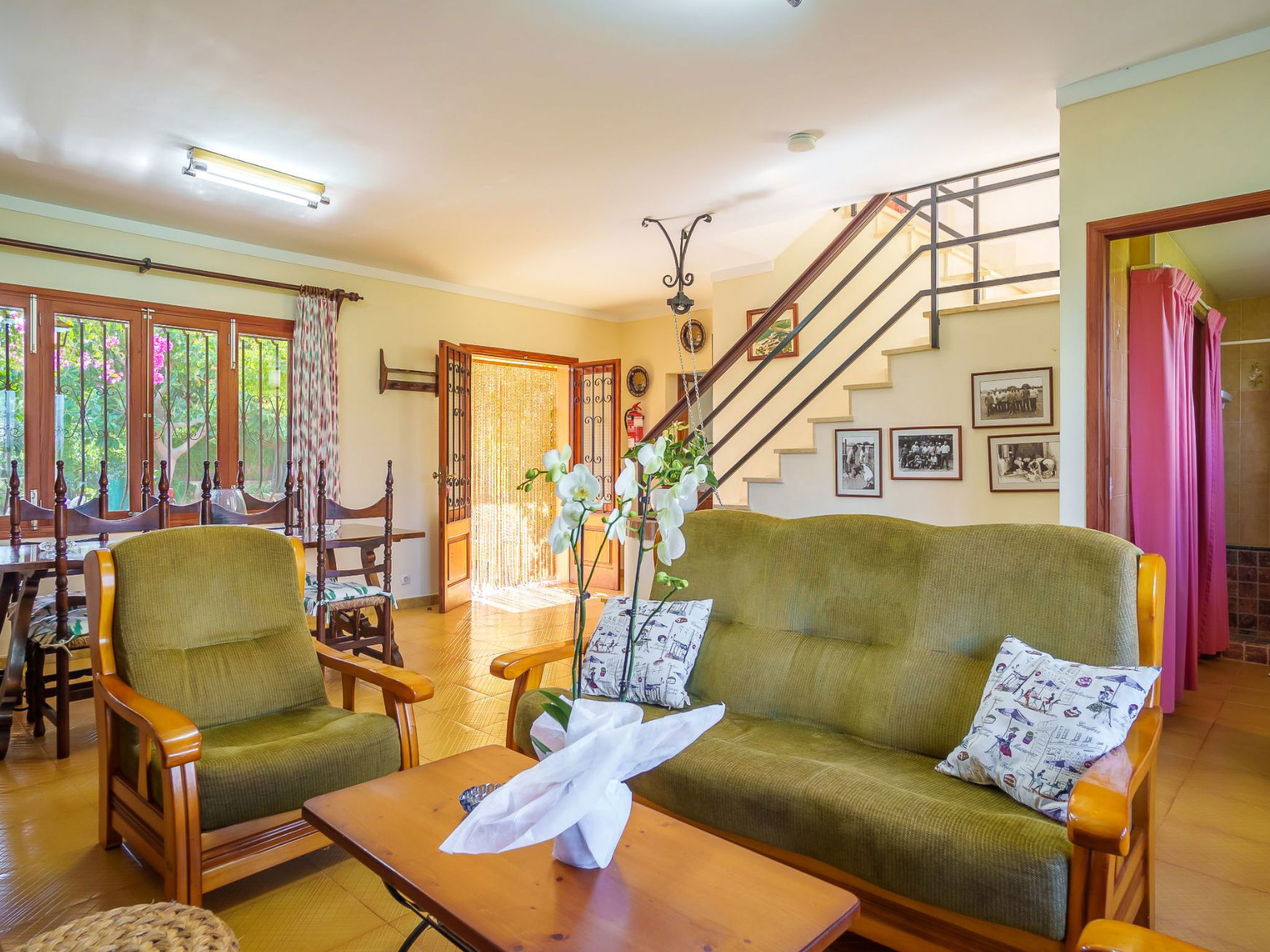 "La Truyola Pool Finca", 6-room house 260 m2 on 2 levels. Object suitable for 8 adults. Spacious, comfortable and cosy furnishings: living room with panoramic window with digital TV, international TV channels, electric heater and fan. Exit to the patio. 2 double bedrooms with panoramic window, each room with 2 beds (90 cm, length 190 cm), electric heater and fan. Dining room with panoramic window with electric heater and fan. 1 double bedroom with panoramic window with 1 french bed (160 cm, length 190 cm), electric heater and fan. Kitchen (4 gas rings, toaster, kettle, microwave, electric coffee machine) with dining table, electric heater and fan. Exit to the terrace. 2 showers/WC. Upper floor: 1 double bedroom with panoramic window with 1 french bed (160 cm, length 190 cm), shower/WC, electric heater and fan. Panoramic view of the mountains. Facilities: washing machine, safe, iron, children's high chair, baby cot for up to 2 year olds, hair dryer. Internet (WiFi, free). Please note: suitable for families. Fire extinguisher. The pool mentioned in the description is for private use. ETV1458 // Reg. Nr.: ESFCTU000007043000196062000000000000000000000ETV14585