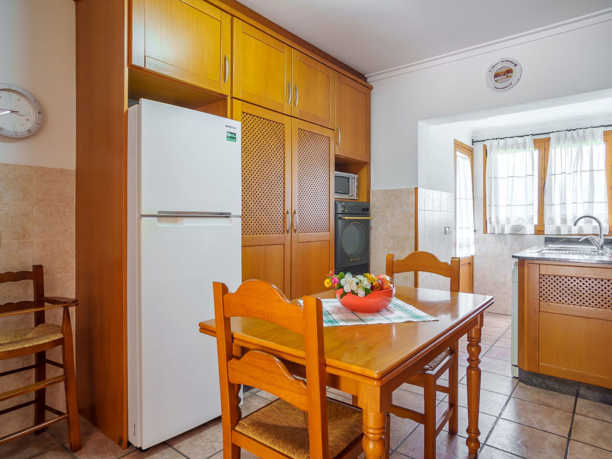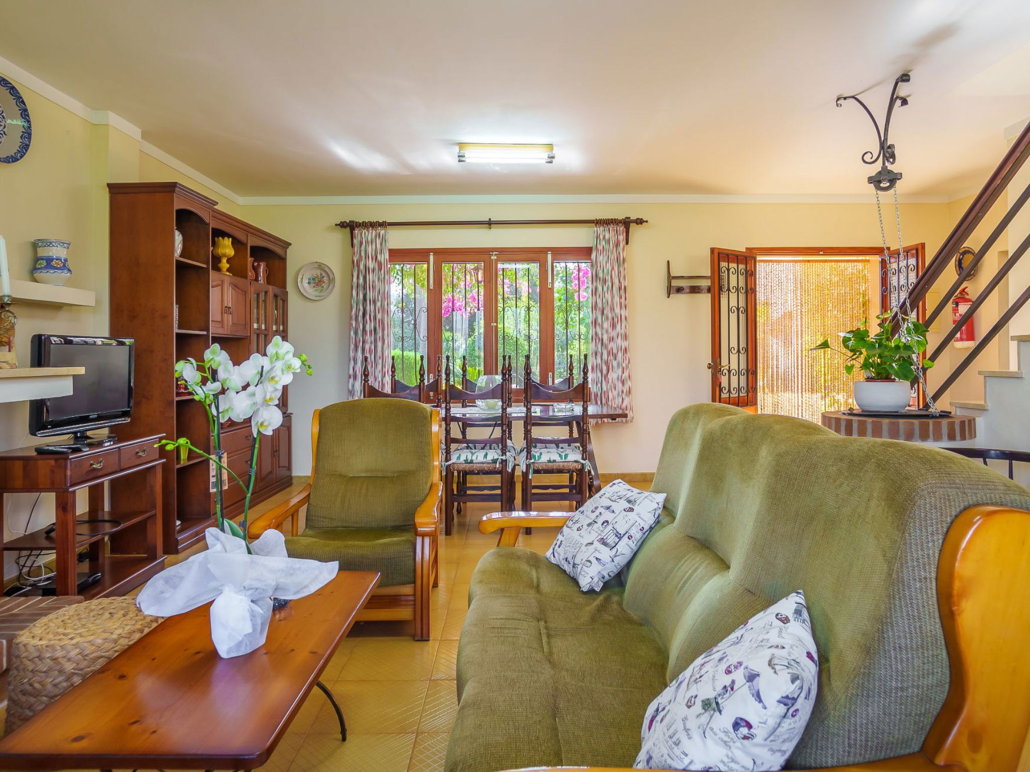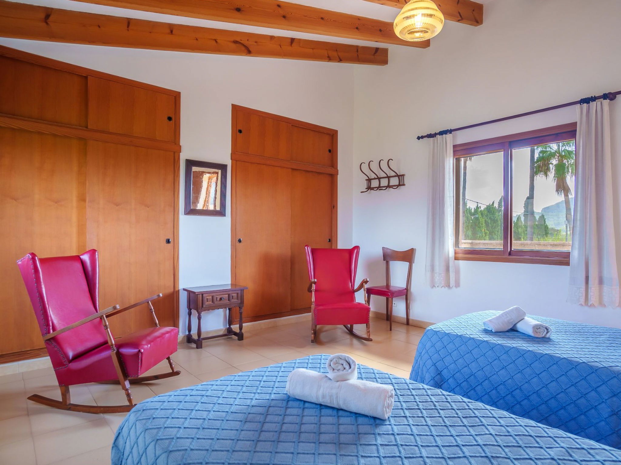 "La Truyola Pool Finca", 6-room house 260 m2 on 2 levels. Object suitable for 8 adults. Spacious, comfortable and cosy furnishings: living room with panoramic window with digital TV, international TV channels, electric heater and fan. Exit to the patio. 2 double bedrooms with panoramic window, each room with 2 beds (90 cm, length 190 cm), electric heater and fan. Dining room with panoramic window with electric heater and fan. 1 double bedroom with panoramic window with 1 french bed (160 cm, length 190 cm), electric heater and fan. Kitchen (4 gas rings, toaster, kettle, microwave, electric coffee machine) with dining table, electric heater and fan. Exit to the terrace. 2 showers/WC. Upper floor: 1 double bedroom with panoramic window with 1 french bed (160 cm, length 190 cm), shower/WC, electric heater and fan. Panoramic view of the mountains. Facilities: washing machine, safe, iron, children's high chair, baby cot for up to 2 year olds, hair dryer. Internet (WiFi, free). Please note: suitable for families. Fire extinguisher. The pool mentioned in the description is for private use. ETV1458 // Reg. Nr.: ESFCTU000007043000196062000000000000000000000ETV14585