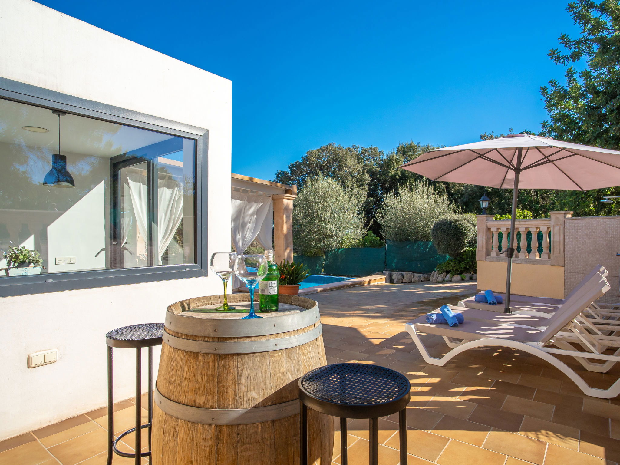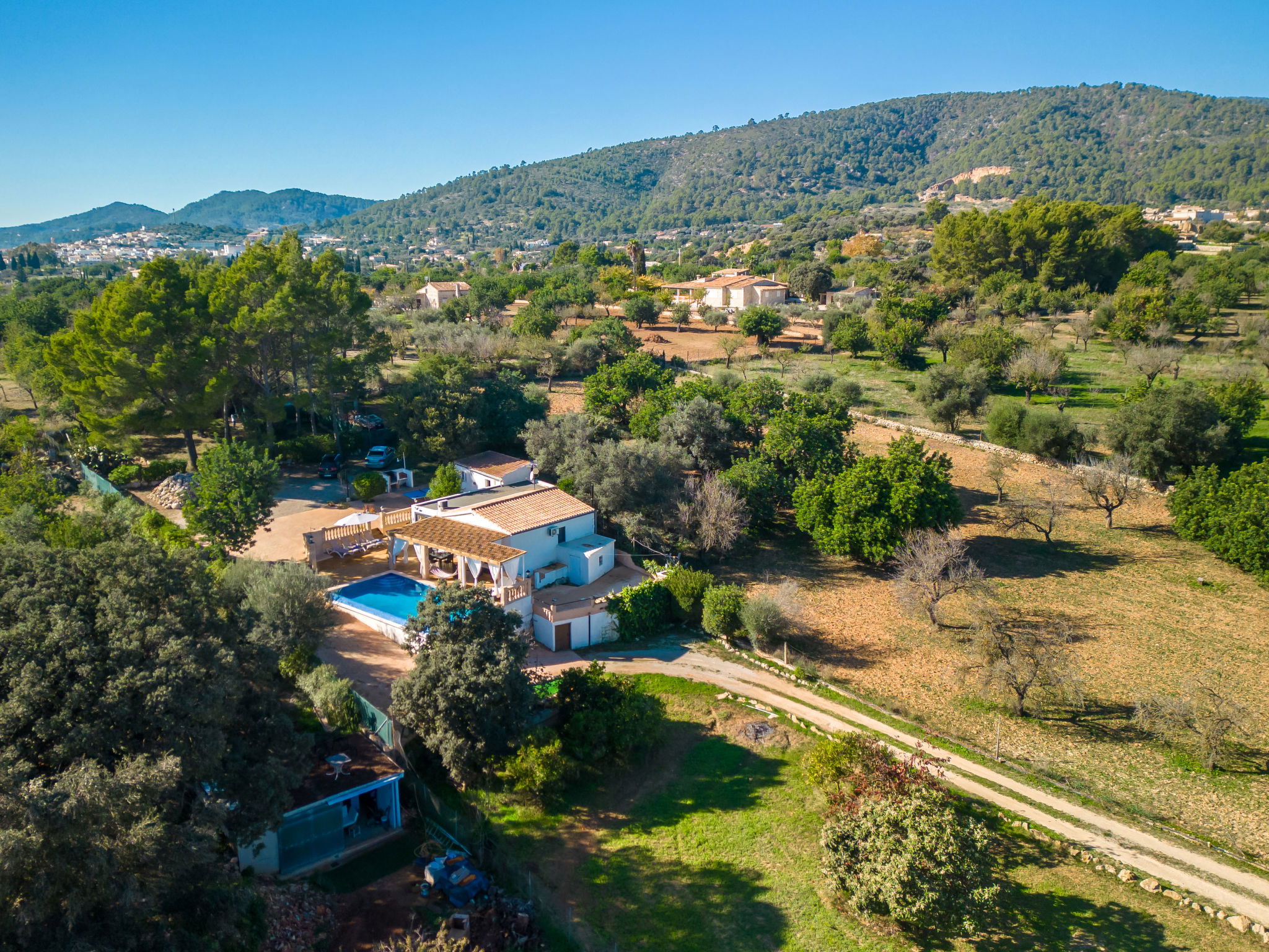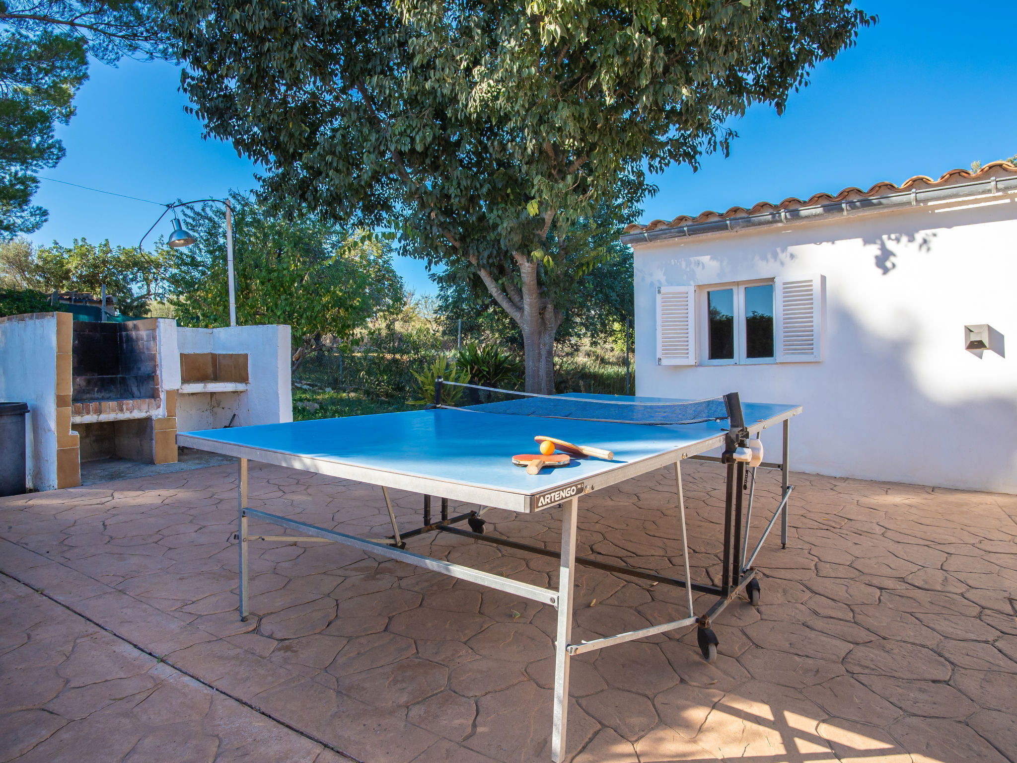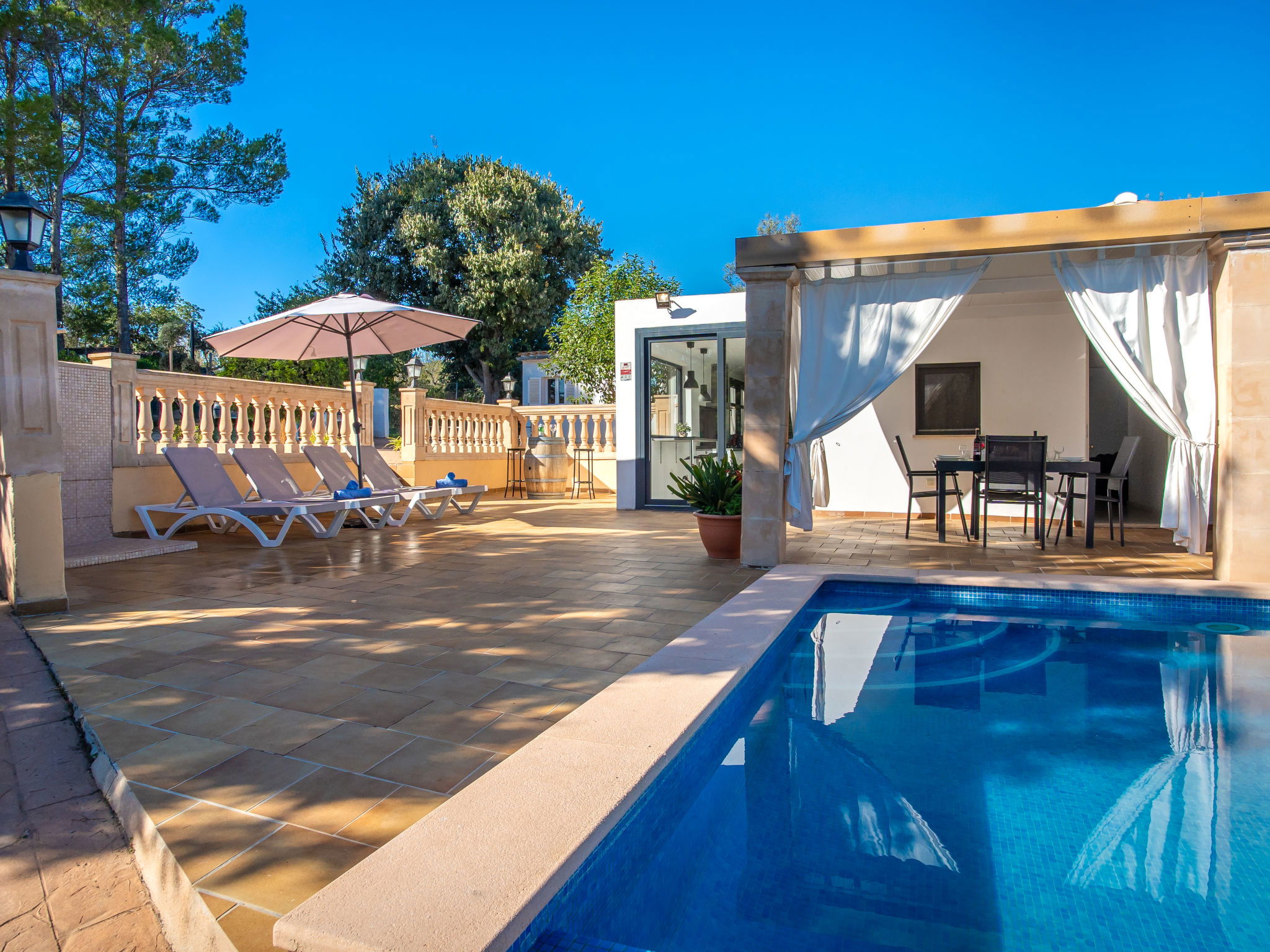 2 km from Lloseta: Modern, cosy, comfortable farm estate "Can Bernat", surrounded by trees. Outside the resort, 2 km from the centre of Lloseta, in a quiet, sunny position, traffic calmed area, 3 km from the edge of the forest, 25 km from the sea, 25 km from the beach, in the countryside. Private: natural state property with trees, natural garden, swimming pool angular (7 x 4 m, depth 100 - 160 cm, seasonal availability: 01.Jan. - 31.Dec.) with salt water and salt-electrolysis pool-cleaning system. Outdoor shower, table tennis, patio, arbour, garden furniture, barbecue, pool maintenance by the owner/gardener. In the house: air conditioning, burglar alarm system, washing machine. 150 m long bumpy motor access. Parking on the premises. Shop 2 km, grocery 2 km, supermarket 2 km, restaurant 2 km, bar 2 km, bakery 2 km, café 2 km, pub garden 2 km, bus stop "Inca" 2.5 km, railway station "Lloseta" 2 km, sandy beach "Puerto Alcudia" 25 km, rocky beach 30 km. Sports harbour 30 km, marina 30 km, golf course (18 hole) 31 km, riding stable 2.5 km, walking paths from the house 1 m. Nearby attractions: Ciudad de Inca, Lloseta. 2.5 km. Hiking paths: Sa Comuna de Biniamar 3.5 km, Lluc, Escorca. Please note: car recommended. Suitable for families, suitable for seniors baby equipment on request (included). Object suitable for 4 adults groups of teenagers on request only. The owner does not accept any youth groups. Loading and unloading of baggage is possible at the holiday house. Animals in the neighbourhood. Airfield 39 km from the property.