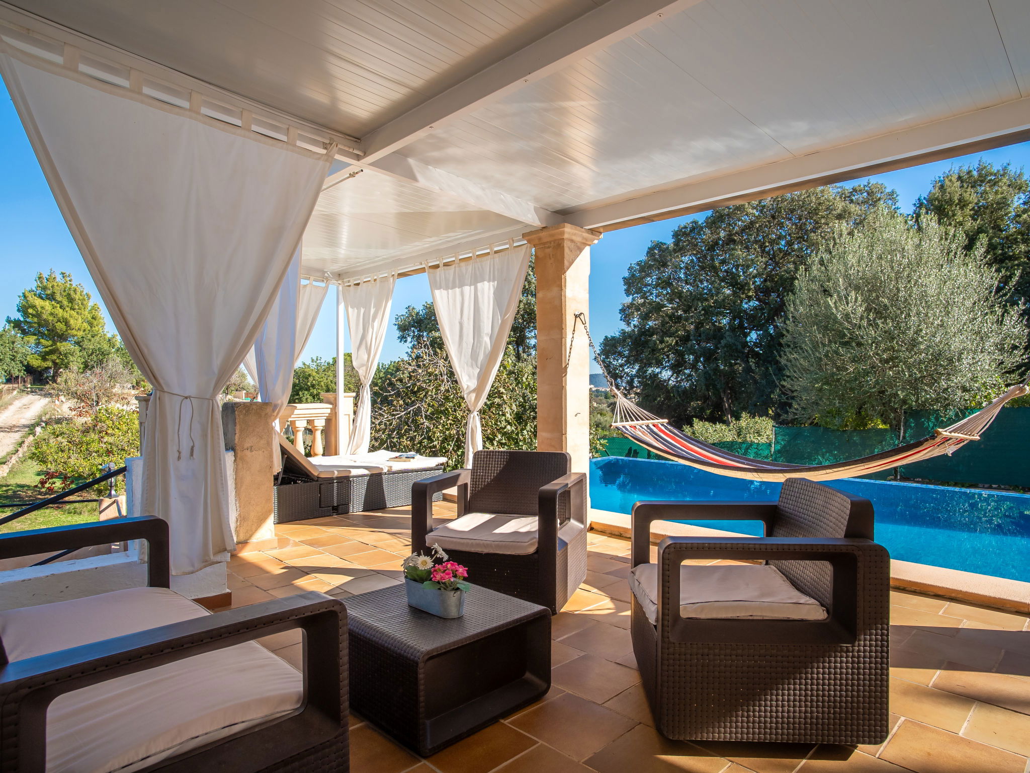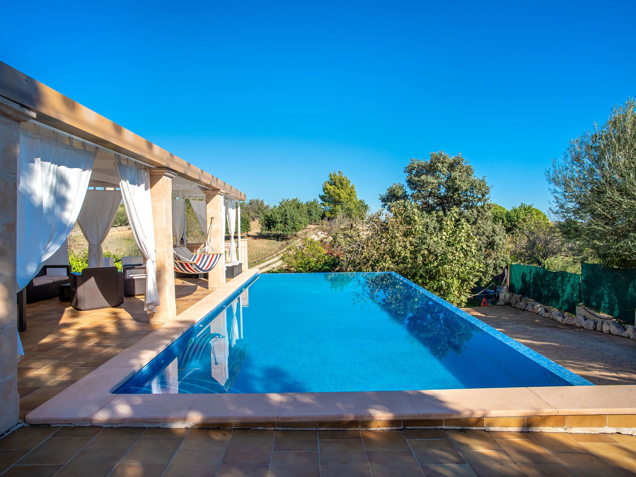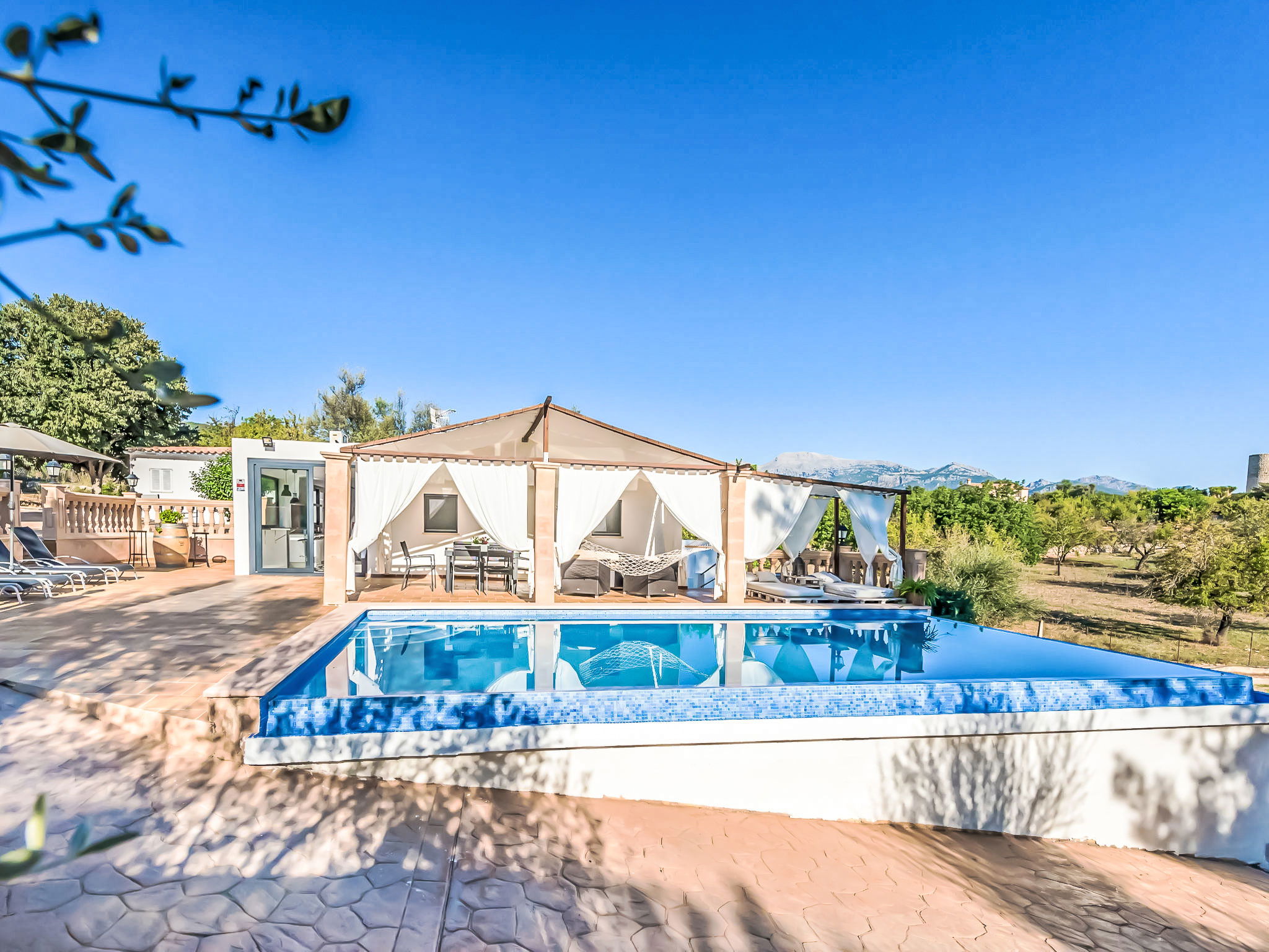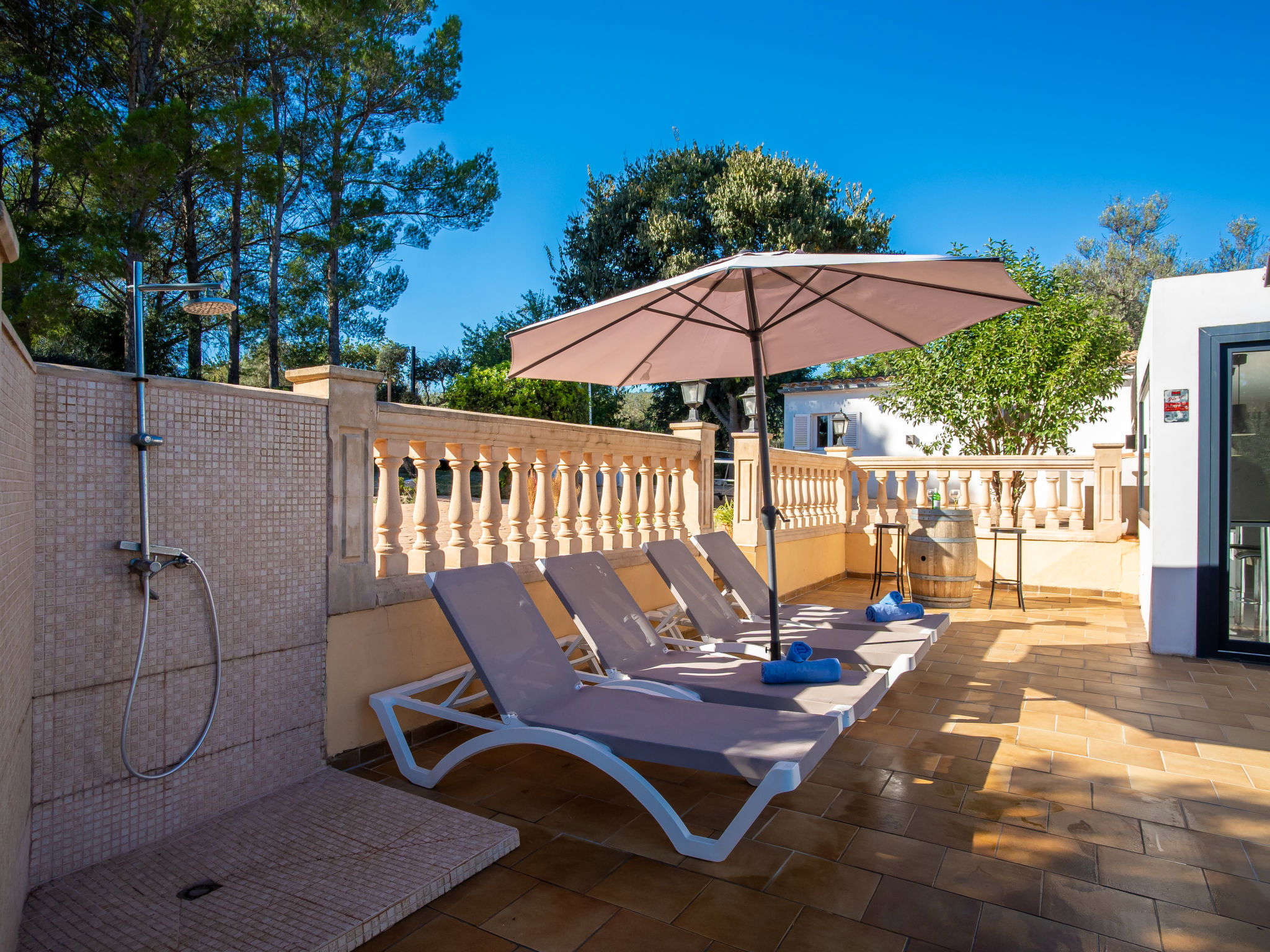 2 km from Lloseta: Modern, cosy, comfortable farm estate "Can Bernat", surrounded by trees. Outside the resort, 2 km from the centre of Lloseta, in a quiet, sunny position, traffic calmed area, 3 km from the edge of the forest, 25 km from the sea, 25 km from the beach, in the countryside. Private: natural state property with trees, natural garden, swimming pool angular (7 x 4 m, depth 100 - 160 cm, seasonal availability: 01.Jan. - 31.Dec.) with salt water and salt-electrolysis pool-cleaning system. Outdoor shower, table tennis, patio, arbour, garden furniture, barbecue, pool maintenance by the owner/gardener. In the house: air conditioning, burglar alarm system, washing machine. 150 m long bumpy motor access. Parking on the premises. Shop 2 km, grocery 2 km, supermarket 2 km, restaurant 2 km, bar 2 km, bakery 2 km, café 2 km, pub garden 2 km, bus stop "Inca" 2.5 km, railway station "Lloseta" 2 km, sandy beach "Puerto Alcudia" 25 km, rocky beach 30 km. Sports harbour 30 km, marina 30 km, golf course (18 hole) 31 km, riding stable 2.5 km, walking paths from the house 1 m. Nearby attractions: Ciudad de Inca, Lloseta. 2.5 km. Hiking paths: Sa Comuna de Biniamar 3.5 km, Lluc, Escorca. Please note: car recommended. Suitable for families, suitable for seniors baby equipment on request (included). Object suitable for 4 adults groups of teenagers on request only. The owner does not accept any youth groups. Loading and unloading of baggage is possible at the holiday house. Animals in the neighbourhood. Airfield 39 km from the property.