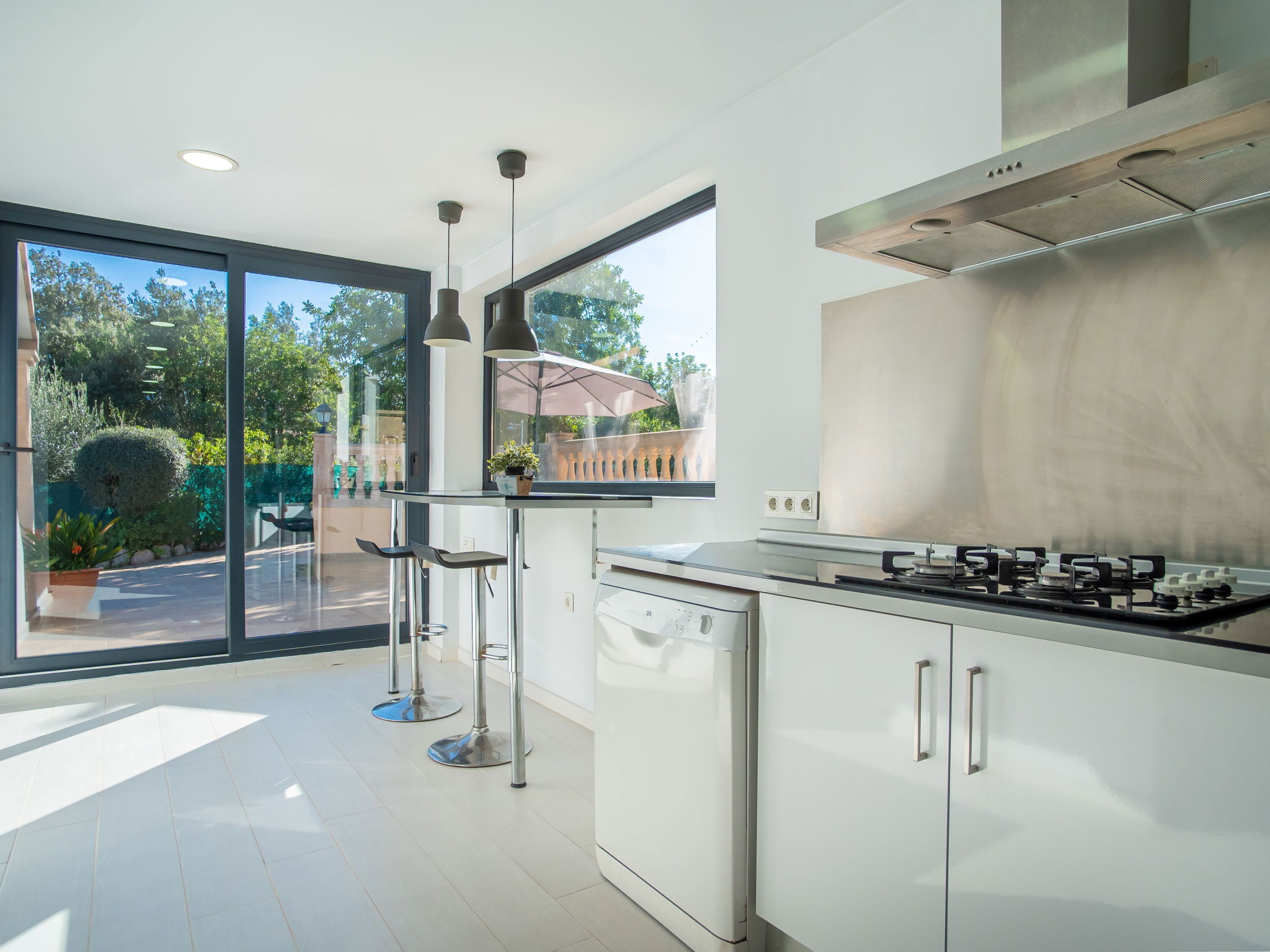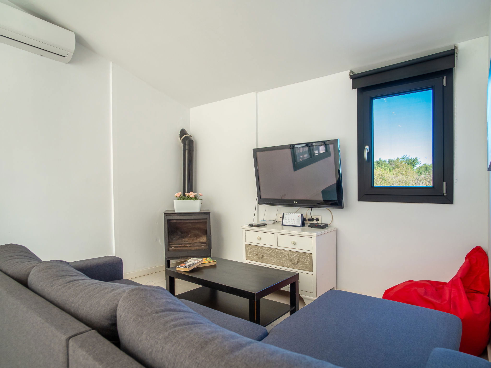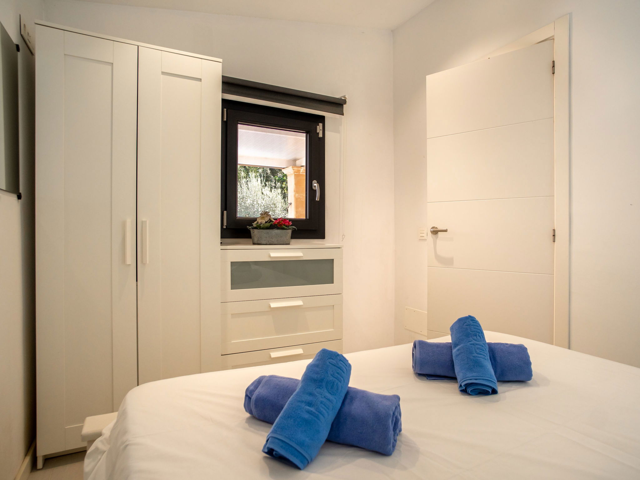 "Can Bernat", 3-room house 130 m2, lower ground floor. Object suitable for 4 adults. Renovated, comfortable and cosy furnishings: open large living/dining room with panoramic window with dining table, satellite TV, digital TV, flat screen, air conditioning and forced-air heating. Exit to the patio. 1 double bedroom with panoramic window with 1 french bed (150 cm, length 200 cm), air conditioning and forced-air heating. 1 double bedroom with panoramic window with 2 beds (90 cm), air conditioning and forced-air heating. Open kitchen (4 hot plates, oven, dishwasher, microwave, freezer, electric coffee machine) with air conditioning and forced-air heating. Exit to the patio, to the swimming pool. Bath/shower/WC. Large patio. Terrace furniture, barbecue, deck chairs. View of the countryside. Facilities: washing machine, dryer, iron, children's high chair, baby cot for up to 2 year olds, hair dryer. Internet (WiFi, free). Parking (fenced) at the house. The access to the bathroom has 4 steps. ETV/5852 // Reg. Nr.: ESFCTU00000702200026712500000000000000000000ETV/58526