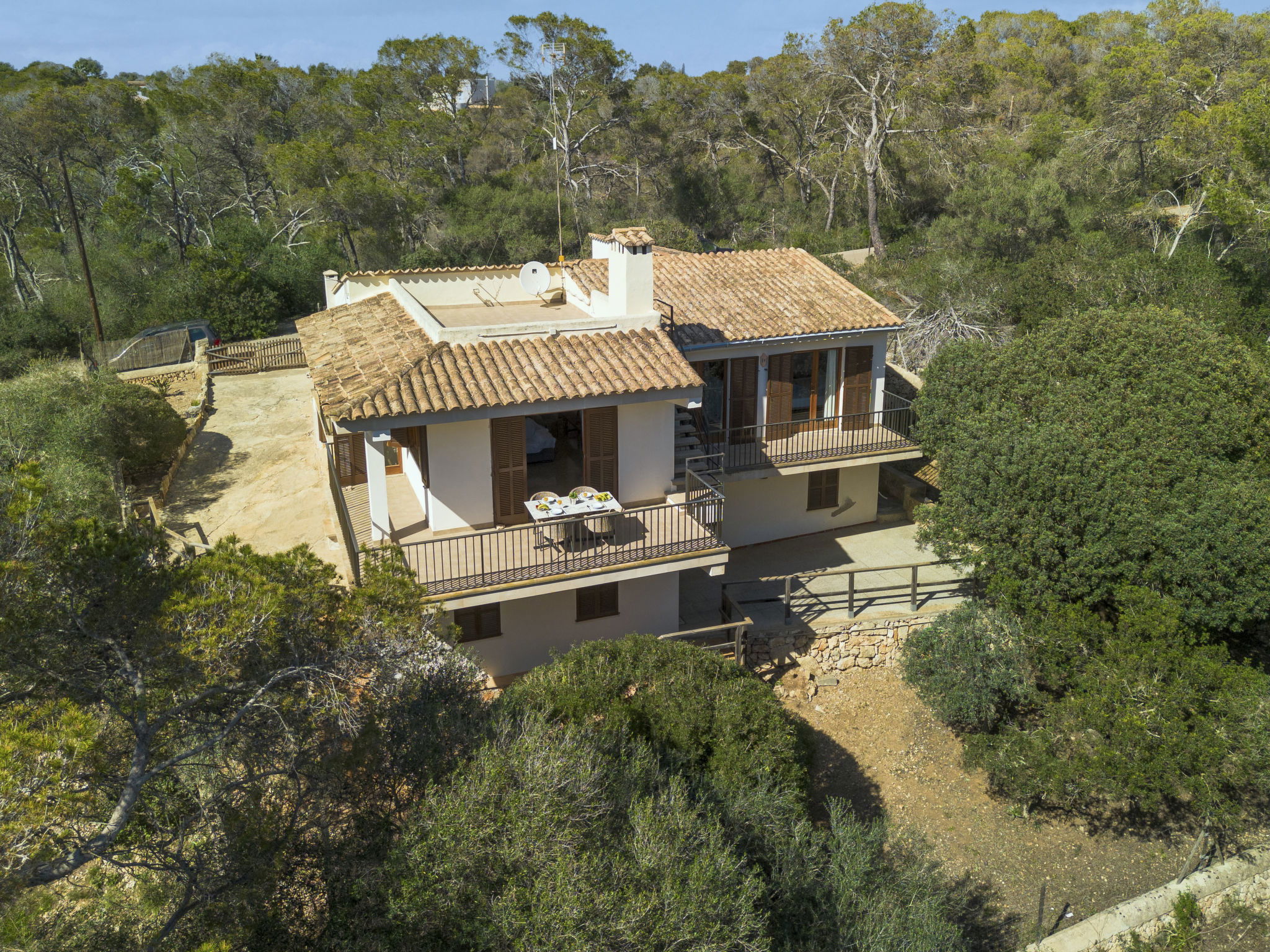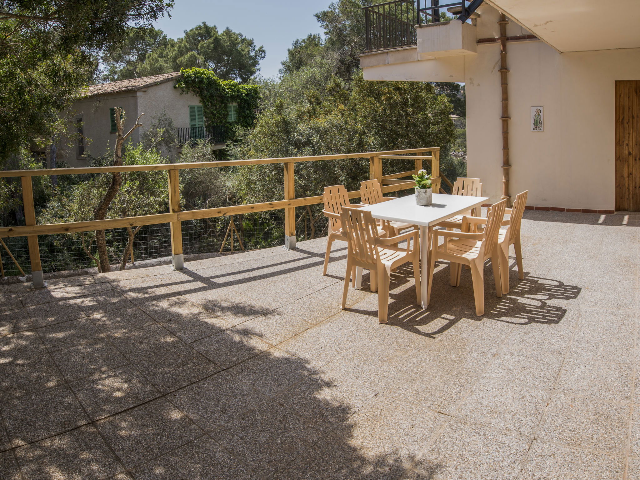 "Cas Padrins de Santanyi", 4-room villa 160 m2. Object suitable for 4 adults + 2 children. Bright, simple and practical furnishings: living/dining room with air conditioning and forced-air heating. Exit to the terrace. 2 double bedrooms, each room with 1 french bed (1 x 180 cm, length 200 cm), air conditioning and forced-air heating. 1 double bedroom with 2 beds (90 cm, length 200 cm), air conditioning and forced-air heating. Kitchen (oven, dishwasher, 4 ceramic glass hob hotplates, toaster, kettle, microwave, electric coffee machine). 2 baths/WC. Natural stone floors. Patio. Terrace furniture, barbecue, deck chairs, sitting area. Very beautiful view of the bay. Facilities: washing machine, iron, children's high chair, baby cot for up to 2 year olds, hair dryer. Internet (WiFi, free). Parking at the house. Suitable for families. ETV/8248 // Reg. Nr.: ESFCTU00000700800074732400000000000000000000ETV/82482
