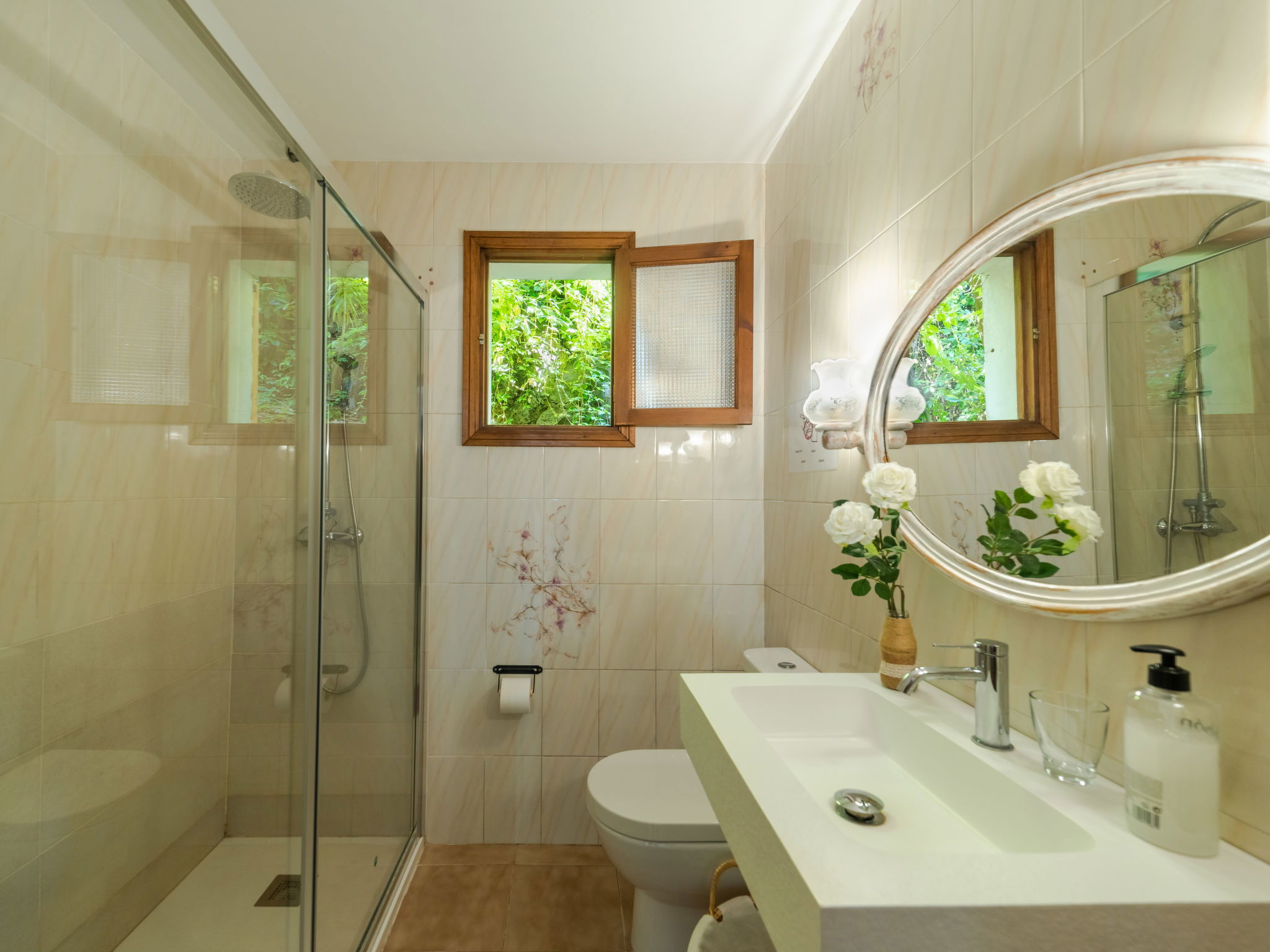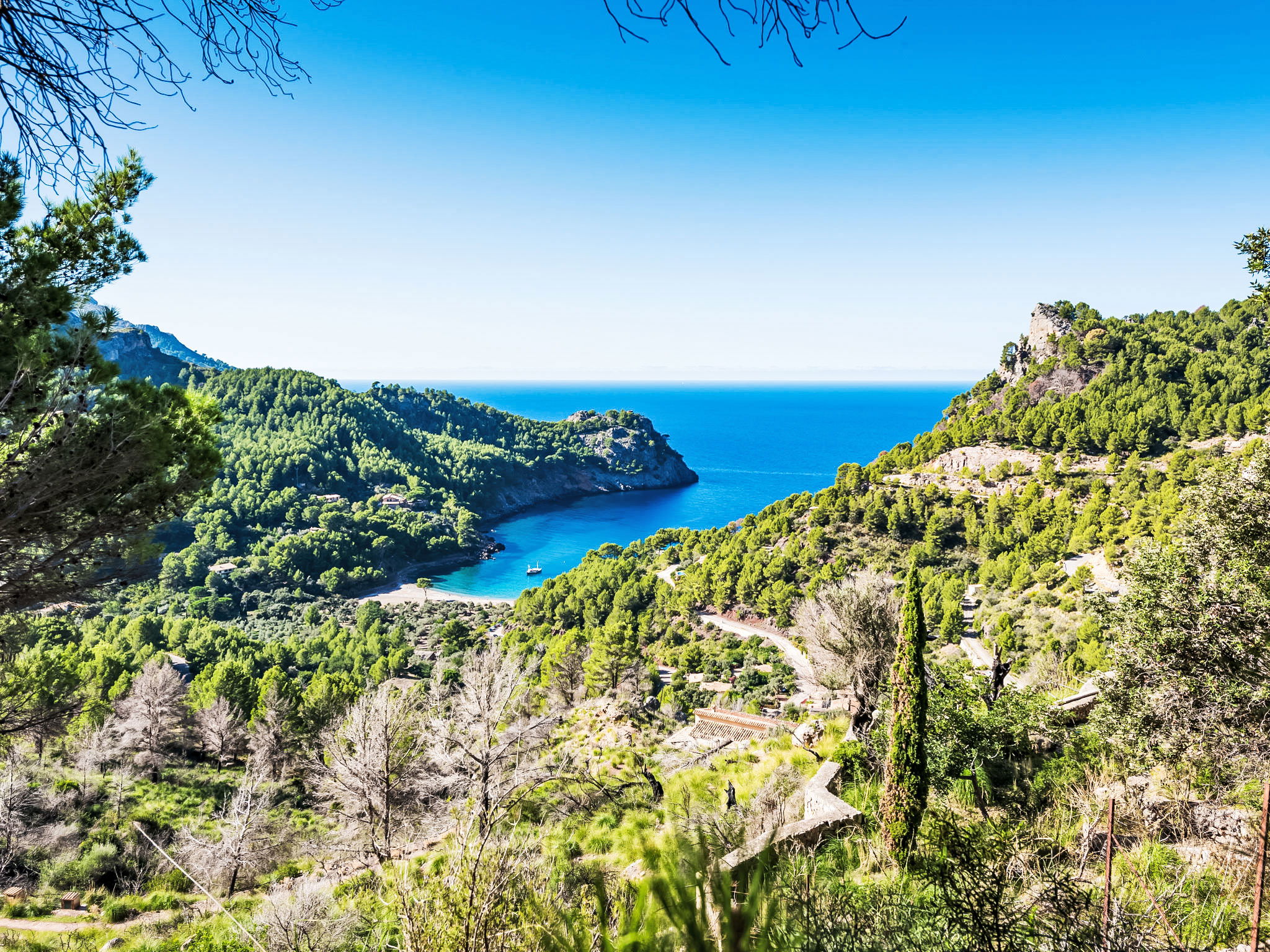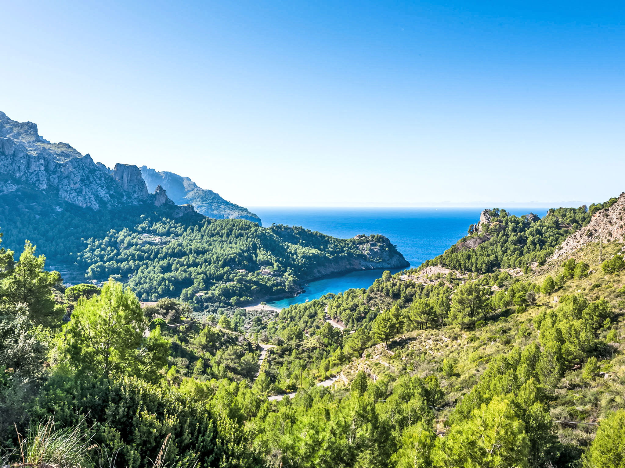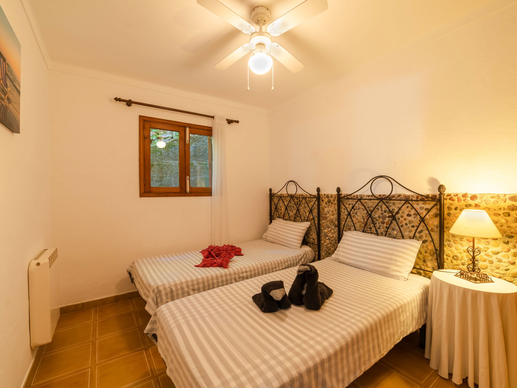 Cala Tuent 27 km from Lluc: Very cosy, rustic farm estate 2 storeys, detached, surrounded by trees and meadows. In the district of Cala Tuent, in a secluded, quiet, sunny position on top of a hill, 200 m from the sea, from the beach. Private: natural state property (fenced), natural garden (fenced). Patio, pergola, garden furniture, barbecue. In the house: internet access, WiFi, air conditioning, laundry, washing machine, tumble dryer. Steep, narrow motor access. Parking (for 2 cars) on the premises. Shop 26.9 km, grocery 26.9 km, supermarket 26.9 km, restaurant, bar 300 m, bakery 26.9 km, café, pub garden 300 m, bus stop "Lluc" 26 km, railway station "Soller" 40 km, shingle beach "Cala Tuent" 200 m. Walking paths from the house, cycle lane 100 m. Nearby attractions: Sa Calobra 6.4 km, Torrent de Pareis 7.6 km, Santuario de Lluc 26.1 km. Please note: car recommended. Suitable for families. Object suitable for 6 adults groups of teenagers on request only. Loading and unloading of baggage is possible at the holiday house. Animals in the neighbourhood. Main road close by. Airfield 75 km from the property.