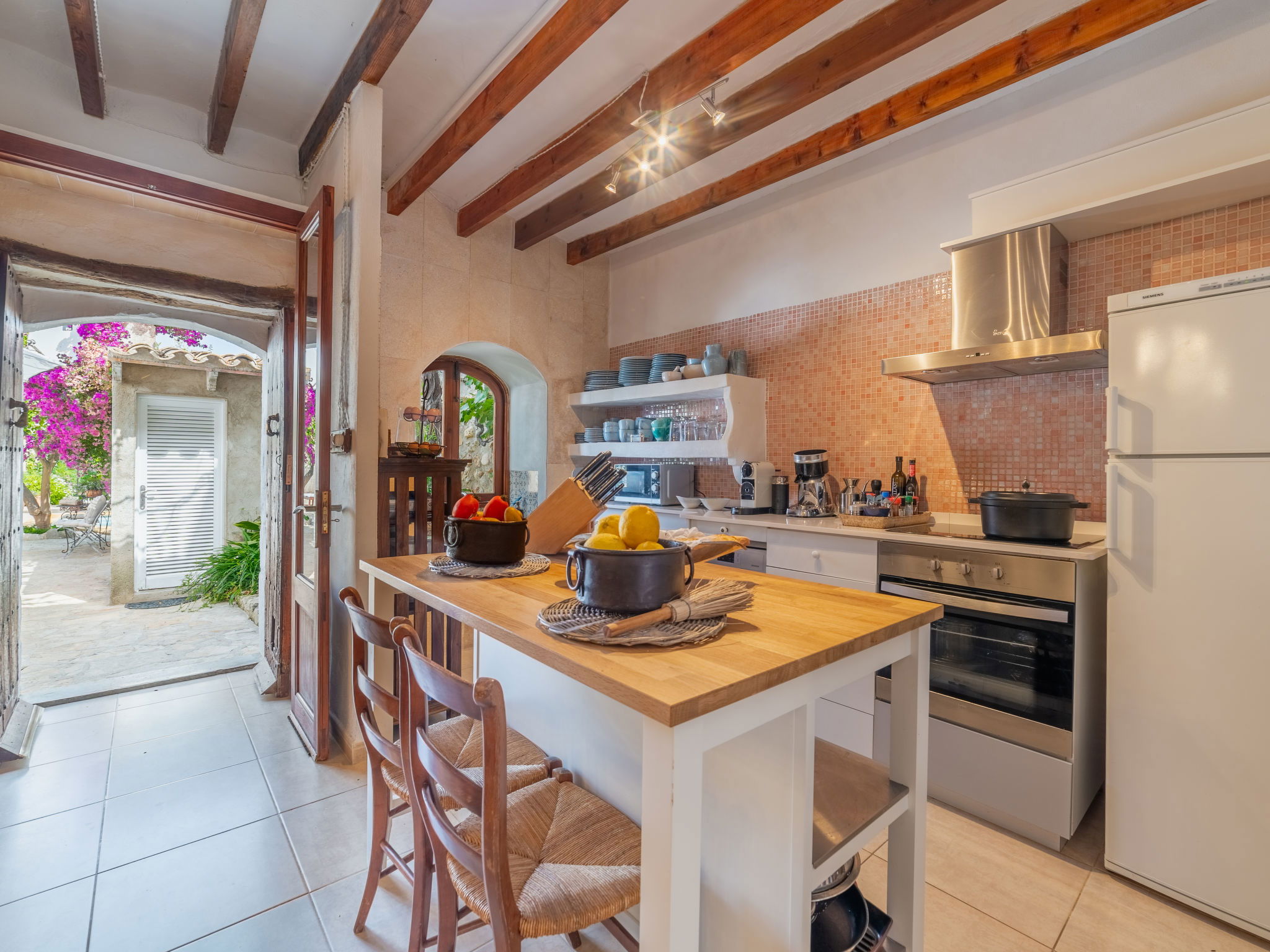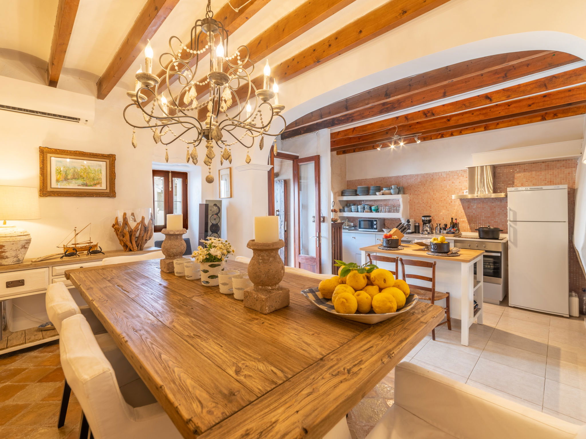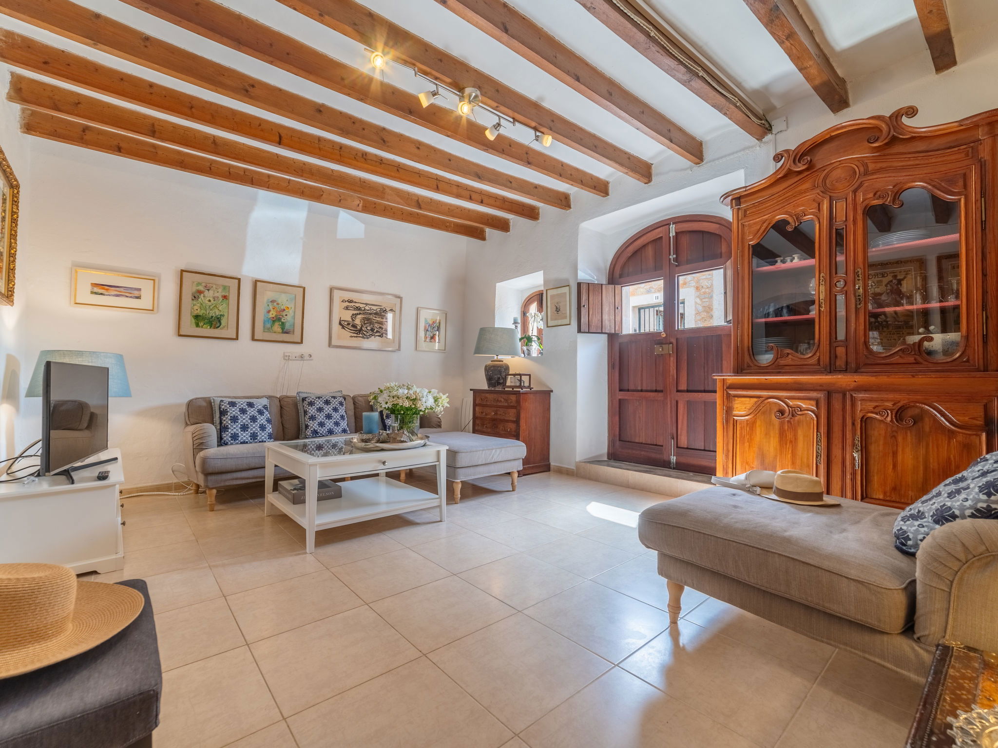 "Sa Teulera", 3-room terraced house 150 m2 on 2 levels. Object suitable for 6 adults. Partly with sloping ceilings, fully renovated, beautiful and tasteful furnishings: living room with TV and international TV channels. Dining room with open-hearth fireplace, dining table and air conditioning. Exit to the patio, to the swimming pool. Kitchen (oven, dishwasher, 3 ceramic glass hob hotplates, microwave, freezer, electric coffee machine, cooking island) with dining table. Exit to the patio, to the swimming pool. Upper floor: 1 double bedroom with 1 french bed, TV, air conditioning and forced-air heating. 1 double bedroom with 2 french beds, air conditioning and forced-air heating. Bath/shower. Natural stone floors. Comfortable furnishings in the country house style. Large patio. Terrace furniture, barbecue, deck chairs, sitting area. Partial of the swimming pool, the garden, the countryside and the resort. Facilities: washing machine, iron, children's high chair, baby cot for up to 2 year olds. Internet (WiFi, free). At the house. Suitable for families. Limited Wifi. Sometimes connection might be of low quality. The groundfloor bathroom is located on the terrace area. ETV12662 // Reg. Nr.: ESFCTU0000070220002601330000000000000000000ETV/126623