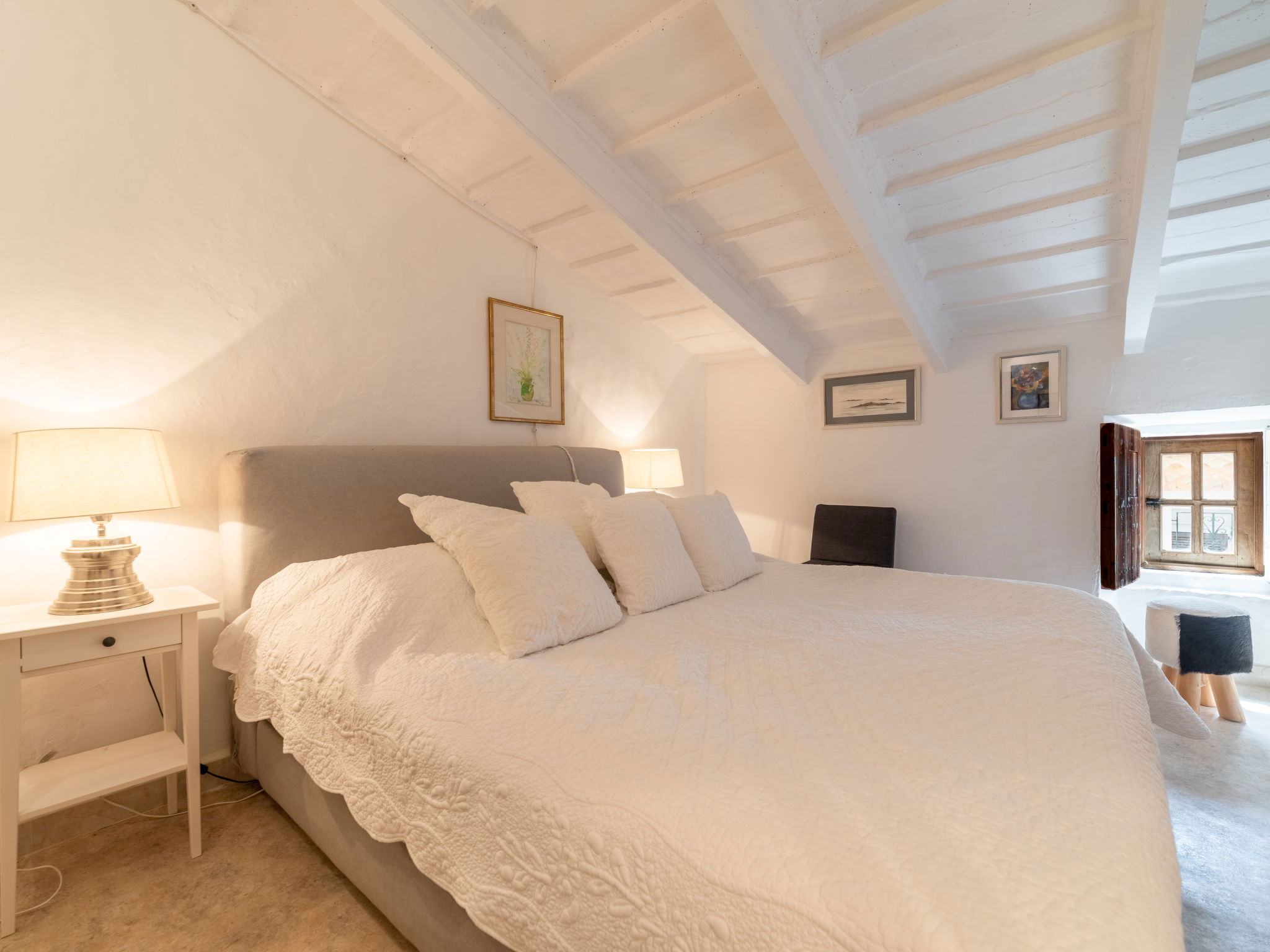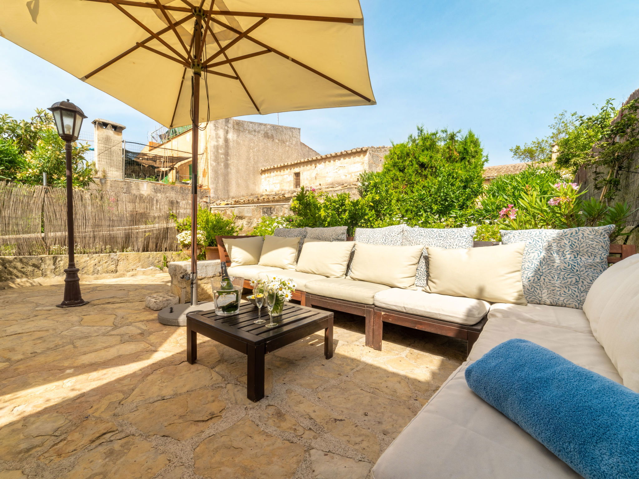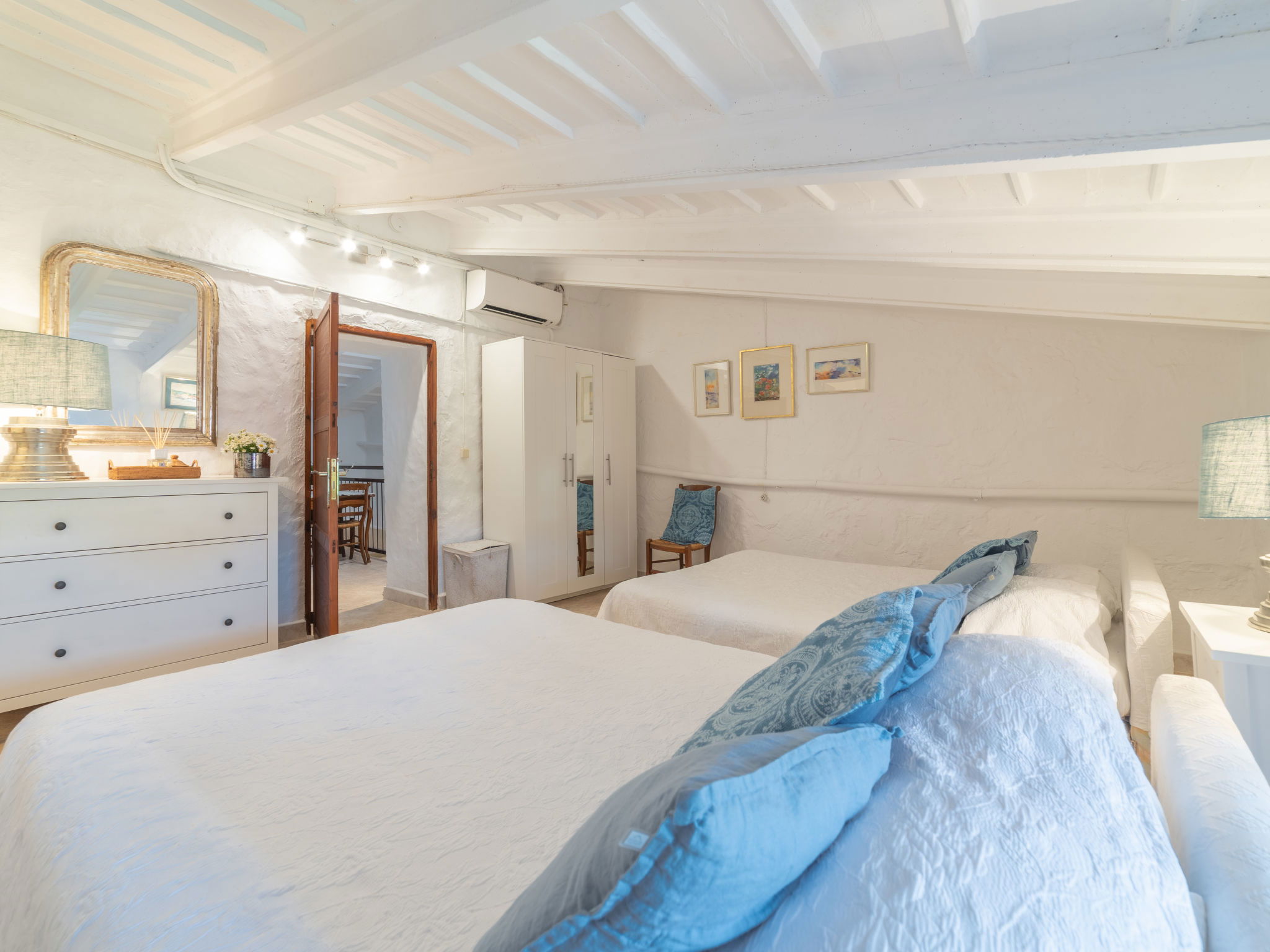 "Sa Teulera", 3-room terraced house 150 m2 on 2 levels. Object suitable for 6 adults. Partly with sloping ceilings, fully renovated, beautiful and tasteful furnishings: living room with TV and international TV channels. Dining room with open-hearth fireplace, dining table and air conditioning. Exit to the patio, to the swimming pool. Kitchen (oven, dishwasher, 3 ceramic glass hob hotplates, microwave, freezer, electric coffee machine, cooking island) with dining table. Exit to the patio, to the swimming pool. Upper floor: 1 double bedroom with 1 french bed, TV, air conditioning and forced-air heating. 1 double bedroom with 2 french beds, air conditioning and forced-air heating. Bath/shower. Natural stone floors. Comfortable furnishings in the country house style. Large patio. Terrace furniture, barbecue, deck chairs, sitting area. Partial of the swimming pool, the garden, the countryside and the resort. Facilities: washing machine, iron, children's high chair, baby cot for up to 2 year olds. Internet (WiFi, free). At the house. Suitable for families. Limited Wifi. Sometimes connection might be of low quality. The groundfloor bathroom is located on the terrace area. ETV12662 // Reg. Nr.: ESFCTU0000070220002601330000000000000000000ETV/126623