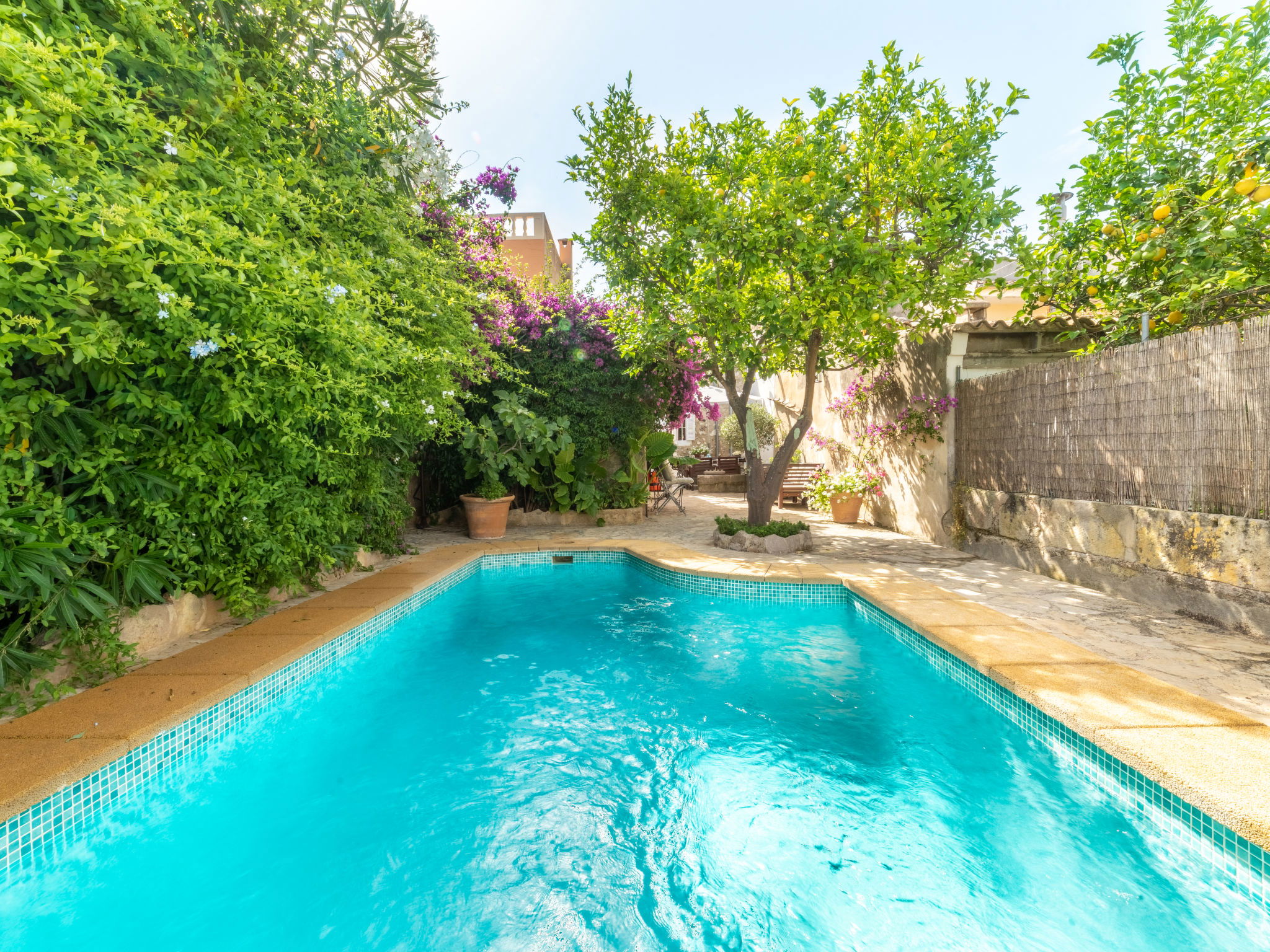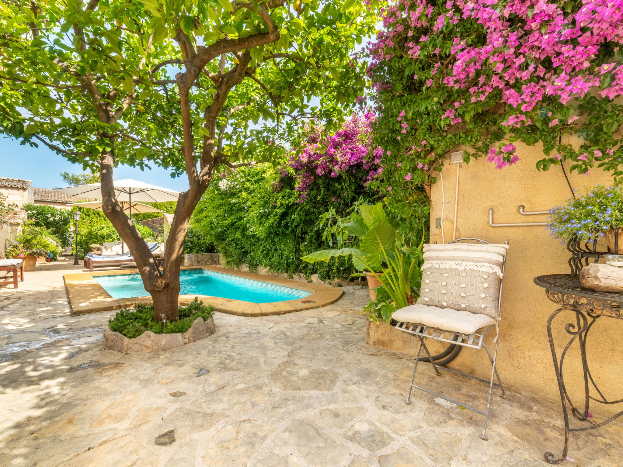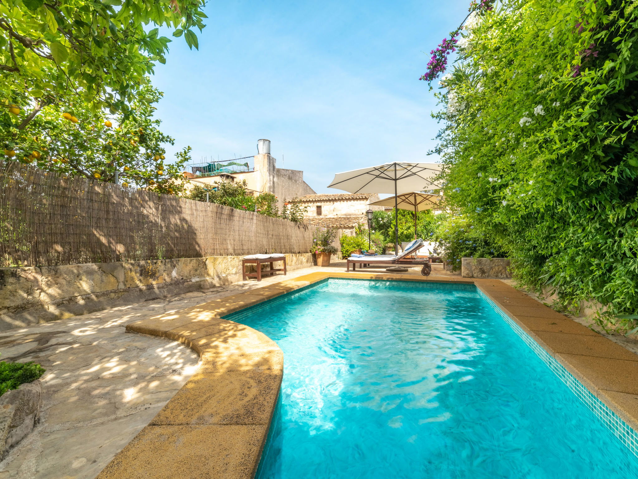 Campanet: Beautiful, rustic house "Sa Teulera", 2 storeys. In the resort, 1 km from the centre, in a quiet position, 17 km from the sea. Private: beautiful garden to relax, swimming pool angular (6 x 4 m, seasonal availability: 01.Mar. and 30.Nov.). Shower/WC in the pool area, patio (100 m2), garden furniture, barbecue. In the house: with TV, internet access, WiFi, air conditioning, washing machine, tumble dryer. Shop, grocery, supermarket, restaurant, bar, bakery, café, pedestrian zone 900 m, bicycle rental 5 km, pub garden 900 m, bus stop "Campanet" 1.5 km, sandy beach "Playa de Alcudia" 17 km pebble beach "Playa de Aucanada" 18 km, shingle beach "Playa de Aucanada" 18 km, rocky beach "Playa de Aucanada" 18 km. Sports harbour 15 km, marina 15 km, golf course (18 hole) 18 km, tennis 1 km, sports centre 1 km, cycle lane 500 m. Nearby attractions: Coves de Campanet 3 km, Fonts Ufanes 5 km, Sa Clasta Wine Tour. Please note: no lift. Suitable for families, suitable for seniors baby equipment on request. Object suitable for 6 adults groups of teenagers on request only. The owner does not accept any youth groups. Loading and unloading of baggage is possible at the holiday house. Airfield 45 km from the property.