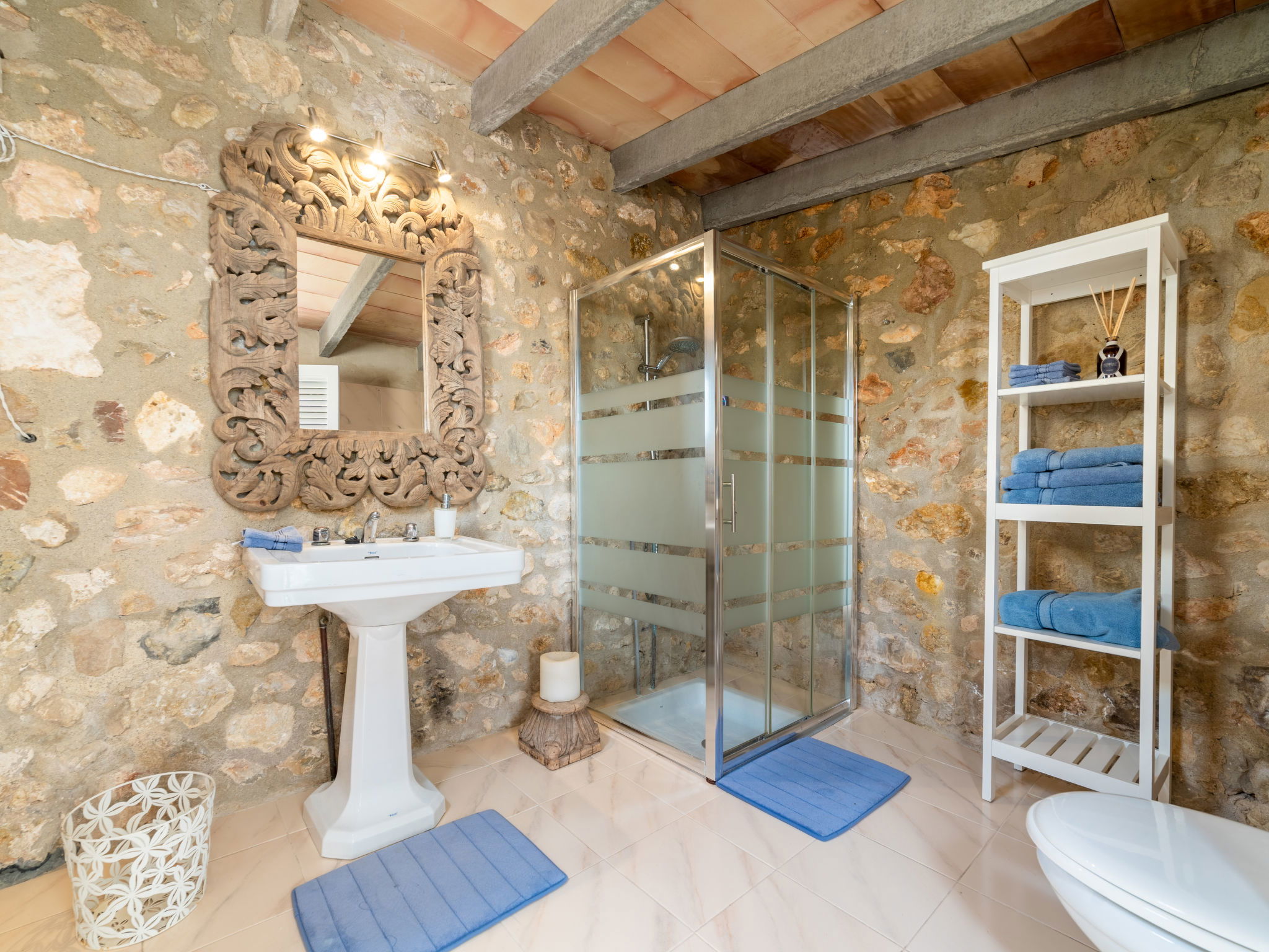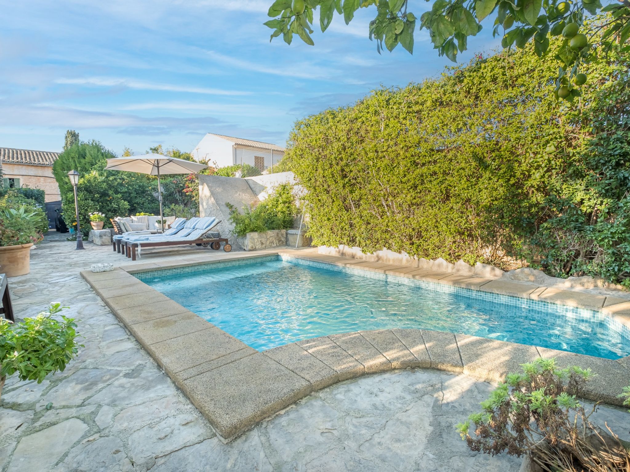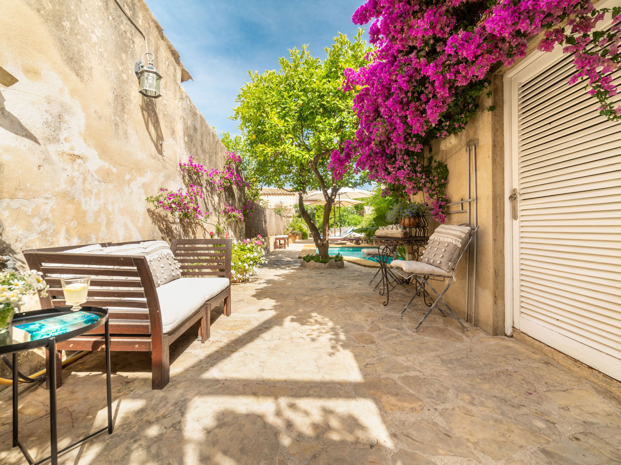 Campanet: Beautiful, rustic house "Sa Teulera", 2 storeys. In the resort, 1 km from the centre, in a quiet position, 17 km from the sea. Private: beautiful garden to relax, swimming pool angular (6 x 4 m, seasonal availability: 01.Mar. and 30.Nov.). Shower/WC in the pool area, patio (100 m2), garden furniture, barbecue. In the house: with TV, internet access, WiFi, air conditioning, washing machine, tumble dryer. Shop, grocery, supermarket, restaurant, bar, bakery, café, pedestrian zone 900 m, bicycle rental 5 km, pub garden 900 m, bus stop "Campanet" 1.5 km, sandy beach "Playa de Alcudia" 17 km pebble beach "Playa de Aucanada" 18 km, shingle beach "Playa de Aucanada" 18 km, rocky beach "Playa de Aucanada" 18 km. Sports harbour 15 km, marina 15 km, golf course (18 hole) 18 km, tennis 1 km, sports centre 1 km, cycle lane 500 m. Nearby attractions: Coves de Campanet 3 km, Fonts Ufanes 5 km, Sa Clasta Wine Tour. Please note: no lift. Suitable for families, suitable for seniors baby equipment on request. Object suitable for 6 adults groups of teenagers on request only. The owner does not accept any youth groups. Loading and unloading of baggage is possible at the holiday house. Airfield 45 km from the property.