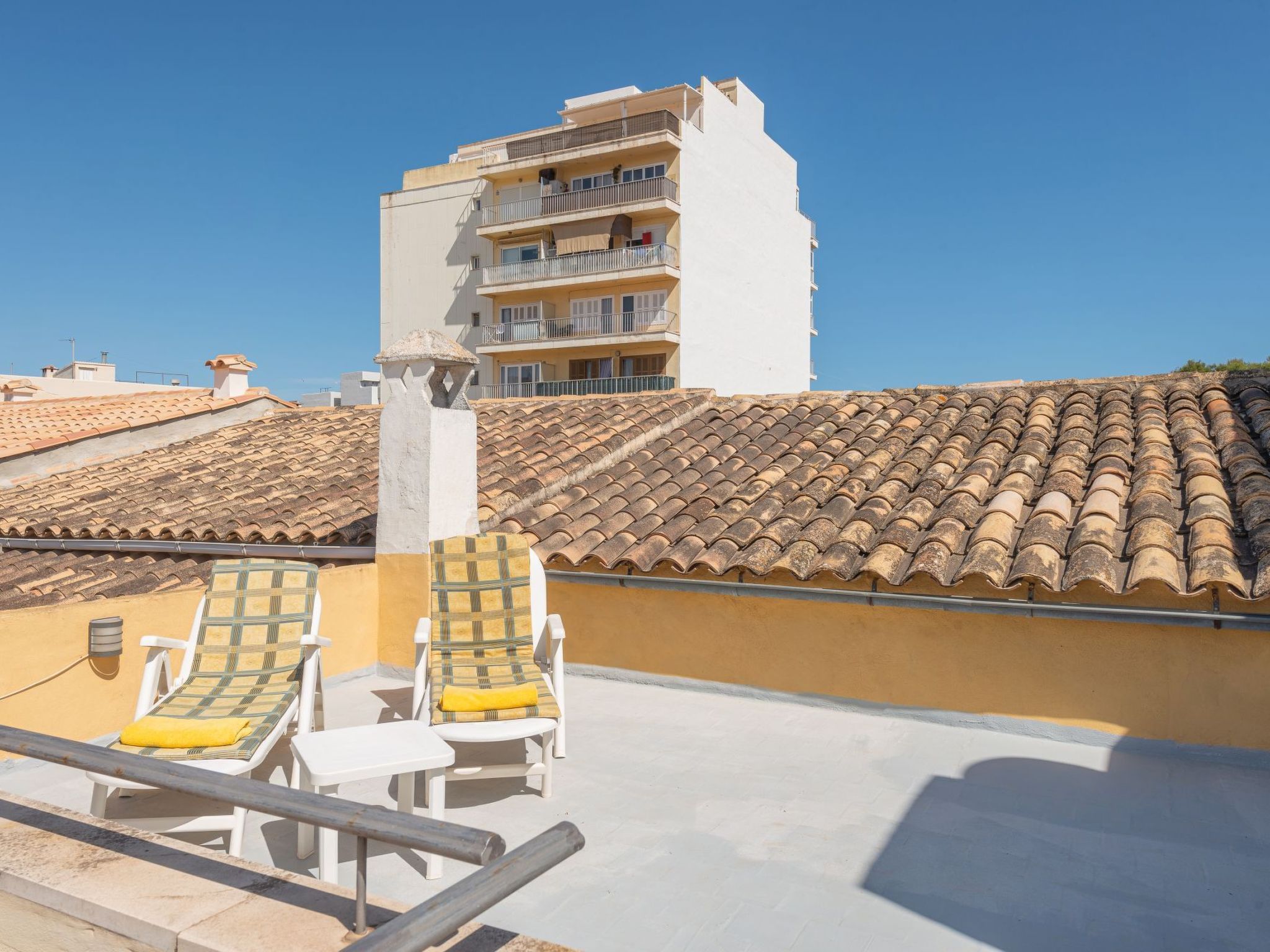 Step outside to discover a lovely inner courtyard, an iconic feature of Mallorcan homes, offering an intimate outdoor bathroom and a separate laundry area. Ascend from the courtyard to the private roof terrace, where sun loungers await to offer you moments of relaxation under the Mediterranean sun. This space is perfect for enjoying privacy and open air, embodying the essence of laid-back island living.