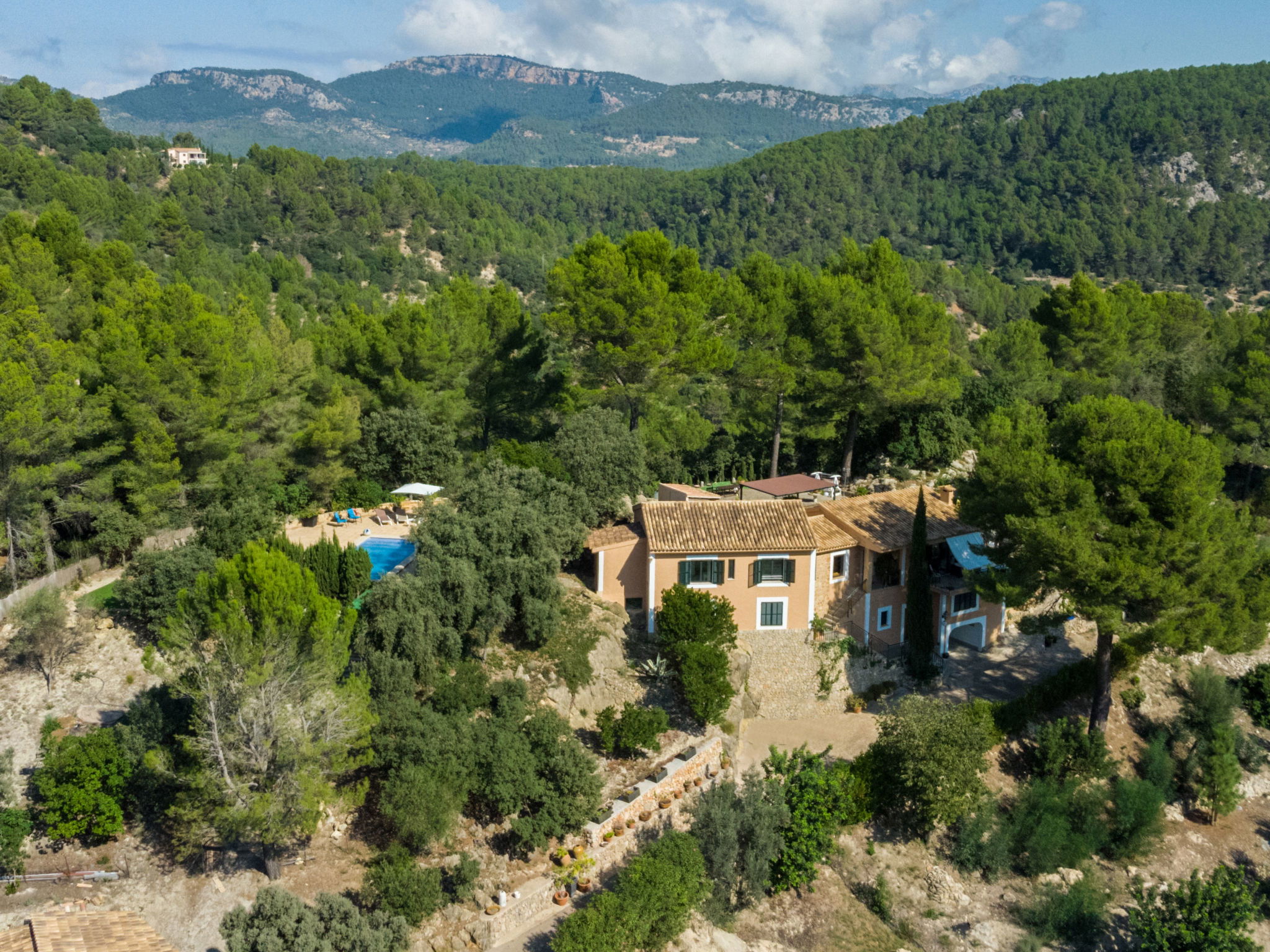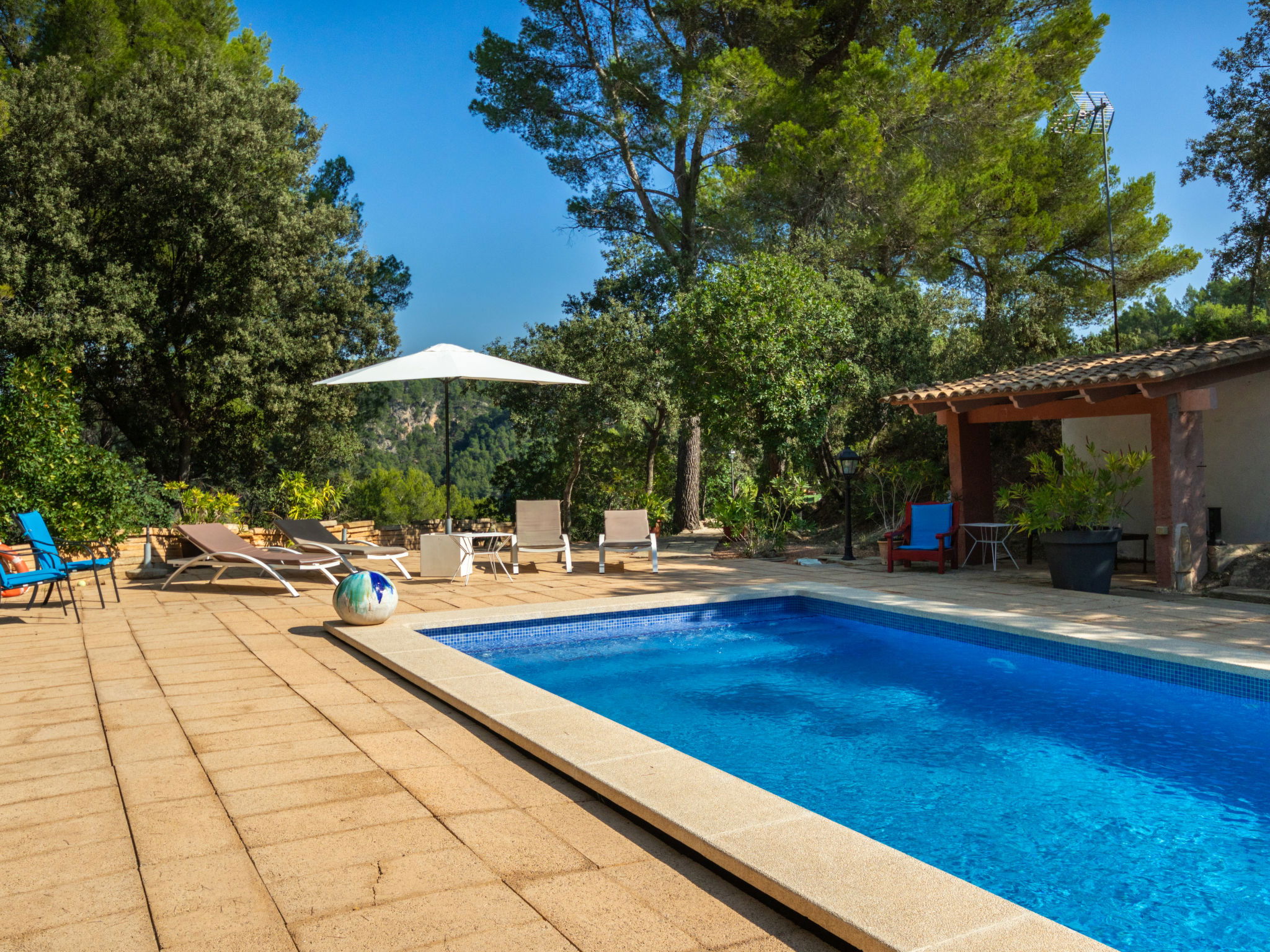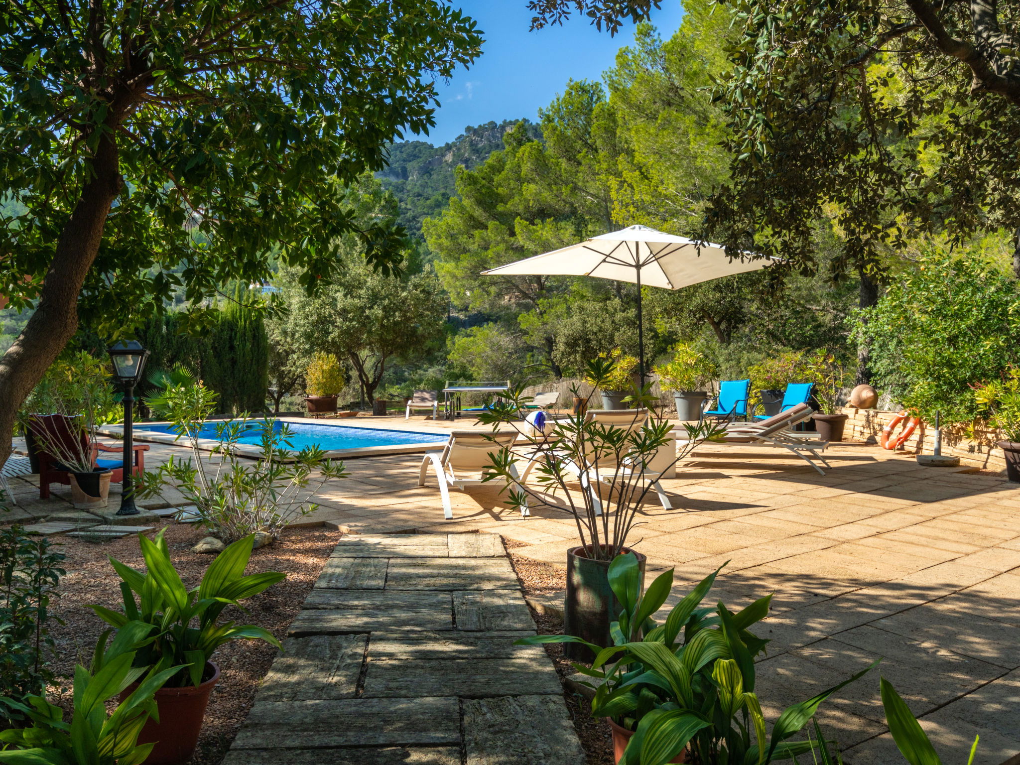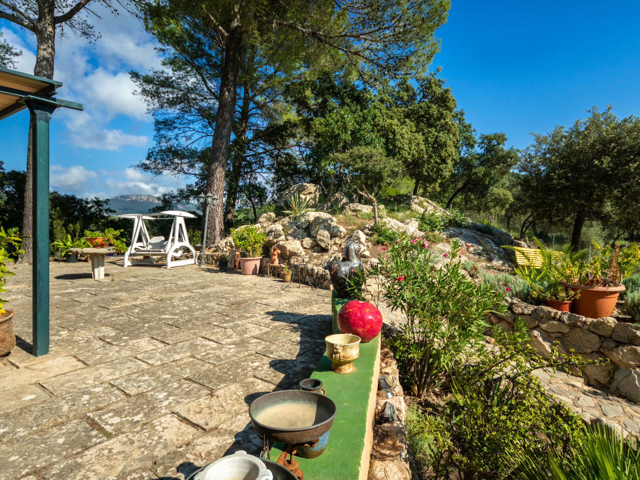 Farm estate "Short des Verger", detached. Above Esporles 3.5 km from the centre of Esporles, 19 km from the centre of Valldemossa, 26 km from the centre of Palma, on a slope, 13 km from the sea. Private: property 15'000 m2, garden (not fenced) wildlife garden and trees, natural garden, swimming pool (10 x 4 m, seasonal availability: 01.Jan. - 31.Dec.) with salt-electrolysis pool-cleaning system. Outdoor shower, table tennis. In the house: central heating system, air conditioning. Parking on the premises. Shop 4.5 km, restaurant 4.5 km, bus stop "S'esgleita" 6 km, sandy beach "Playa de Palma" 28 km pebble beach "Port de's Canonge" 13 km. Hiking paths: Camí des Correu 4.5 km. Please note: car recommended.