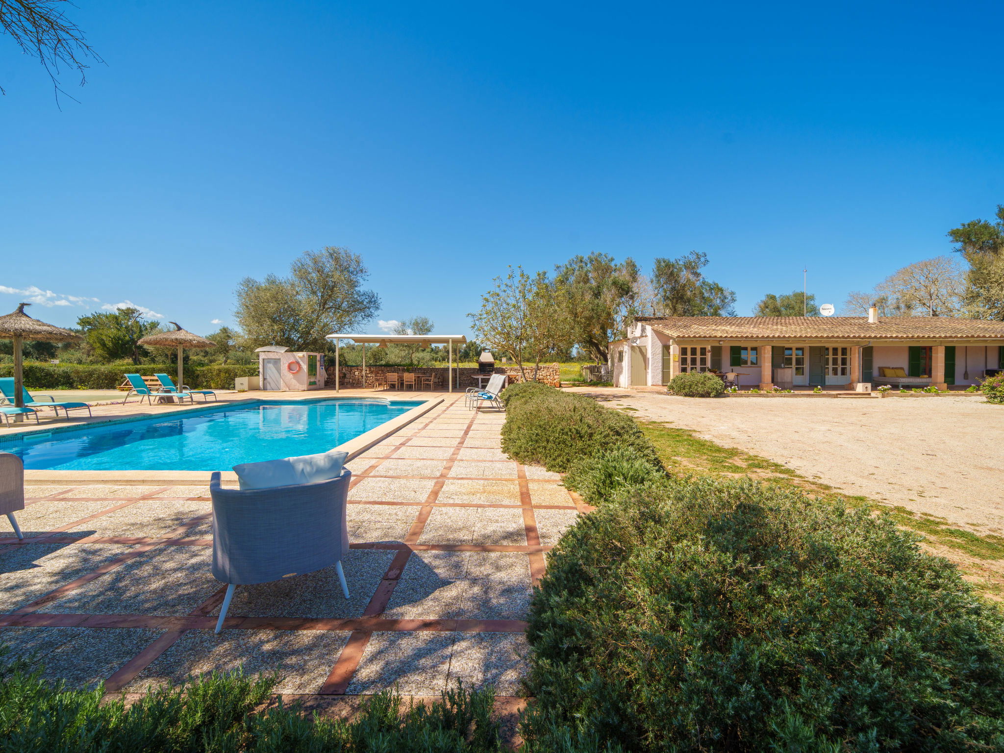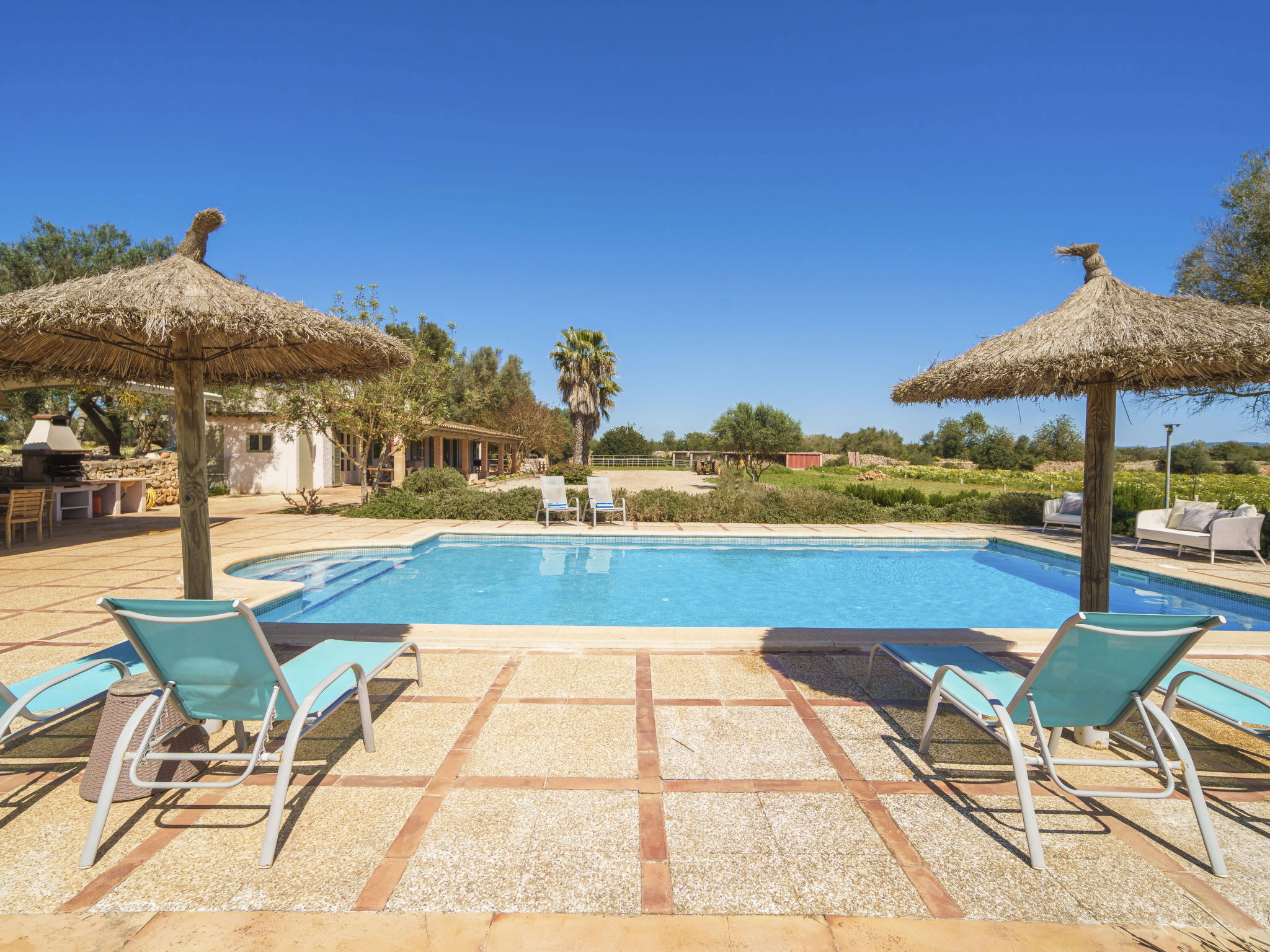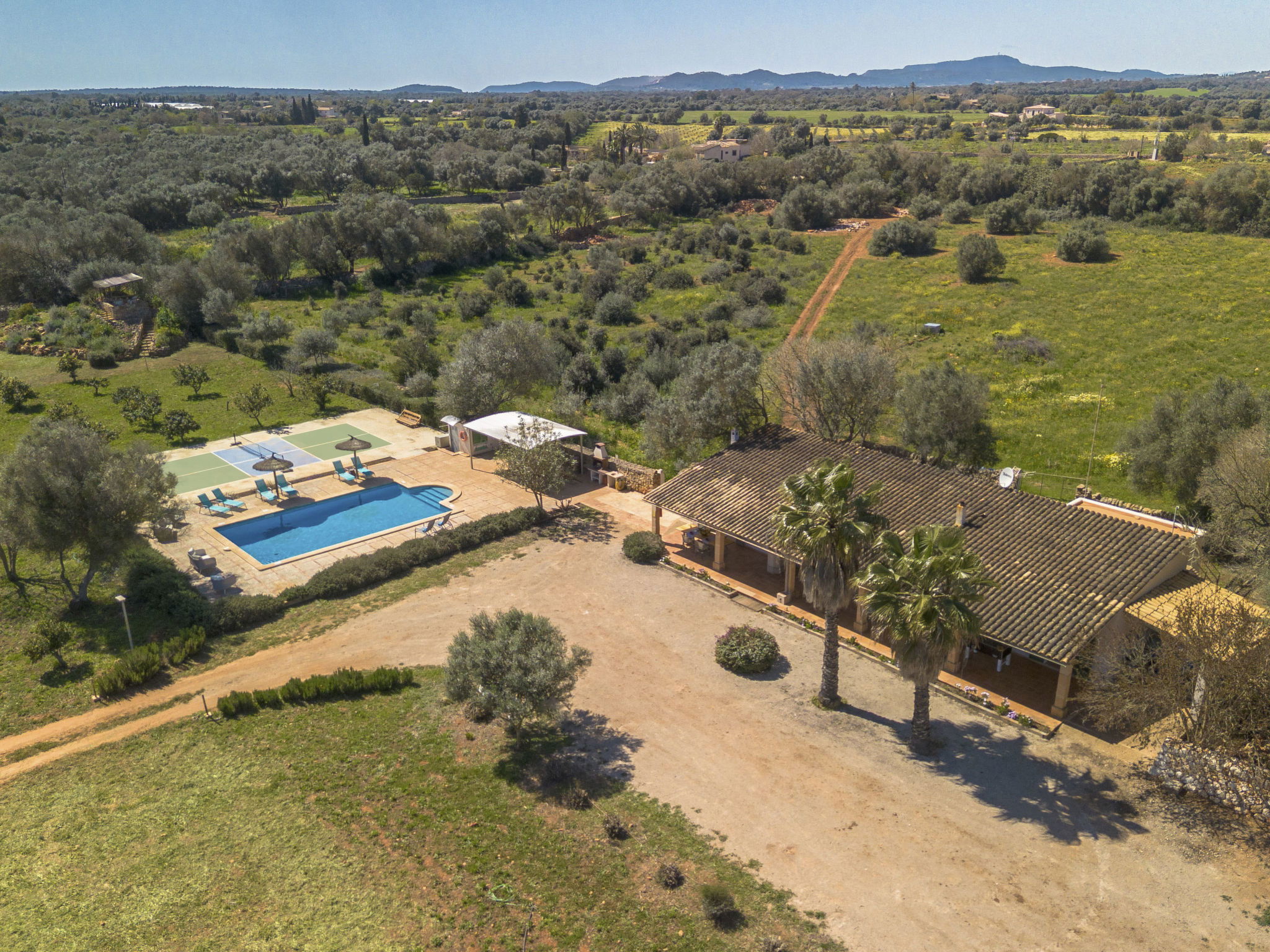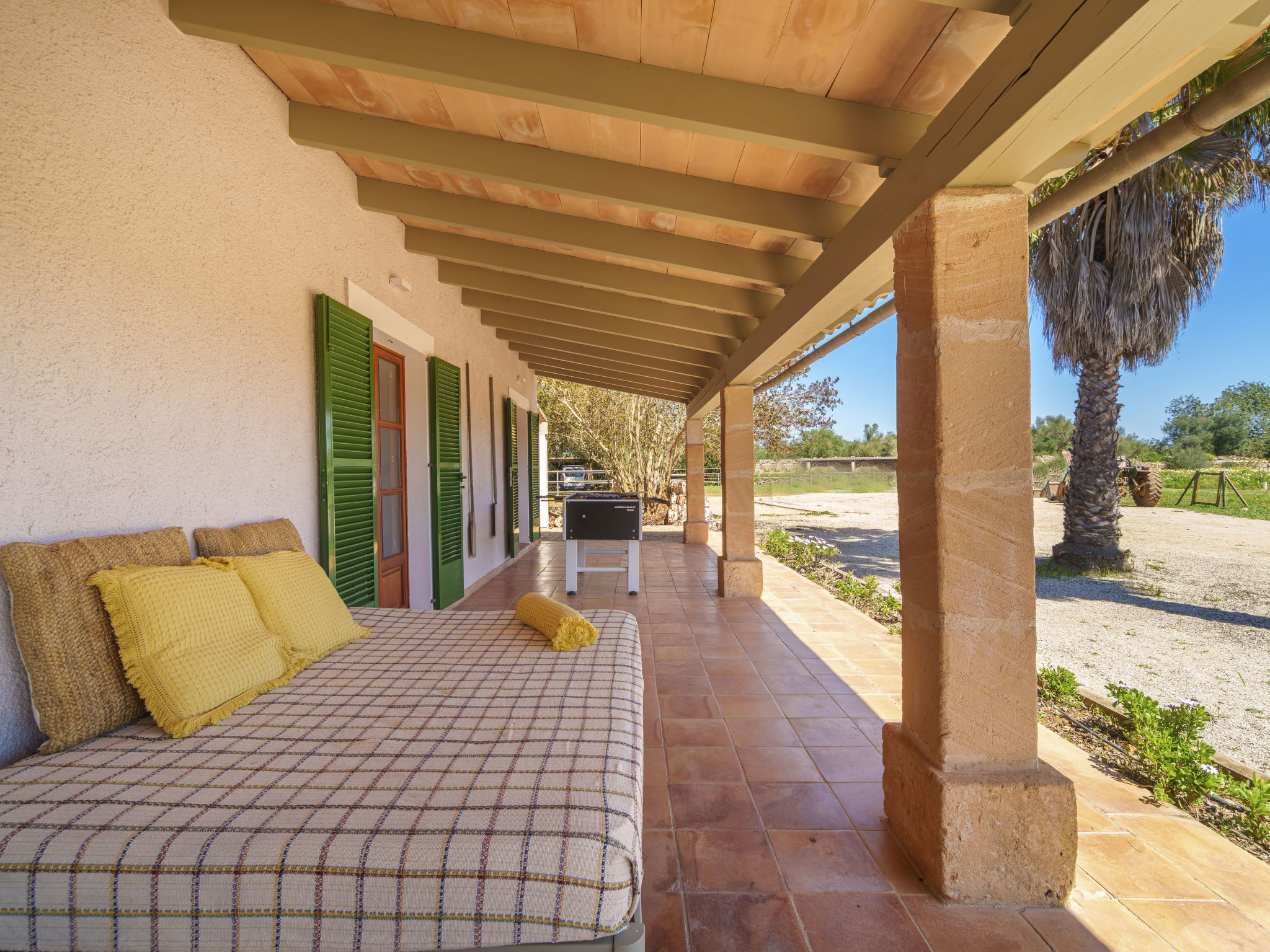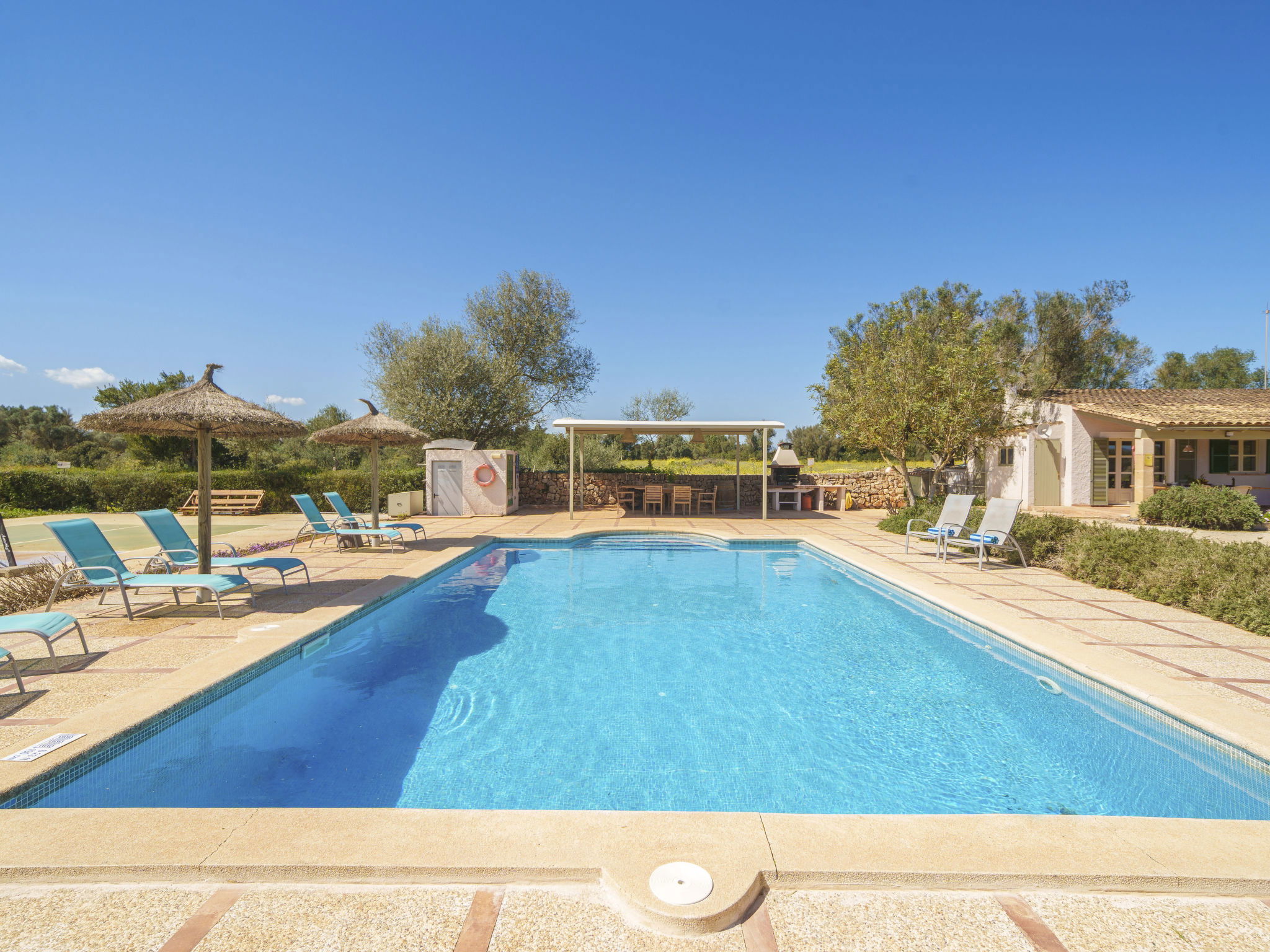 Son Artigues 3 km from Felanitx: Beautiful, comfortable farm estate "Can Soler", detached, surrounded by trees and fields. 5 km from the centre of Felanitx, 8 km from the centre of Porreres, 55 km from the centre of Palma, 2 km from the edge of the forest, 21 km from the sea, 22 km from the beach, in the countryside. Private: natural state property 15'000 m2 (fenced), orchard, swimming pool (9 x 5 m, seasonal availability: 01.Jan. - 31.Dec.). Shower/WC in the pool area, table tennis, boules, badminton, pool maintenance by the owner/gardener. In the house: table football, central heating system, air conditioning, heating to be paid on the spot, heating available only from 01.Nov. - 30.Apr.. 600 m long motor access to the house (via unmade road). Roofed, parking on the premises. Shop 5 km, grocery 5 km, supermarket 7 km, shopping centre 20 km, restaurant 8 km, bakery 5 km, café 6 km, bus stop "Felanitx" 5 km, railway station "Manacor" 19 km, sandy beach "Cala d'Or / Porto Colom" 20 km. Sports harbour 20 km, marina 20 km, golf course (18 hole) 17 km, surf school 22 km, sailing school 22 km, tennis 20 km, riding stable 8 km, sports centre 5 km, walking paths from the house 3 km. Nearby attractions: Rafa Nadal Tennis Academy 19 km, Cuevas del Drach 30 km, Cala Varques 15 km, Sant Salvador 11 km. Please note: car recommended. Suitable for families, suitable for seniors. Object suitable for 6 adults. The owner does not accept any groups. The owner does not accept any youth groups. Airfield 40 km from the property.