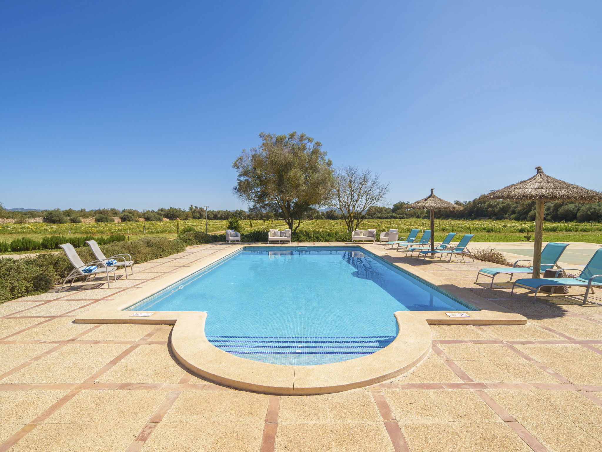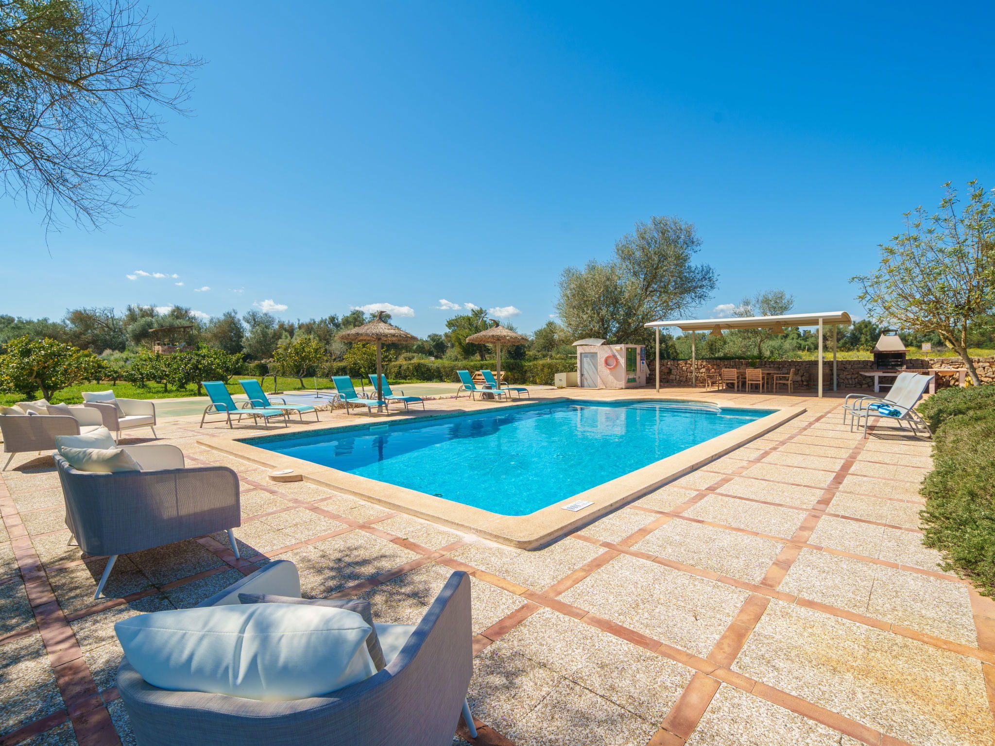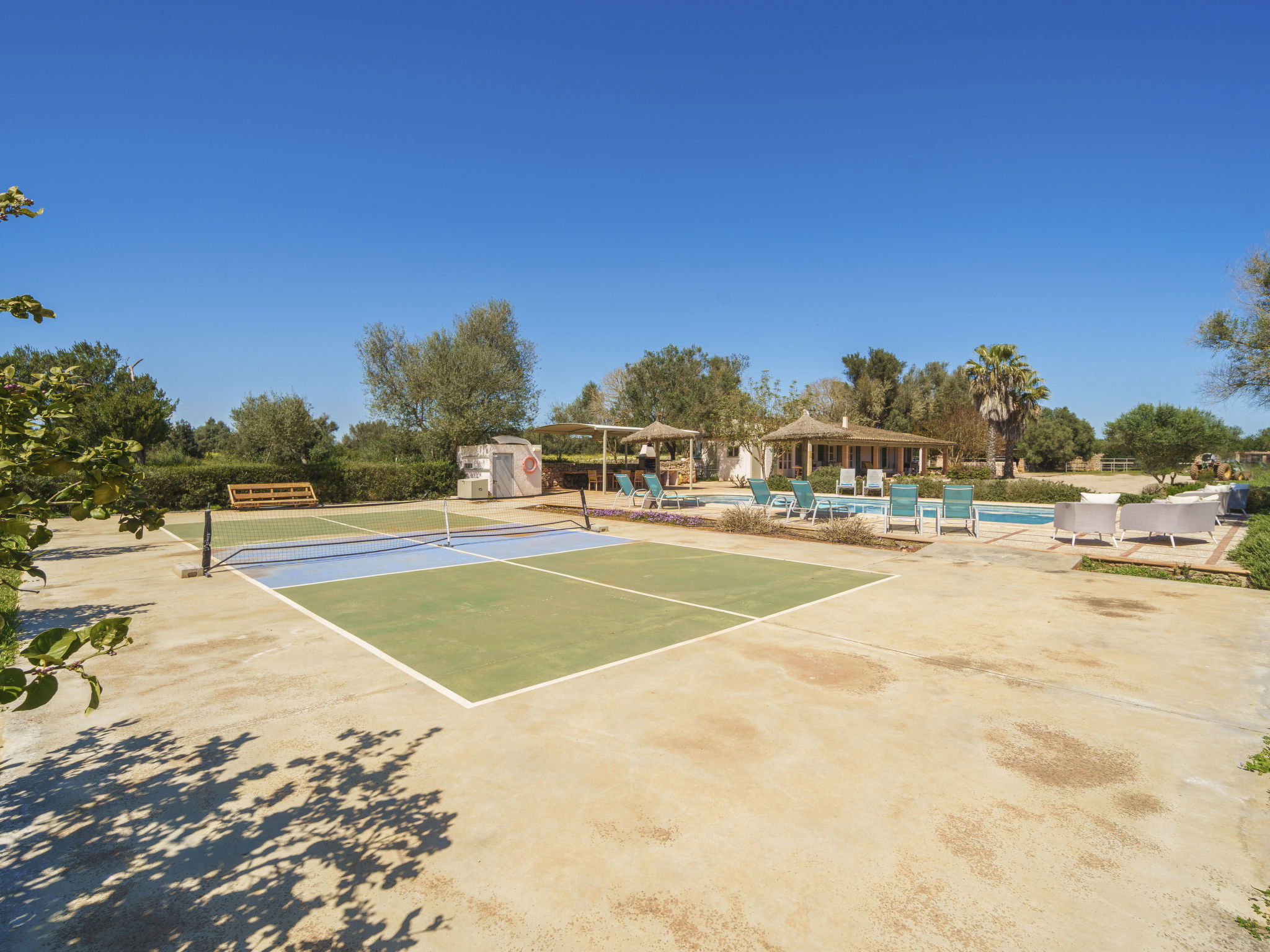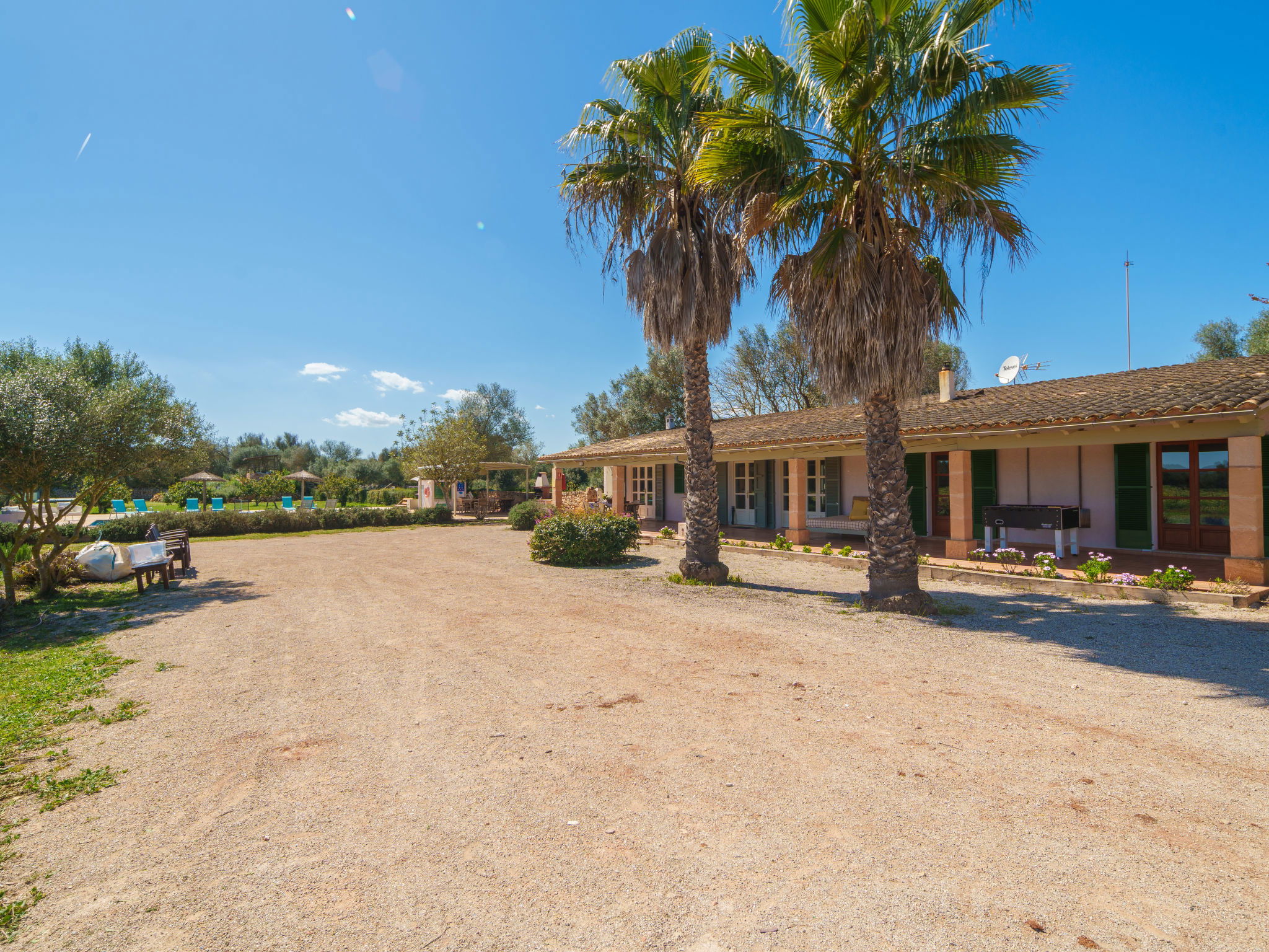 Son Artigues 3 km from Felanitx: Beautiful, comfortable farm estate "Can Soler", detached, surrounded by trees and fields. 5 km from the centre of Felanitx, 8 km from the centre of Porreres, 55 km from the centre of Palma, 2 km from the edge of the forest, 21 km from the sea, 22 km from the beach, in the countryside. Private: natural state property 15'000 m2 (fenced), orchard, swimming pool (9 x 5 m, seasonal availability: 01.Jan. - 31.Dec.). Shower/WC in the pool area, table tennis, boules, badminton, pool maintenance by the owner/gardener. In the house: table football, central heating system, air conditioning, heating to be paid on the spot, heating available only from 01.Nov. - 30.Apr.. 600 m long motor access to the house (via unmade road). Roofed, parking on the premises. Shop 5 km, grocery 5 km, supermarket 7 km, shopping centre 20 km, restaurant 8 km, bakery 5 km, café 6 km, bus stop "Felanitx" 5 km, railway station "Manacor" 19 km, sandy beach "Cala d'Or / Porto Colom" 20 km. Sports harbour 20 km, marina 20 km, golf course (18 hole) 17 km, surf school 22 km, sailing school 22 km, tennis 20 km, riding stable 8 km, sports centre 5 km, walking paths from the house 3 km. Nearby attractions: Rafa Nadal Tennis Academy 19 km, Cuevas del Drach 30 km, Cala Varques 15 km, Sant Salvador 11 km. Please note: car recommended. Suitable for families, suitable for seniors. Object suitable for 6 adults. The owner does not accept any groups. The owner does not accept any youth groups. Airfield 40 km from the property.