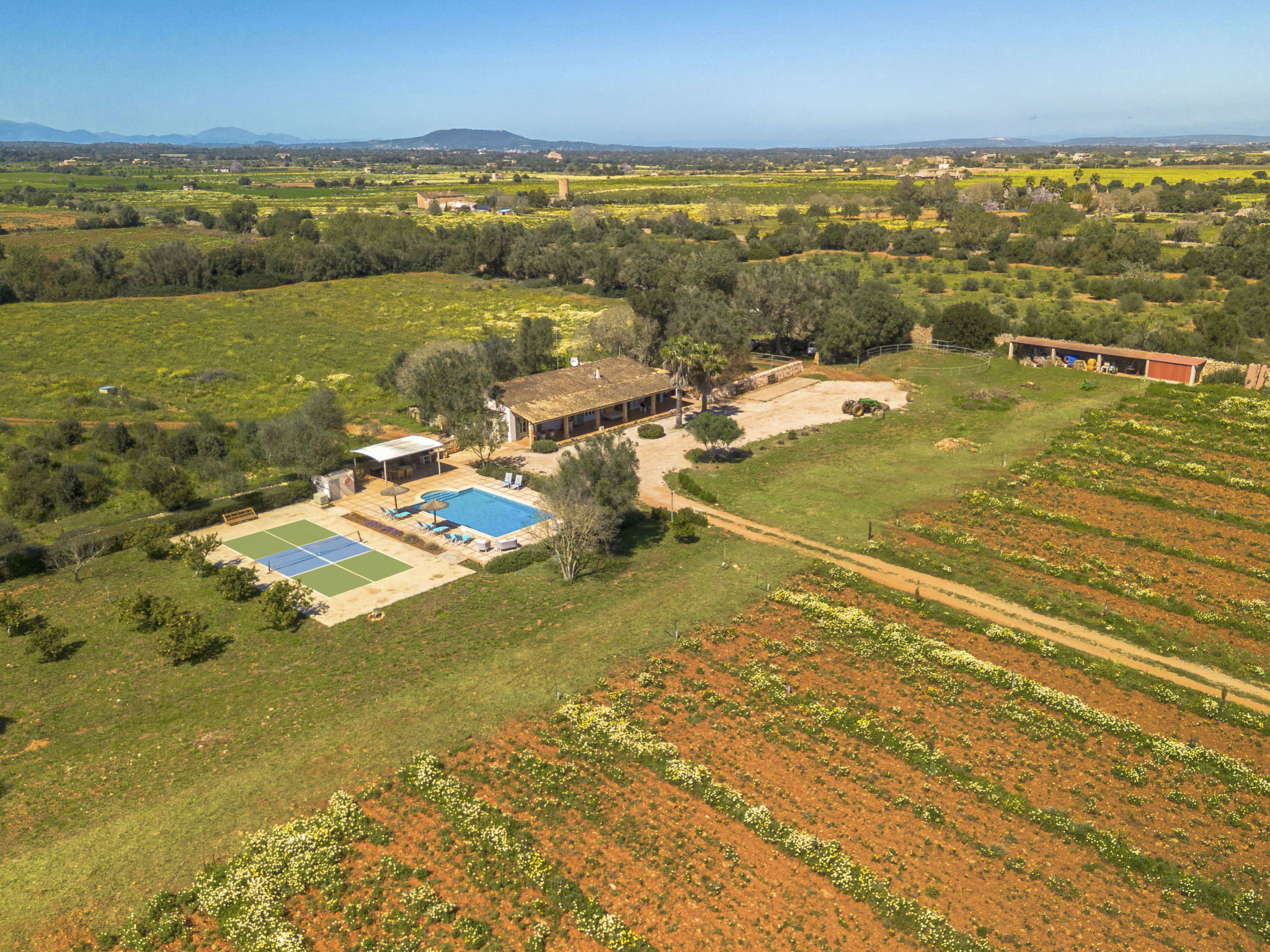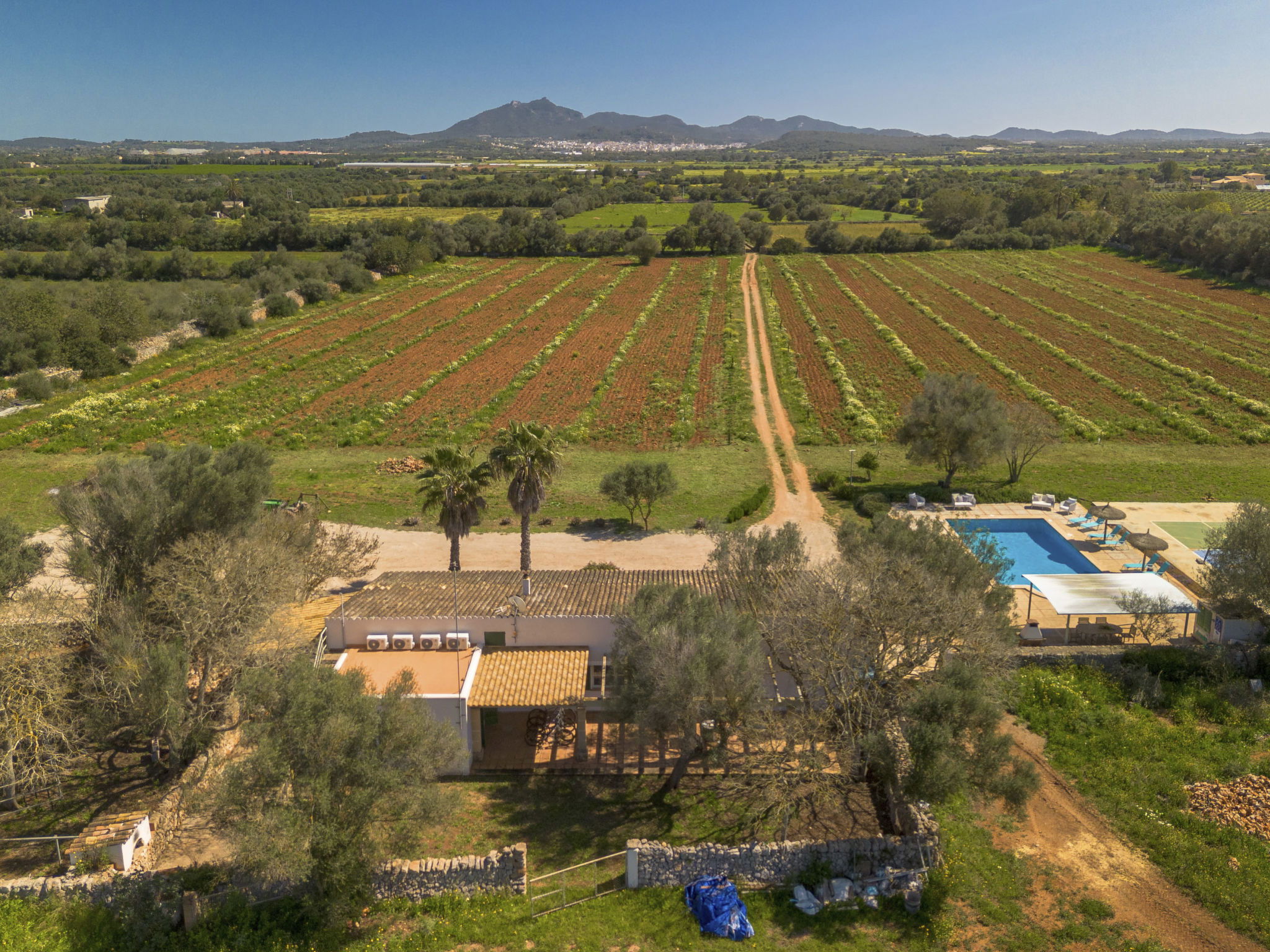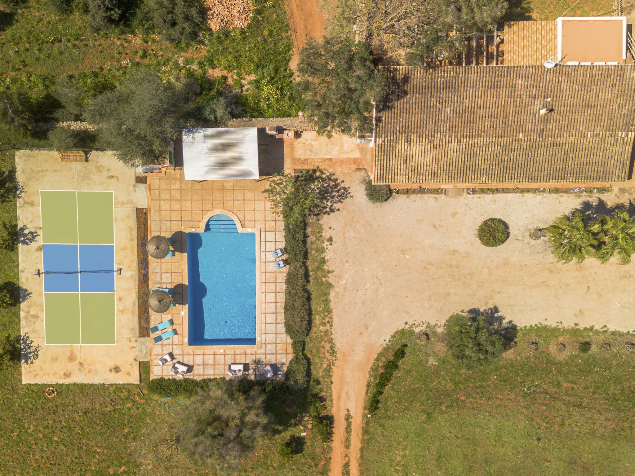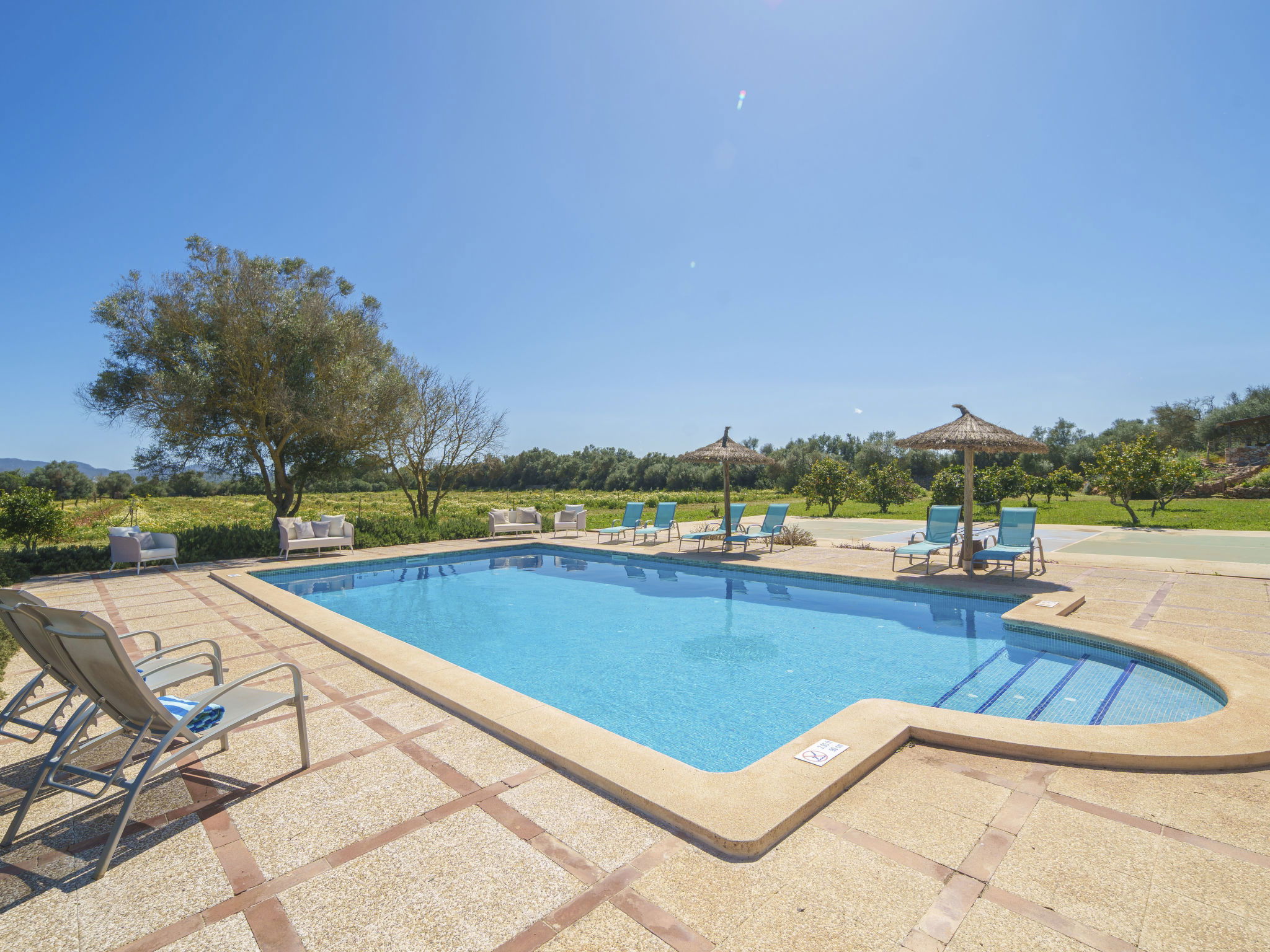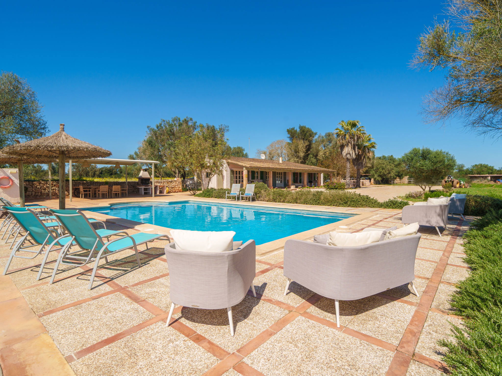 Son Artigues 3 km from Felanitx: Beautiful, comfortable farm estate "Can Soler", detached, surrounded by trees and fields. 5 km from the centre of Felanitx, 8 km from the centre of Porreres, 55 km from the centre of Palma, 2 km from the edge of the forest, 21 km from the sea, 22 km from the beach, in the countryside. Private: natural state property 15'000 m2 (fenced), orchard, swimming pool (9 x 5 m, seasonal availability: 01.Jan. - 31.Dec.). Shower/WC in the pool area, table tennis, boules, badminton, pool maintenance by the owner/gardener. In the house: table football, central heating system, air conditioning, heating to be paid on the spot, heating available only from 01.Nov. - 30.Apr.. 600 m long motor access to the house (via unmade road). Roofed, parking on the premises. Shop 5 km, grocery 5 km, supermarket 7 km, shopping centre 20 km, restaurant 8 km, bakery 5 km, café 6 km, bus stop "Felanitx" 5 km, railway station "Manacor" 19 km, sandy beach "Cala d'Or / Porto Colom" 20 km. Sports harbour 20 km, marina 20 km, golf course (18 hole) 17 km, surf school 22 km, sailing school 22 km, tennis 20 km, riding stable 8 km, sports centre 5 km, walking paths from the house 3 km. Nearby attractions: Rafa Nadal Tennis Academy 19 km, Cuevas del Drach 30 km, Cala Varques 15 km, Sant Salvador 11 km. Please note: car recommended. Suitable for families, suitable for seniors. Object suitable for 6 adults. The owner does not accept any groups. The owner does not accept any youth groups. Airfield 40 km from the property.