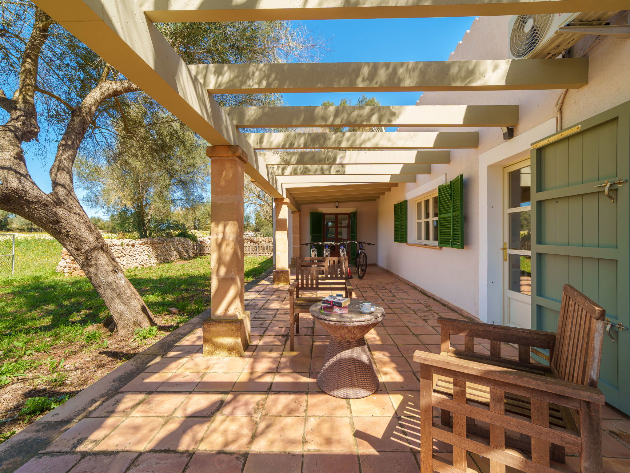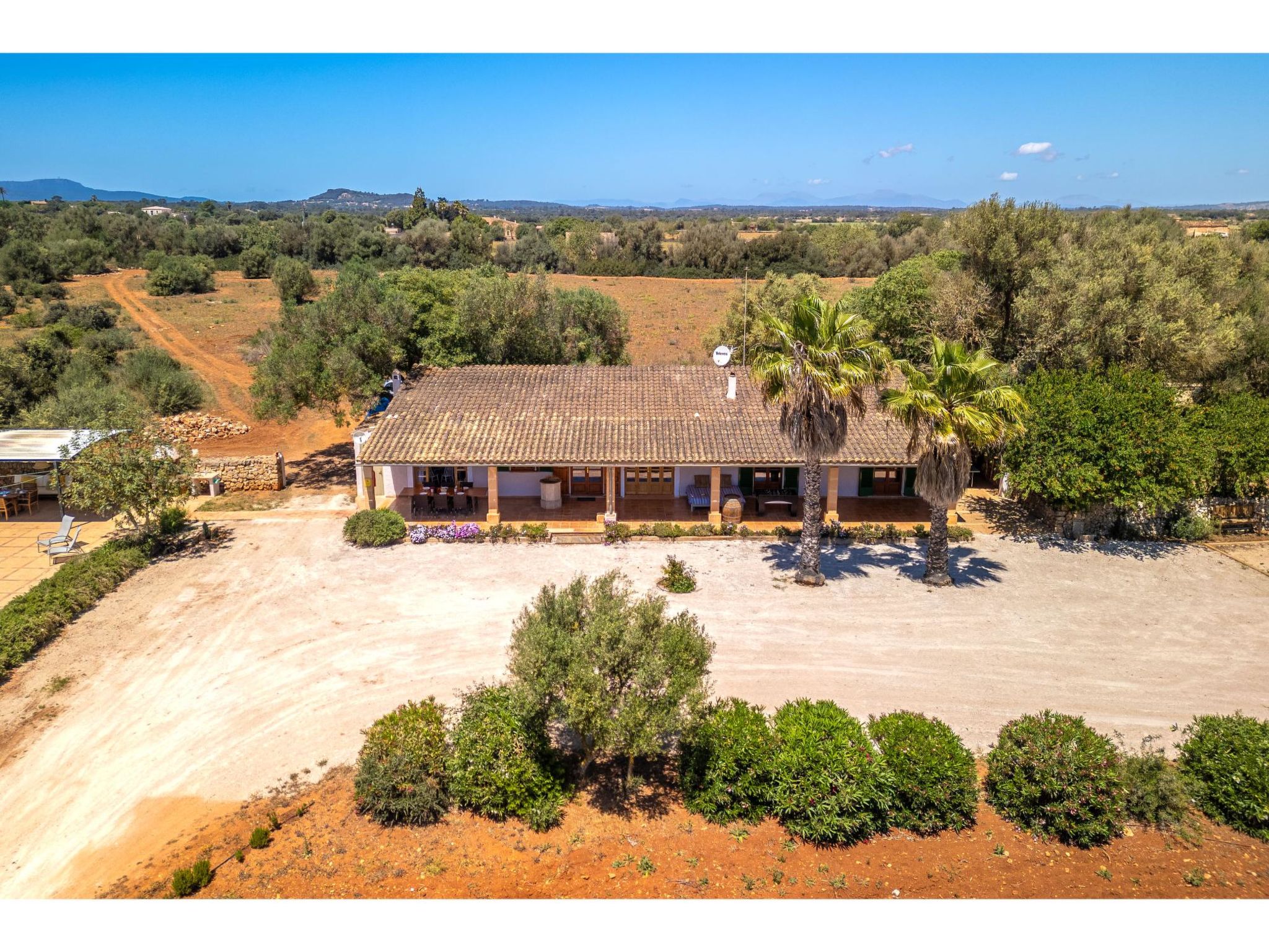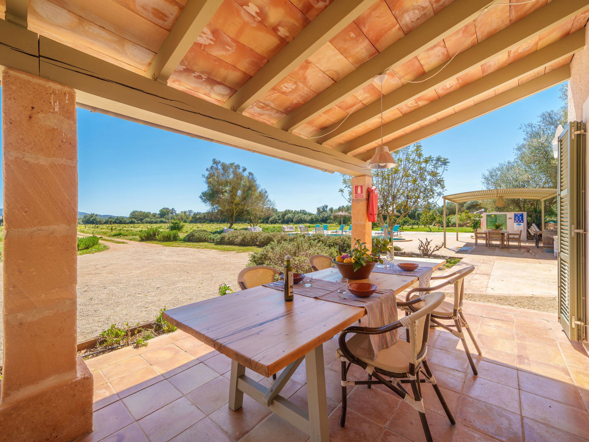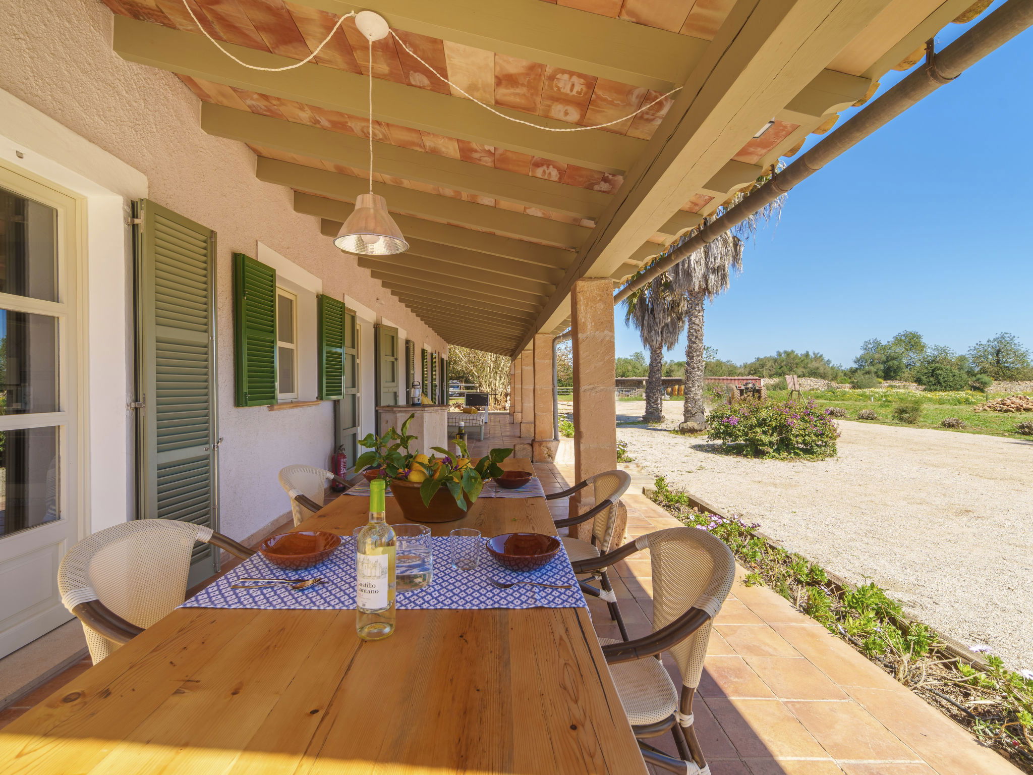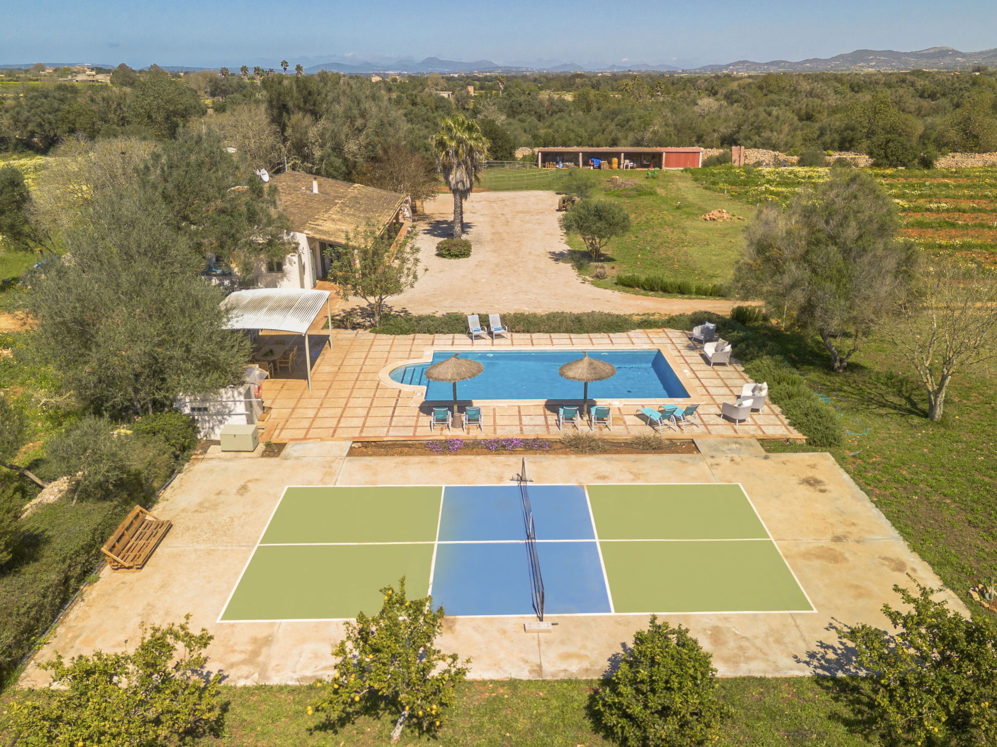 Son Artigues 3 km from Felanitx: Beautiful, comfortable farm estate "Can Soler", detached, surrounded by trees and fields. 5 km from the centre of Felanitx, 8 km from the centre of Porreres, 55 km from the centre of Palma, 2 km from the edge of the forest, 21 km from the sea, 22 km from the beach, in the countryside. Private: natural state property 15'000 m2 (fenced), orchard, swimming pool (9 x 5 m, seasonal availability: 01.Jan. - 31.Dec.). Shower/WC in the pool area, table tennis, boules, badminton, pool maintenance by the owner/gardener. In the house: table football, central heating system, air conditioning, heating to be paid on the spot, heating available only from 01.Nov. - 30.Apr.. 600 m long motor access to the house (via unmade road). Roofed, parking on the premises. Shop 5 km, grocery 5 km, supermarket 7 km, shopping centre 20 km, restaurant 8 km, bakery 5 km, café 6 km, bus stop "Felanitx" 5 km, railway station "Manacor" 19 km, sandy beach "Cala d'Or / Porto Colom" 20 km. Sports harbour 20 km, marina 20 km, golf course (18 hole) 17 km, surf school 22 km, sailing school 22 km, tennis 20 km, riding stable 8 km, sports centre 5 km, walking paths from the house 3 km. Nearby attractions: Rafa Nadal Tennis Academy 19 km, Cuevas del Drach 30 km, Cala Varques 15 km, Sant Salvador 11 km. Please note: car recommended. Suitable for families, suitable for seniors. Object suitable for 6 adults. The owner does not accept any groups. The owner does not accept any youth groups. Airfield 40 km from the property.