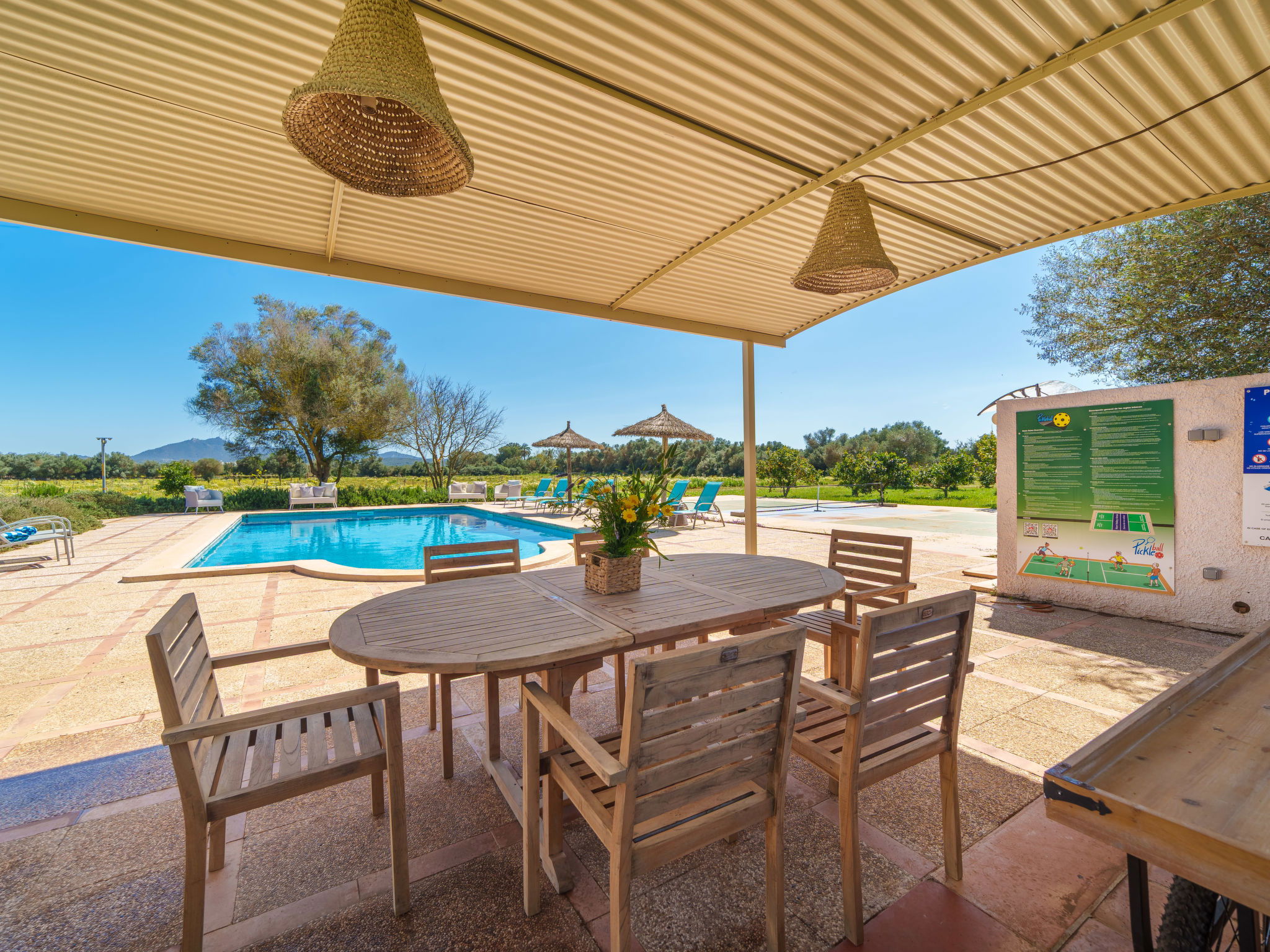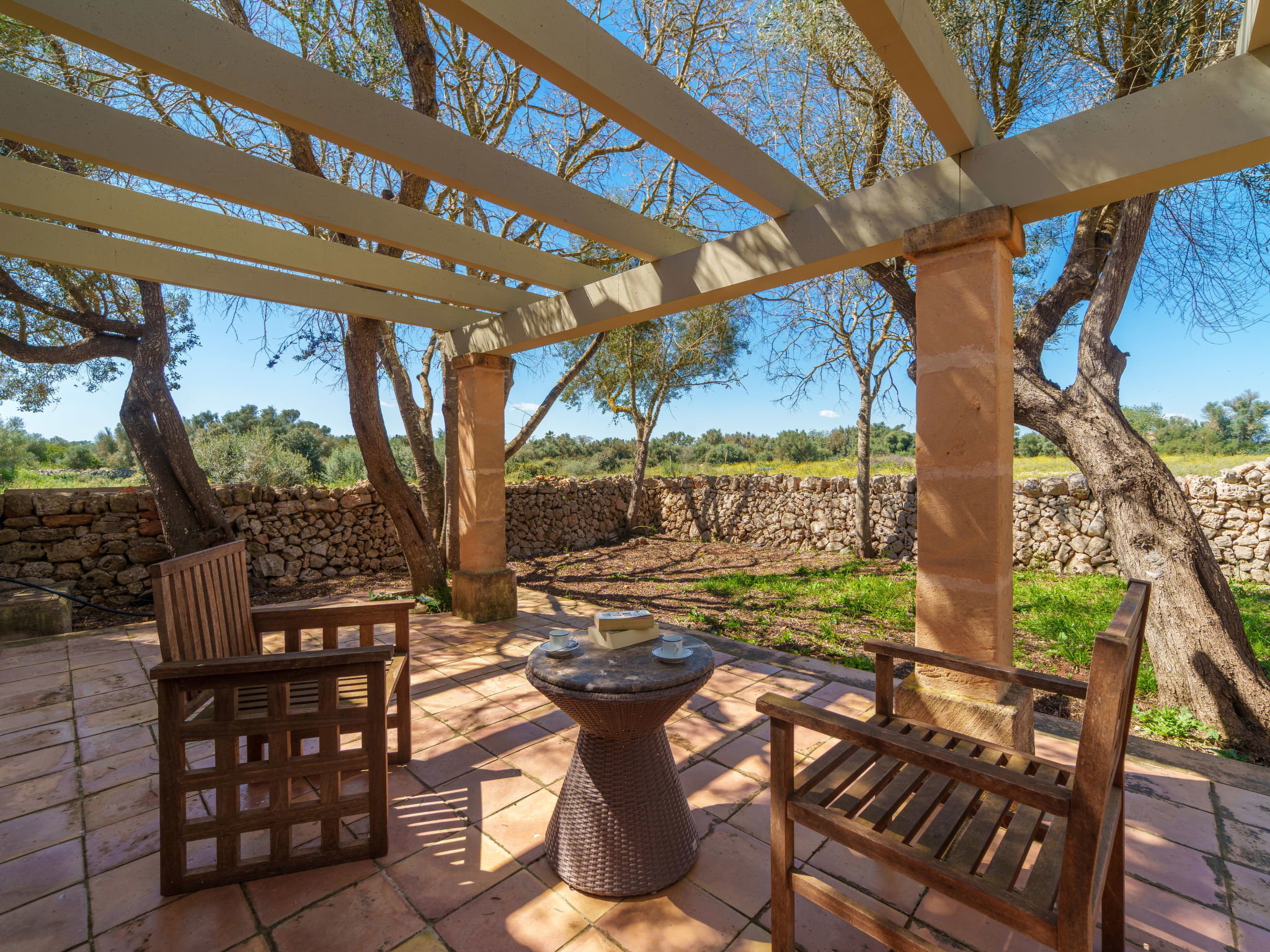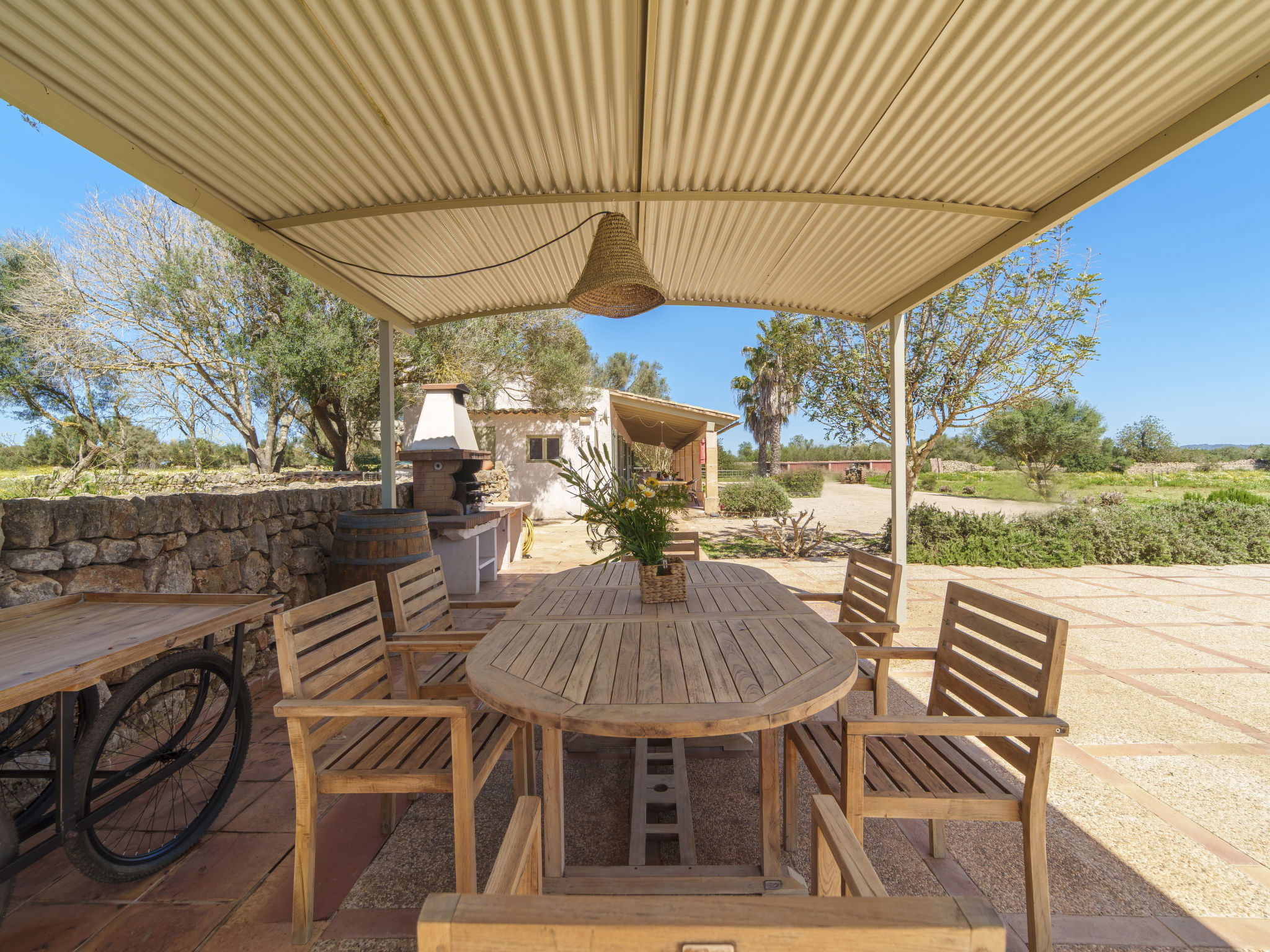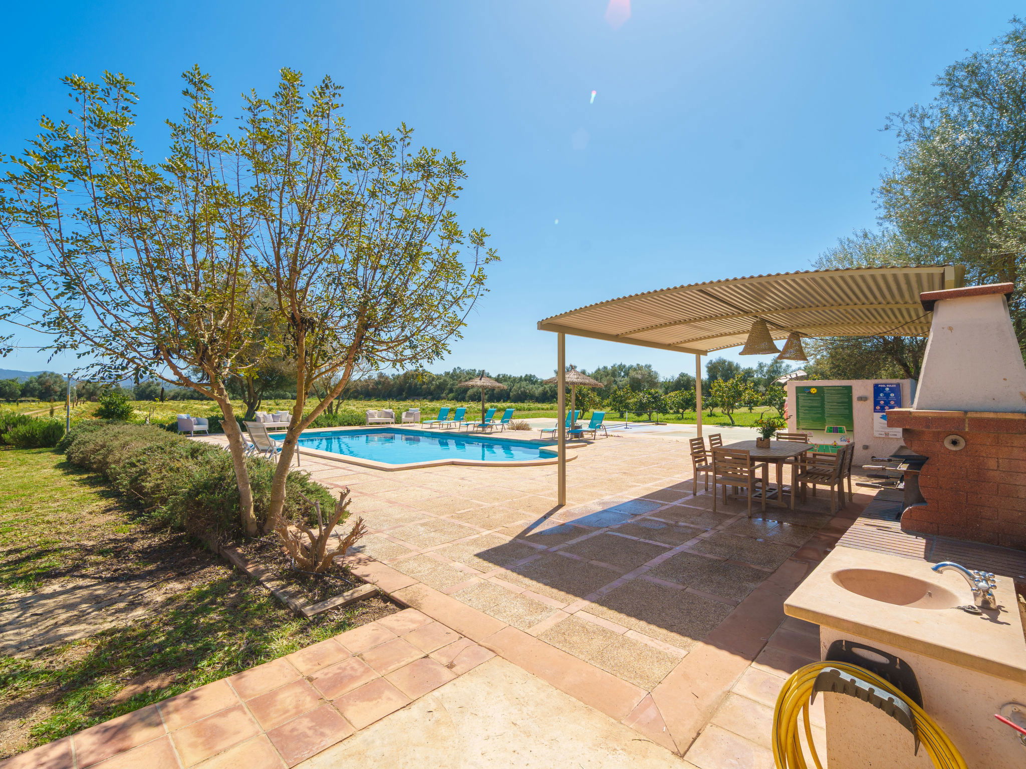 Son Artigues 3 km from Felanitx: Beautiful, comfortable farm estate "Can Soler", detached, surrounded by trees and fields. 5 km from the centre of Felanitx, 8 km from the centre of Porreres, 55 km from the centre of Palma, 2 km from the edge of the forest, 21 km from the sea, 22 km from the beach, in the countryside. Private: natural state property 15'000 m2 (fenced), orchard, swimming pool (9 x 5 m, seasonal availability: 01.Jan. - 31.Dec.). Shower/WC in the pool area, table tennis, boules, badminton, pool maintenance by the owner/gardener. In the house: table football, central heating system, air conditioning, heating to be paid on the spot, heating available only from 01.Nov. - 30.Apr.. 600 m long motor access to the house (via unmade road). Roofed, parking on the premises. Shop 5 km, grocery 5 km, supermarket 7 km, shopping centre 20 km, restaurant 8 km, bakery 5 km, café 6 km, bus stop "Felanitx" 5 km, railway station "Manacor" 19 km, sandy beach "Cala d'Or / Porto Colom" 20 km. Sports harbour 20 km, marina 20 km, golf course (18 hole) 17 km, surf school 22 km, sailing school 22 km, tennis 20 km, riding stable 8 km, sports centre 5 km, walking paths from the house 3 km. Nearby attractions: Rafa Nadal Tennis Academy 19 km, Cuevas del Drach 30 km, Cala Varques 15 km, Sant Salvador 11 km. Please note: car recommended. Suitable for families, suitable for seniors. Object suitable for 6 adults. The owner does not accept any groups. The owner does not accept any youth groups. Airfield 40 km from the property.