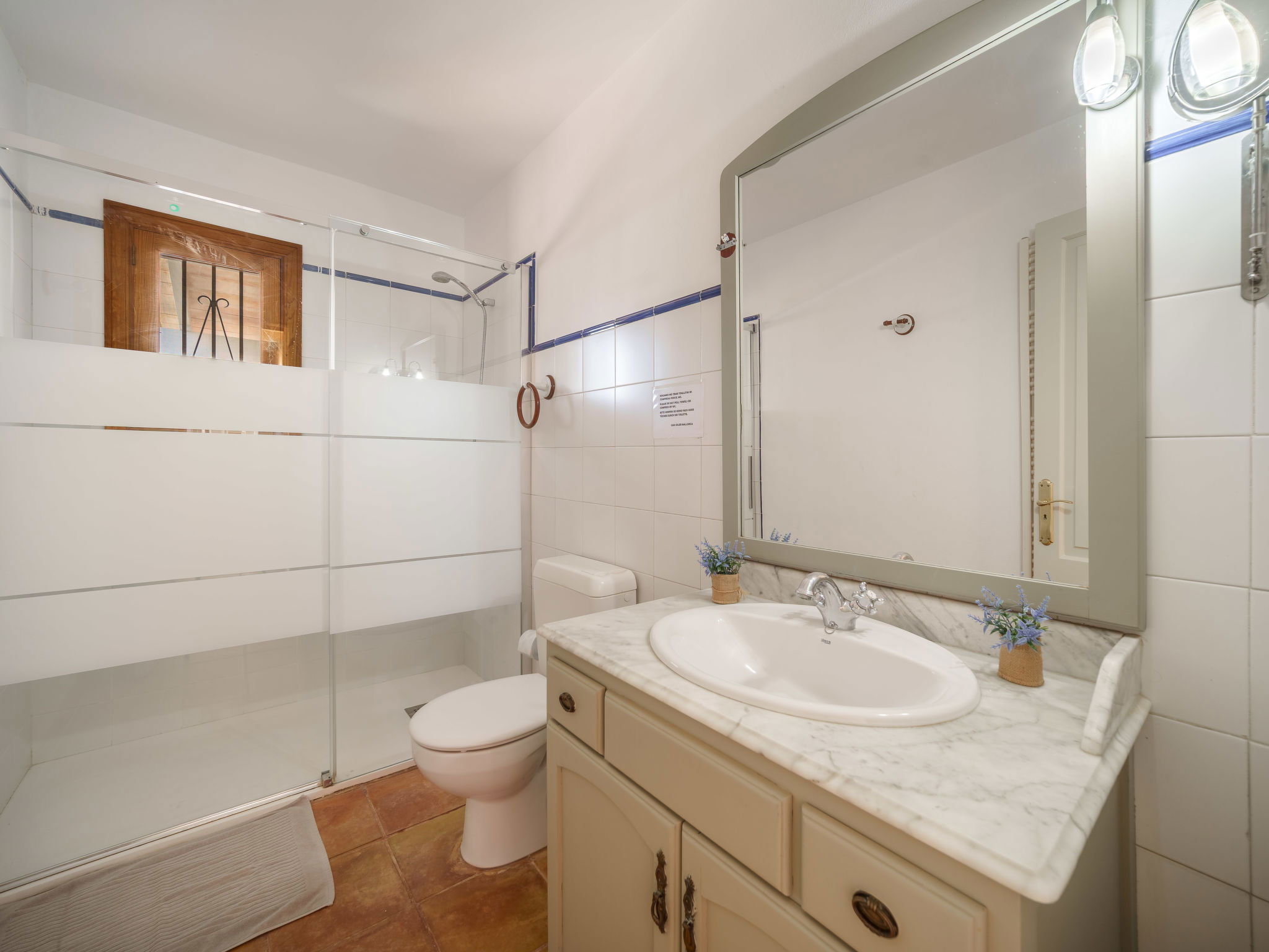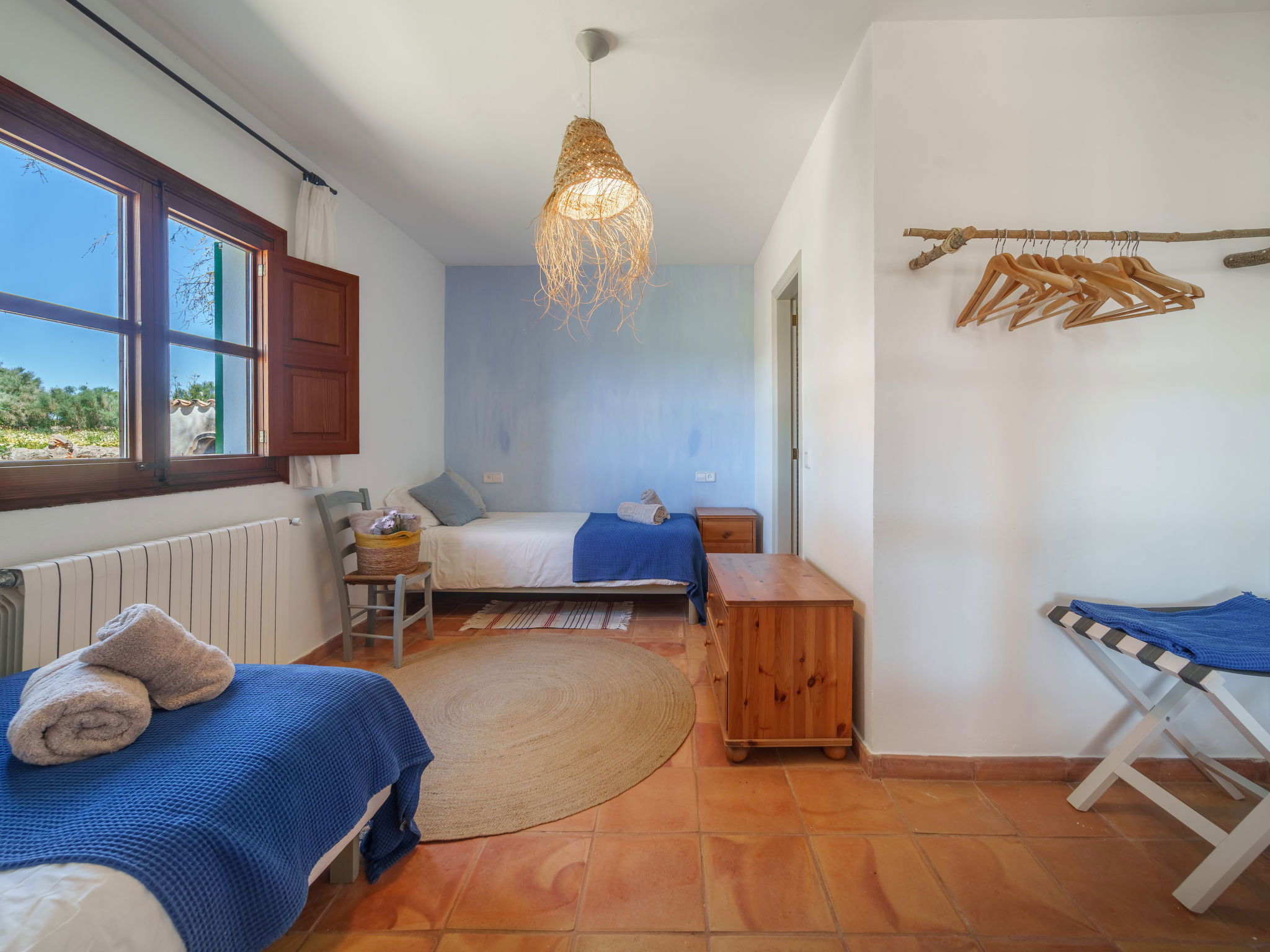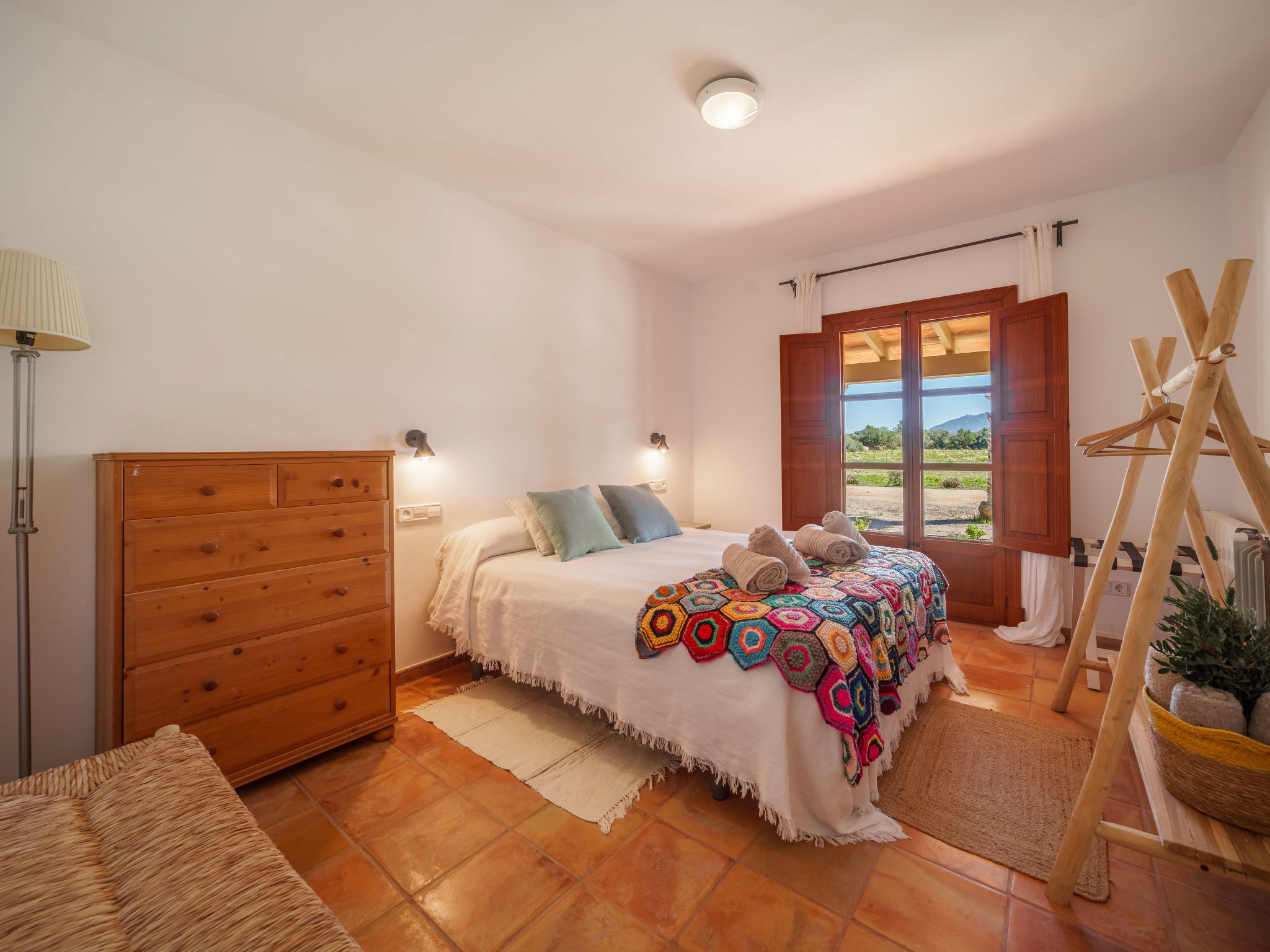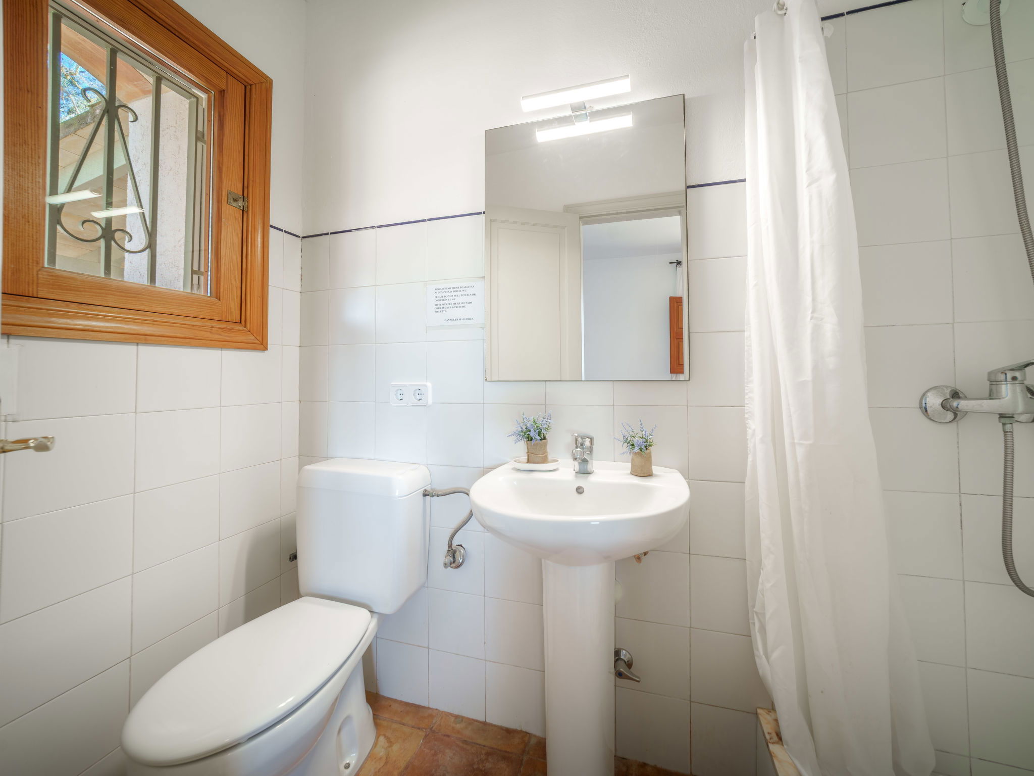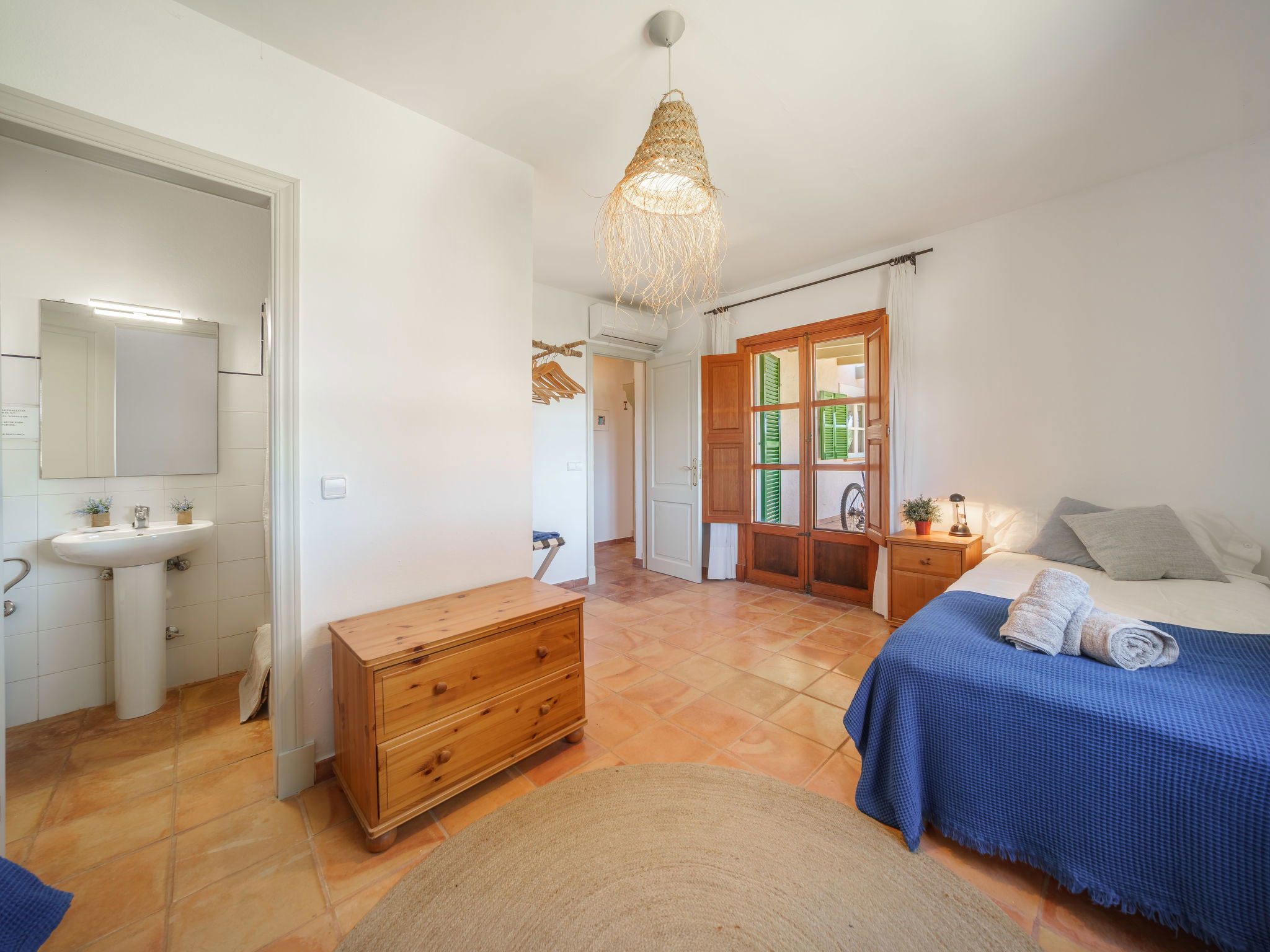 Son Artigues 3 km from Felanitx: Beautiful, comfortable farm estate "Can Soler", detached, surrounded by trees and fields. 5 km from the centre of Felanitx, 8 km from the centre of Porreres, 55 km from the centre of Palma, 2 km from the edge of the forest, 21 km from the sea, 22 km from the beach, in the countryside. Private: natural state property 15'000 m2 (fenced), orchard, swimming pool (9 x 5 m, seasonal availability: 01.Jan. - 31.Dec.). Shower/WC in the pool area, table tennis, boules, badminton, pool maintenance by the owner/gardener. In the house: table football, central heating system, air conditioning, heating to be paid on the spot, heating available only from 01.Nov. - 30.Apr.. 600 m long motor access to the house (via unmade road). Roofed, parking on the premises. Shop 5 km, grocery 5 km, supermarket 7 km, shopping centre 20 km, restaurant 8 km, bakery 5 km, café 6 km, bus stop "Felanitx" 5 km, railway station "Manacor" 19 km, sandy beach "Cala d'Or / Porto Colom" 20 km. Sports harbour 20 km, marina 20 km, golf course (18 hole) 17 km, surf school 22 km, sailing school 22 km, tennis 20 km, riding stable 8 km, sports centre 5 km, walking paths from the house 3 km. Nearby attractions: Rafa Nadal Tennis Academy 19 km, Cuevas del Drach 30 km, Cala Varques 15 km, Sant Salvador 11 km. Please note: car recommended. Suitable for families, suitable for seniors. Object suitable for 6 adults. The owner does not accept any groups. The owner does not accept any youth groups. Airfield 40 km from the property.