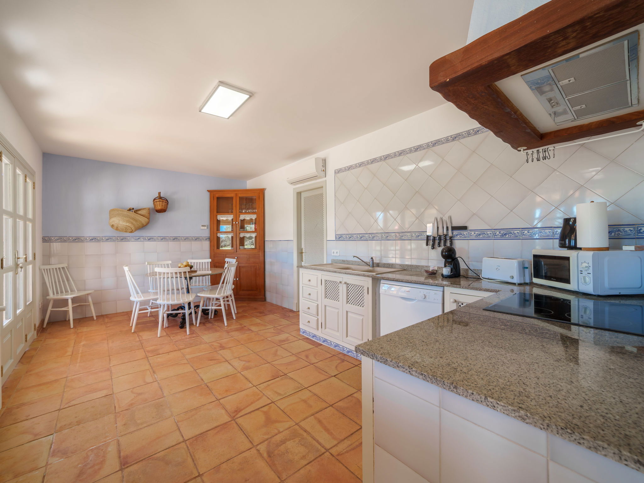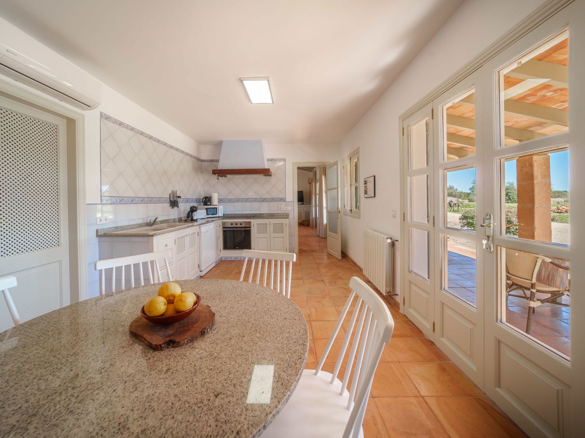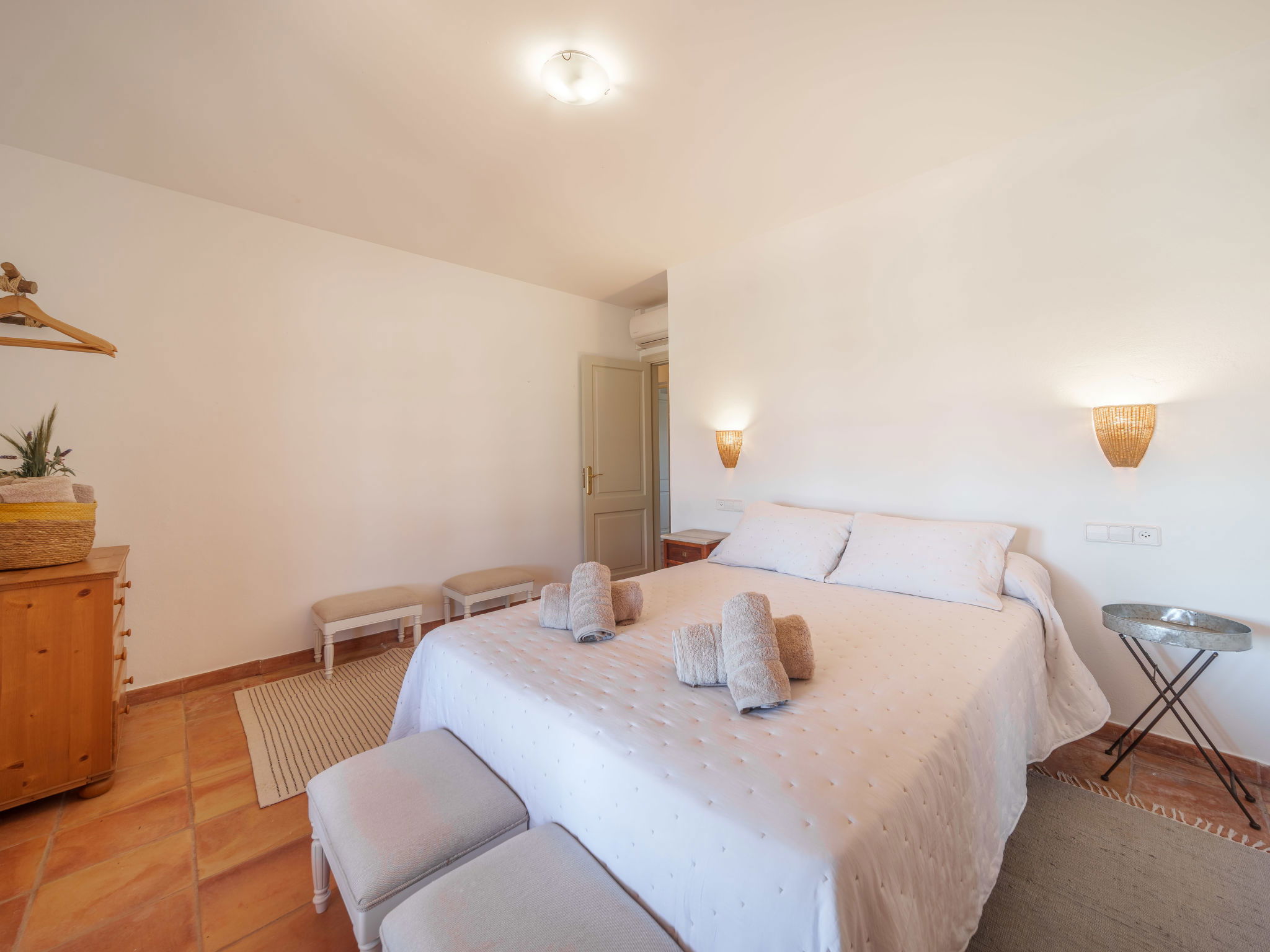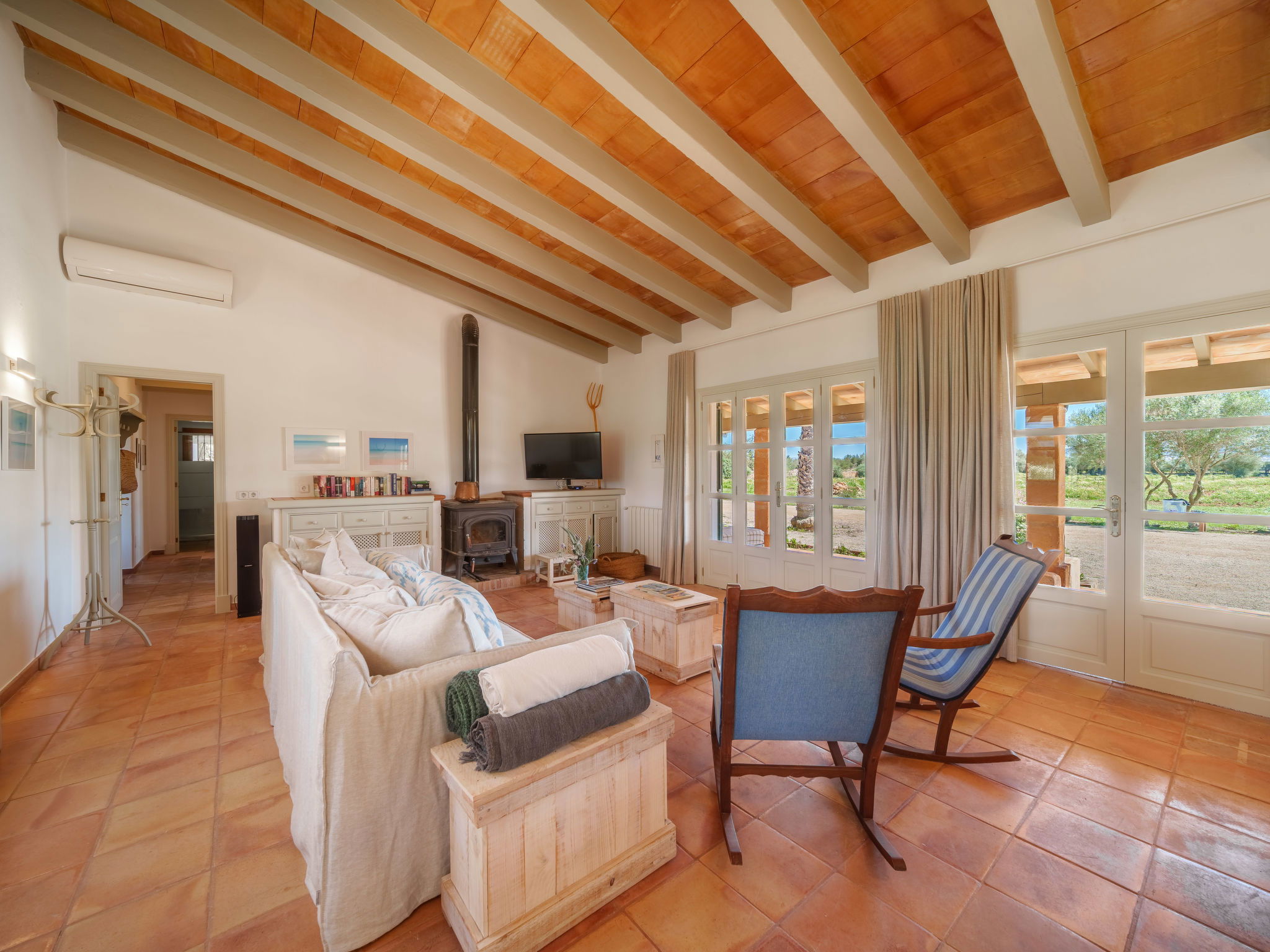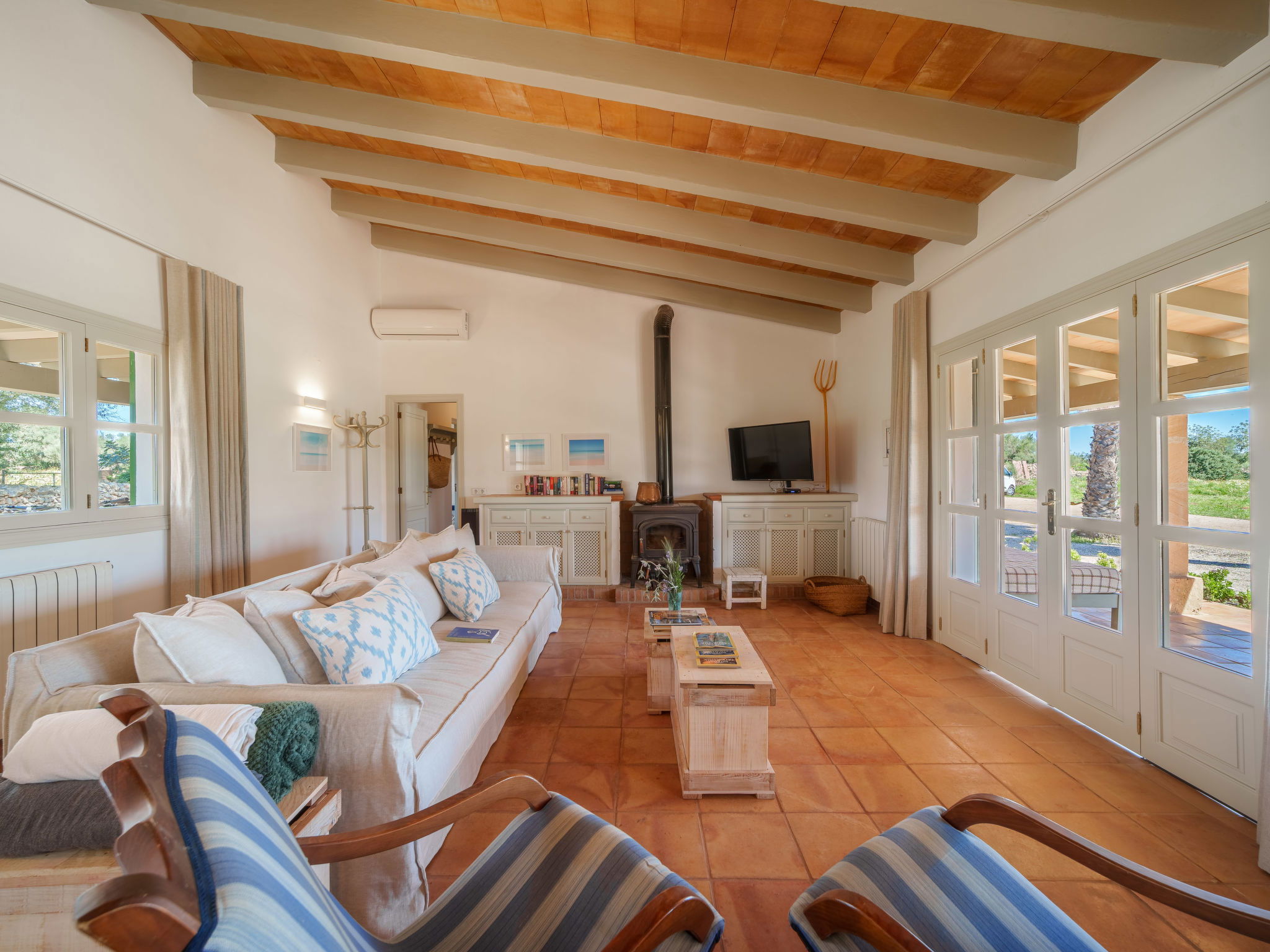 "Can Soler", 4-room house 110 m2, south facing position. Object suitable for 6 adults. Spacious, practical and beautiful furnishings: living room with Scandinavian wood stove, satellite TV, digital TV, air conditioning and forced-air heating. Exit to the terrace. 2 rooms, each room with 1 french bed (1 x 150 cm), air conditioning and forced-air heating. Exit to the terrace. 1 room with 2 beds, shower/WC, air conditioning and forced-air heating. Exit to the terrace. Kitchen (oven, dishwasher, 4 ceramic glass hob hotplates, toaster, kettle, microwave, freezer, electric coffee machine) with dining table, air conditioning and forced-air heating. Exit to the terrace. 2 showers/WC. Oil heating, air-conditioning, forced-air heating. Large terrace 60 m2, roofed. Terrace furniture, barbecue, deck chairs (6). View. Facilities: washing machine, iron, children's high chair, baby cot for up to 2 year olds, hair dryer. Internet (WiFi, free). Please note: non-smoking house. Fire extinguisher. The pool mentioned in the description is for private use. ETV1274 // Reg. Nr.: ESFCTU00000700800008137400000000000000000000ETV/12744