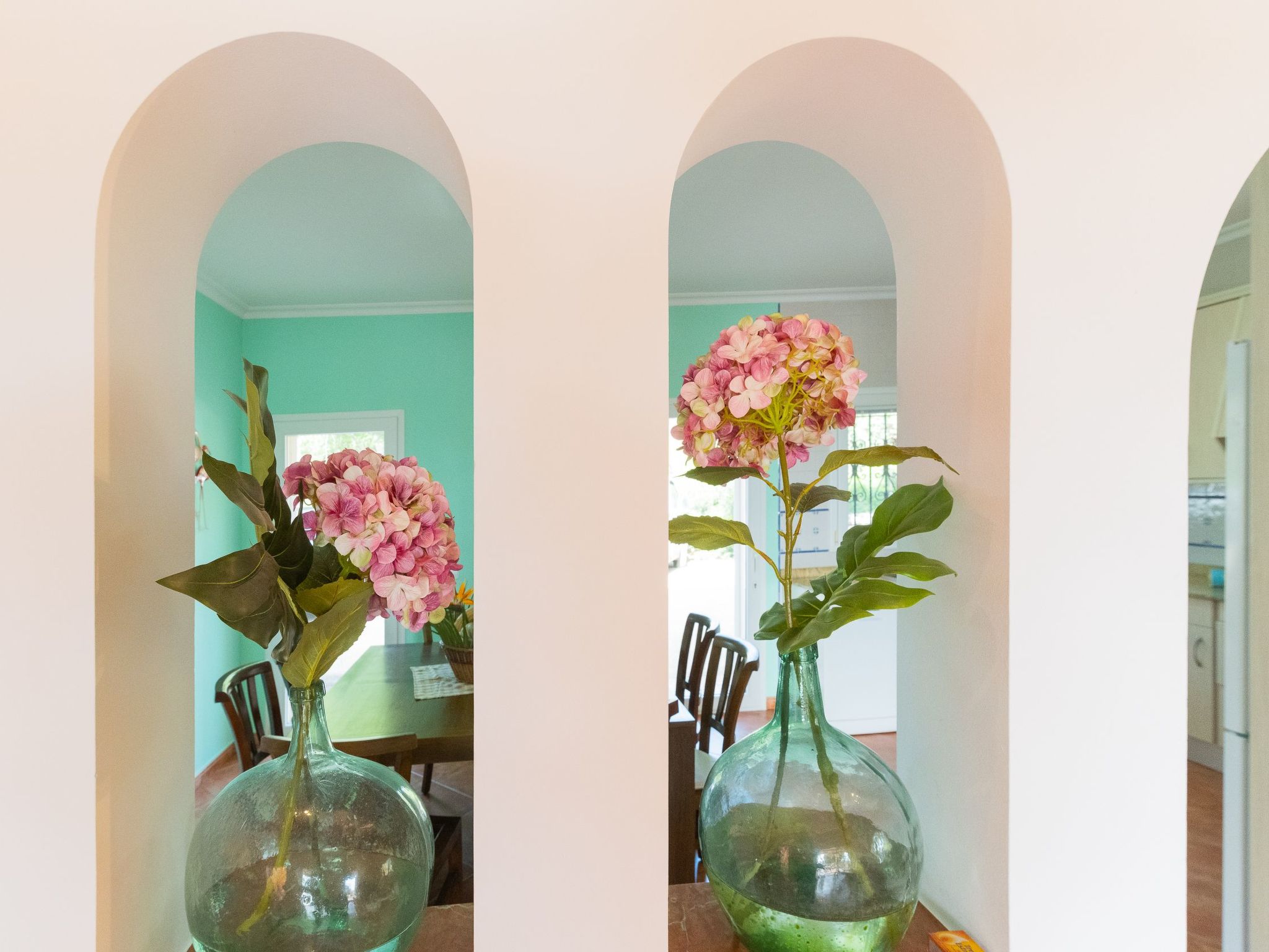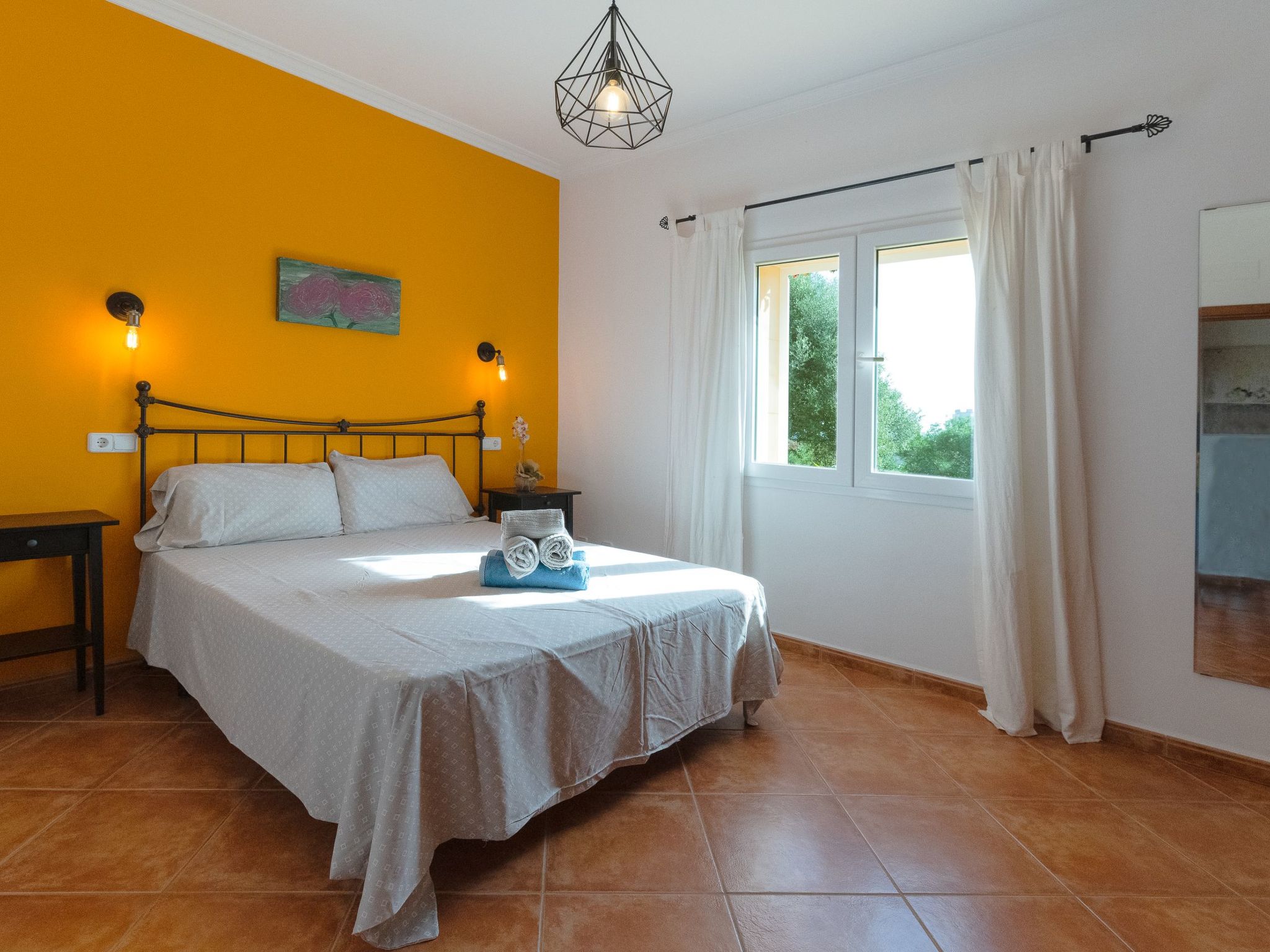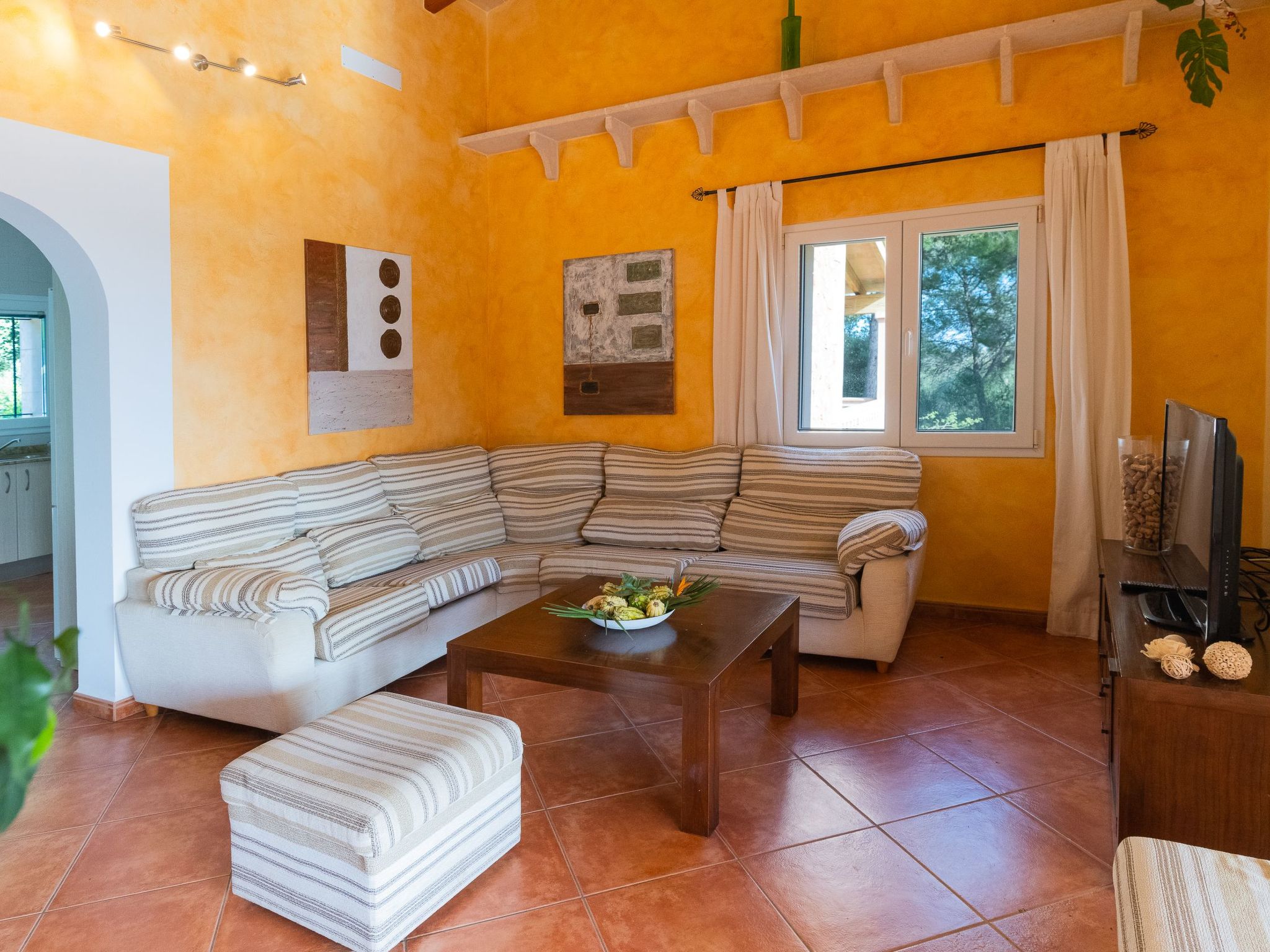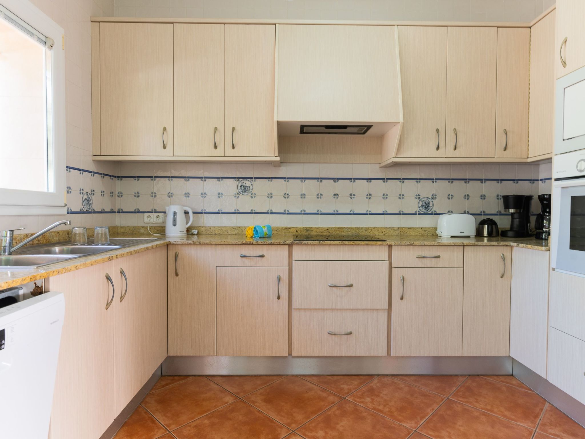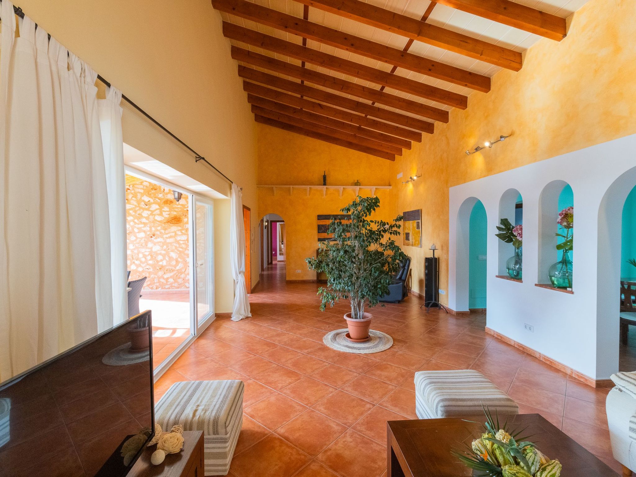 All rooms are on one floor, which offers spacious areas both inside and out. The large open-plan living room is connected to the kitchen and has access to the beautiful terrace via sliding glass doors. The kitchen is well equipped and has a dining area. Next to it is the utility room with washing machine and an additional fridge. There is also a bathroom with shower next to the kitchen. The house has four bedrooms. Two of them have a double bed and two have two single beds each. There are two further bathrooms, one with a shower and the other with a bathtub. Air conditioning in the bedrooms with fixed and limited hours of use from 21:00 to 09:00.