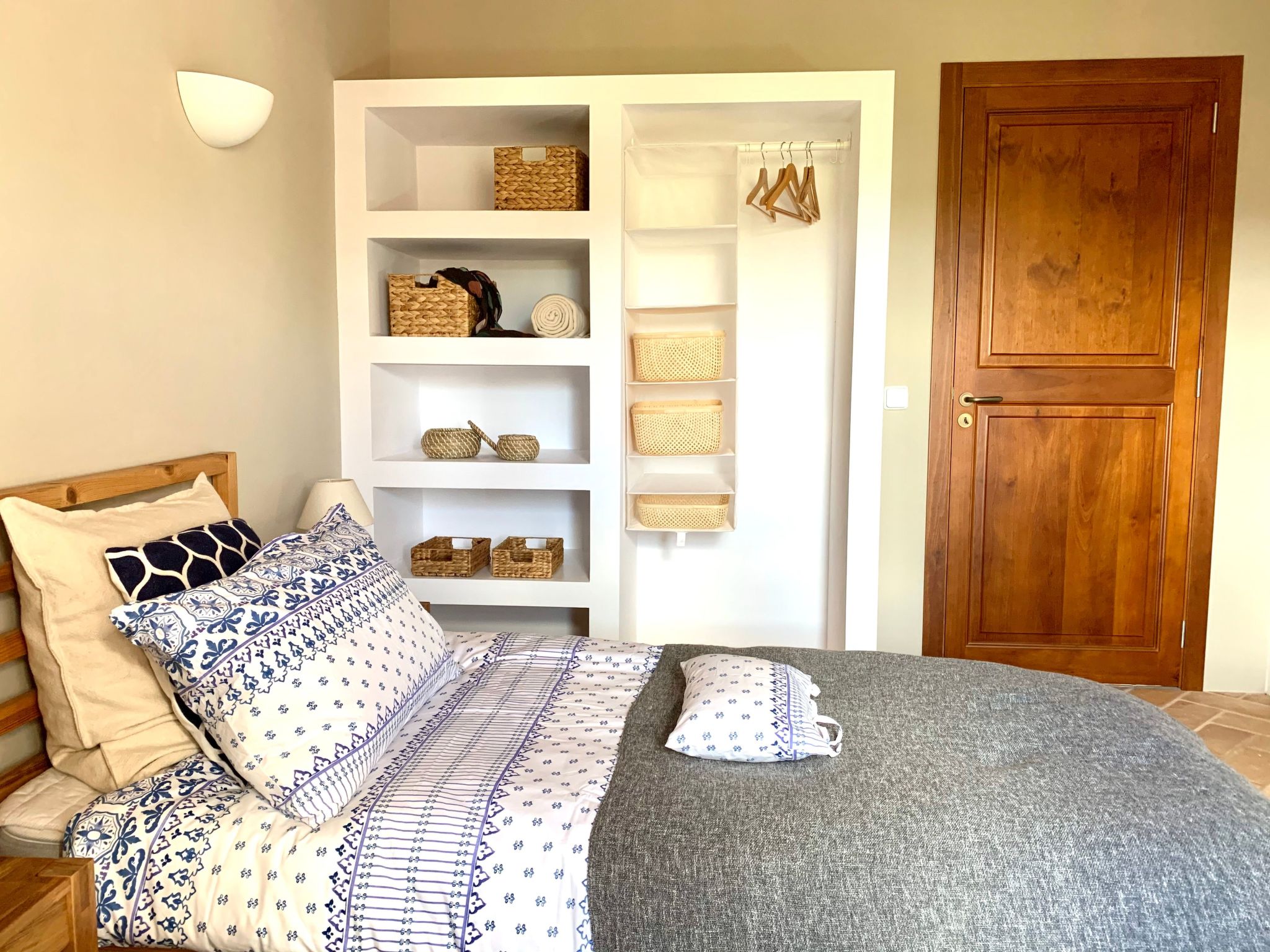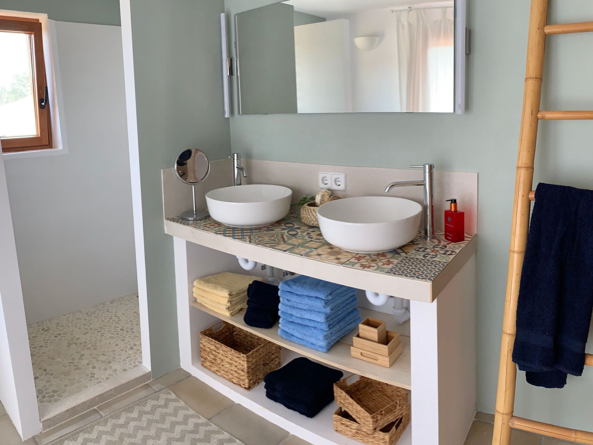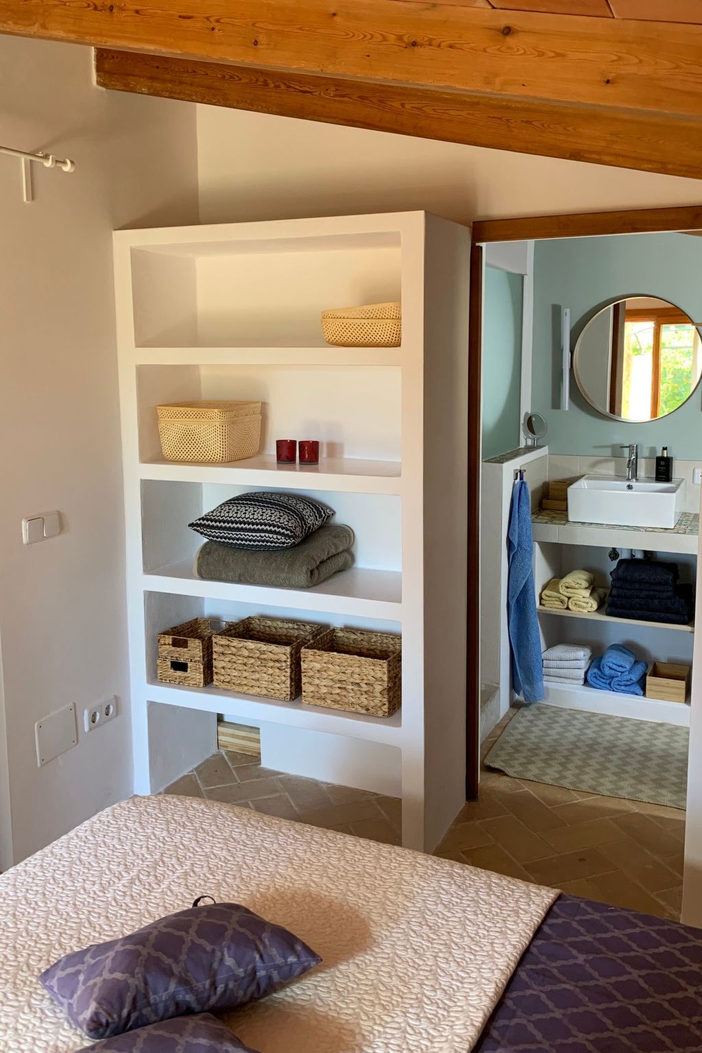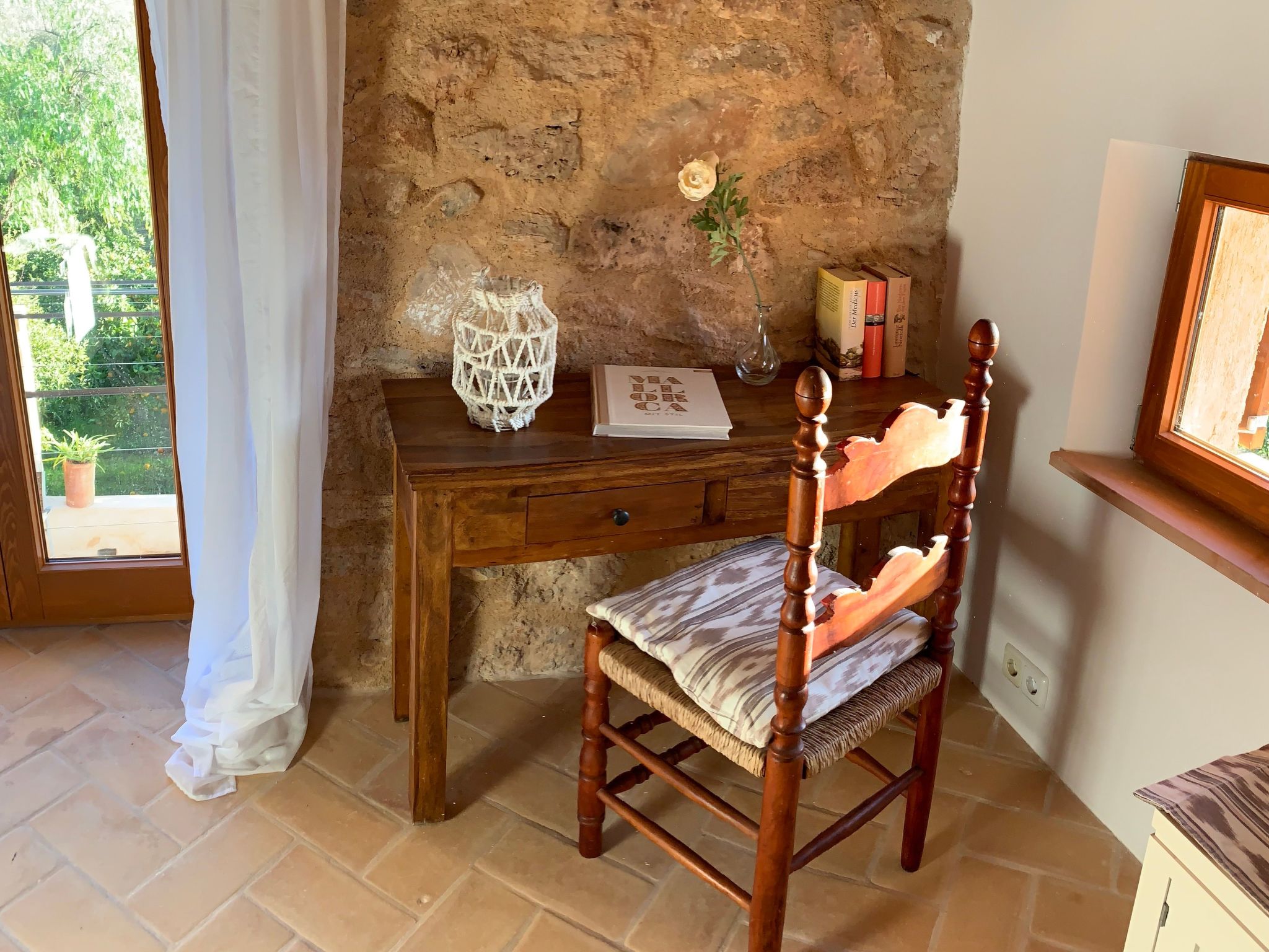 There is a large terrace right next to the house with direct access to the old Mallorcan orchard. From the terrace you enter the spacious kitchen and the generous living/dining area with fireplace. Also on the ground floor is a bedroom with a double bed, en suite bathroom and direct access to the terrace.