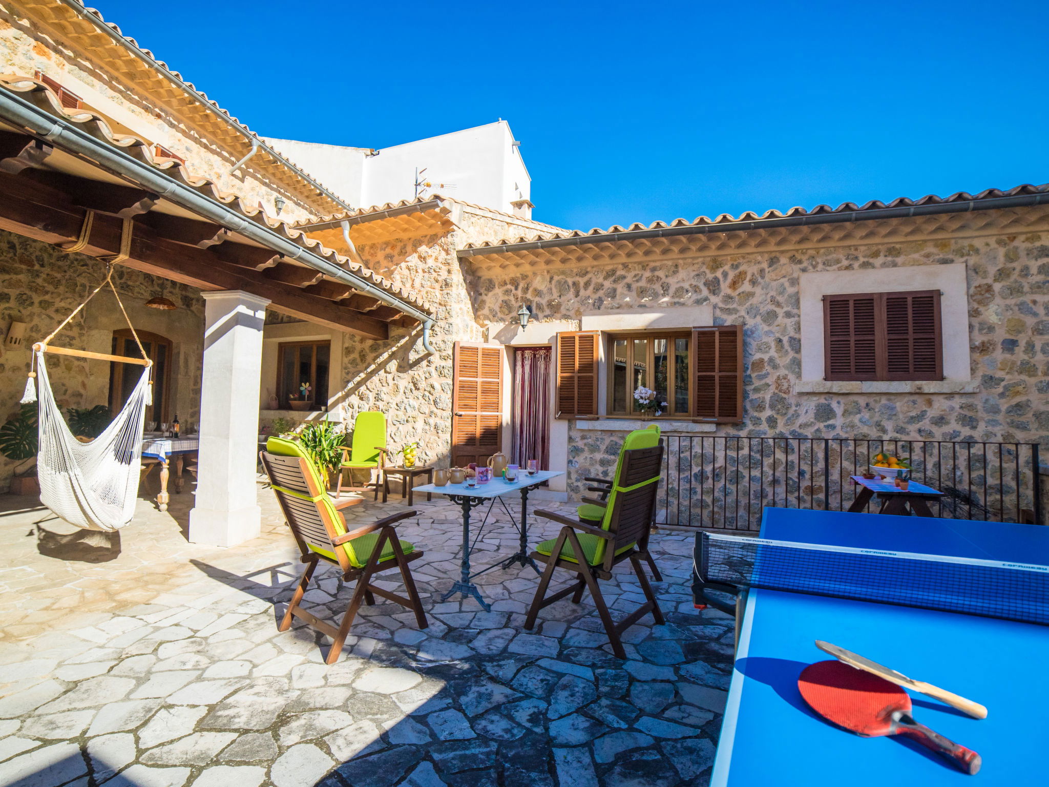 Mancor de la Vall: Very large, beautiful house "Son Trobat", 2 storeys, renovated. In a central, quiet position, 900 m from the edge of the forest, 30 km from the sea. Private: outdoor shower, table tennis, arbour, pergola, terrace, garden furniture, barbecue. In the house: internet access, WiFi, table tennis, storage room for bicycles, air conditioning, burglar alarm system, washing machine, tumble dryer. Public car park, public parking on the road. Grocery 150 m, supermarket 300 m, shopping centre 20 km, restaurant, bar 50 m, bakery 100 m, pub garden 50 m, bus stop 300 m, sandy beach "Port Alcudia" 30 km. Sports harbour 32 km, golf course (18 hole) 30 km, tennis 500 m, riding stable 2.5 km, walking paths from the house, cycle lane 900 m. Nearby attractions: Monasterio de Santa Llucia 1.5 km, Monasterio de Lluc. Hiking paths: Puig de Santa Llucia - Biniarroi, Puig de Massanella, Lluc - Serra de Tramuntana. Please note: suitable for families, suitable for seniors. Object suitable for 8 adults. Loading and unloading of baggage is possible at the holiday house. Airfield 50 km from the property.